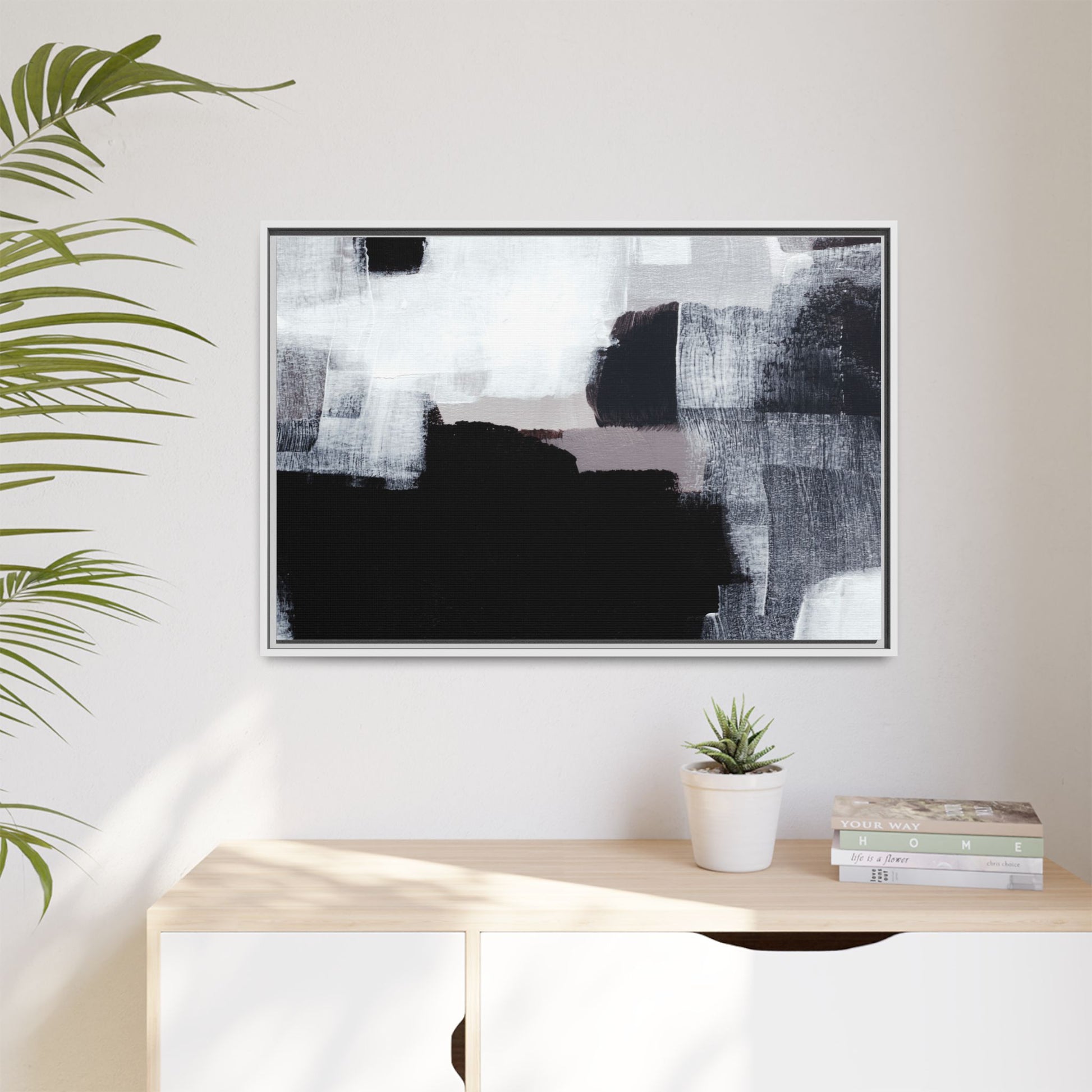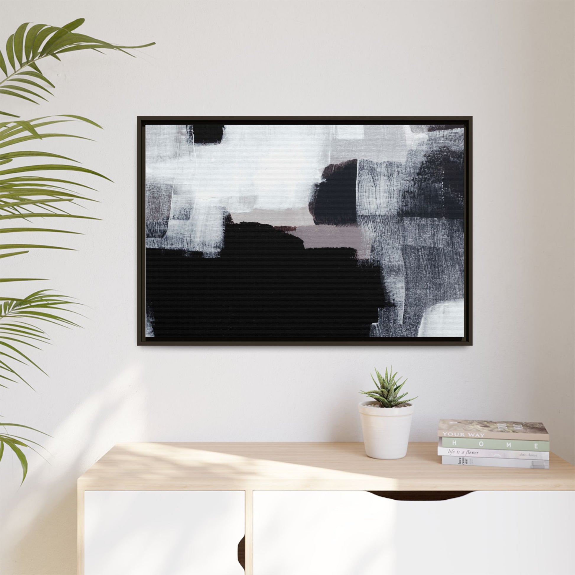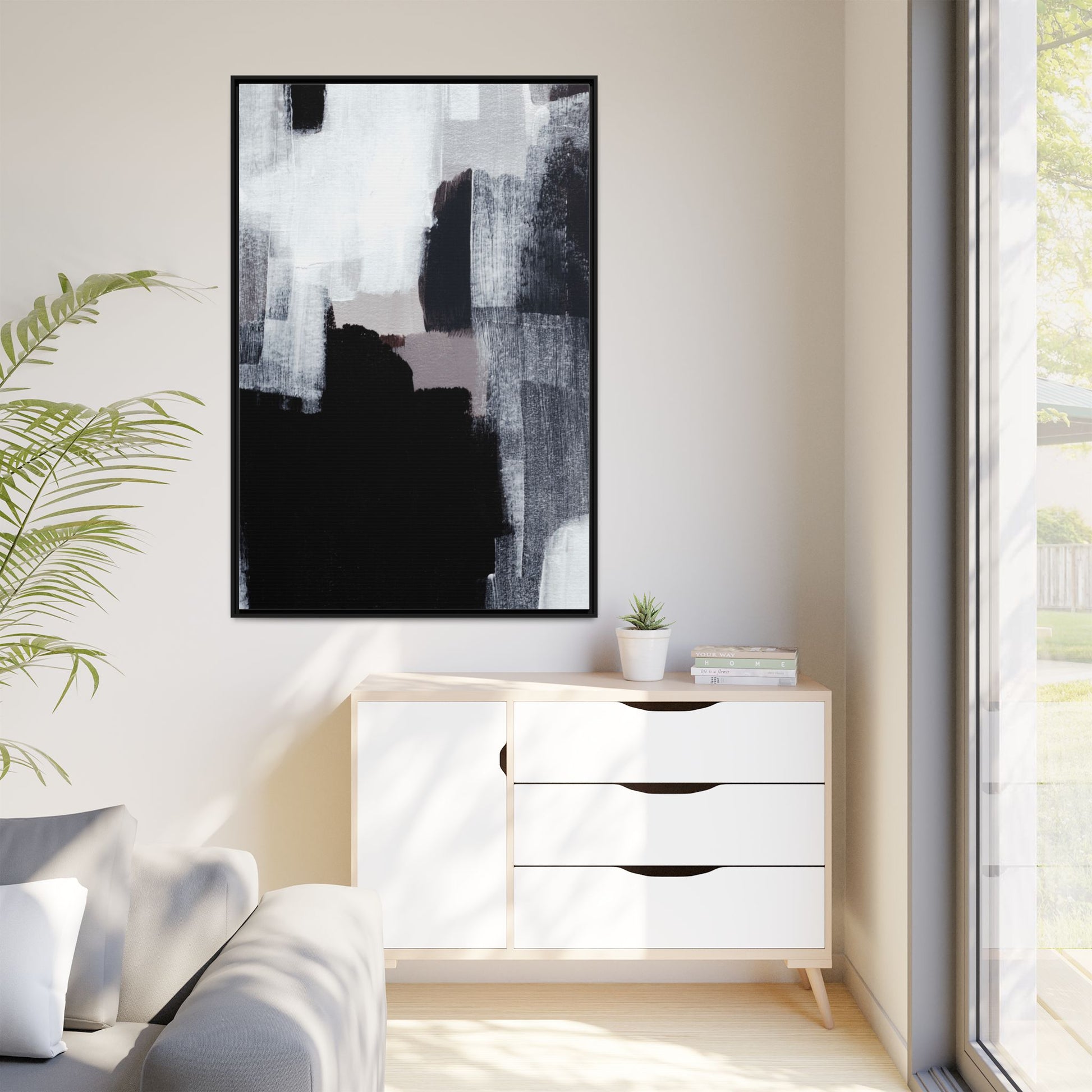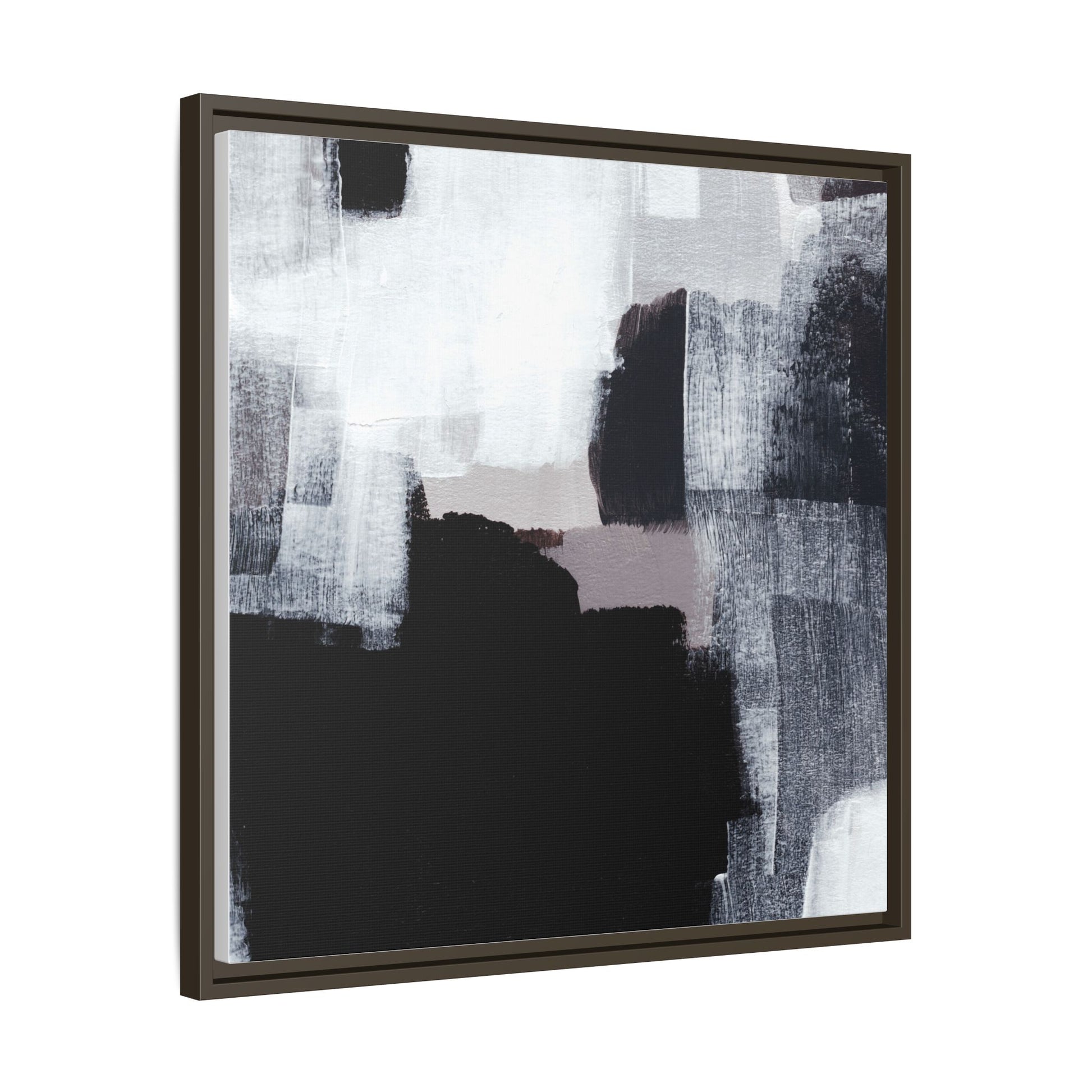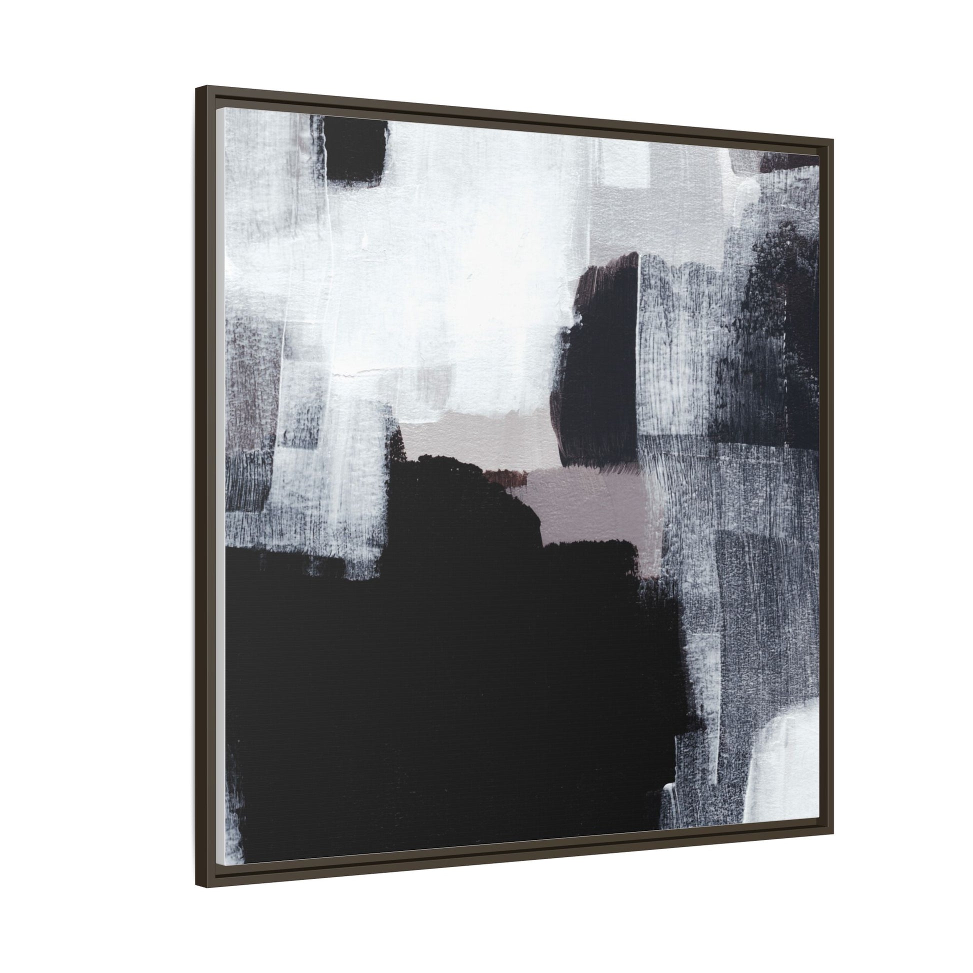 This abstract painting showcases a monochromatic composition of black, white, and gray tones, creating a dynamic and textured visual landscape. Bold brushstrokes and layered paint create a sense of depth and movement across the canvas, with varying opacity and texture revealing intricate details. Large black shapes contrast against lighter gray and white backgrounds, giving the artwork a sense of dramatic tension and visual interest. The painting appears to use a technique that involves multiple layers of paint, with visible brush and palette knife marks that add tactile dimensionality to the piece. The overall aesthetic is minimalist yet complex, suggesting an exploration of form, negative space, and the interplay between light and dark elements.