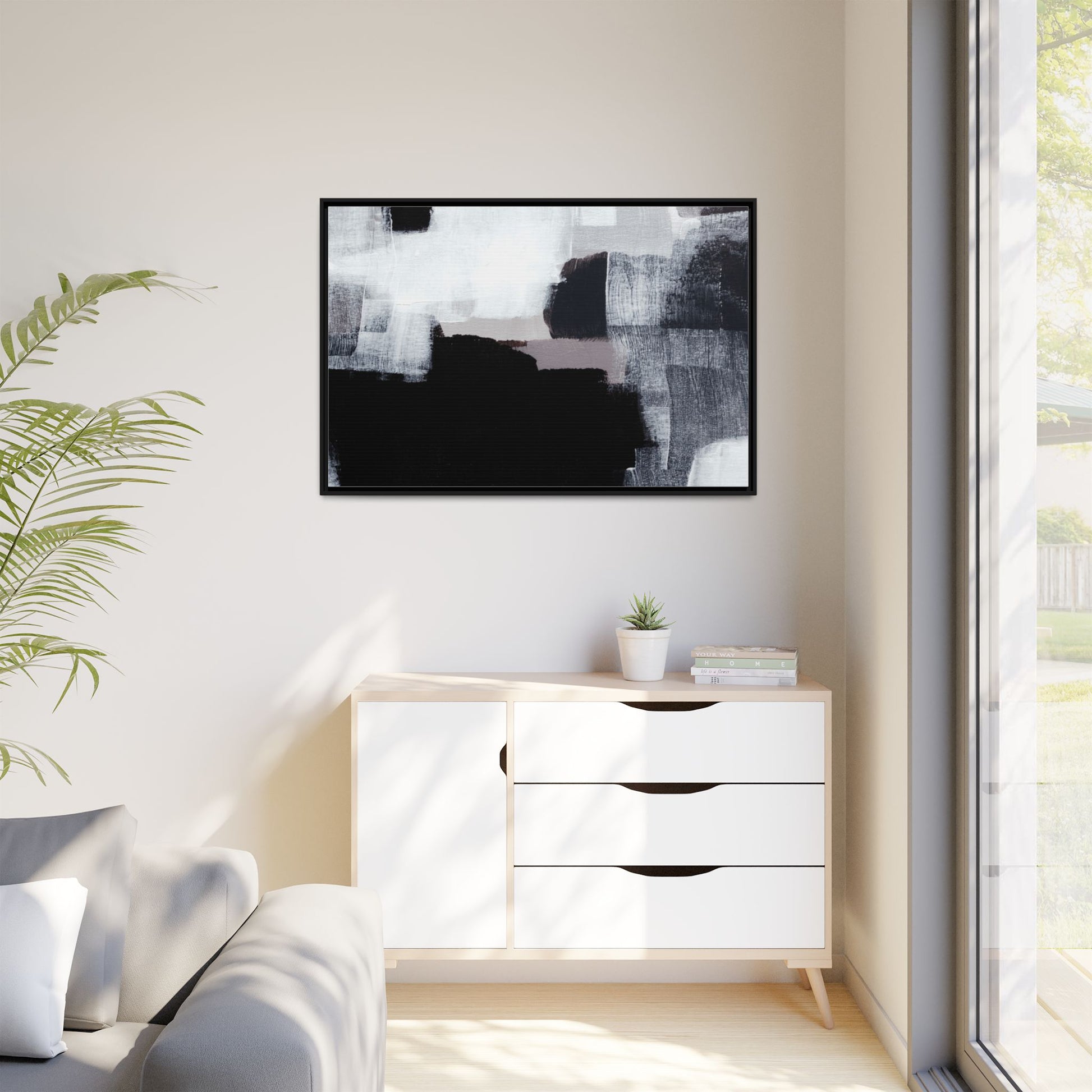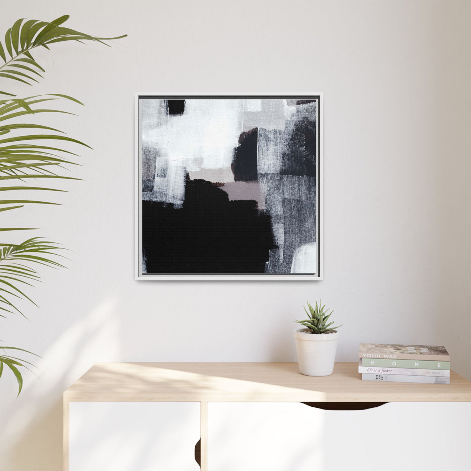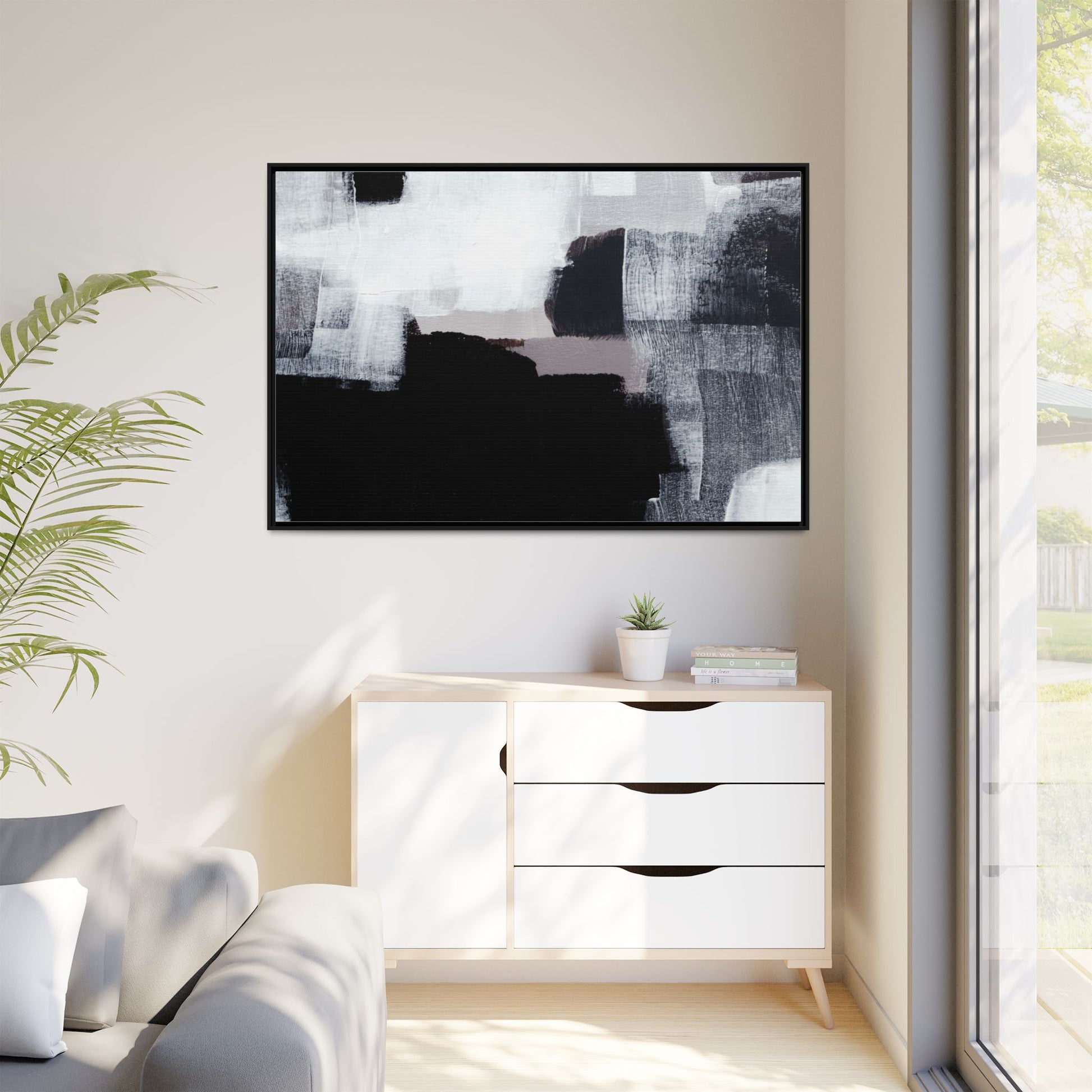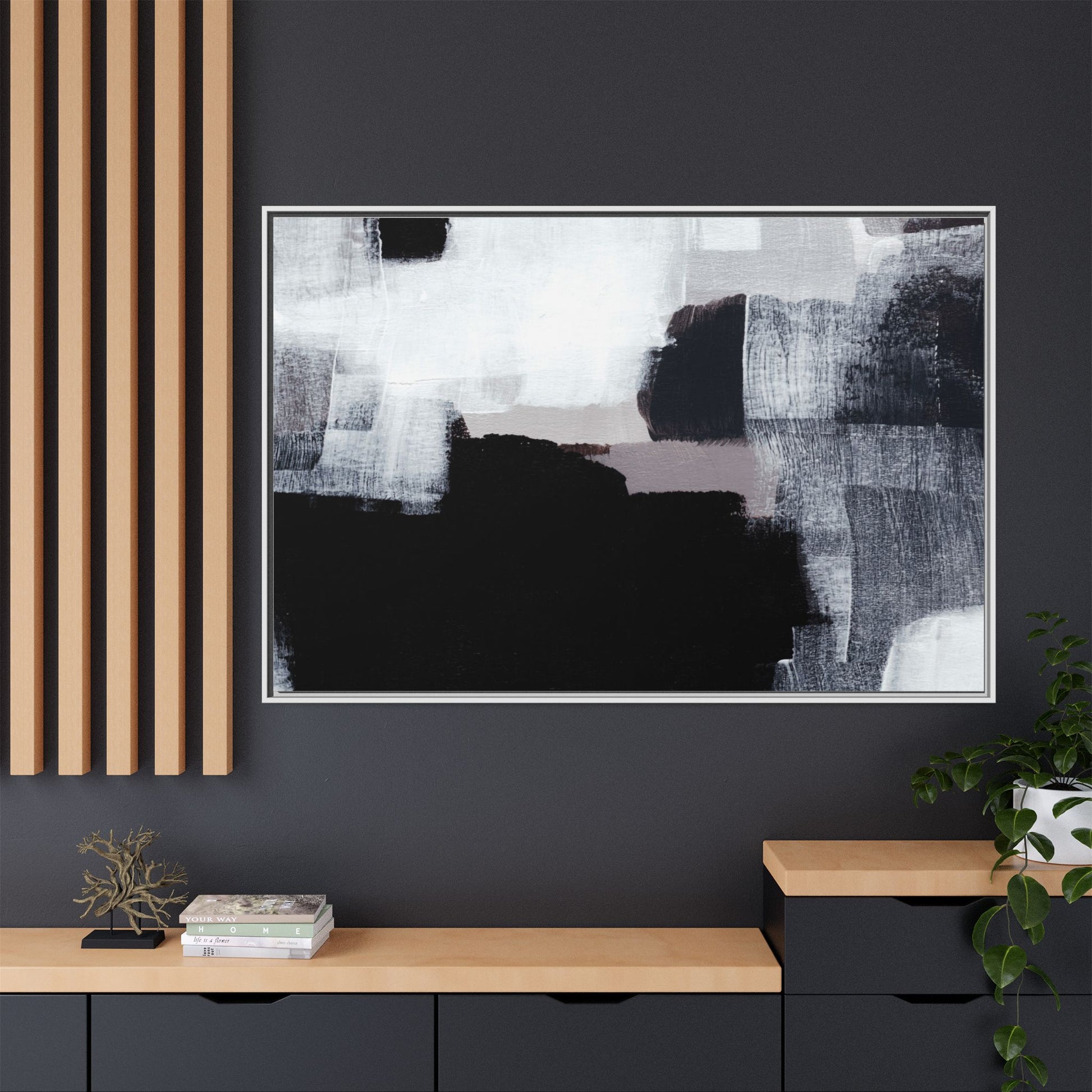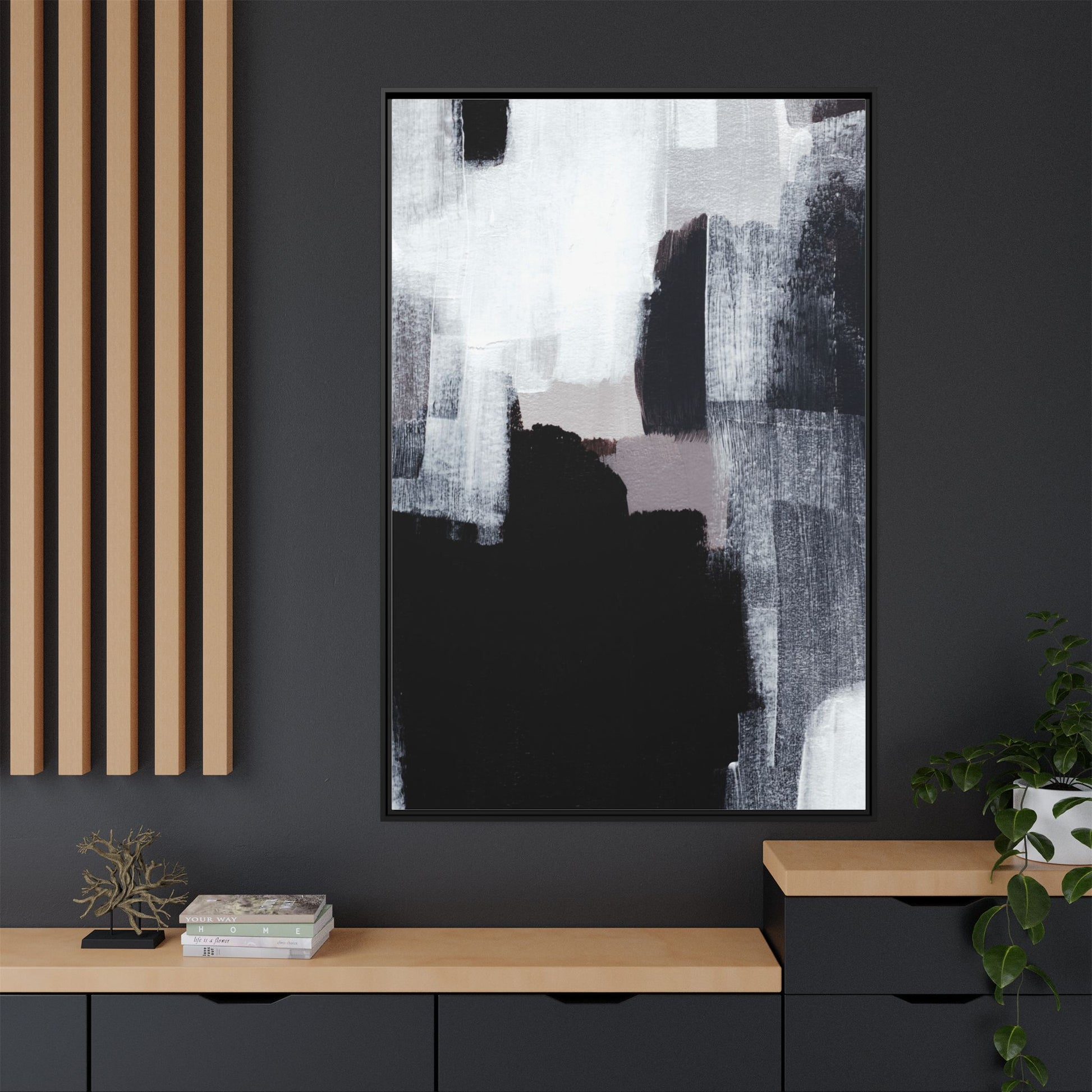 This abstract painting showcases a monochromatic composition of black, white, and gray tones, creating a dynamic and textured visual landscape. Bold brushstrokes and layered paint create a sense of depth and movement across the canvas, with varying opacity and texture revealing intricate details. Large black shapes contrast against lighter gray and white backgrounds, giving the artwork a sense of dramatic tension and visual interest. The painting appears to use a technique that involves multiple layers of paint, with visible brush and palette knife marks that add tactile dimensionality to the piece. The overall aesthetic is minimalist yet complex, suggesting an exploration of form, negative space, and the interplay between light and dark elements.