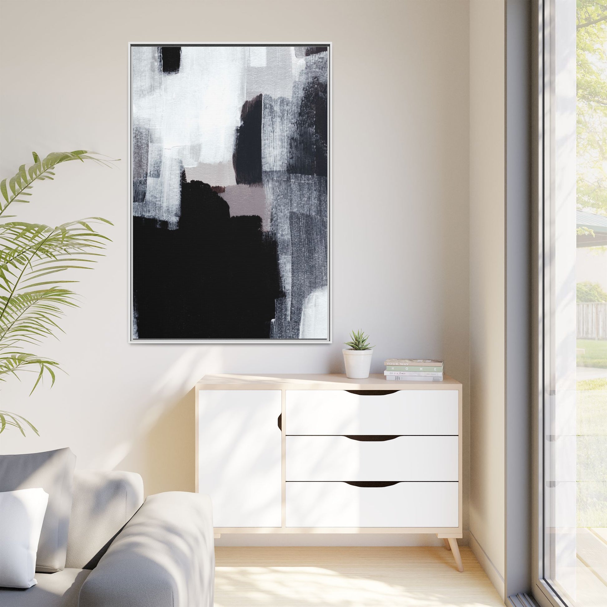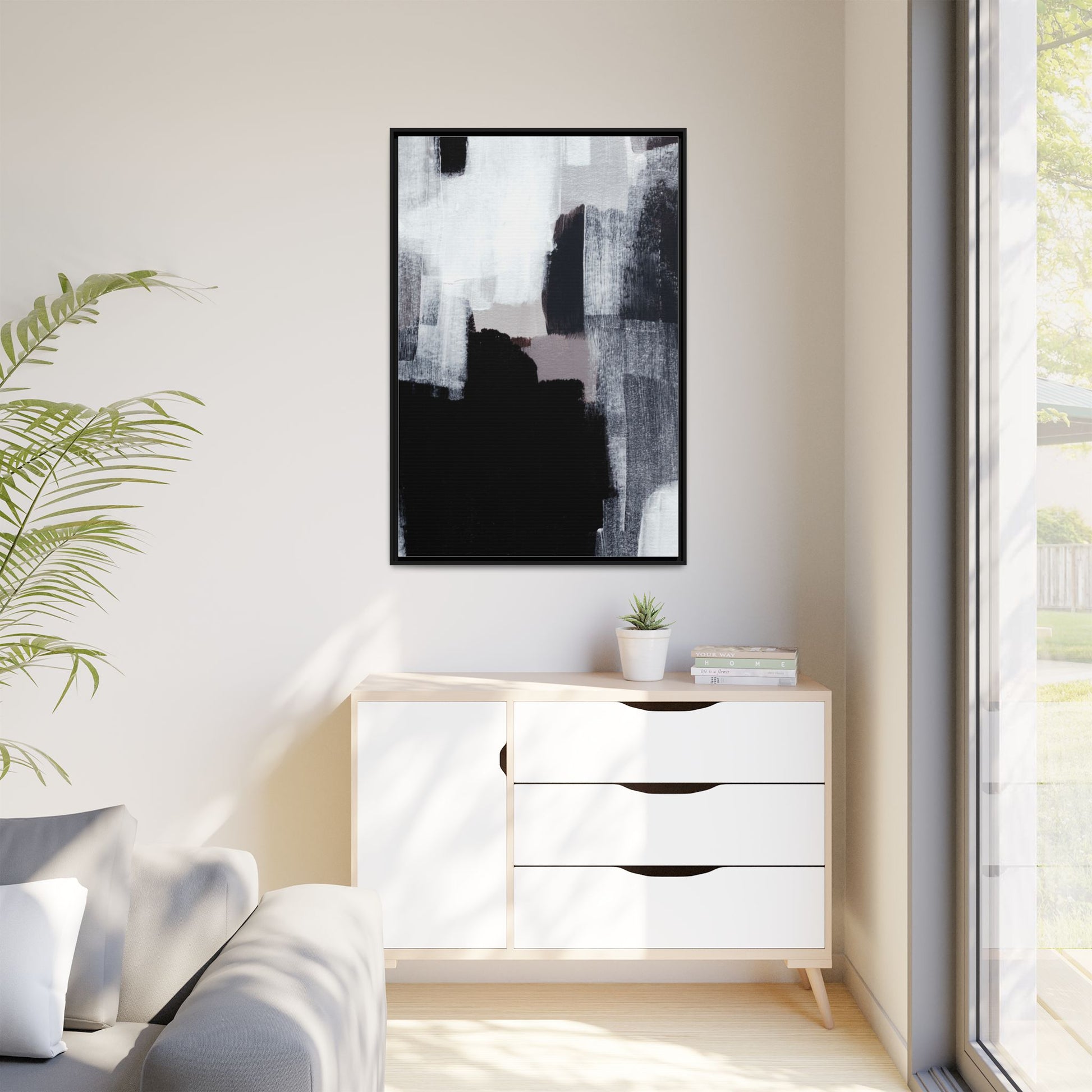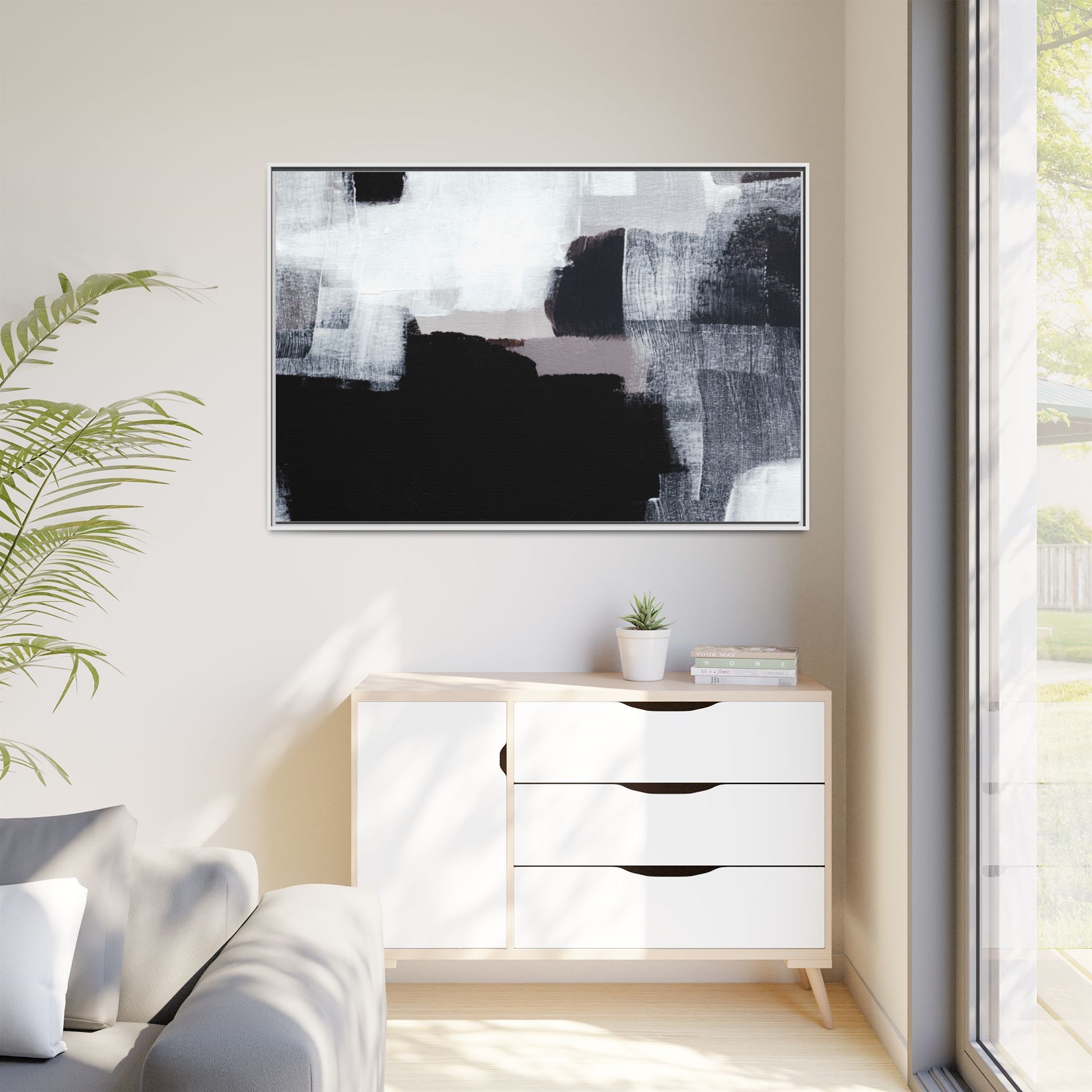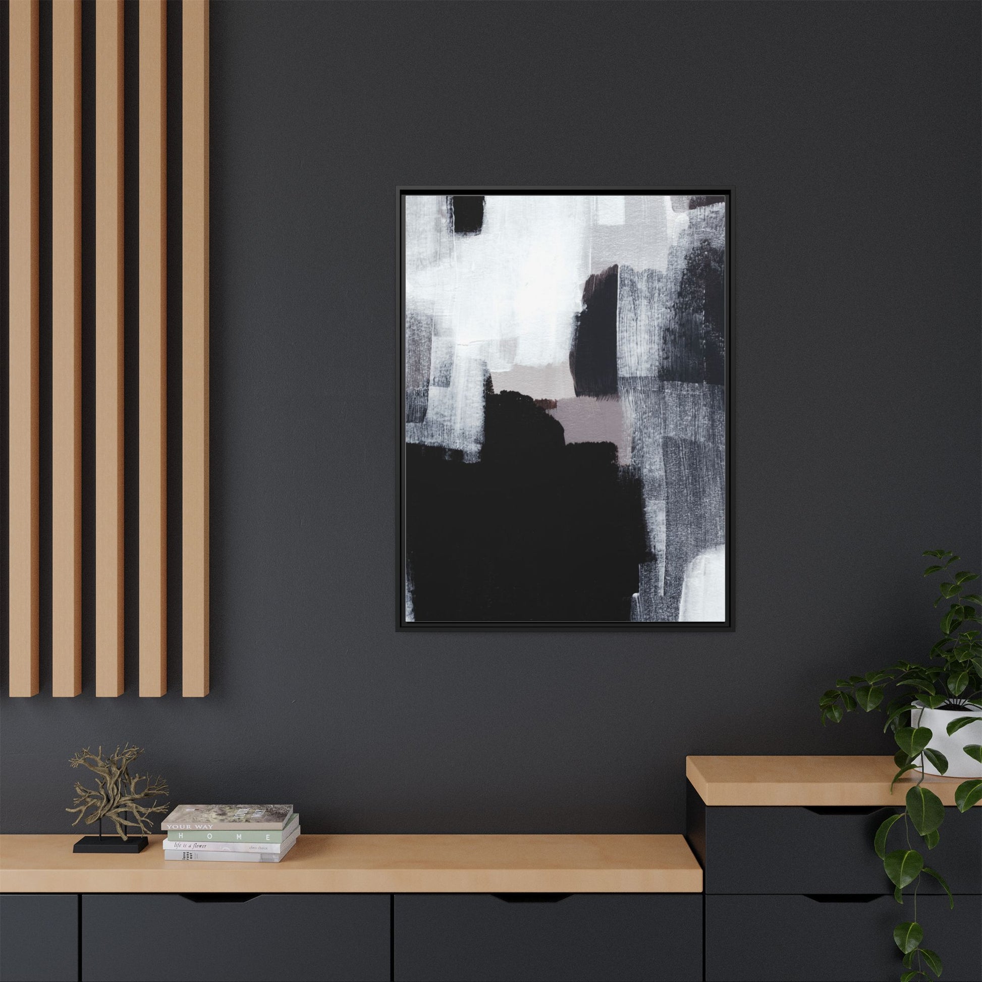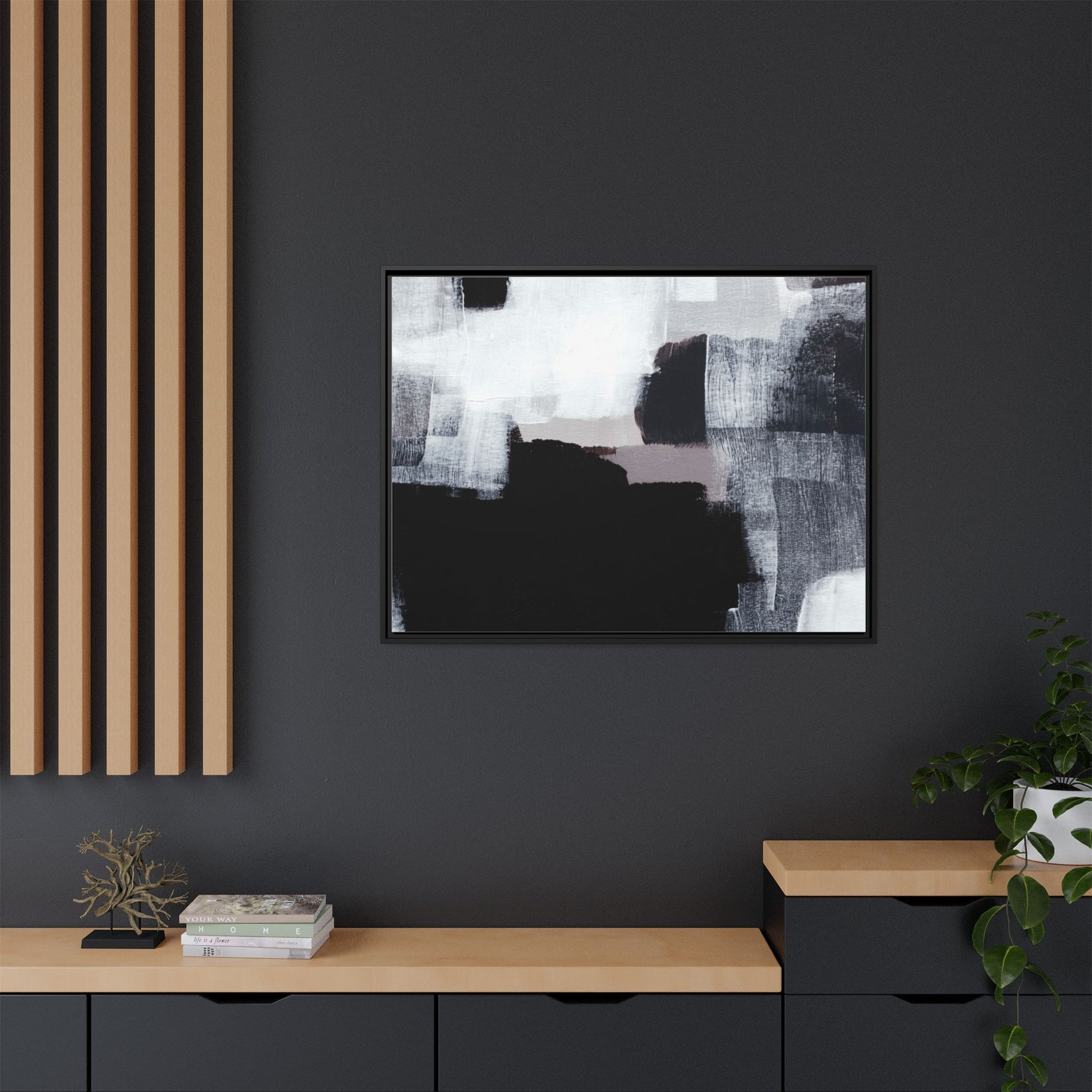This abstract painting showcases a monochromatic composition of black, white, and gray tones, creating a dynamic and textured visual landscape. Bold brushstrokes and layered paint create a sense of depth and movement across the canvas, with varying opacity and texture revealing intricate details. Large black shapes contrast against lighter gray and white backgrounds, giving the artwork a sense of dramatic tension and visual interest. The painting appears to use a technique that involves multiple layers of paint, with visible brush and palette knife marks that add tactile dimensionality to the piece. The overall aesthetic is minimalist yet complex, suggesting an exploration of form, negative space, and the interplay between light and dark elements.