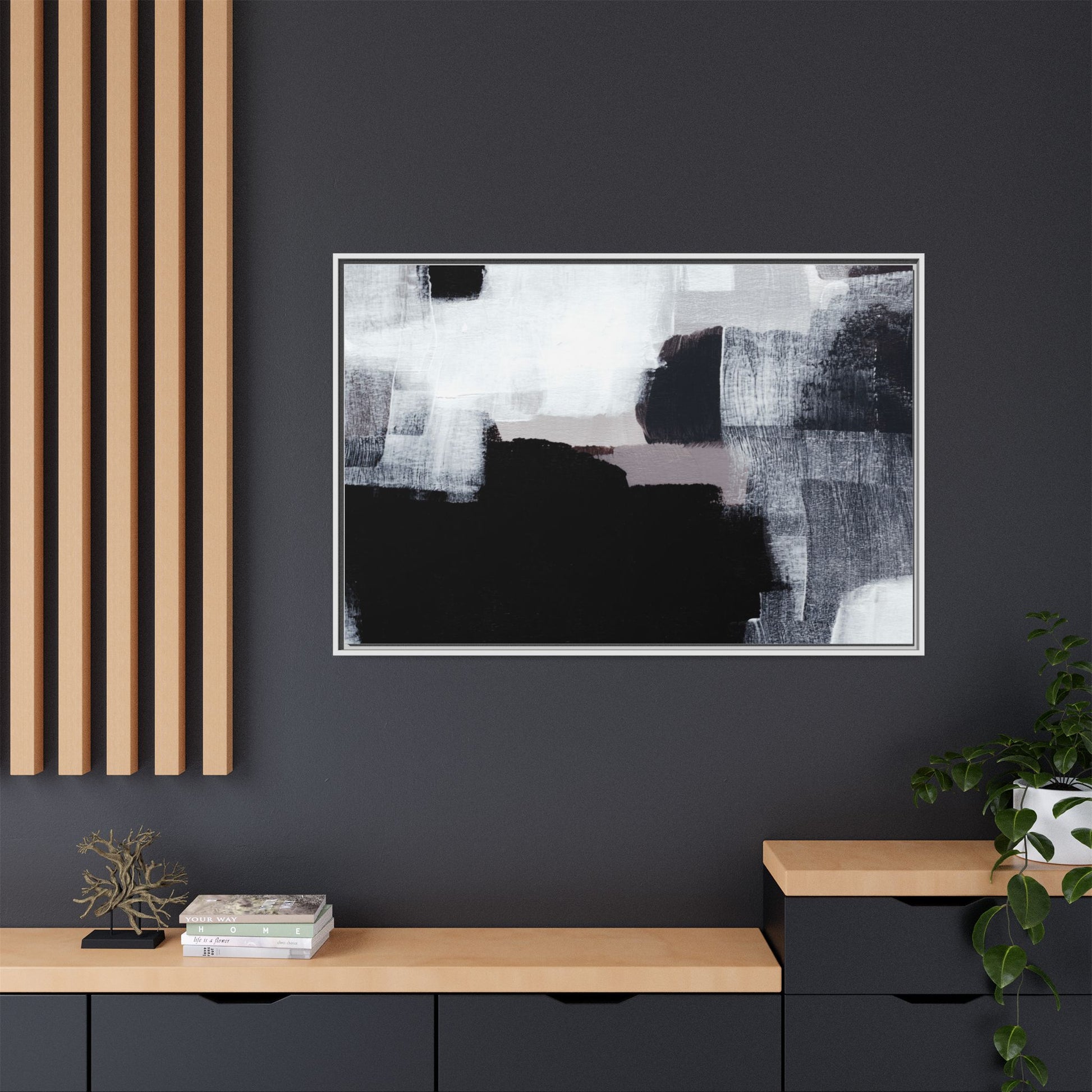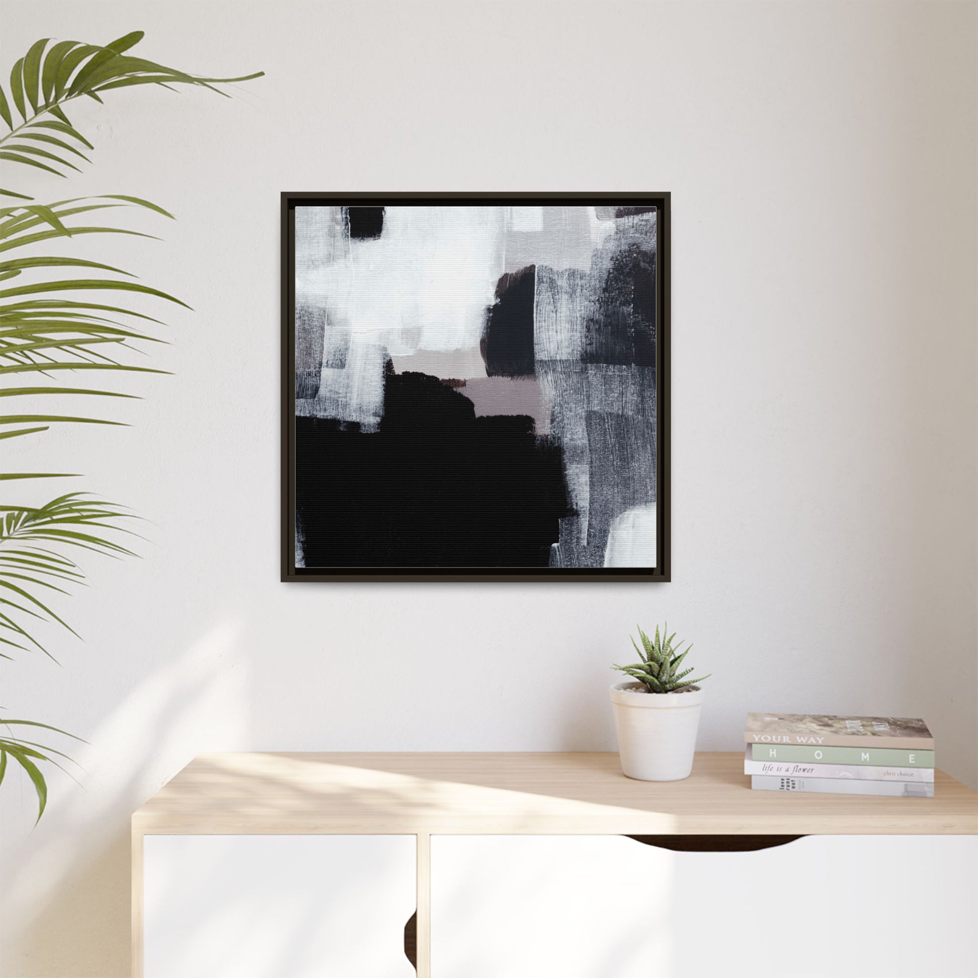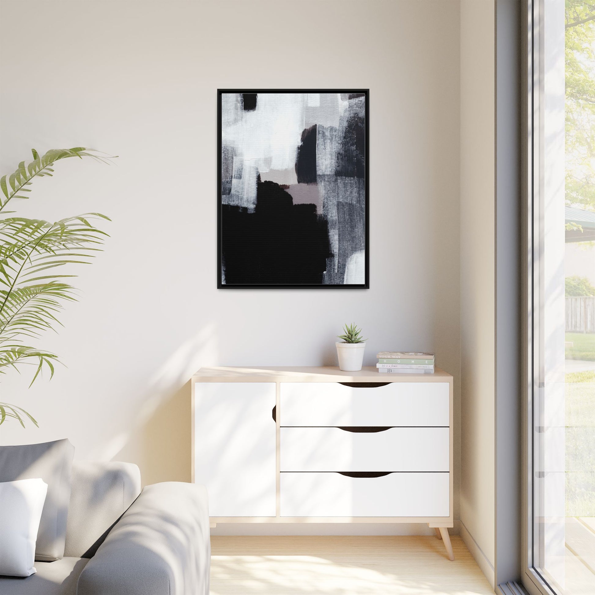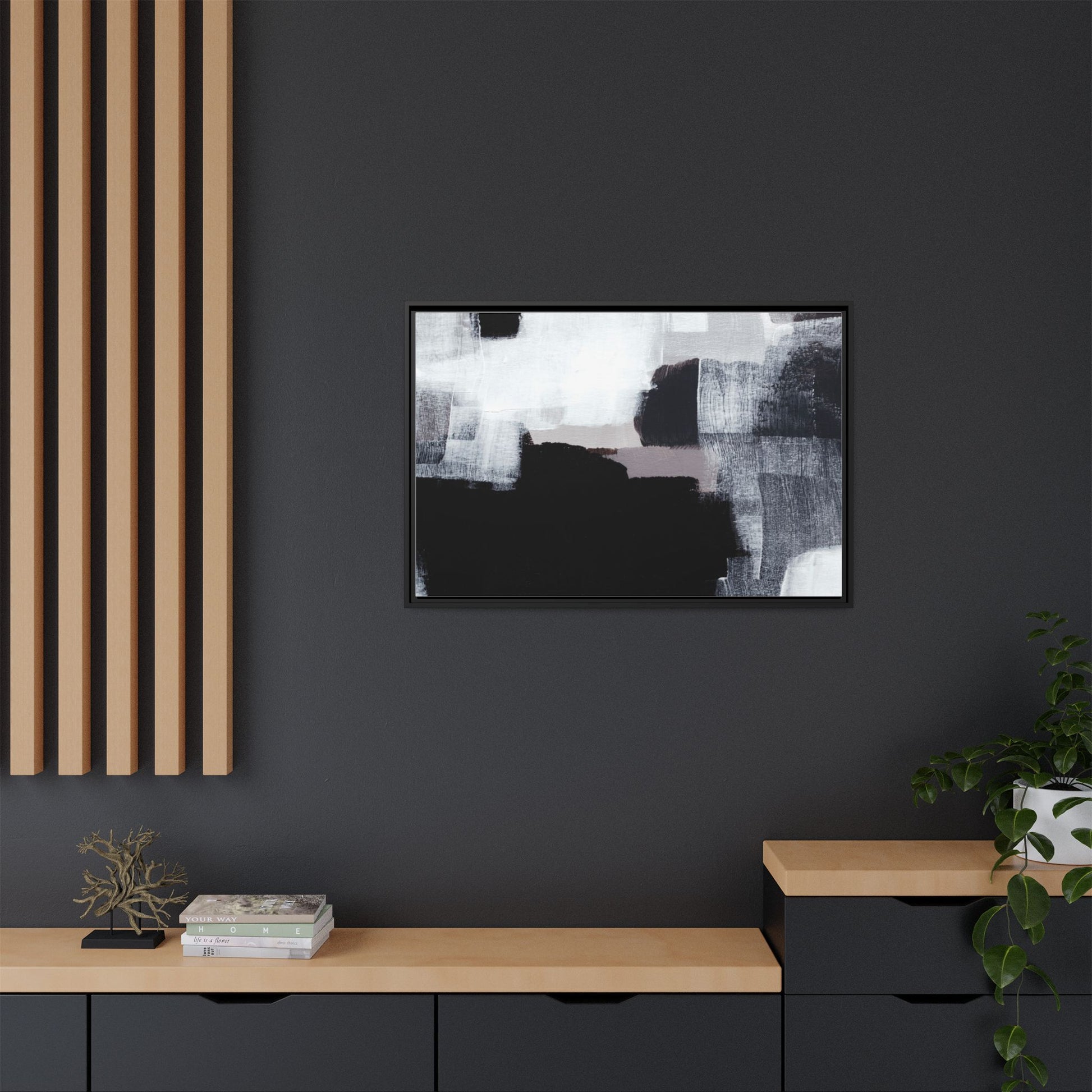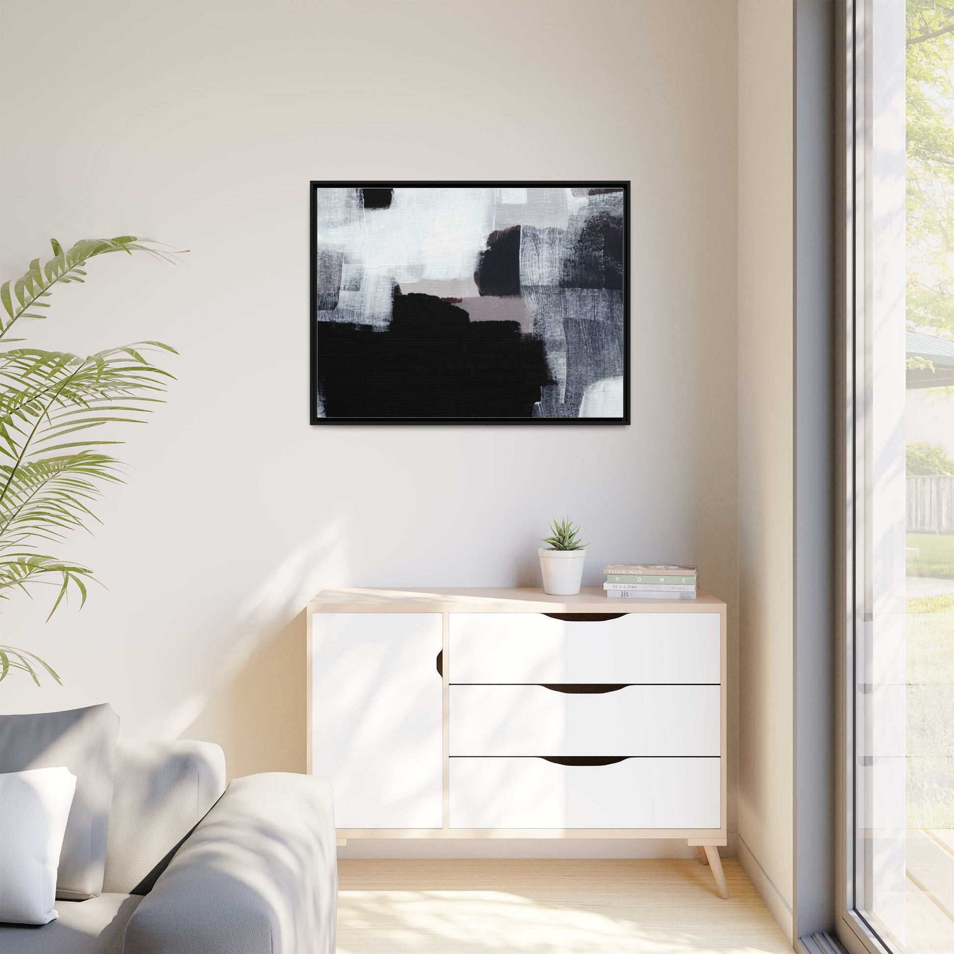 This abstract painting showcases a monochromatic composition of black, white, and gray tones, creating a dynamic and textured visual landscape. Bold brushstrokes and layered paint create a sense of depth and movement across the canvas, with varying opacity and texture revealing intricate details. Large black shapes contrast against lighter gray and white backgrounds, giving the artwork a sense of dramatic tension and visual interest. The painting appears to use a technique that involves multiple layers of paint, with visible brush and palette knife marks that add tactile dimensionality to the piece. The overall aesthetic is minimalist yet complex, suggesting an exploration of form, negative space, and the interplay between light and dark elements.