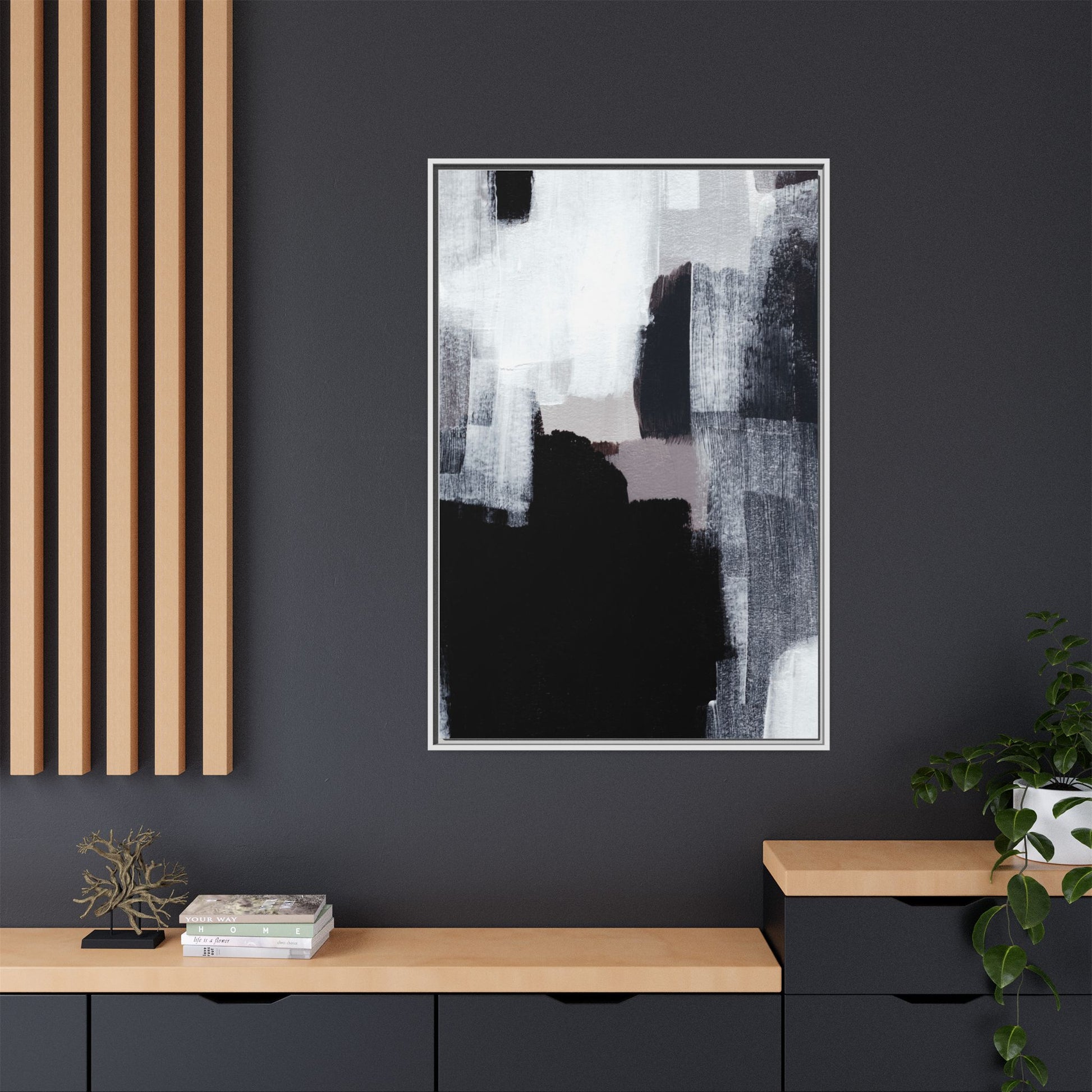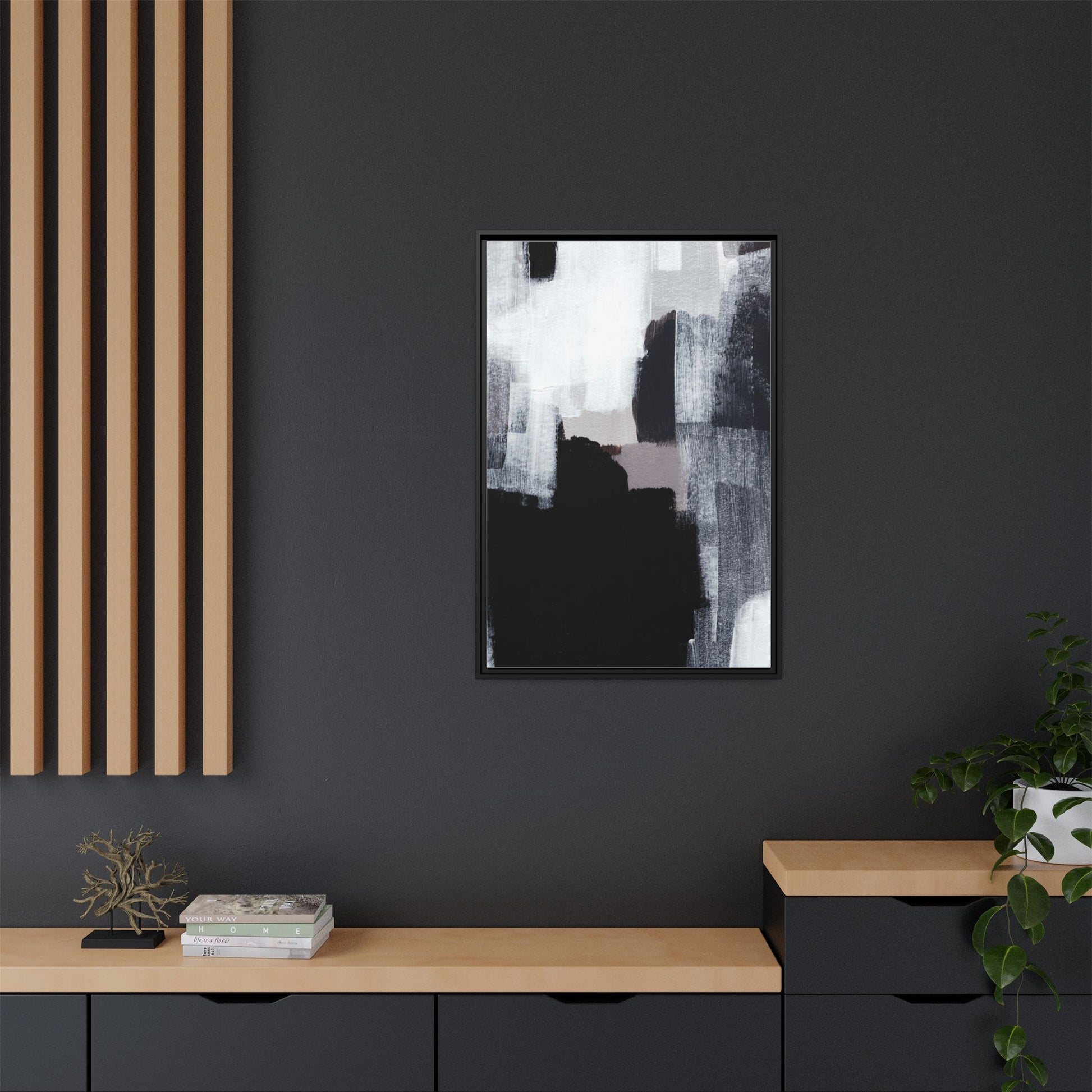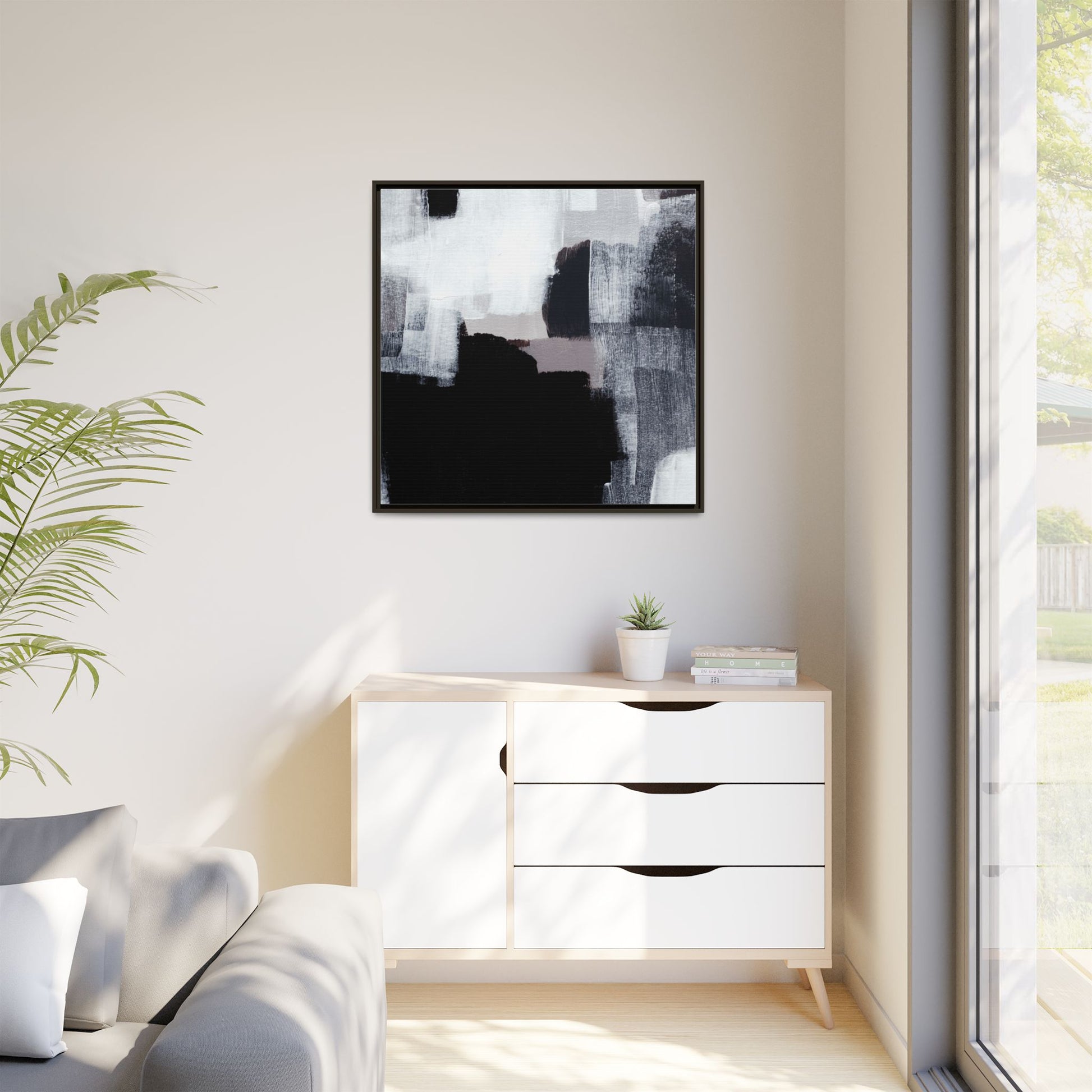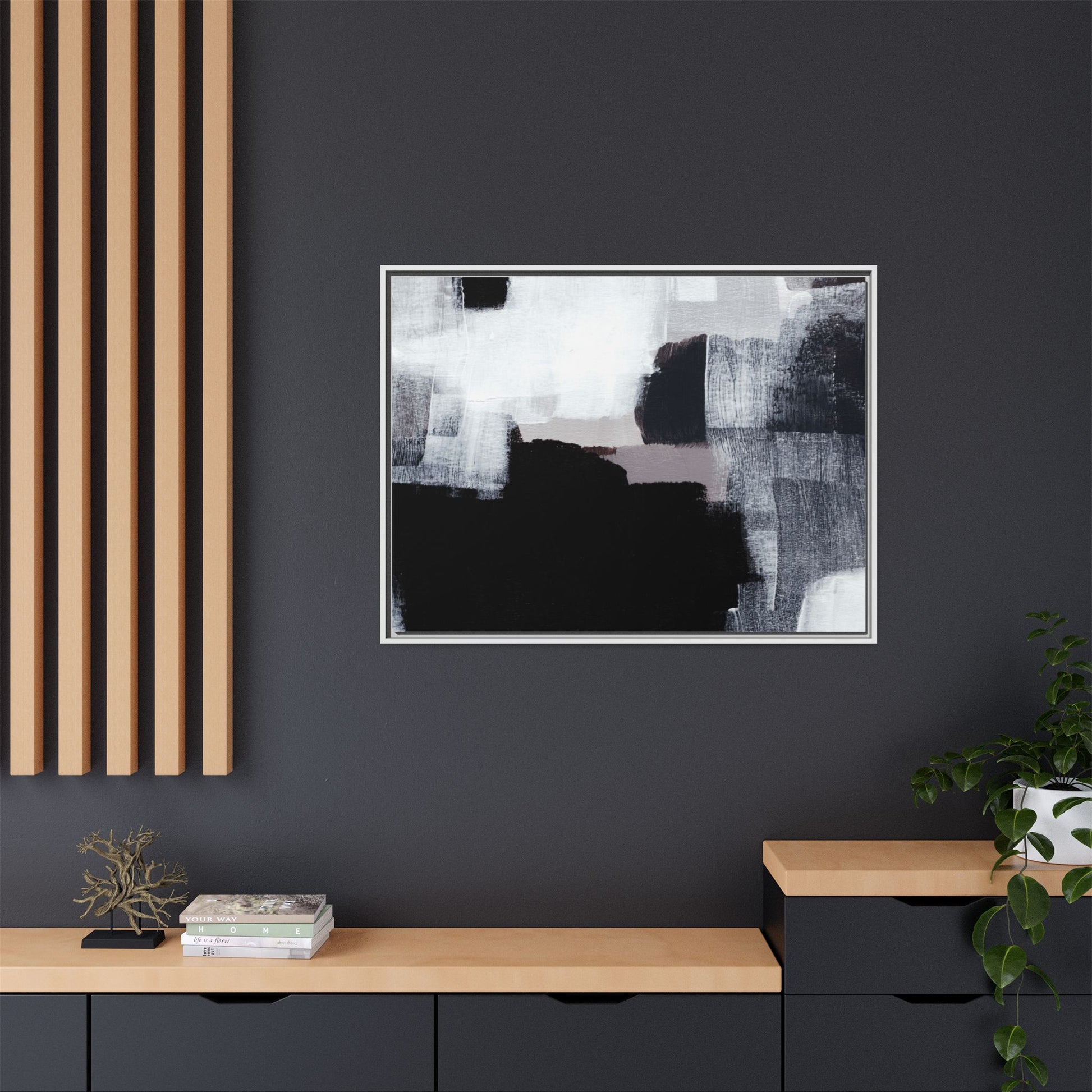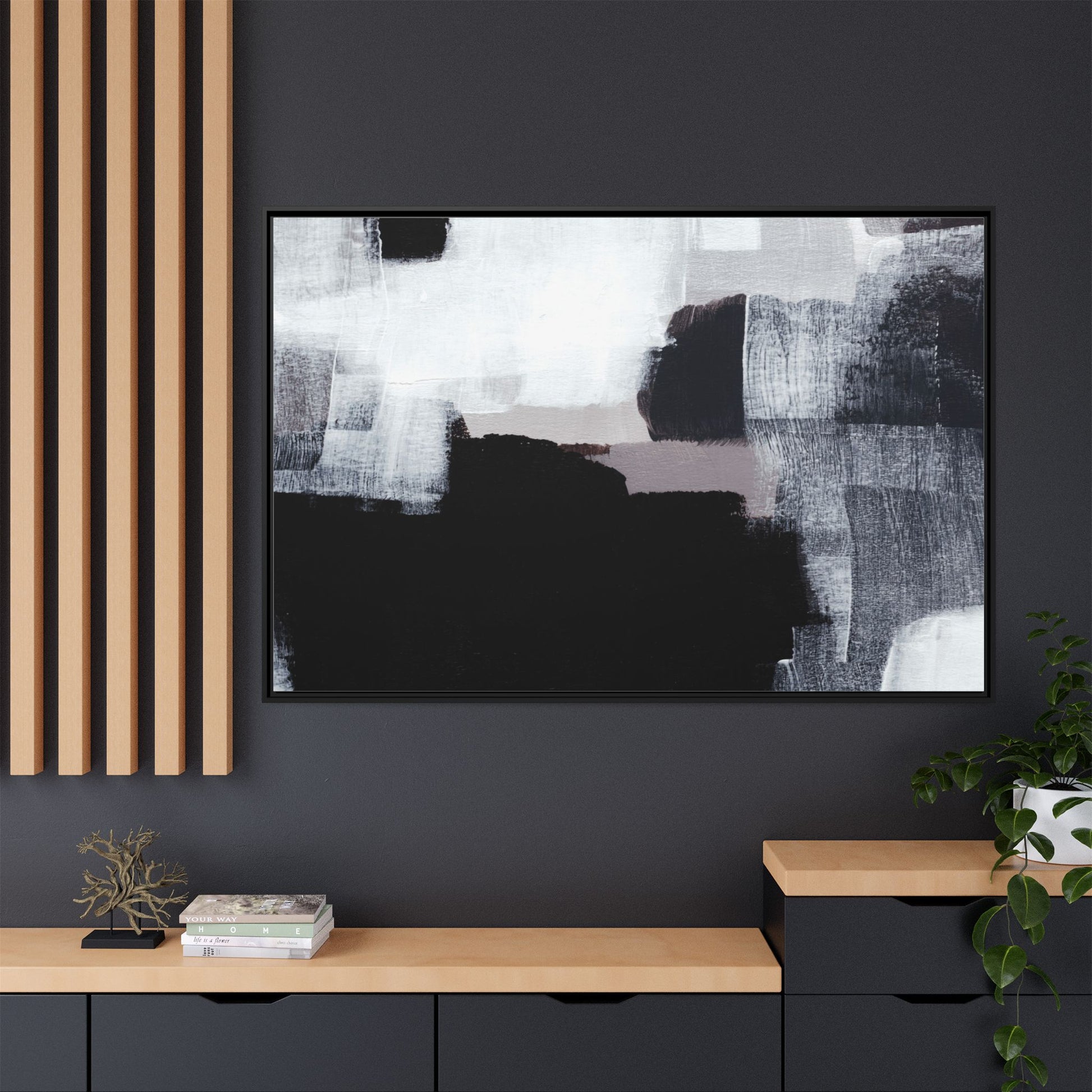 This abstract painting showcases a monochromatic composition of black, white, and gray tones, creating a dynamic and textured visual landscape. Bold brushstrokes and layered paint create a sense of depth and movement across the canvas, with varying opacity and texture revealing intricate details. Large black shapes contrast against lighter gray and white backgrounds, giving the artwork a sense of dramatic tension and visual interest. The painting appears to use a technique that involves multiple layers of paint, with visible brush and palette knife marks that add tactile dimensionality to the piece. The overall aesthetic is minimalist yet complex, suggesting an exploration of form, negative space, and the interplay between light and dark elements.