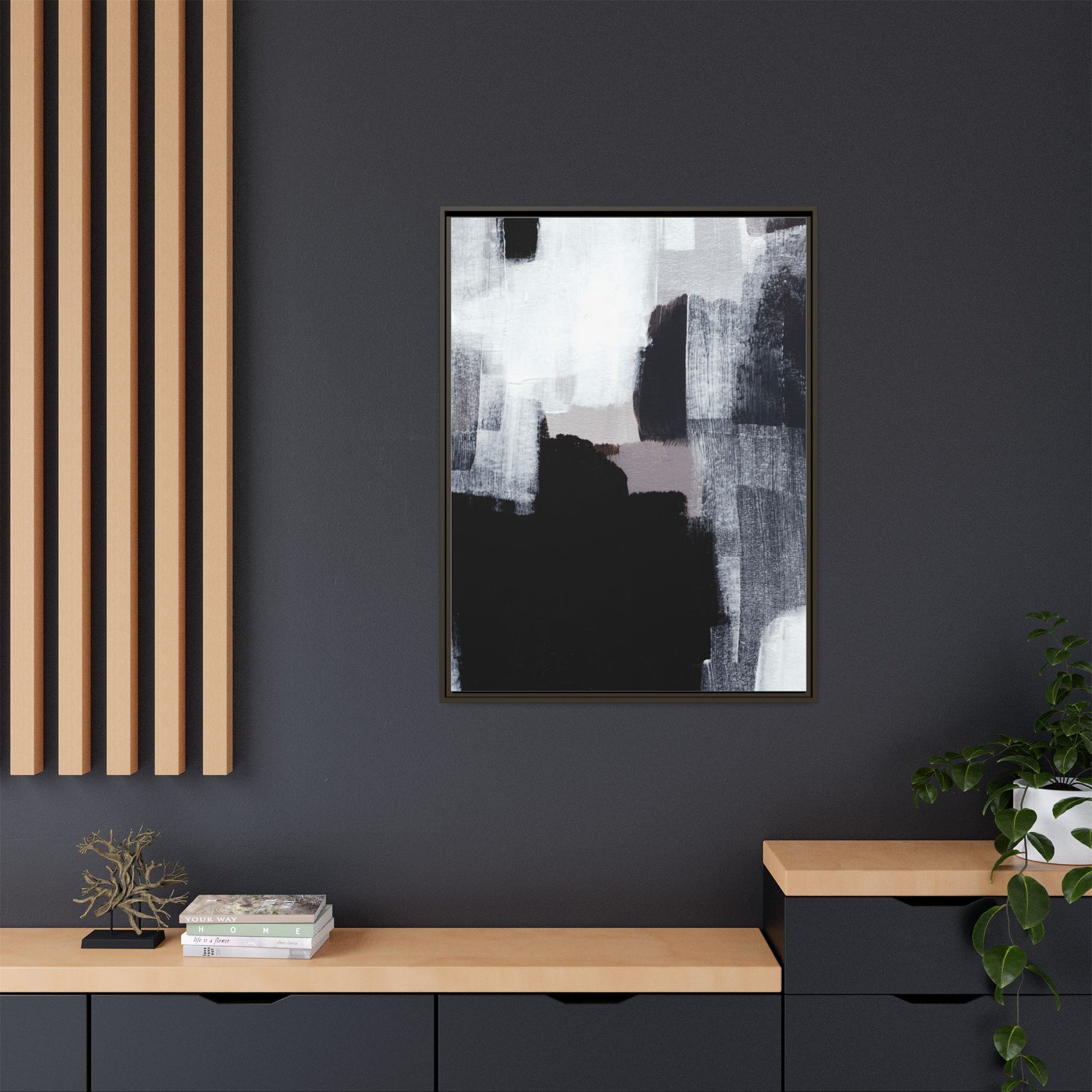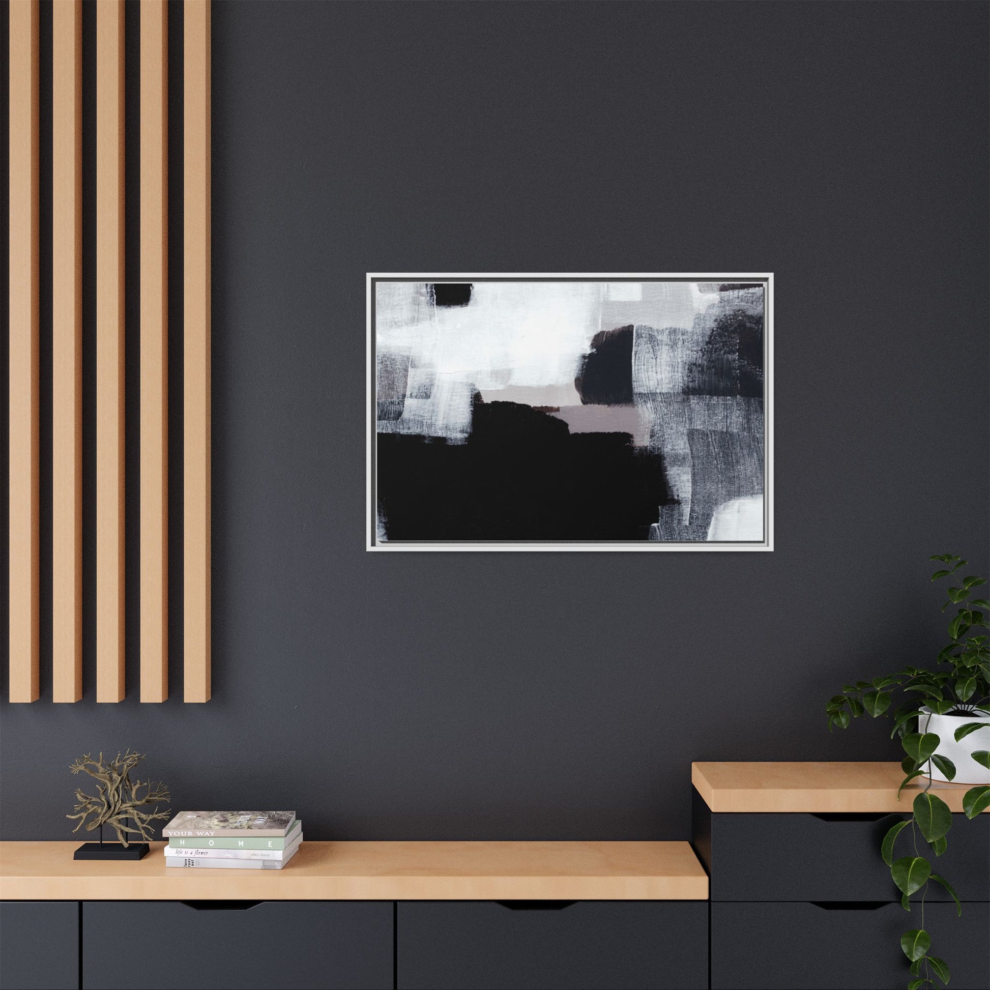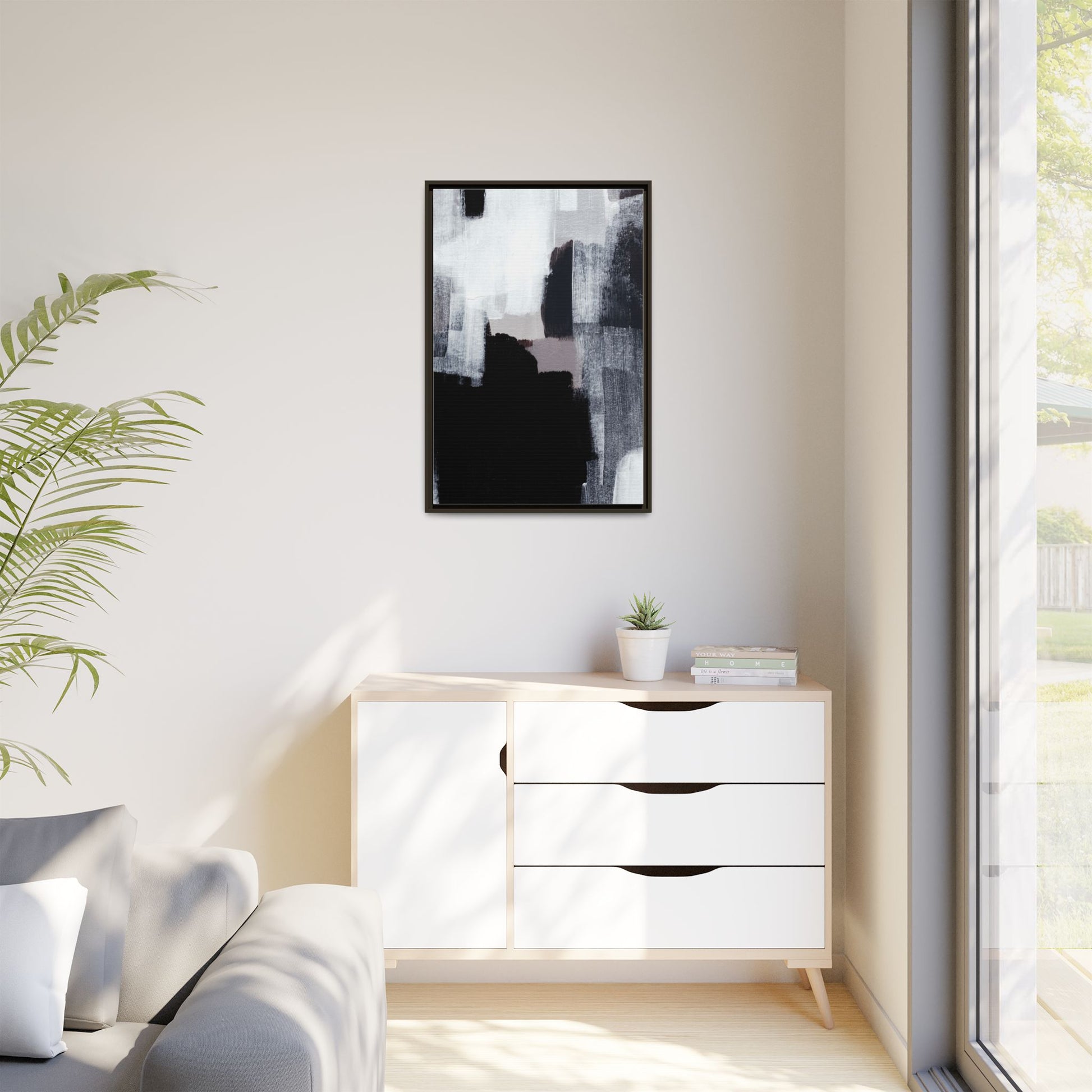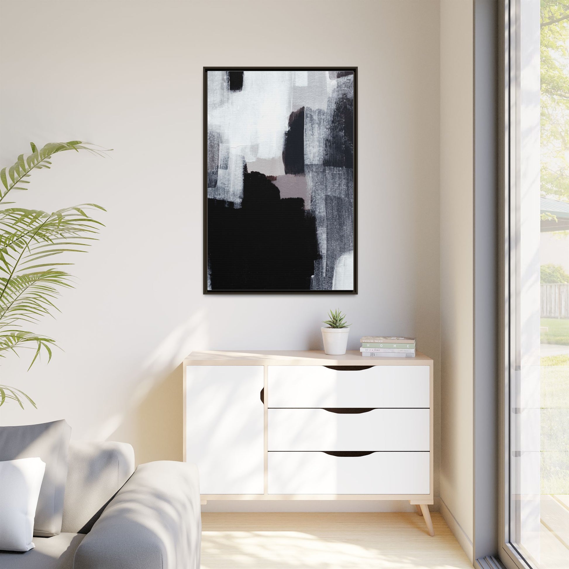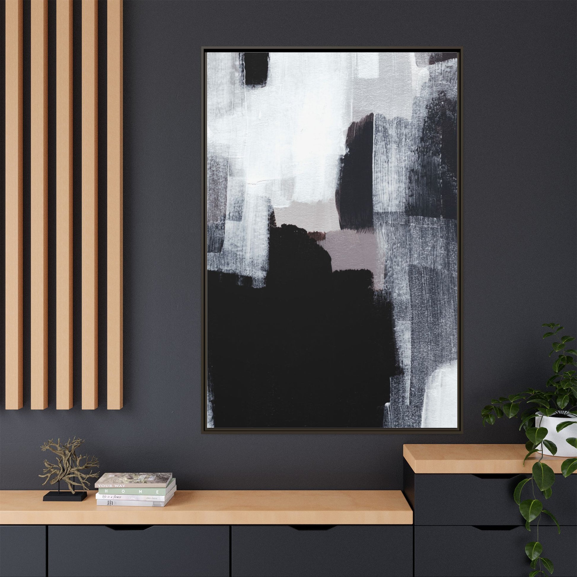 This abstract painting showcases a monochromatic composition of black, white, and gray tones, creating a dynamic and textured visual landscape. Bold brushstrokes and layered paint create a sense of depth and movement across the canvas, with varying opacity and texture revealing intricate details. Large black shapes contrast against lighter gray and white backgrounds, giving the artwork a sense of dramatic tension and visual interest. The painting appears to use a technique that involves multiple layers of paint, with visible brush and palette knife marks that add tactile dimensionality to the piece. The overall aesthetic is minimalist yet complex, suggesting an exploration of form, negative space, and the interplay between light and dark elements.