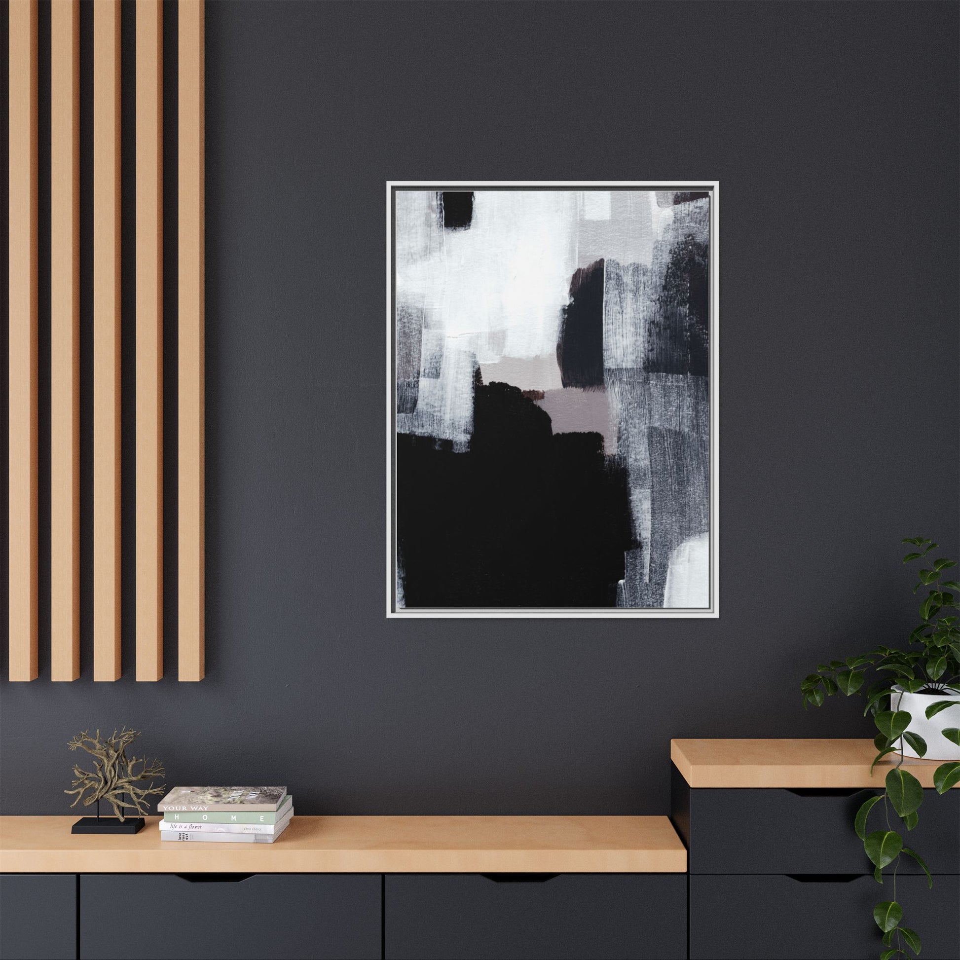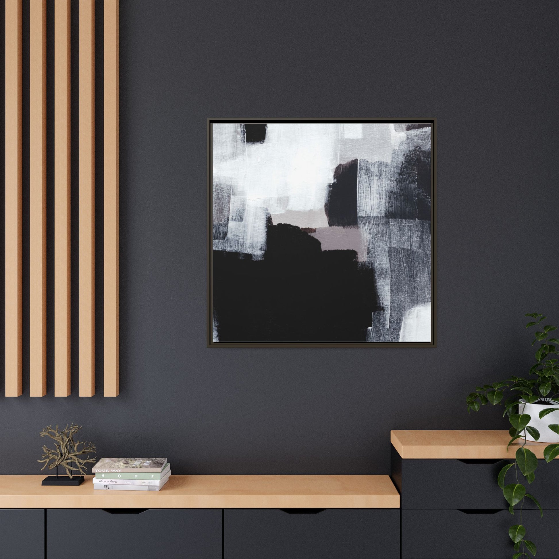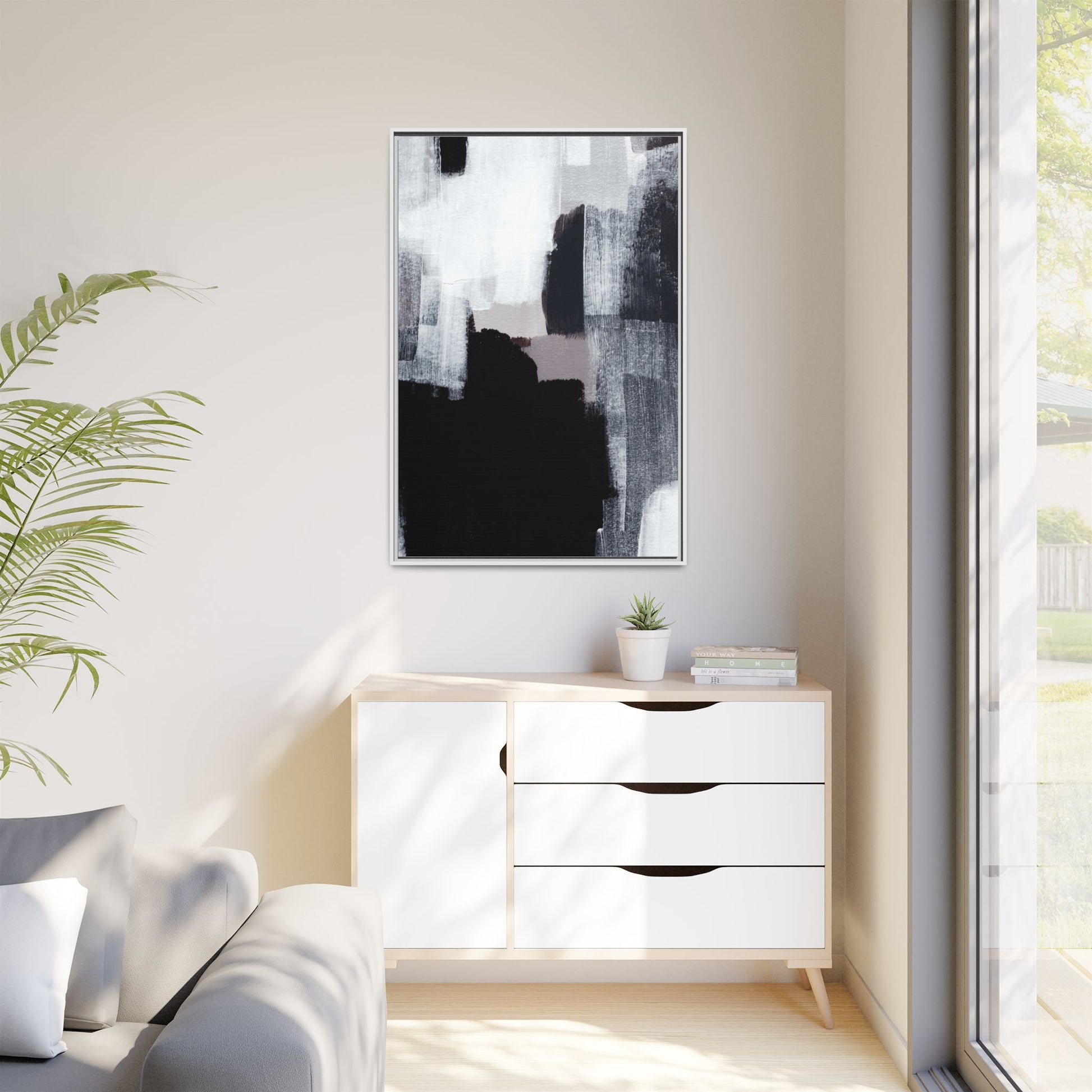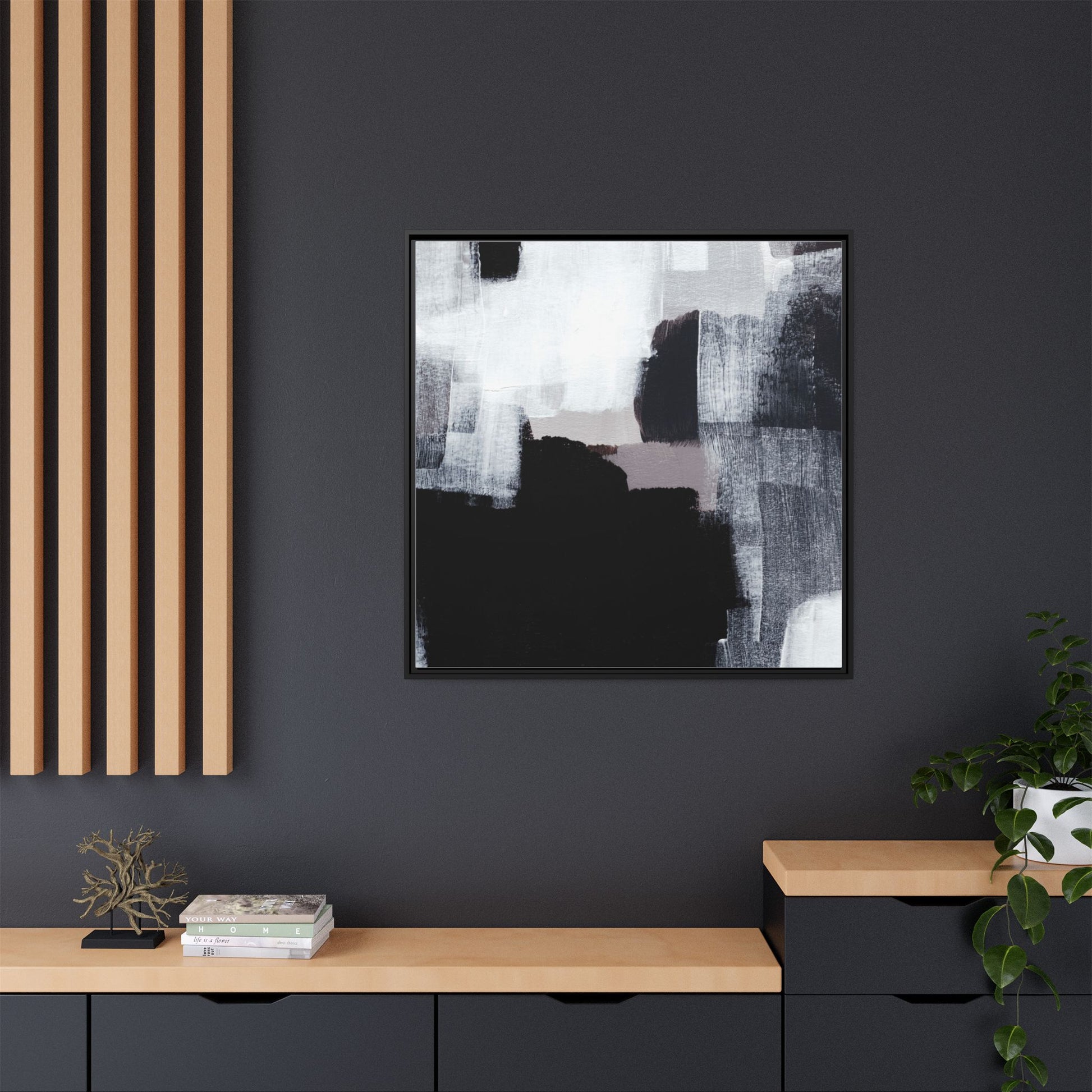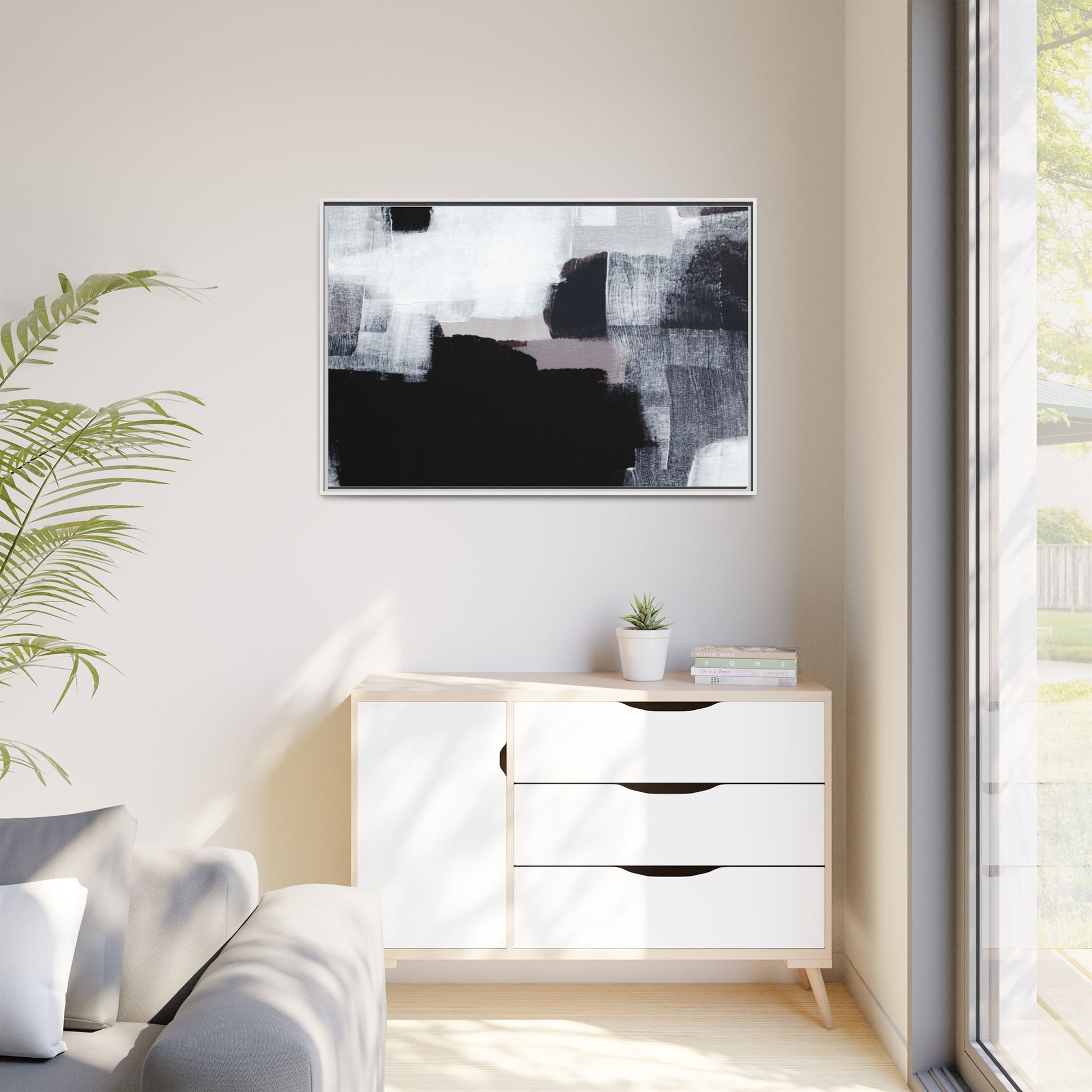 This abstract painting showcases a monochromatic composition of black, white, and gray tones, creating a dynamic and textured visual landscape. Bold brushstrokes and layered paint create a sense of depth and movement across the canvas, with varying opacity and texture revealing intricate details. Large black shapes contrast against lighter gray and white backgrounds, giving the artwork a sense of dramatic tension and visual interest. The painting appears to use a technique that involves multiple layers of paint, with visible brush and palette knife marks that add tactile dimensionality to the piece. The overall aesthetic is minimalist yet complex, suggesting an exploration of form, negative space, and the interplay between light and dark elements.