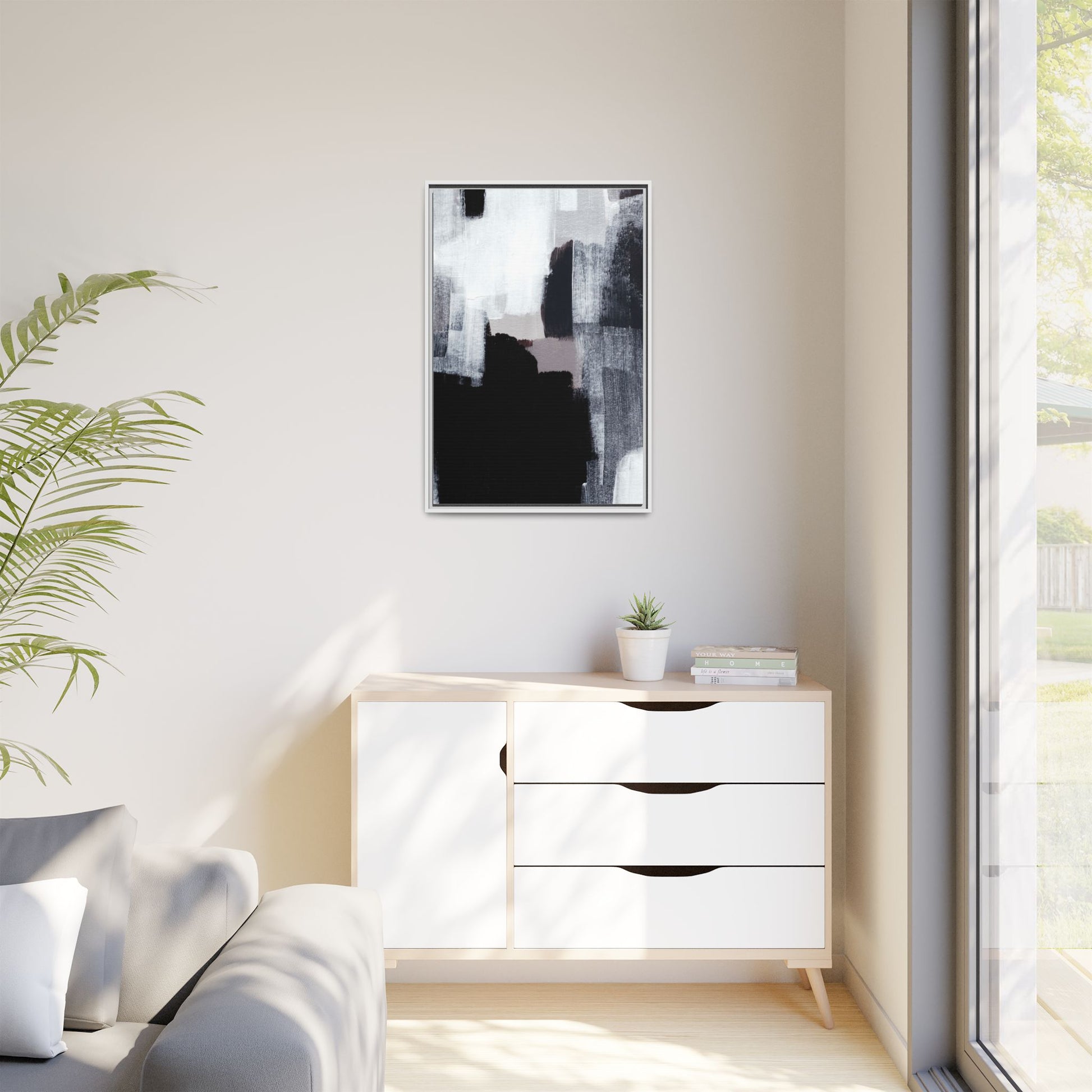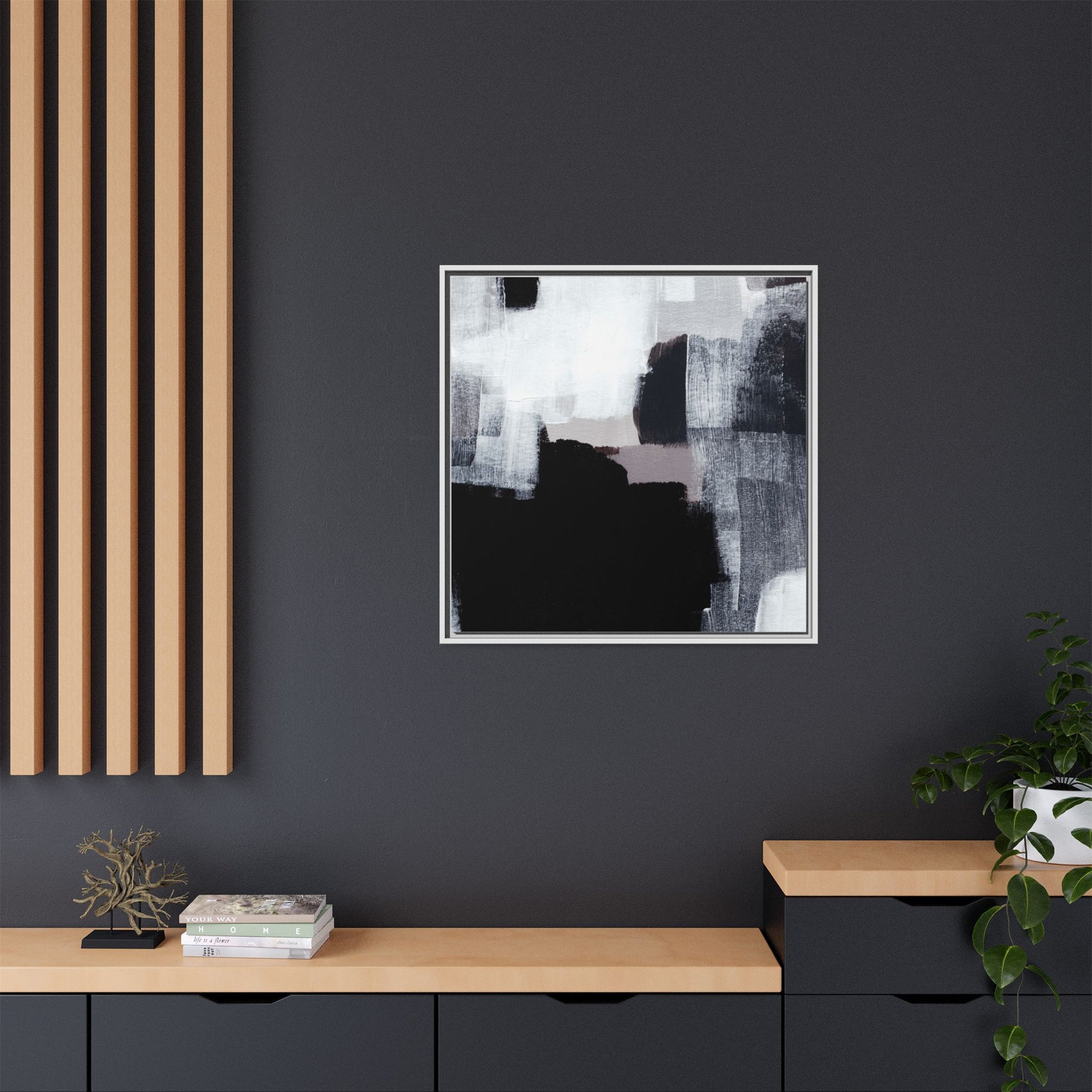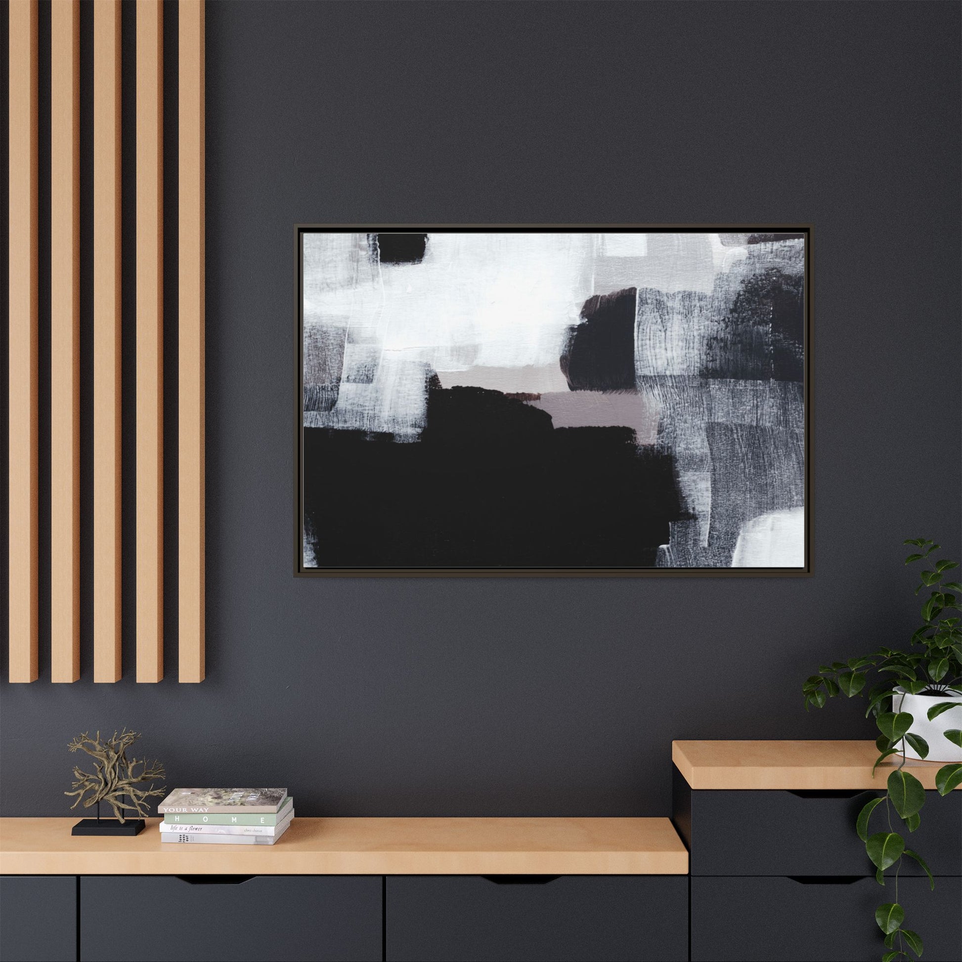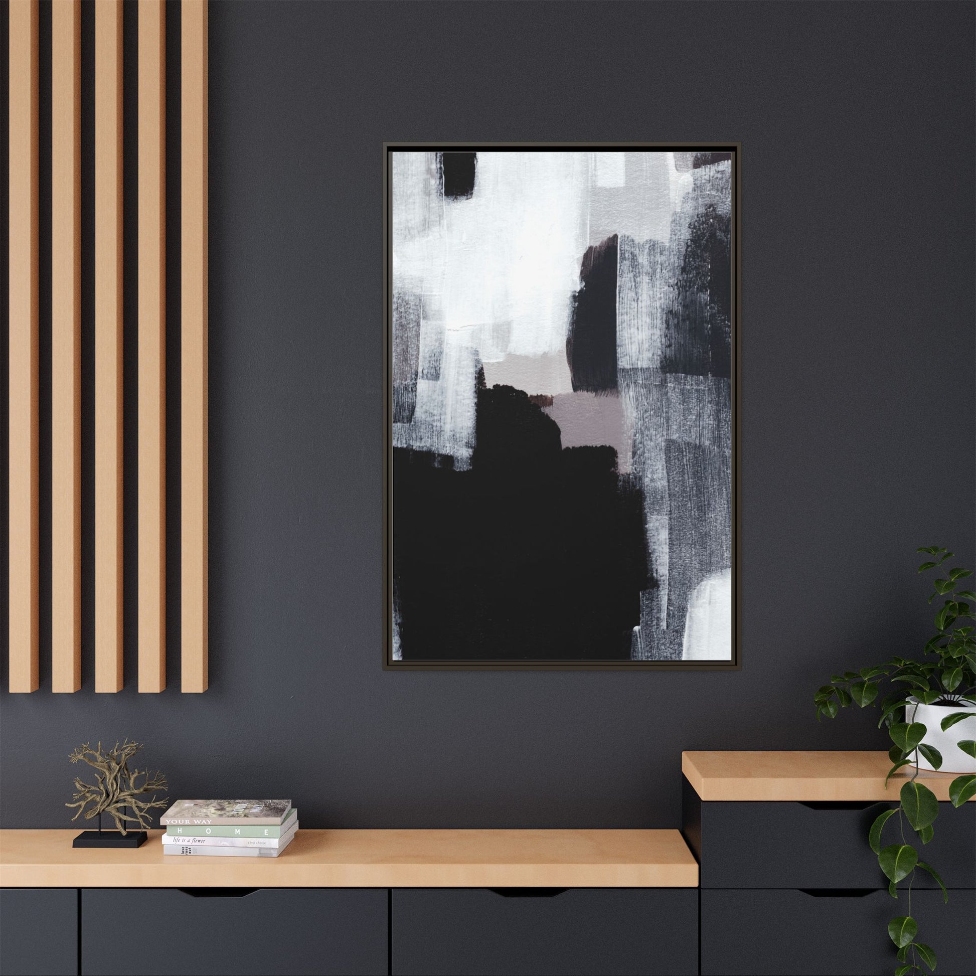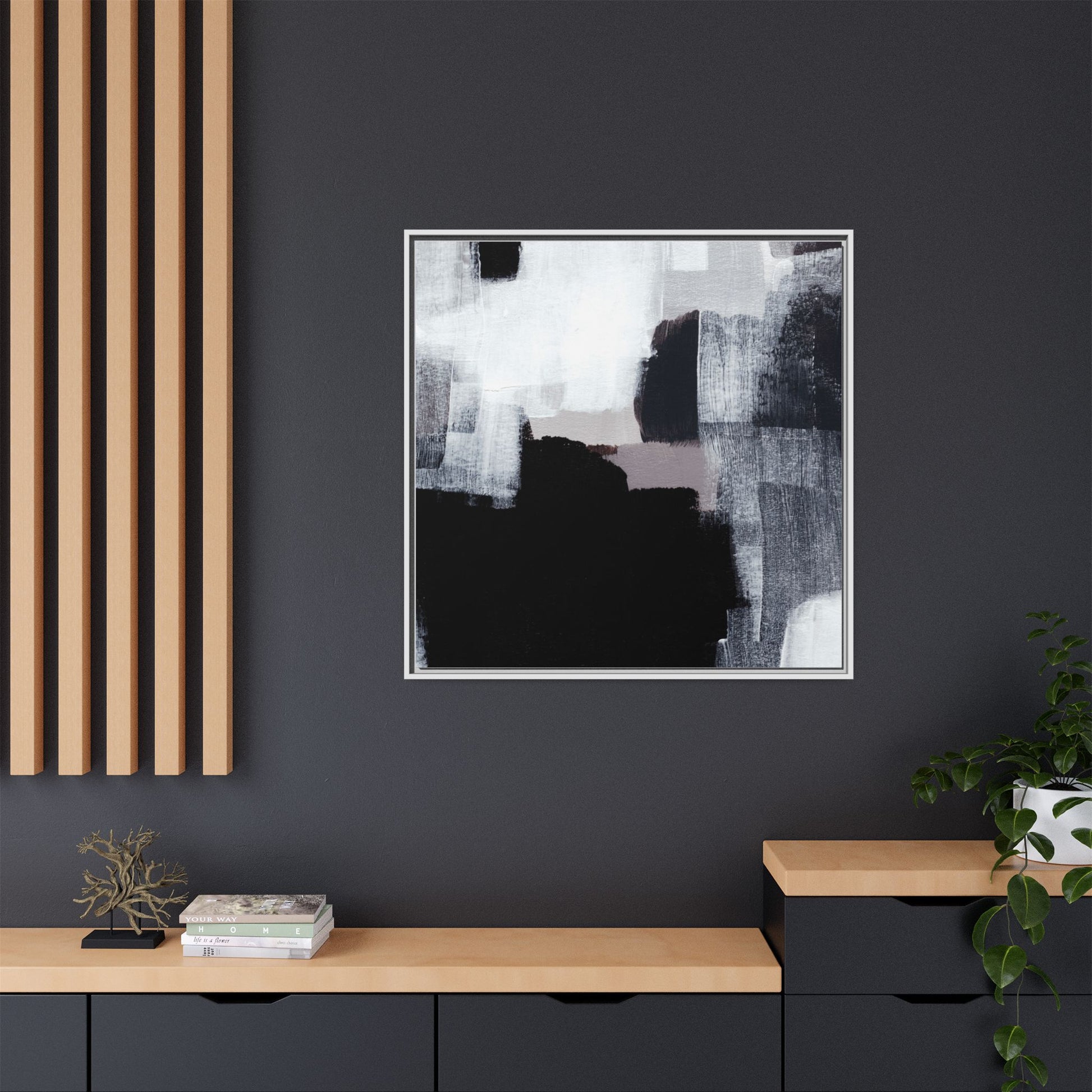 This abstract painting showcases a monochromatic composition of black, white, and gray tones, creating a dynamic and textured visual landscape. Bold brushstrokes and layered paint create a sense of depth and movement across the canvas, with varying opacity and texture revealing intricate details. Large black shapes contrast against lighter gray and white backgrounds, giving the artwork a sense of dramatic tension and visual interest. The painting appears to use a technique that involves multiple layers of paint, with visible brush and palette knife marks that add tactile dimensionality to the piece. The overall aesthetic is minimalist yet complex, suggesting an exploration of form, negative space, and the interplay between light and dark elements.