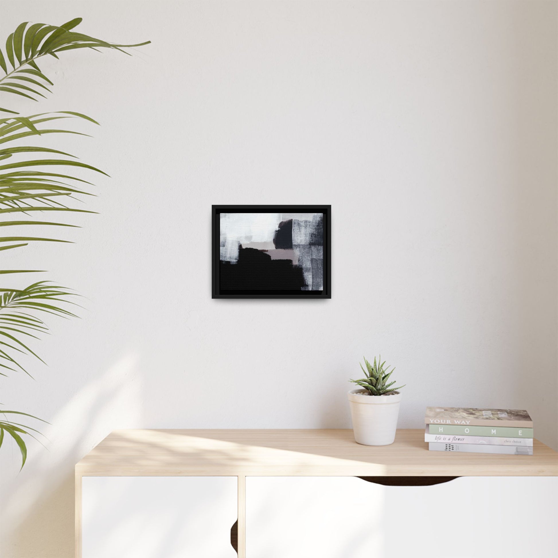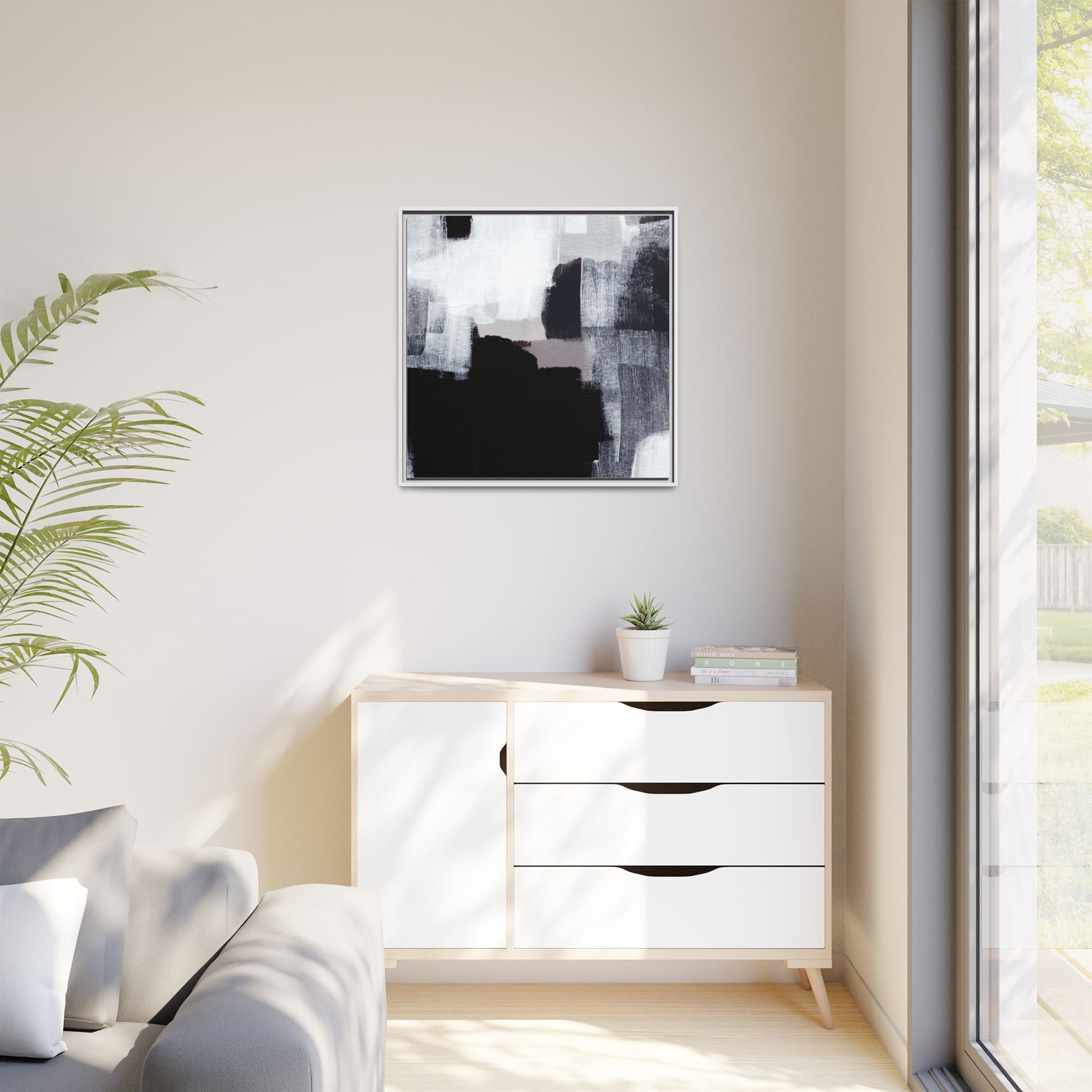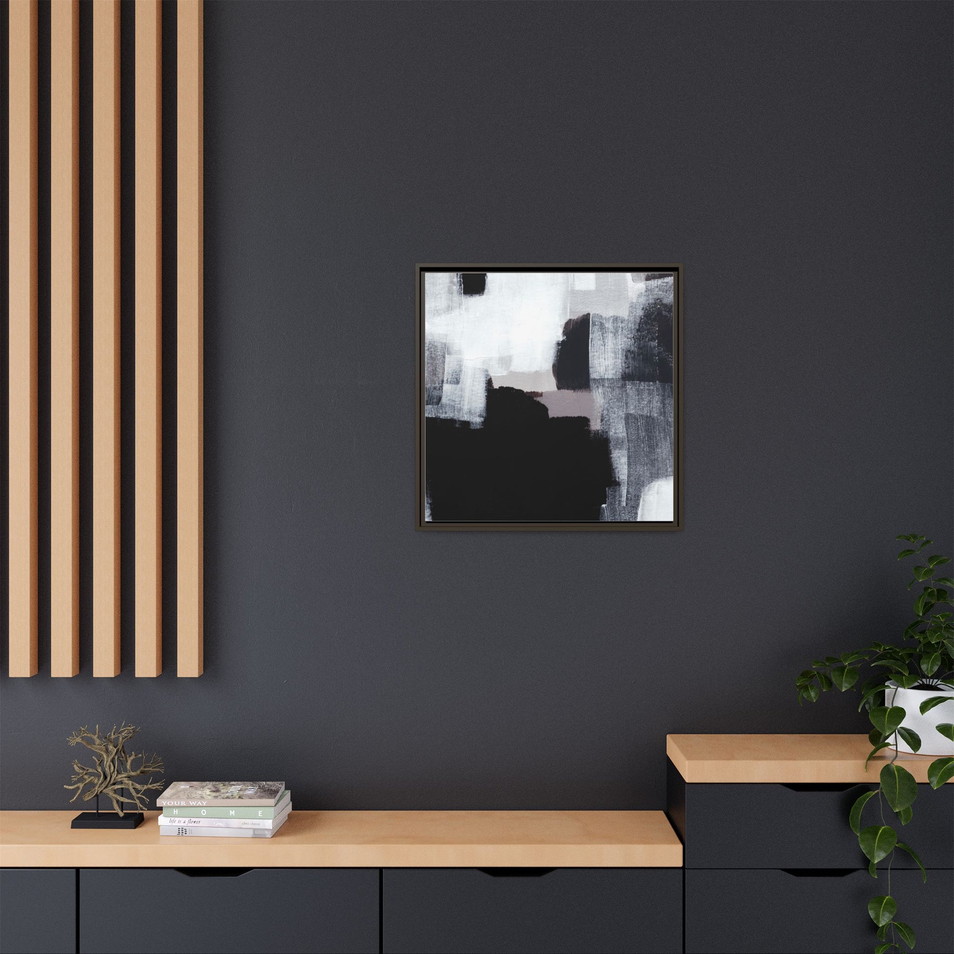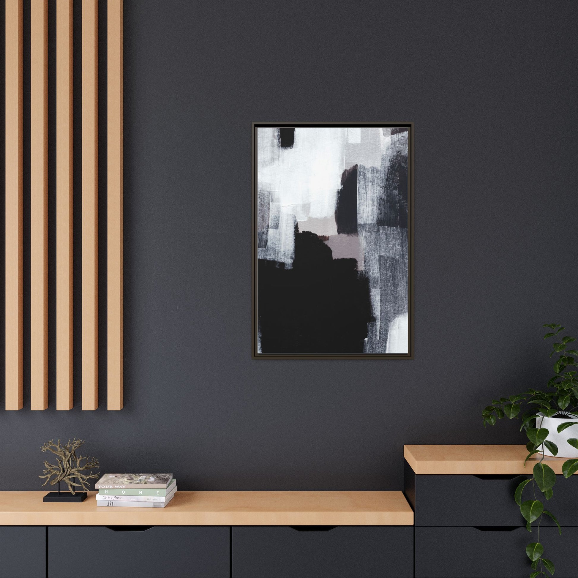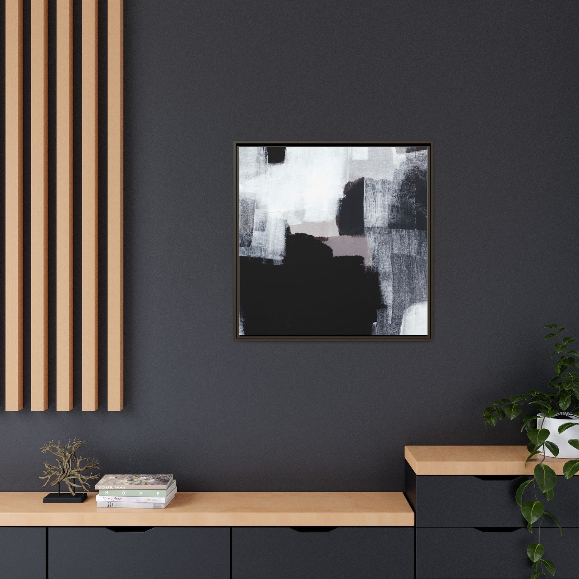 This abstract painting showcases a monochromatic composition of black, white, and gray tones, creating a dynamic and textured visual landscape. Bold brushstrokes and layered paint create a sense of depth and movement across the canvas, with varying opacity and texture revealing intricate details. Large black shapes contrast against lighter gray and white backgrounds, giving the artwork a sense of dramatic tension and visual interest. The painting appears to use a technique that involves multiple layers of paint, with visible brush and palette knife marks that add tactile dimensionality to the piece. The overall aesthetic is minimalist yet complex, suggesting an exploration of form, negative space, and the interplay between light and dark elements.