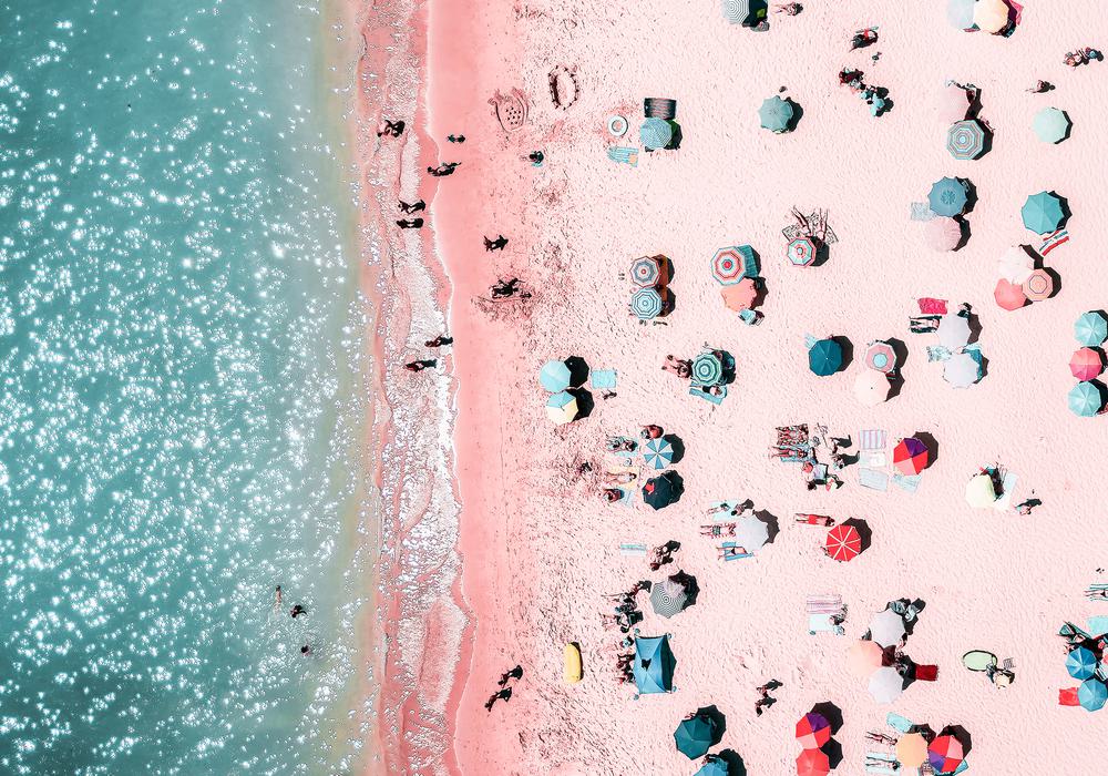 An aerial dance between sunlit waves and a vibrant beach, where umbrellas bloom like technicolor petals in a sunlit tapestry.