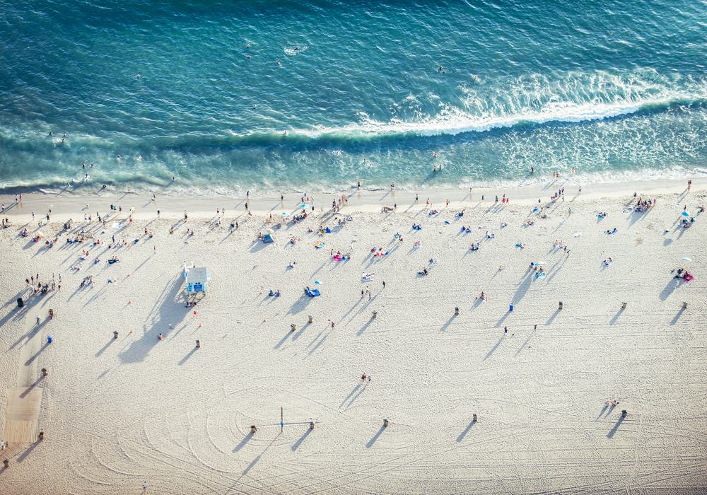A birds-eye view captures a sunlit beach where shadows play across the sand, meeting the rhythmic embrace of azure waves.
