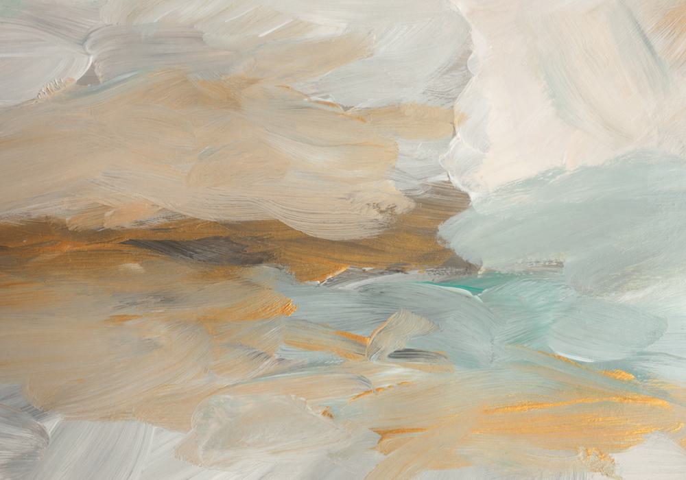 An abstract dance of muted sienna and soft aqua sweeps across the canvas, evoking windswept dunes under a pale, expansive sky.