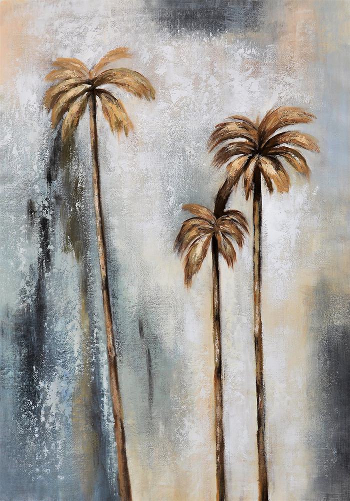Three slender palms stretch upwards, their fronds whispering secrets against a textured backdrop, creating a dreamlike ambiance.