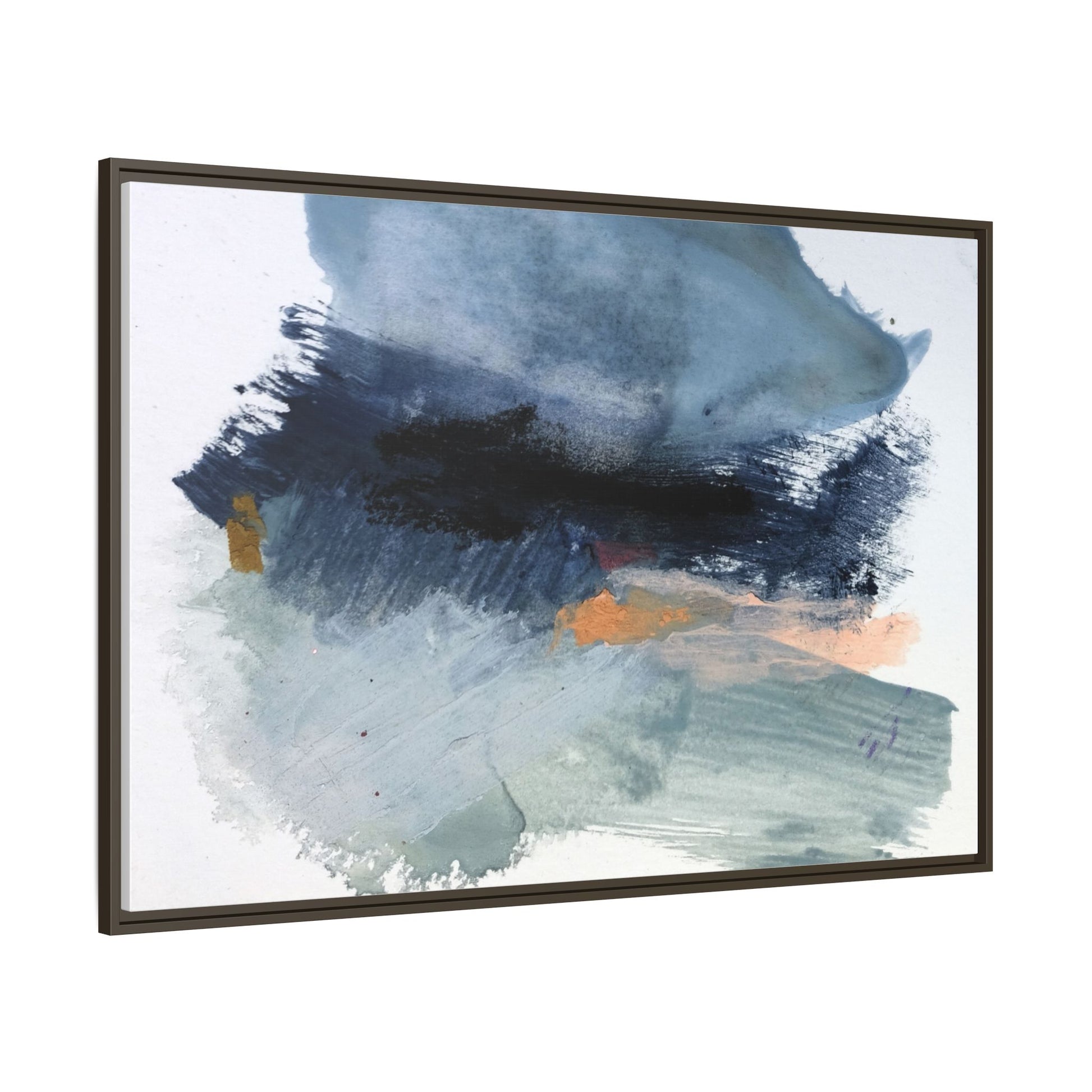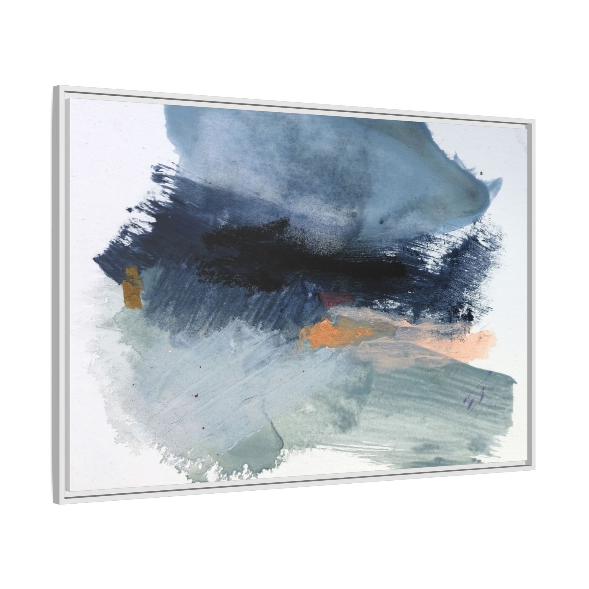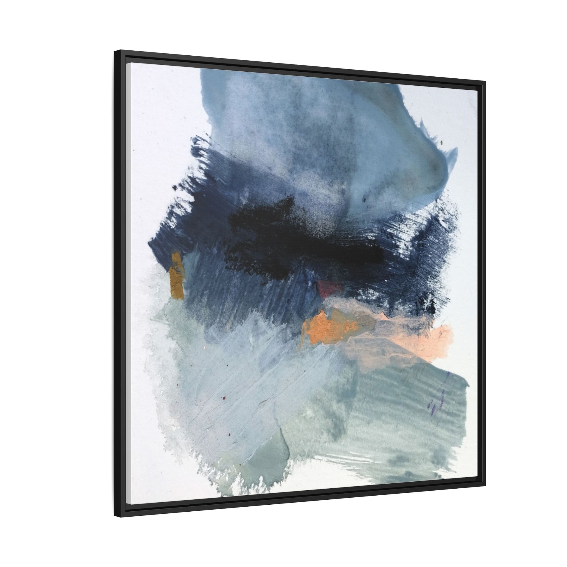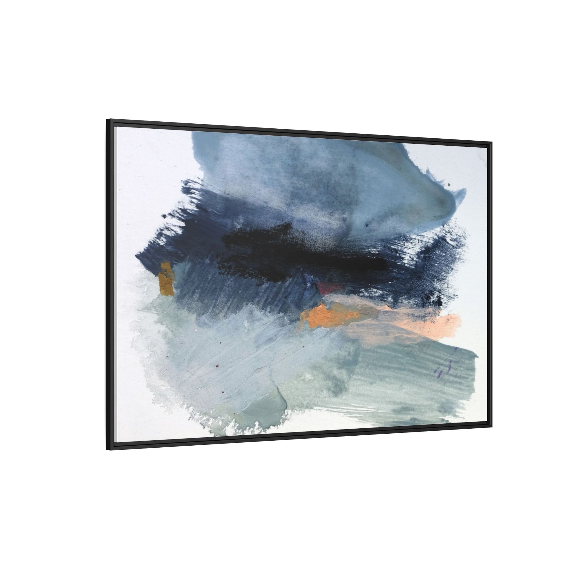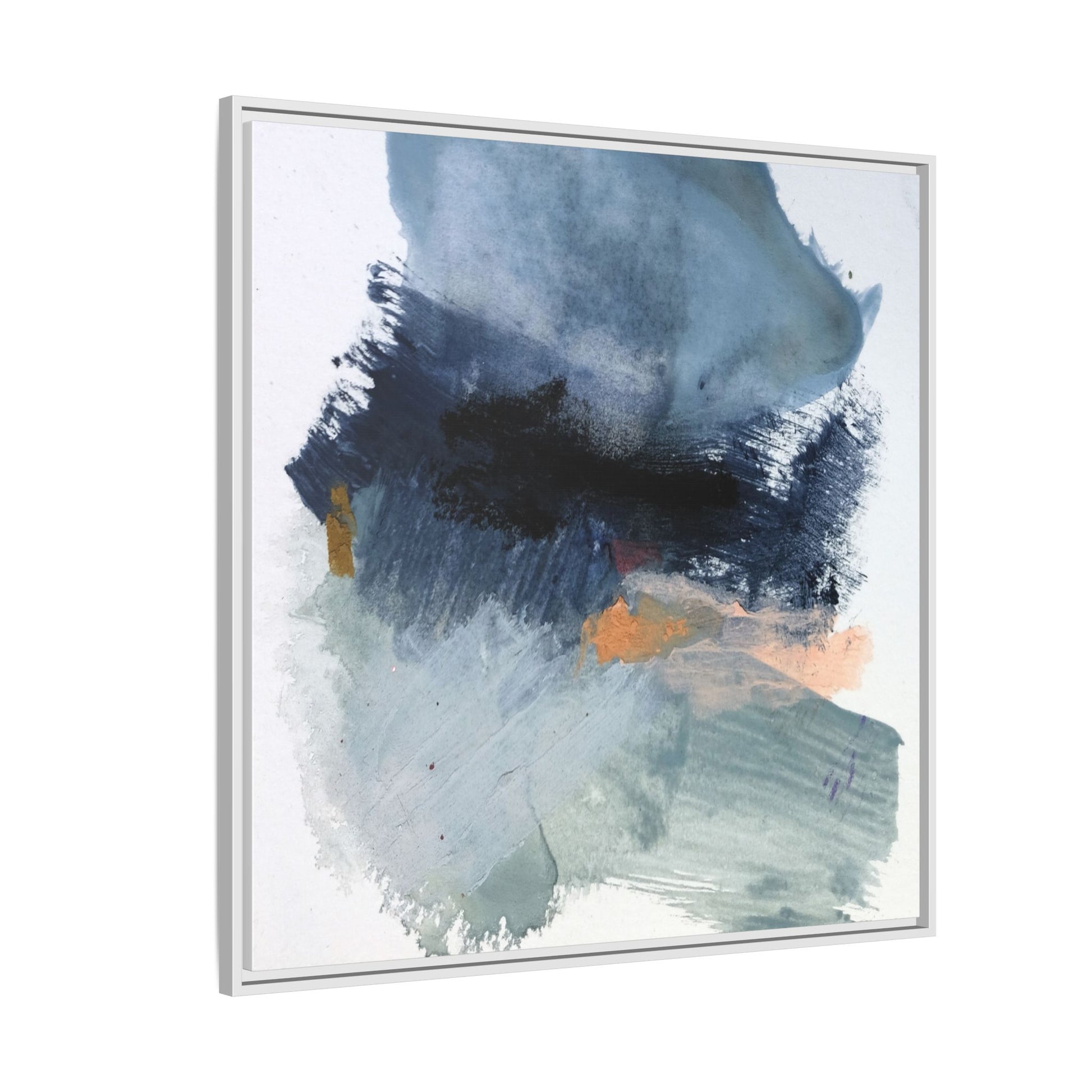 This captivating abstract watercolor painting showcases a dynamic composition of blues, grays, and subtle hints of orange and yellow. Sweeping brushstrokes create a sense of movement and depth, with layers of watercolor blending and bleeding into one another across the canvas. The dominant color palette consists of cool, muted tones, primarily in shades of slate blue and steel gray, which create a moody and contemplative atmosphere. Sporadic touches of warm orange and golden yellow provide contrast and visual interest, breaking up the predominantly cool color scheme. The painting's style appears to be gestural and spontaneous, with visible brushstrokes and organic, fluid edges that suggest a sense of emotional expression and artistic improvisation.