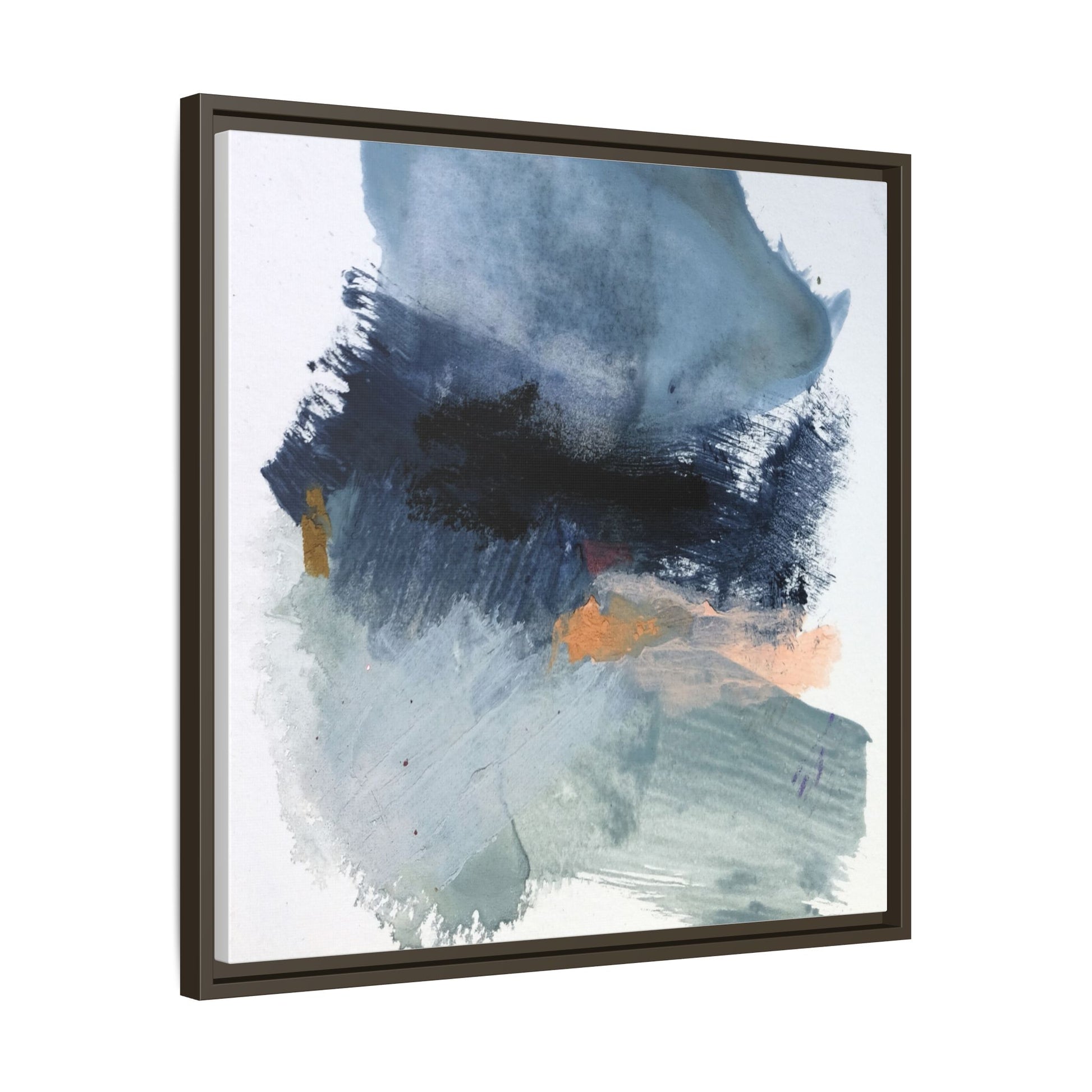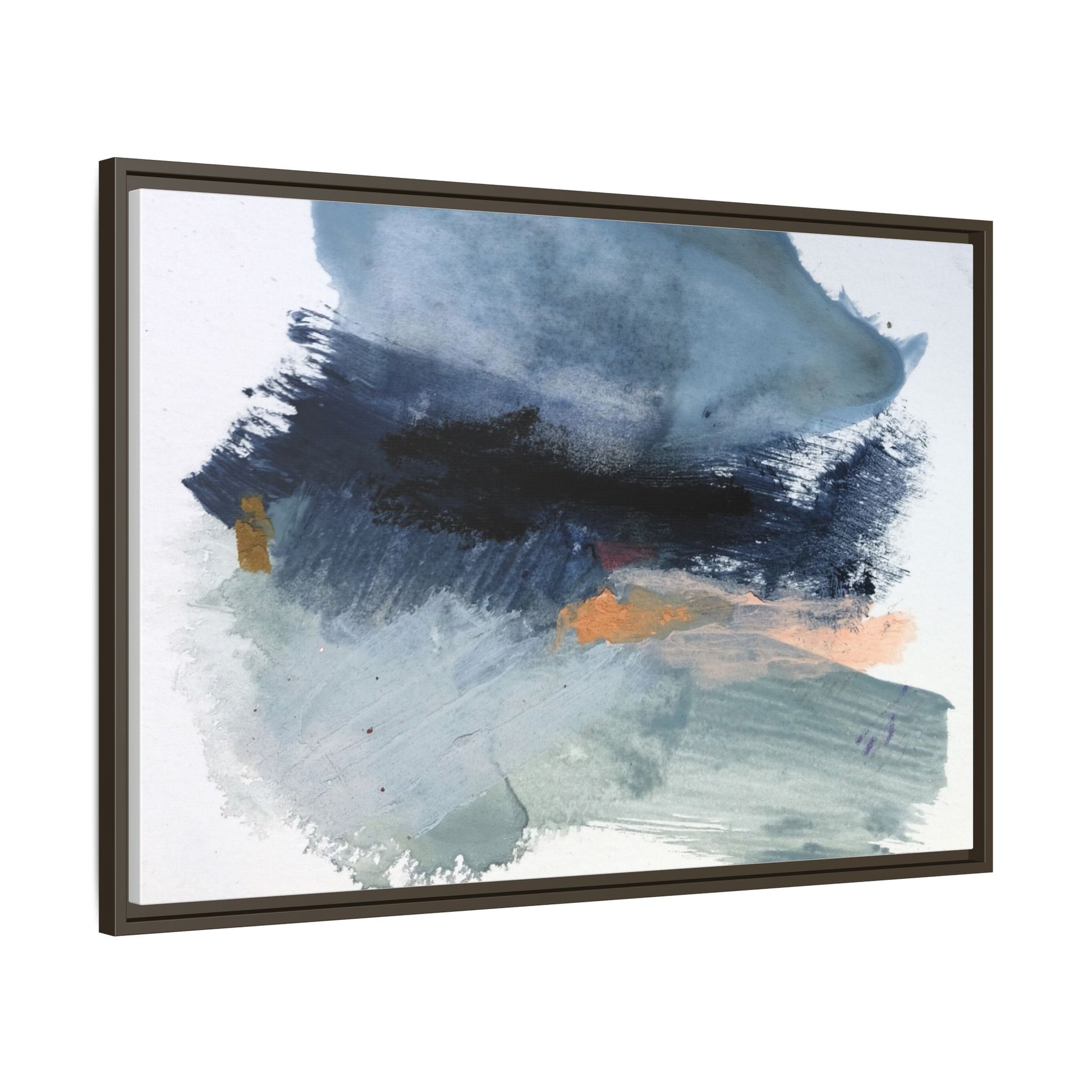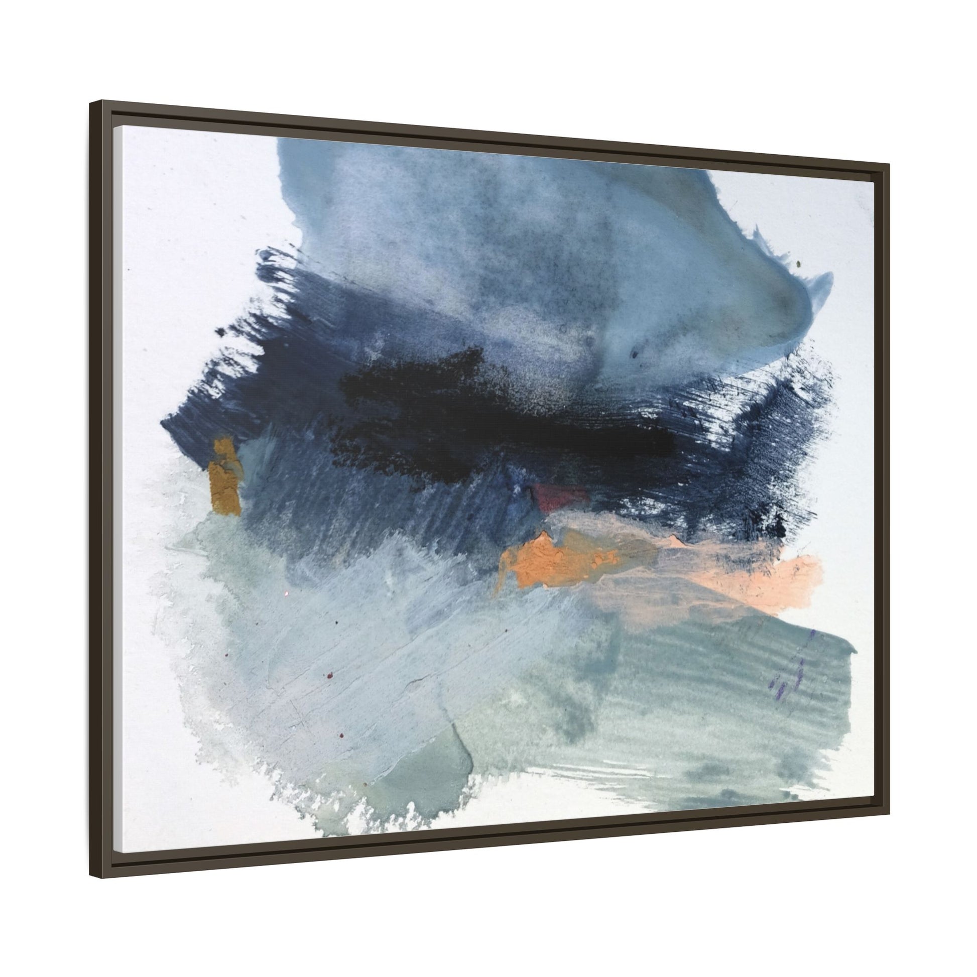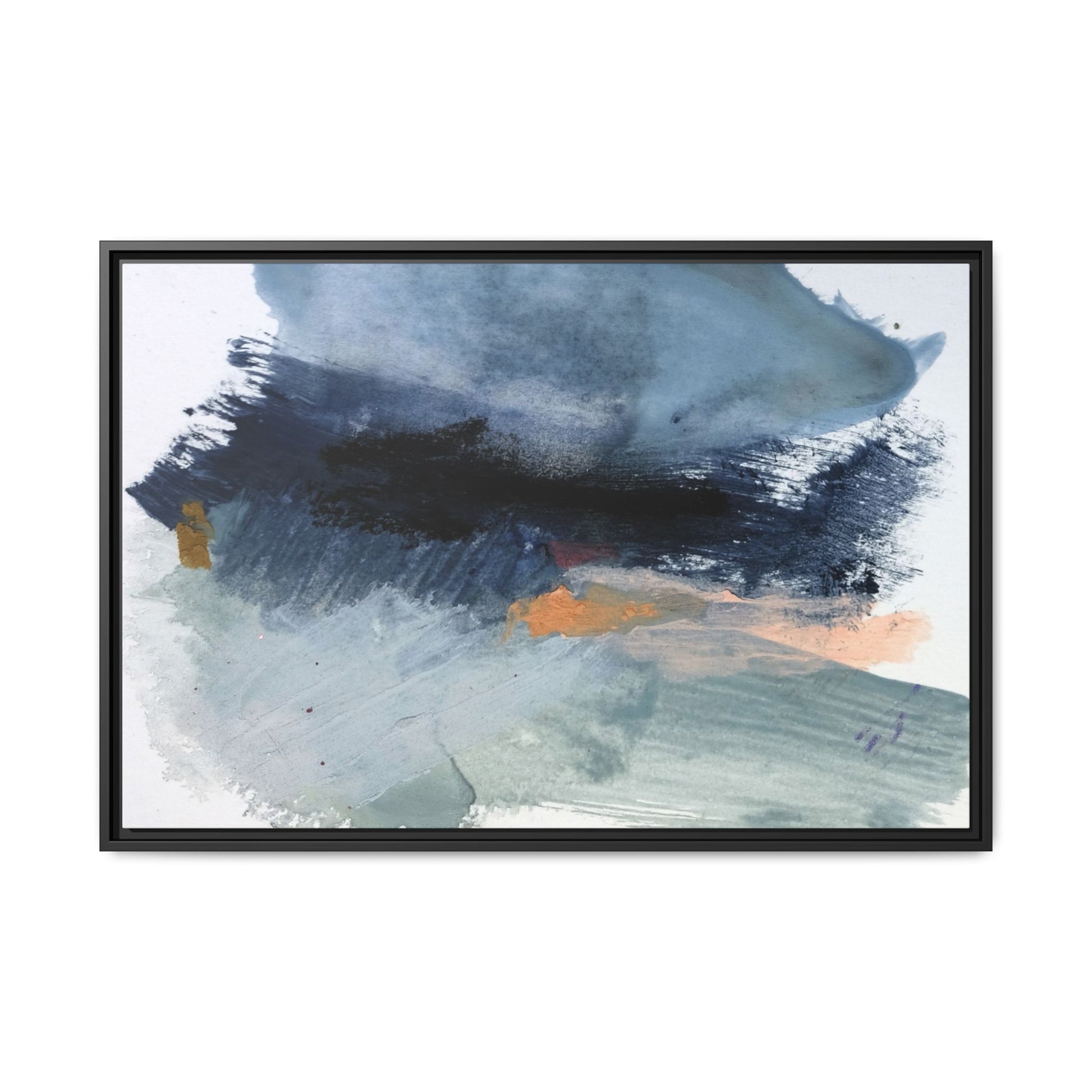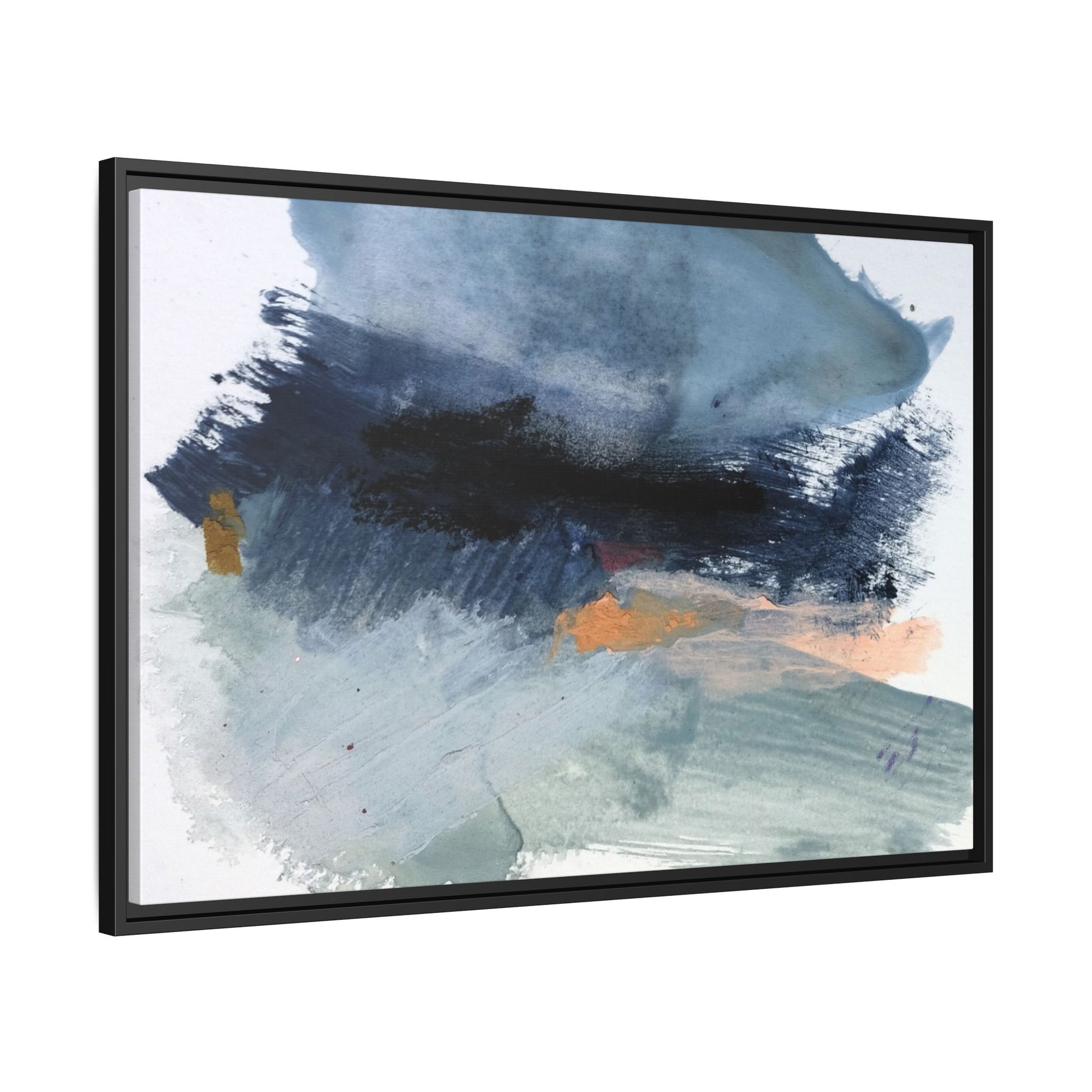 This captivating abstract watercolor painting showcases a dynamic composition of blues, grays, and subtle hints of orange and yellow. Sweeping brushstrokes create a sense of movement and depth, with layers of watercolor blending and bleeding into one another across the canvas. The dominant color palette consists of cool, muted tones, primarily in shades of slate blue and steel gray, which create a moody and contemplative atmosphere. Sporadic touches of warm orange and golden yellow provide contrast and visual interest, breaking up the predominantly cool color scheme. The painting's style appears to be gestural and spontaneous, with visible brushstrokes and organic, fluid edges that suggest a sense of emotional expression and artistic improvisation.