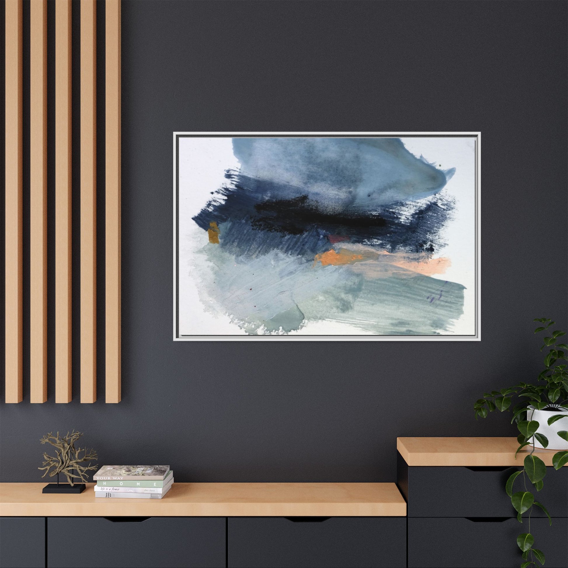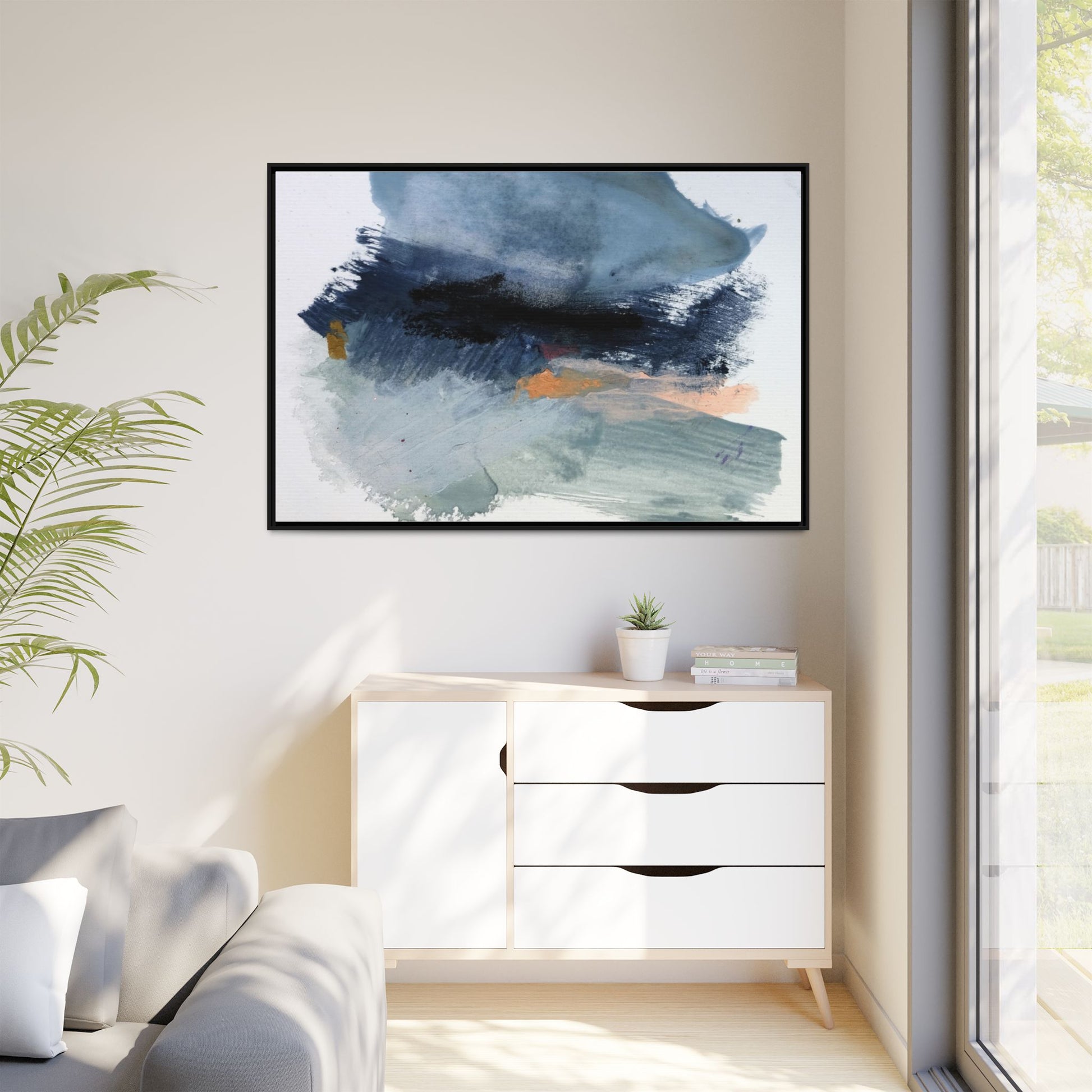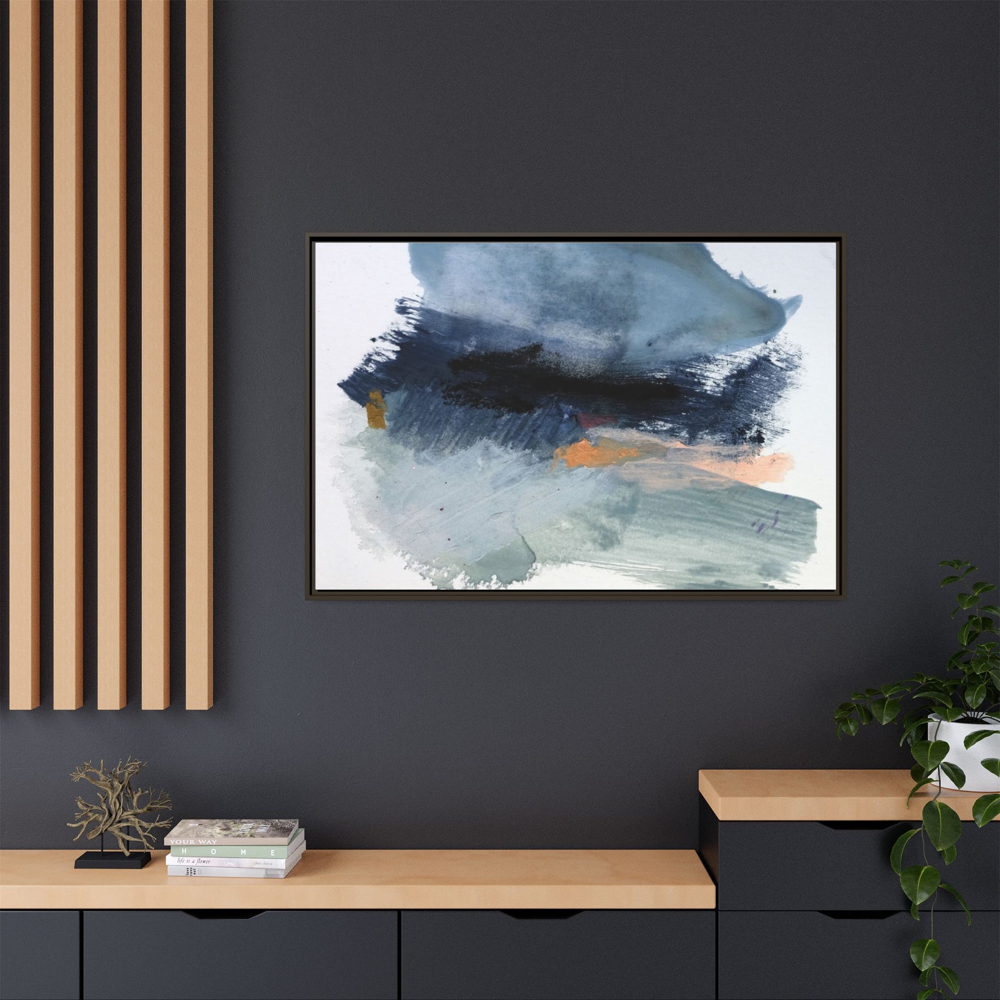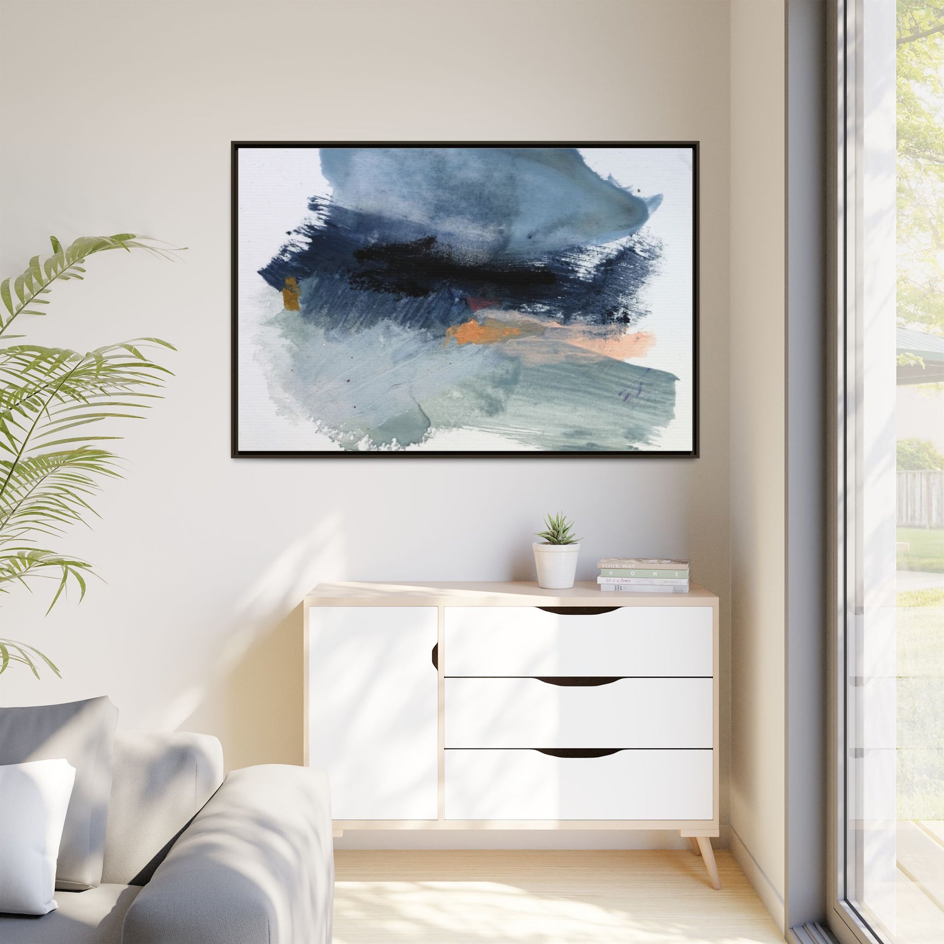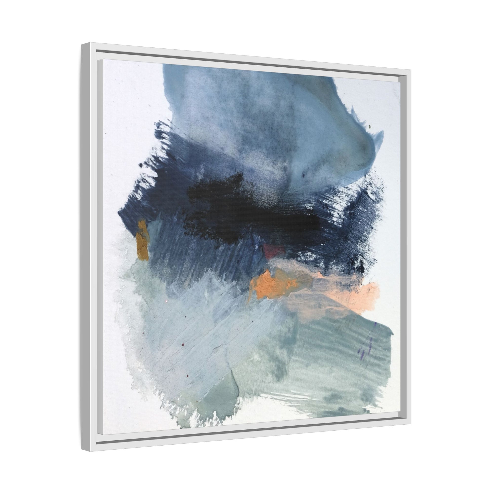This captivating abstract watercolor painting showcases a dynamic composition of blues, grays, and subtle hints of orange and yellow. Sweeping brushstrokes create a sense of movement and depth, with layers of watercolor blending and bleeding into one another across the canvas. The dominant color palette consists of cool, muted tones, primarily in shades of slate blue and steel gray, which create a moody and contemplative atmosphere. Sporadic touches of warm orange and golden yellow provide contrast and visual interest, breaking up the predominantly cool color scheme. The painting's style appears to be gestural and spontaneous, with visible brushstrokes and organic, fluid edges that suggest a sense of emotional expression and artistic improvisation.