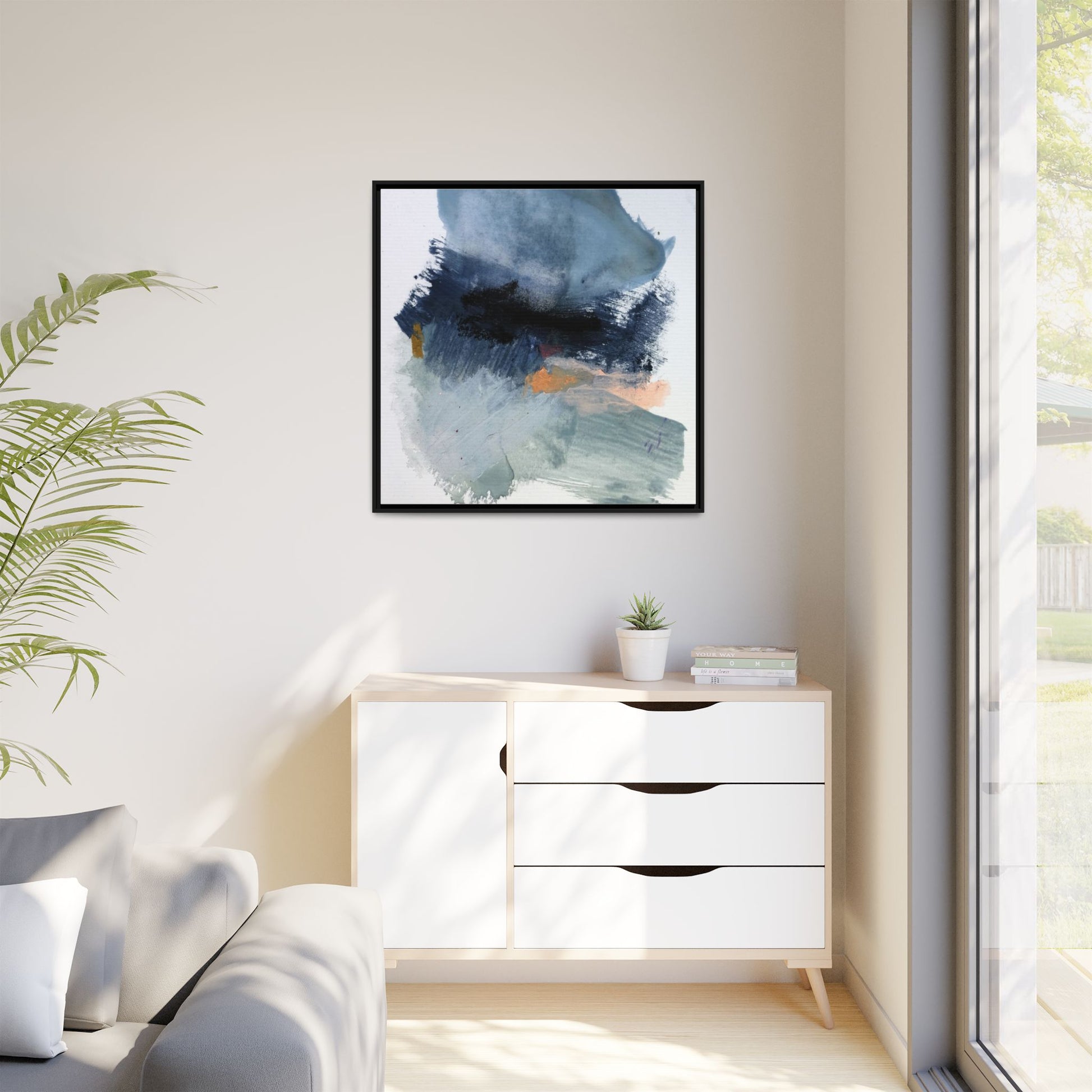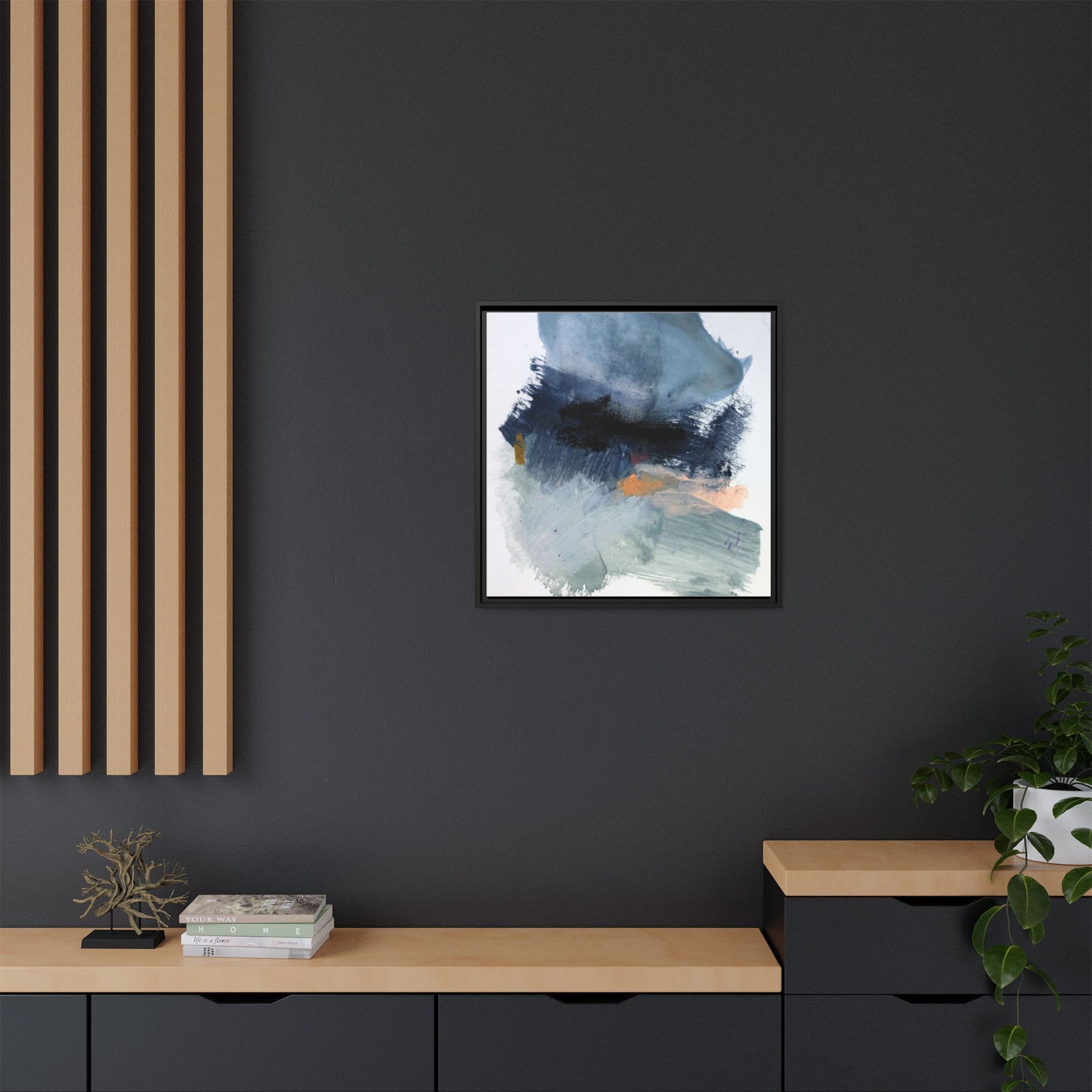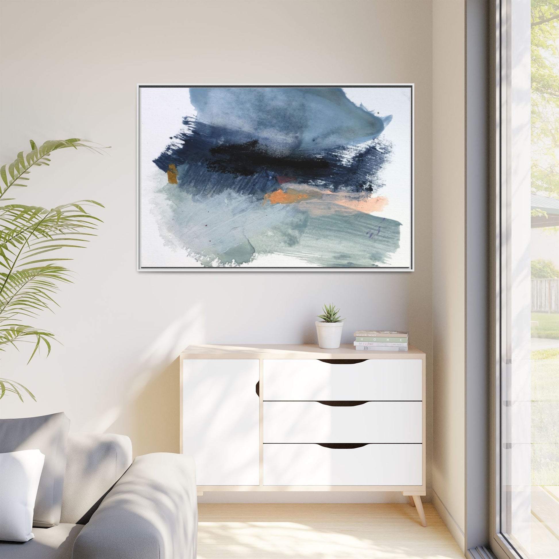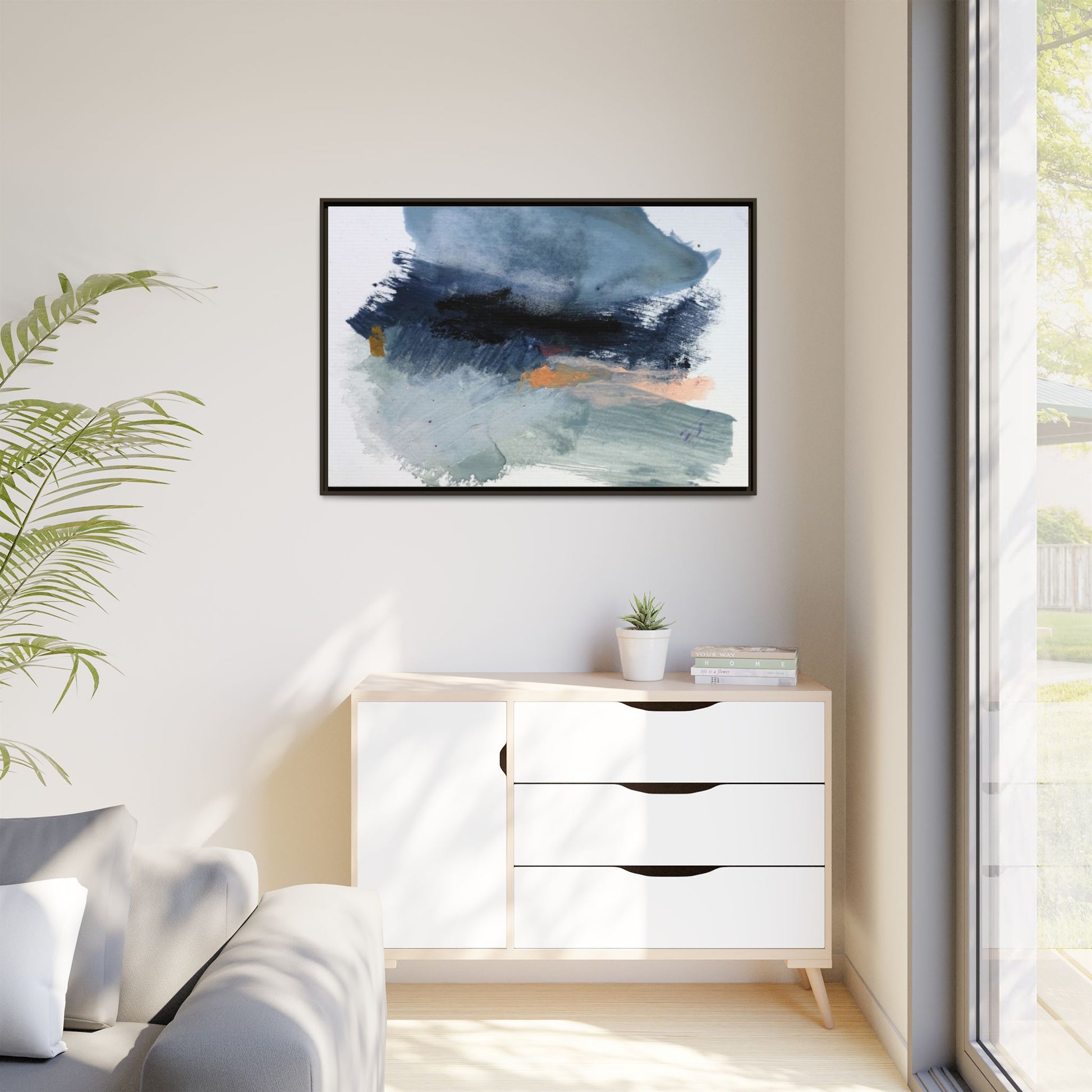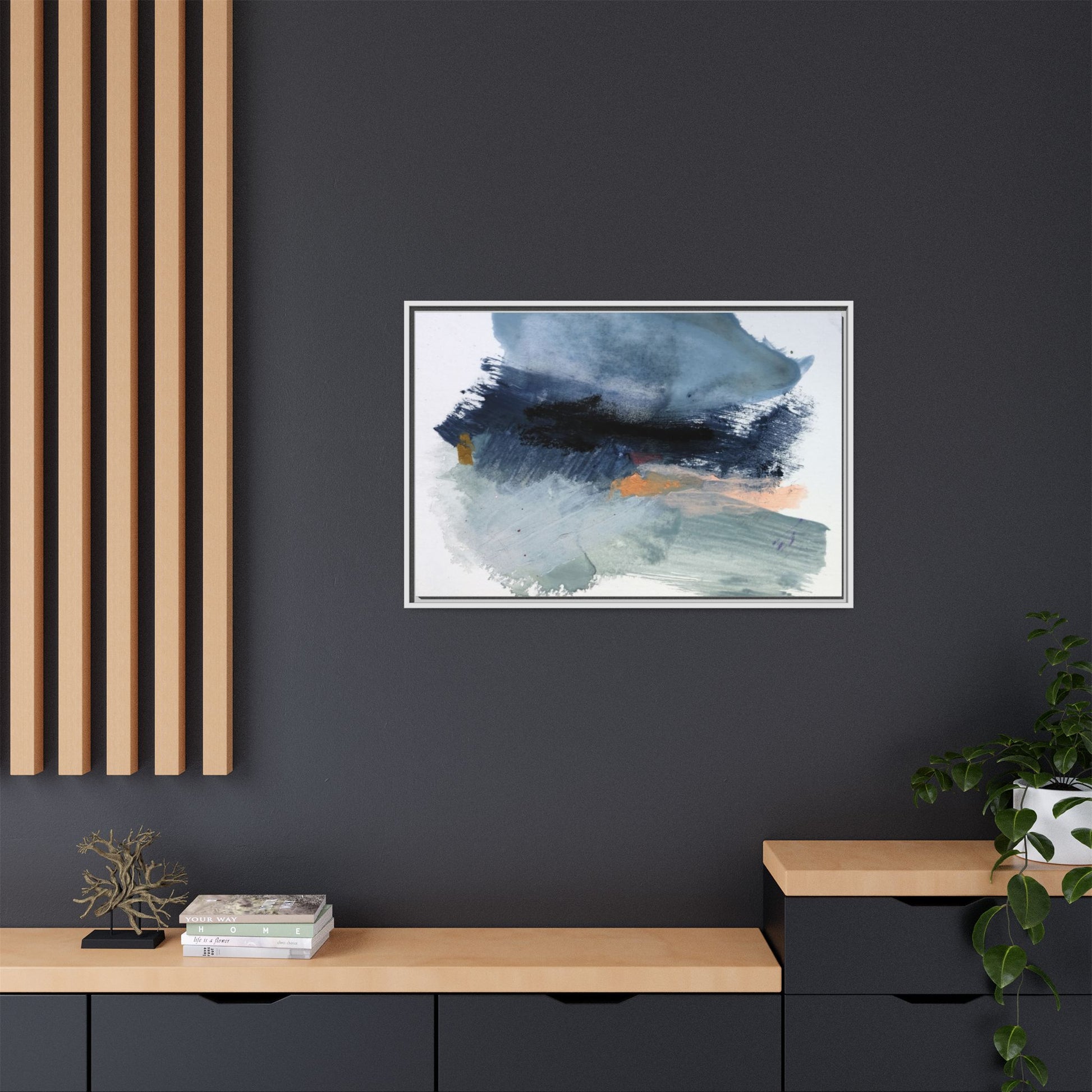This captivating abstract watercolor painting showcases a dynamic composition of blues, grays, and subtle hints of orange and yellow. Sweeping brushstrokes create a sense of movement and depth, with layers of watercolor blending and bleeding into one another across the canvas. The dominant color palette consists of cool, muted tones, primarily in shades of slate blue and steel gray, which create a moody and contemplative atmosphere. Sporadic touches of warm orange and golden yellow provide contrast and visual interest, breaking up the predominantly cool color scheme. The painting's style appears to be gestural and spontaneous, with visible brushstrokes and organic, fluid edges that suggest a sense of emotional expression and artistic improvisation.