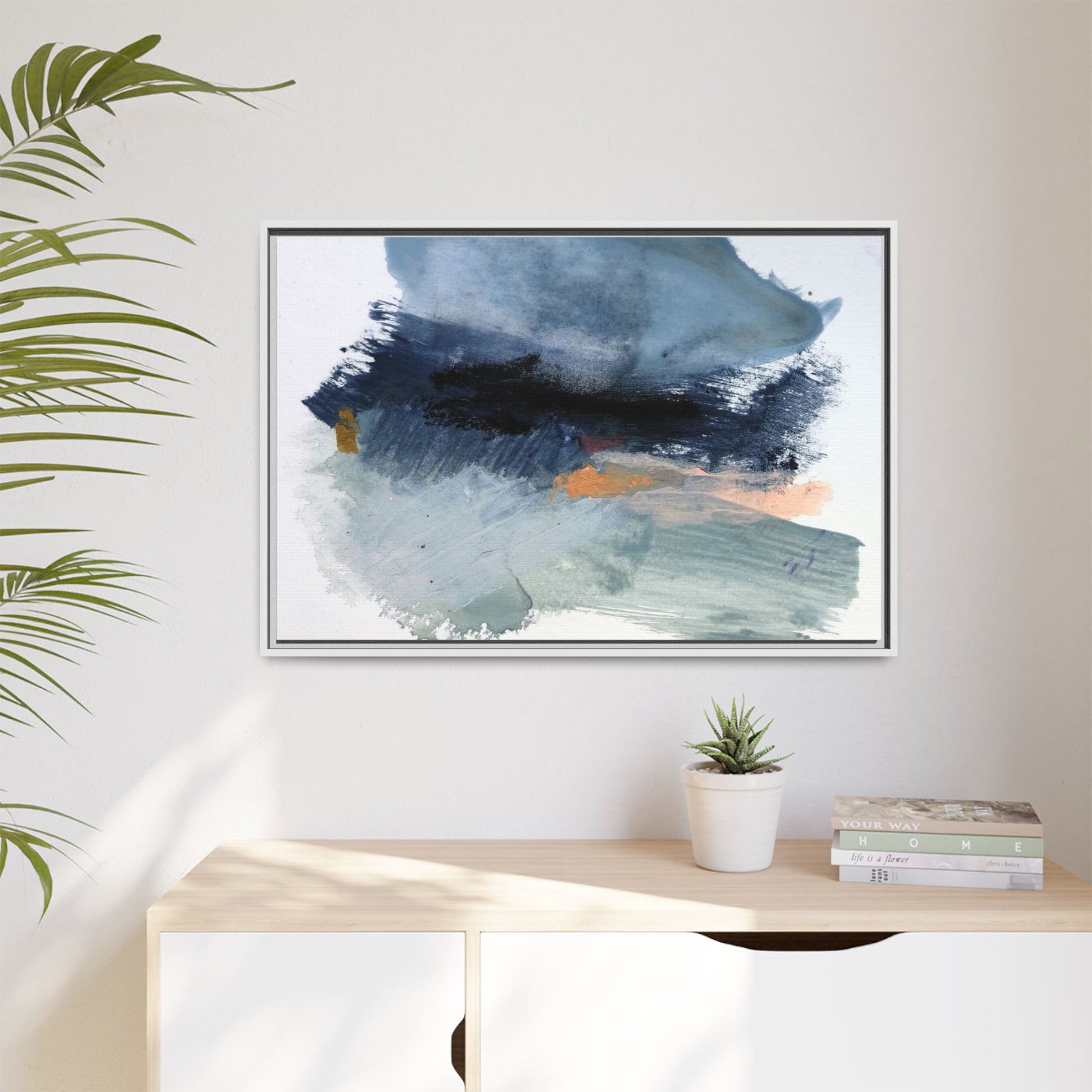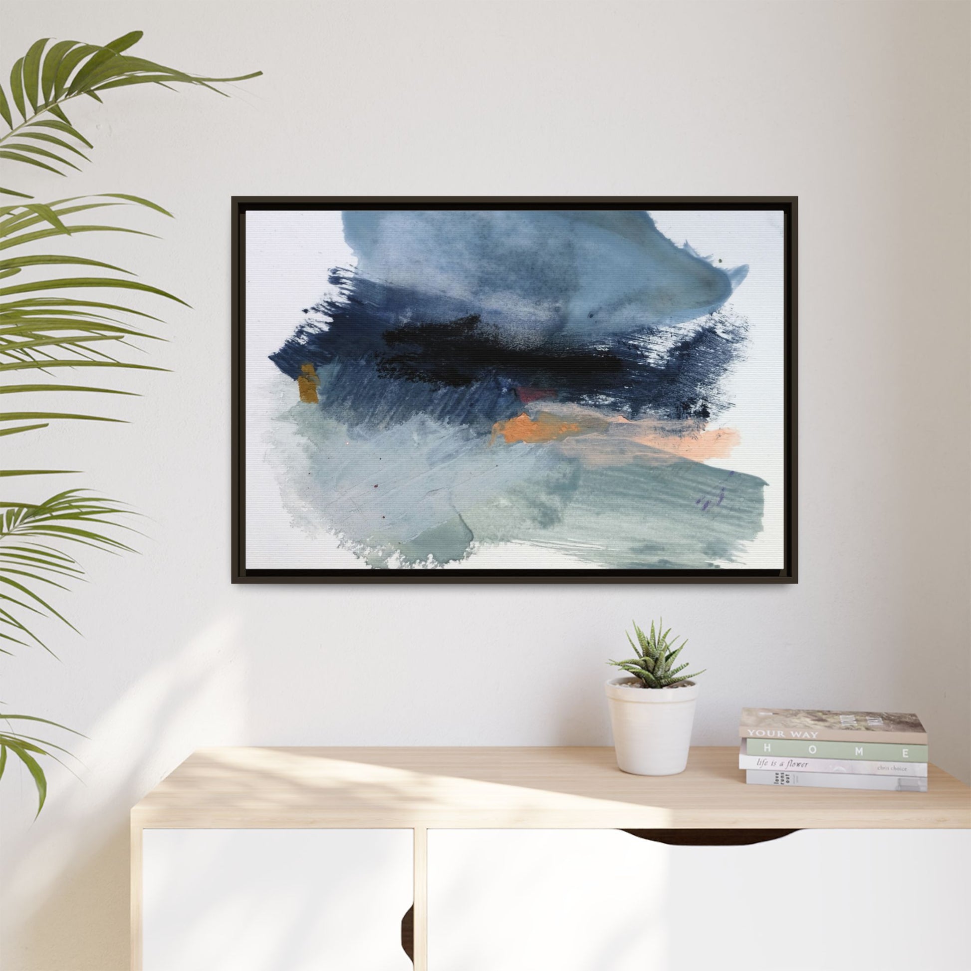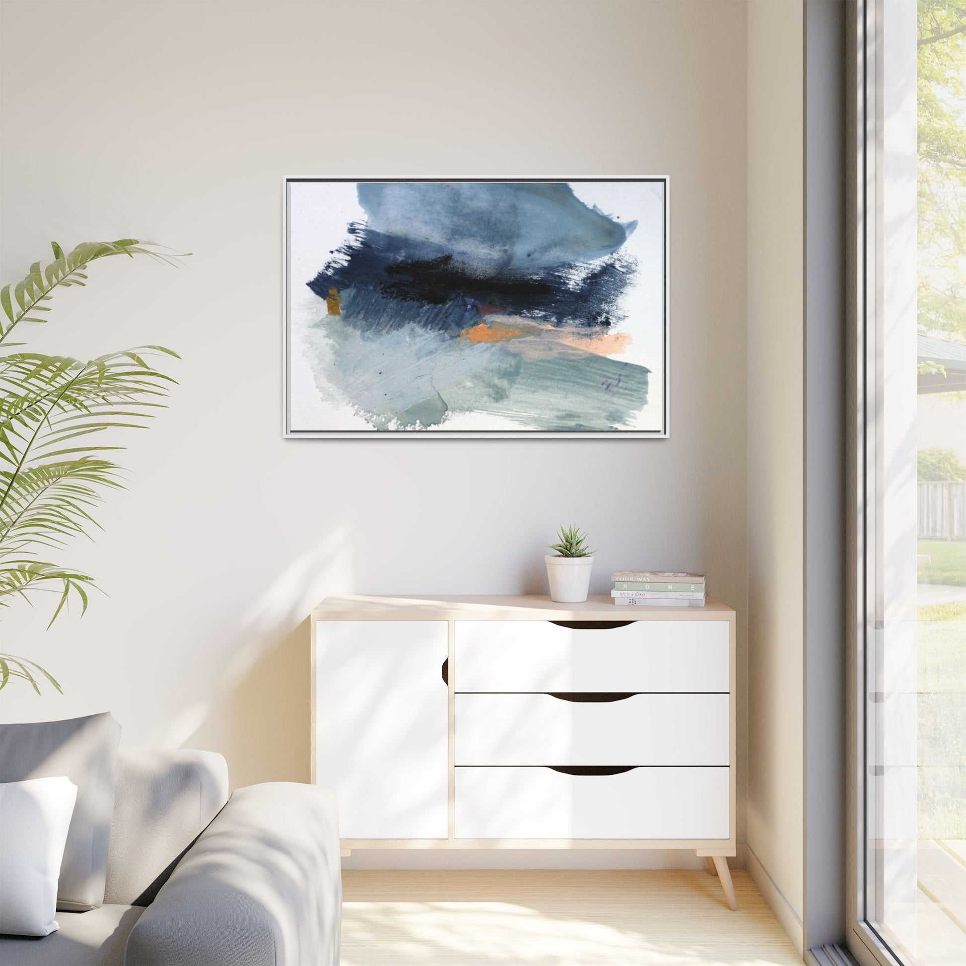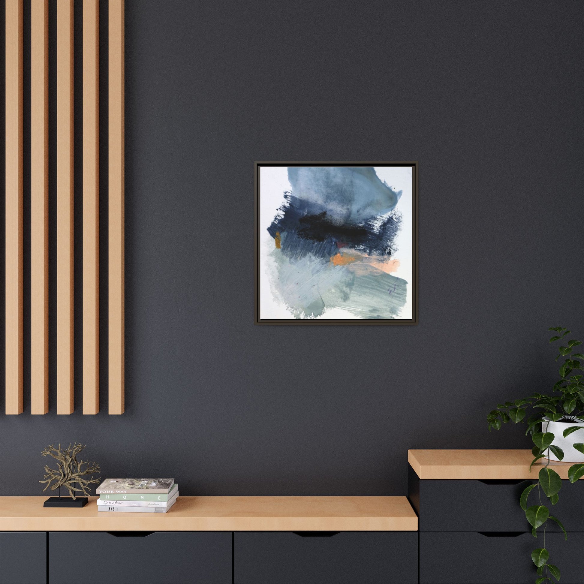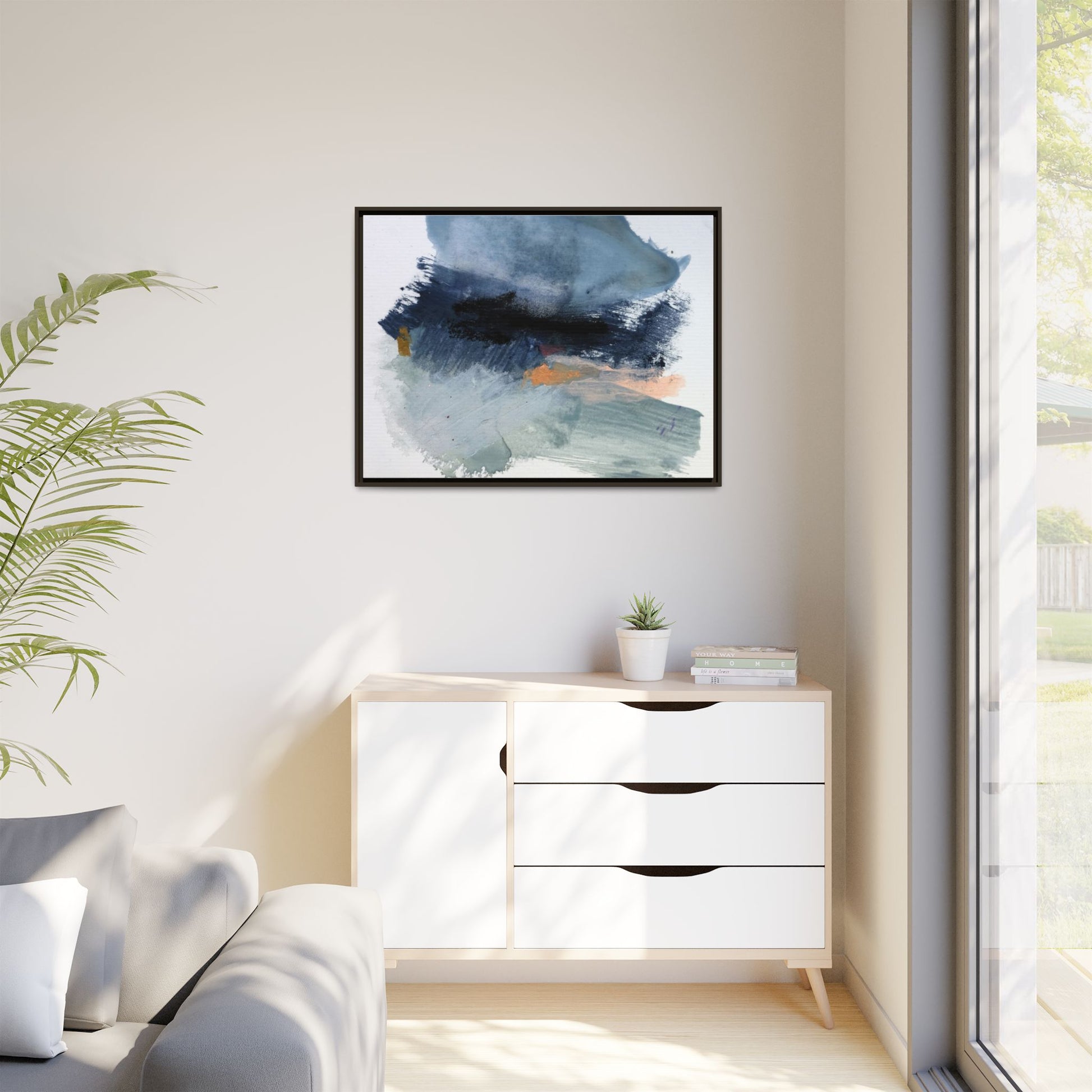 This captivating abstract watercolor painting showcases a dynamic composition of blues, grays, and subtle hints of orange and yellow. Sweeping brushstrokes create a sense of movement and depth, with layers of watercolor blending and bleeding into one another across the canvas. The dominant color palette consists of cool, muted tones, primarily in shades of slate blue and steel gray, which create a moody and contemplative atmosphere. Sporadic touches of warm orange and golden yellow provide contrast and visual interest, breaking up the predominantly cool color scheme. The painting's style appears to be gestural and spontaneous, with visible brushstrokes and organic, fluid edges that suggest a sense of emotional expression and artistic improvisation.