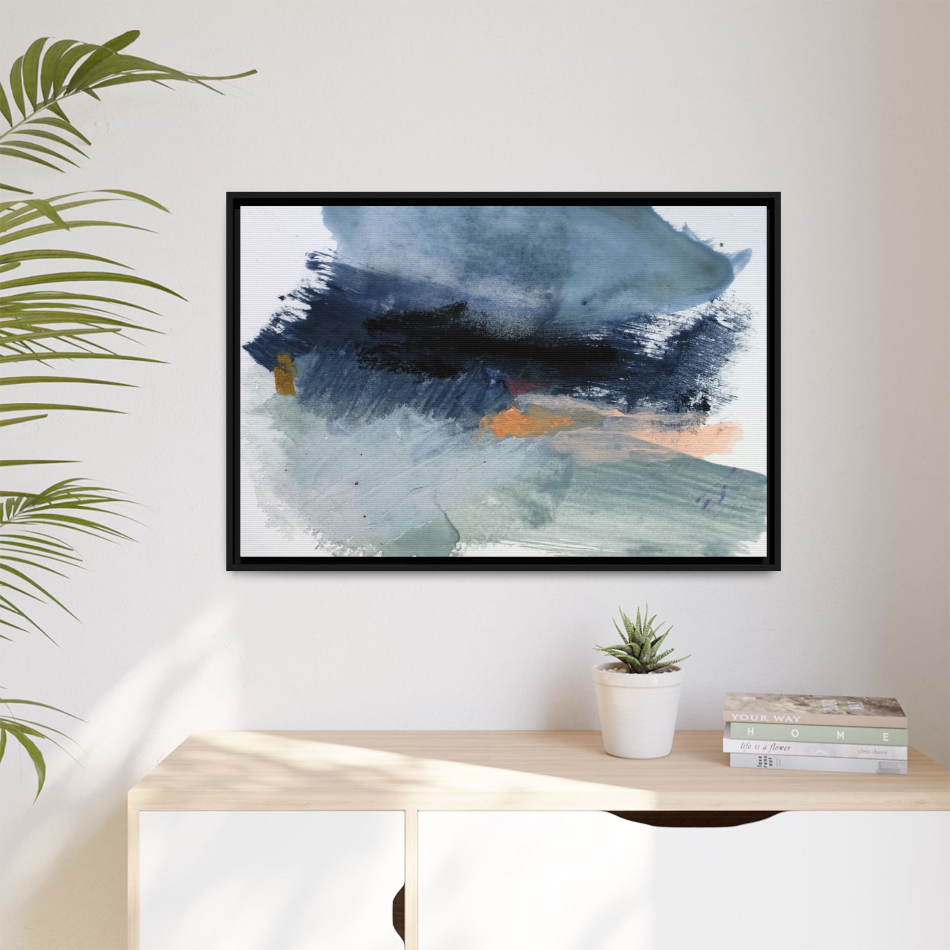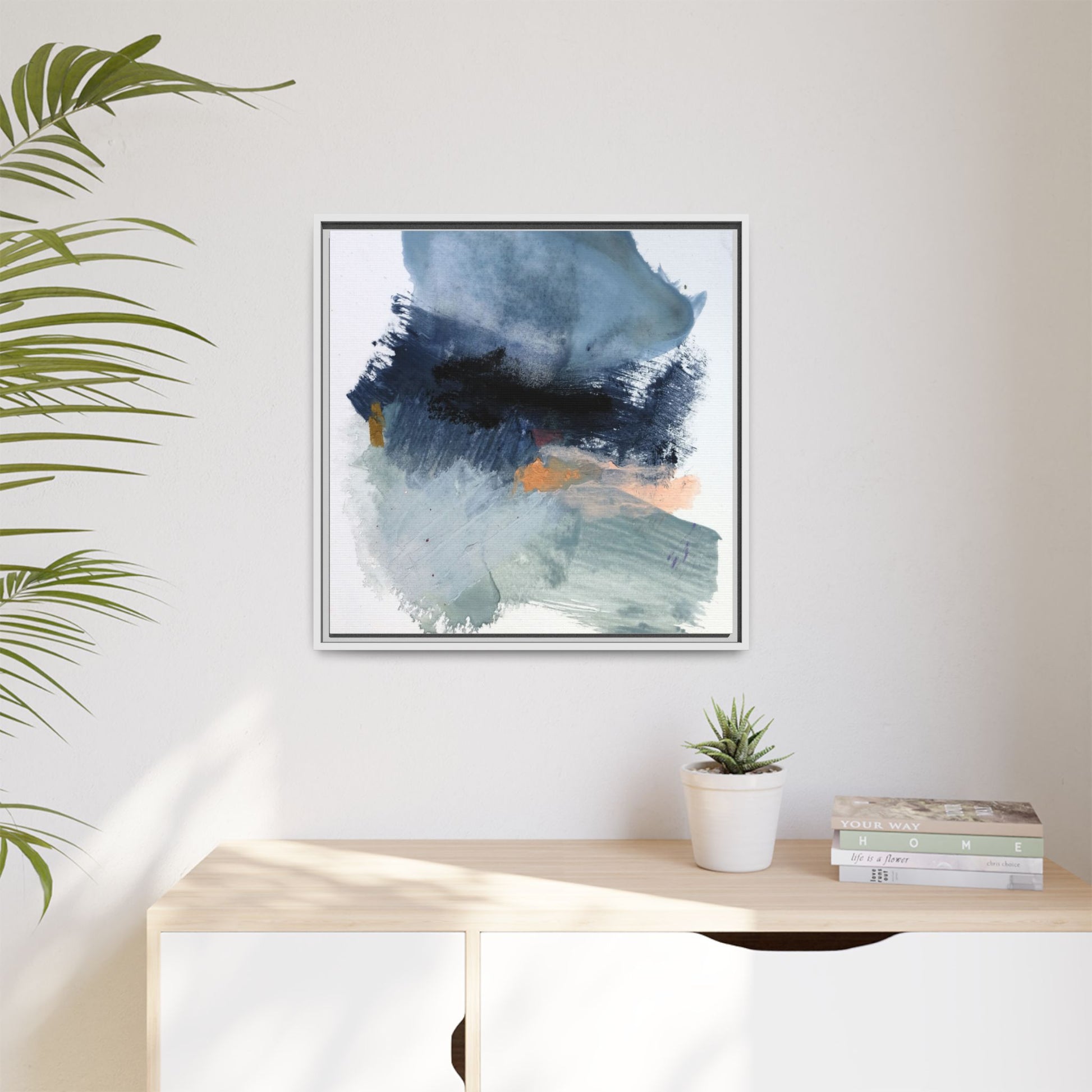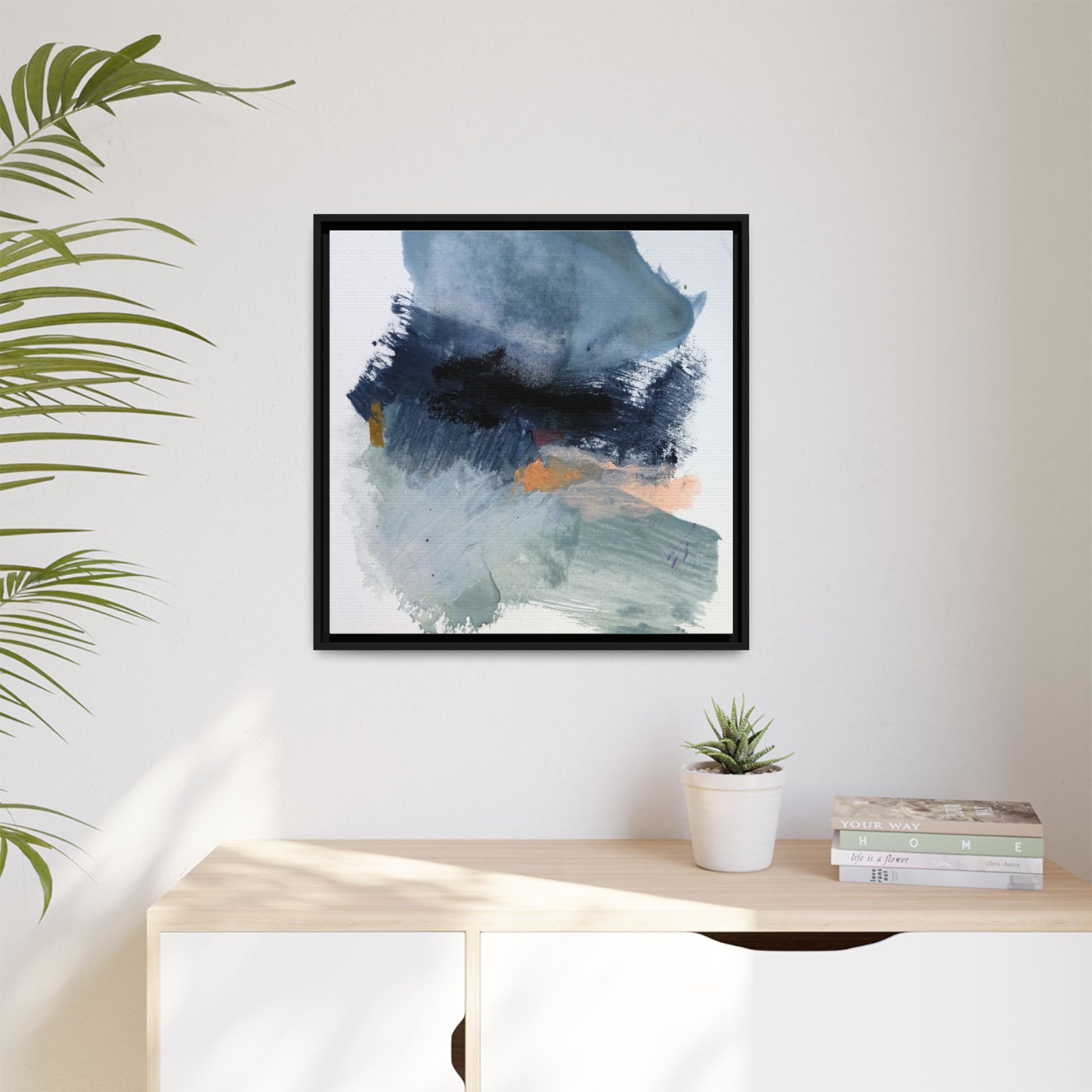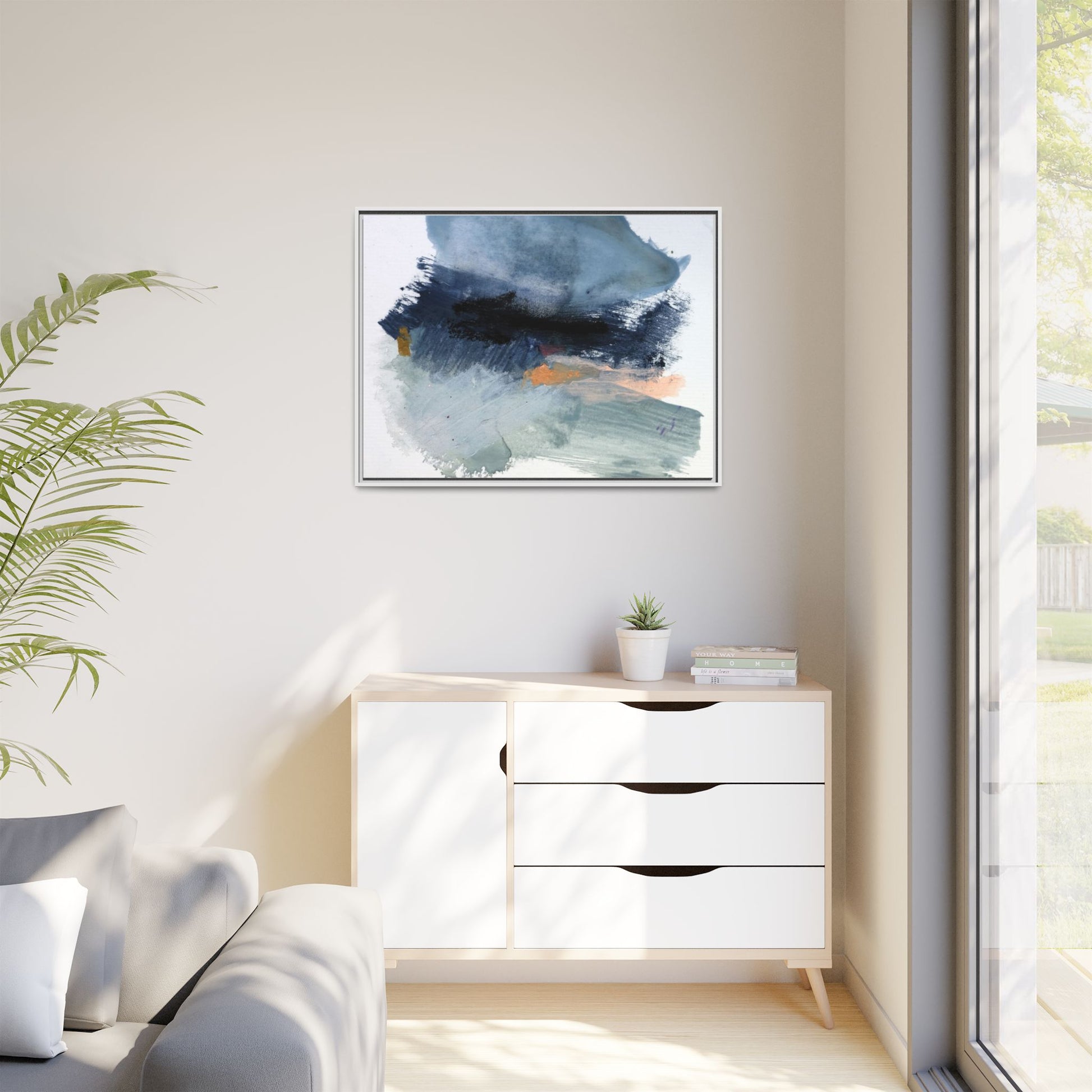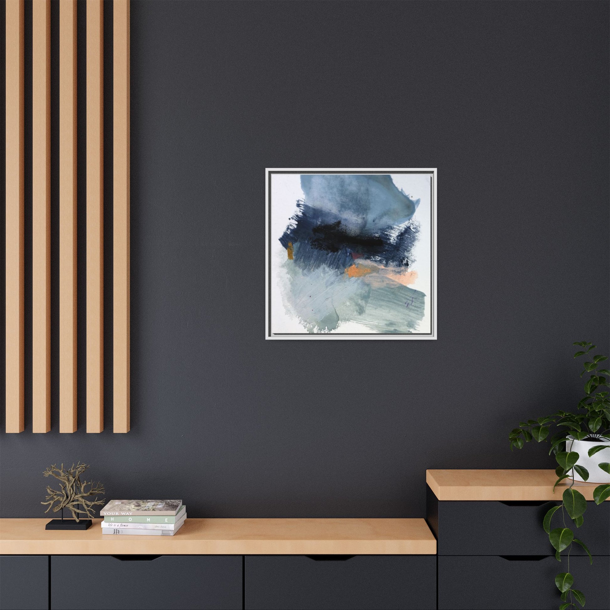 This captivating abstract watercolor painting showcases a dynamic composition of blues, grays, and subtle hints of orange and yellow. Sweeping brushstrokes create a sense of movement and depth, with layers of watercolor blending and bleeding into one another across the canvas. The dominant color palette consists of cool, muted tones, primarily in shades of slate blue and steel gray, which create a moody and contemplative atmosphere. Sporadic touches of warm orange and golden yellow provide contrast and visual interest, breaking up the predominantly cool color scheme. The painting's style appears to be gestural and spontaneous, with visible brushstrokes and organic, fluid edges that suggest a sense of emotional expression and artistic improvisation.