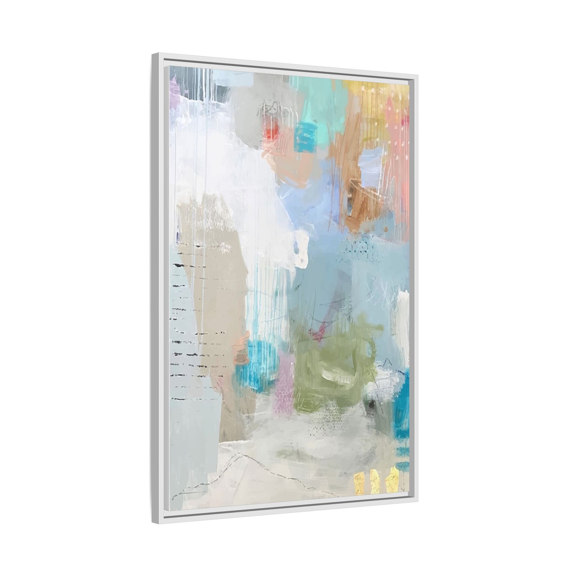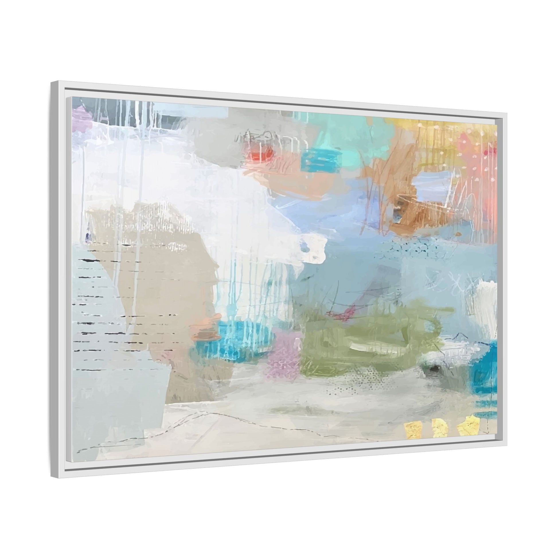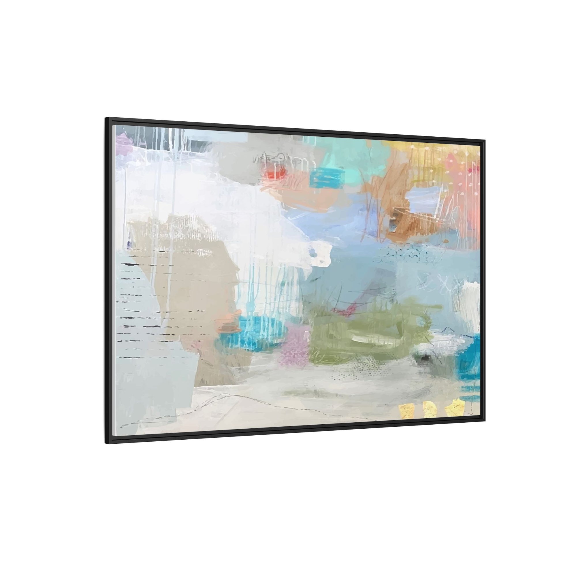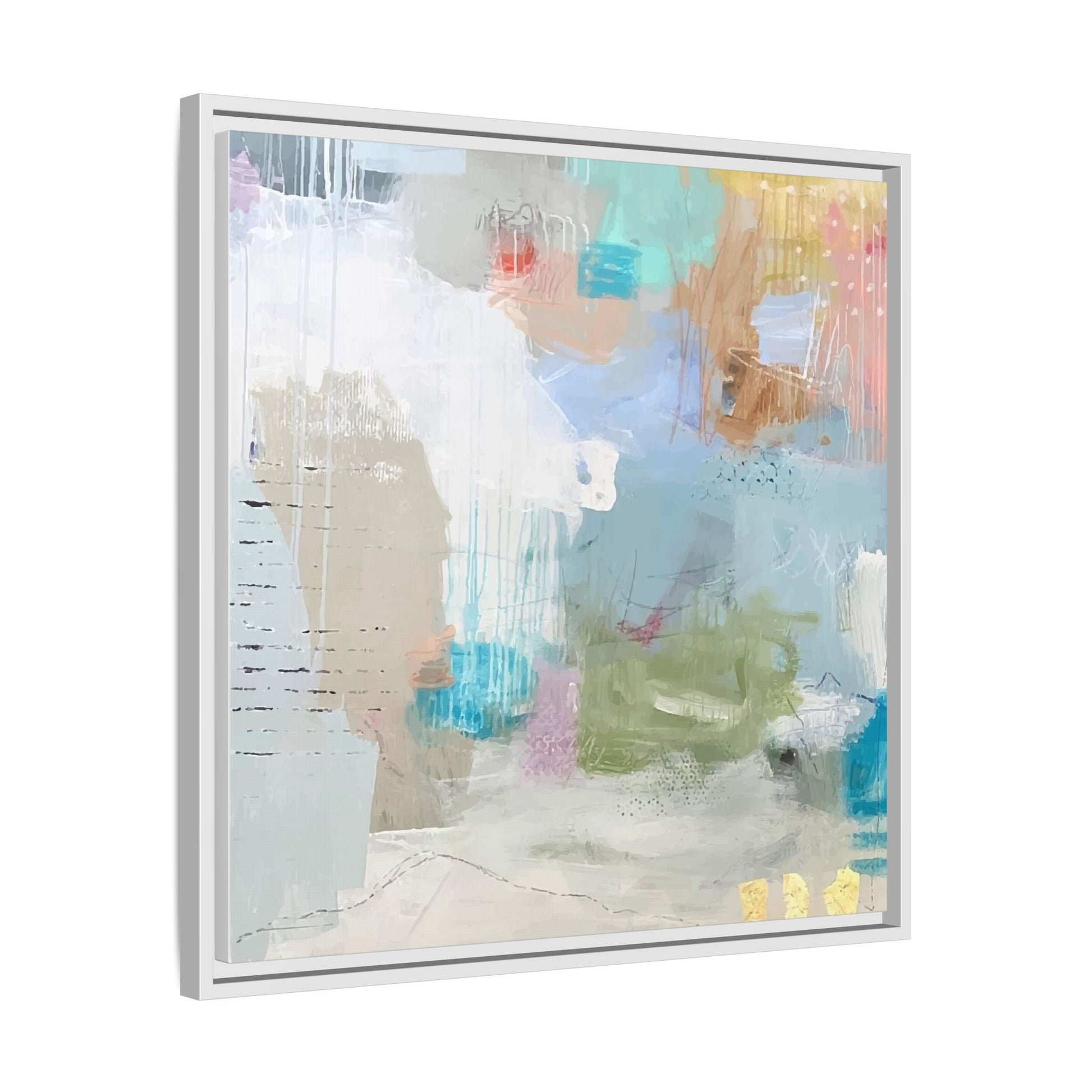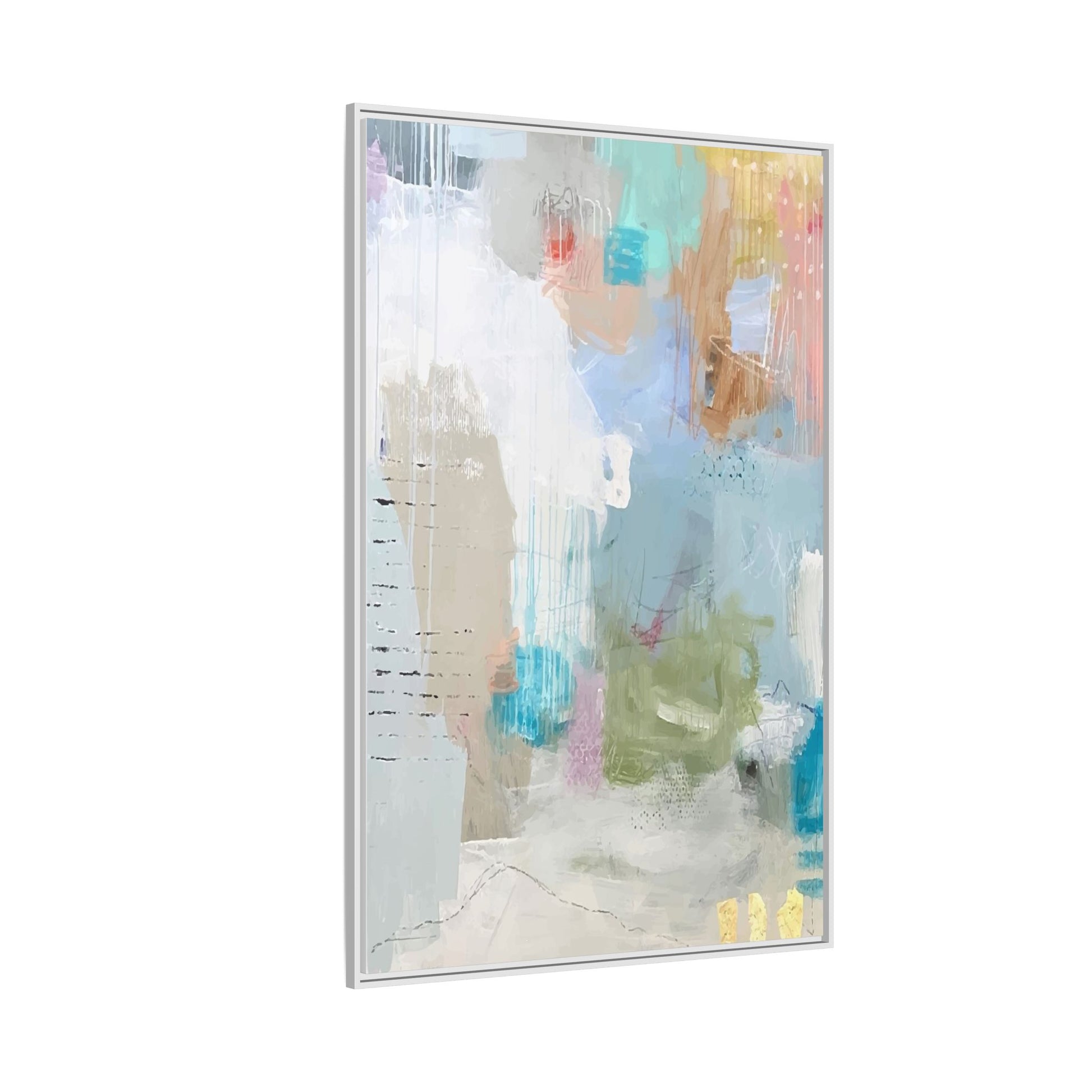 This abstract painting is a delicate composition of soft, ethereal colors including pale blues, greens, yellows, and hints of pink and orange. The artwork features layered brushstrokes and translucent washes that create a dreamy, atmospheric quality with organic shapes and textural elements. Vertical drips and subtle line work add visual interest and movement throughout the piece, giving the impression of a misty, impressionistic landscape or seascape. The color palette is predominantly cool and muted, with gentle blending and overlapping of hues that create a sense of depth and ethereal space. The painting's style suggests a contemporary abstract approach, with a focus on texture, color interaction, and subtle visual nuances.