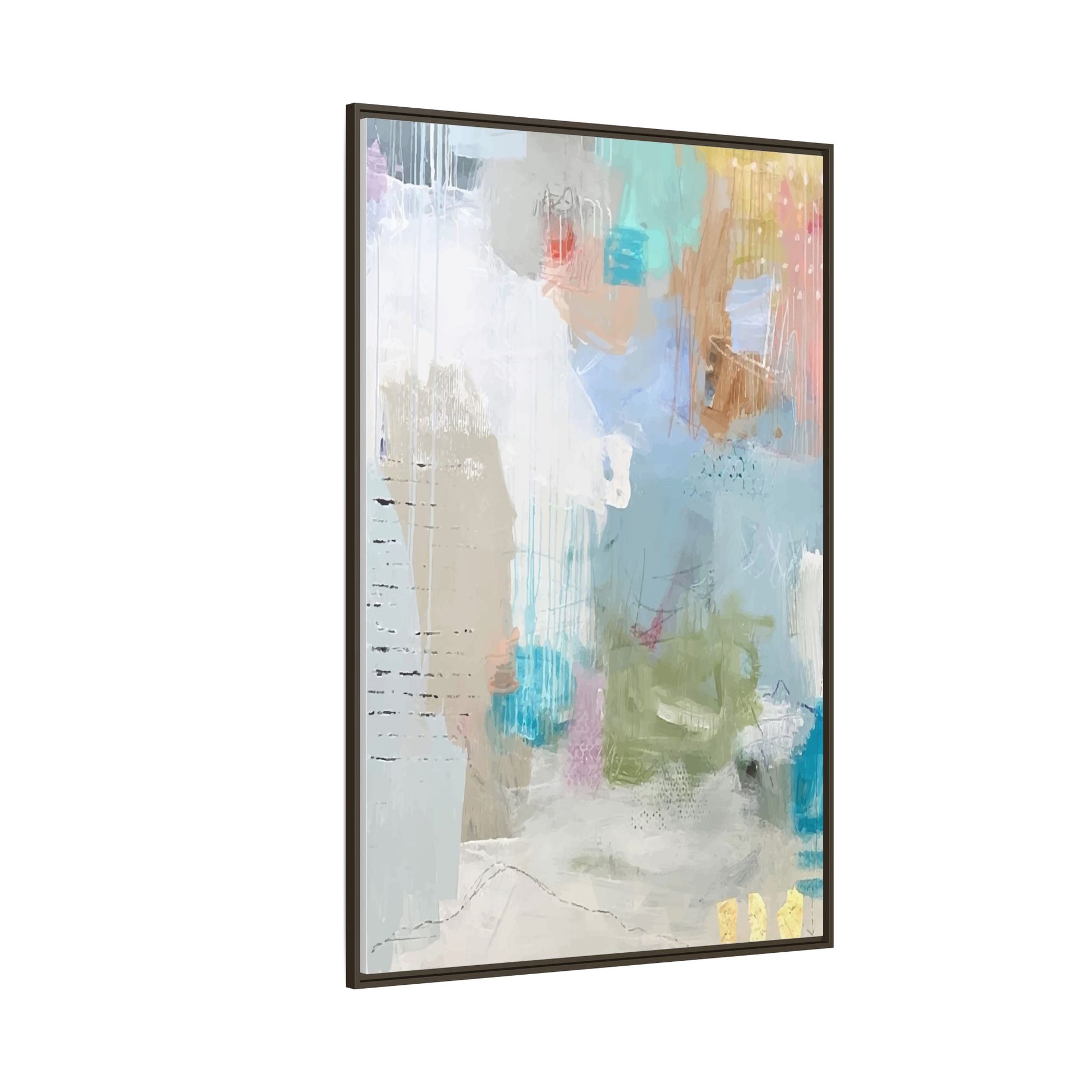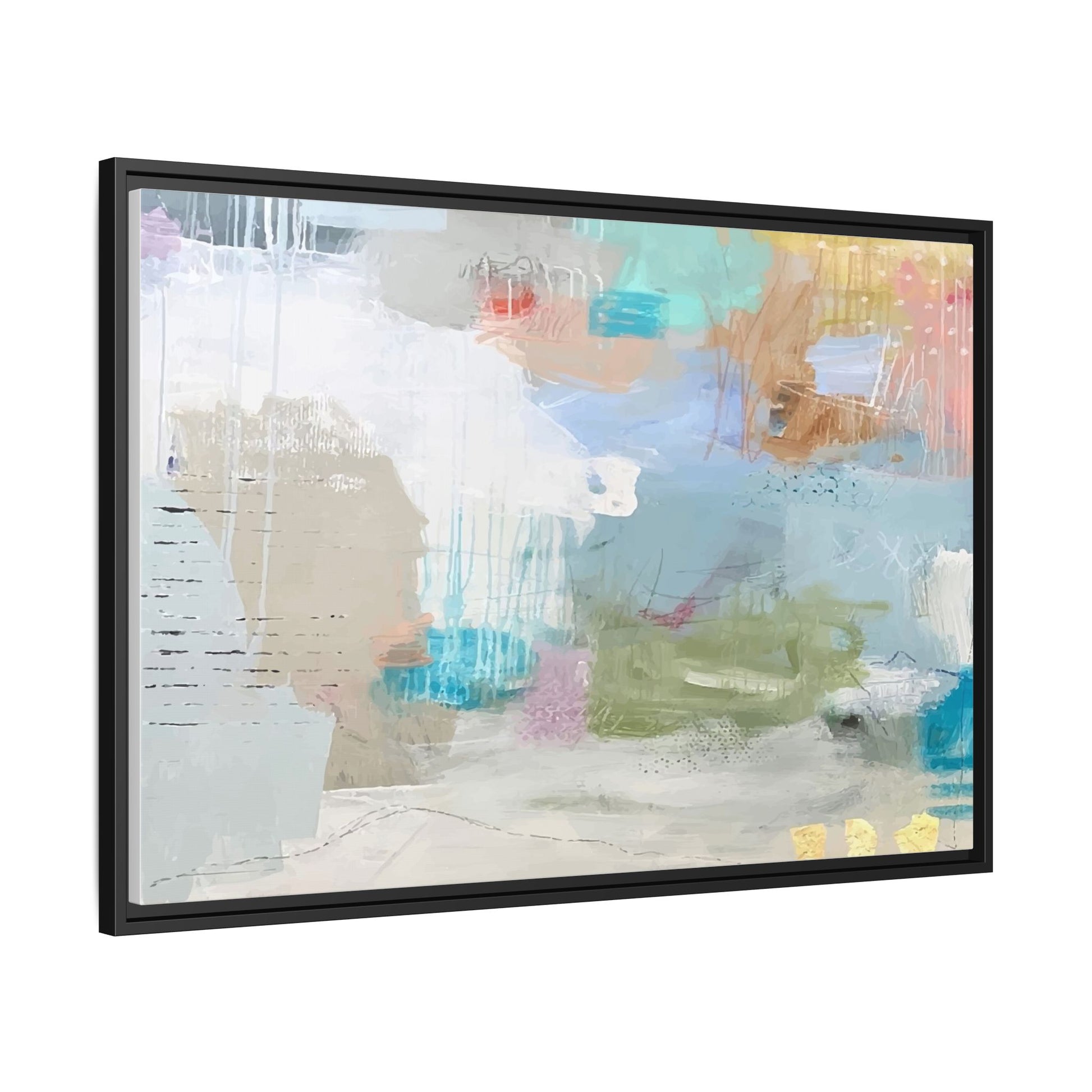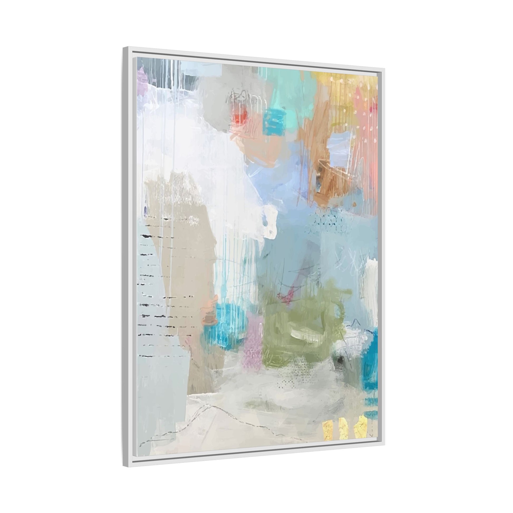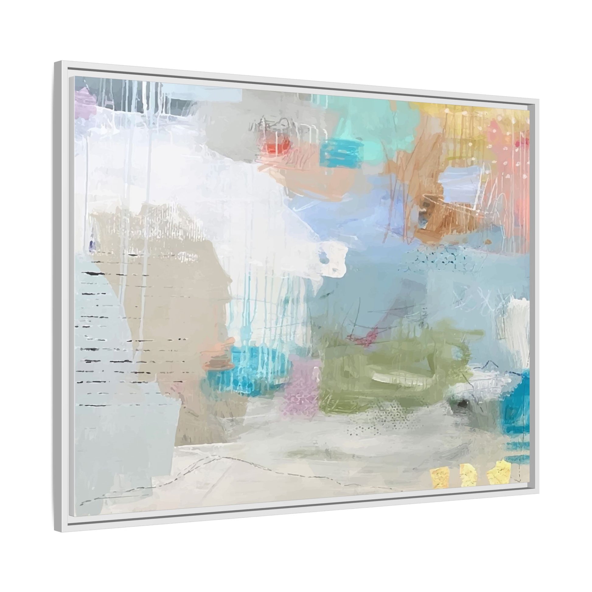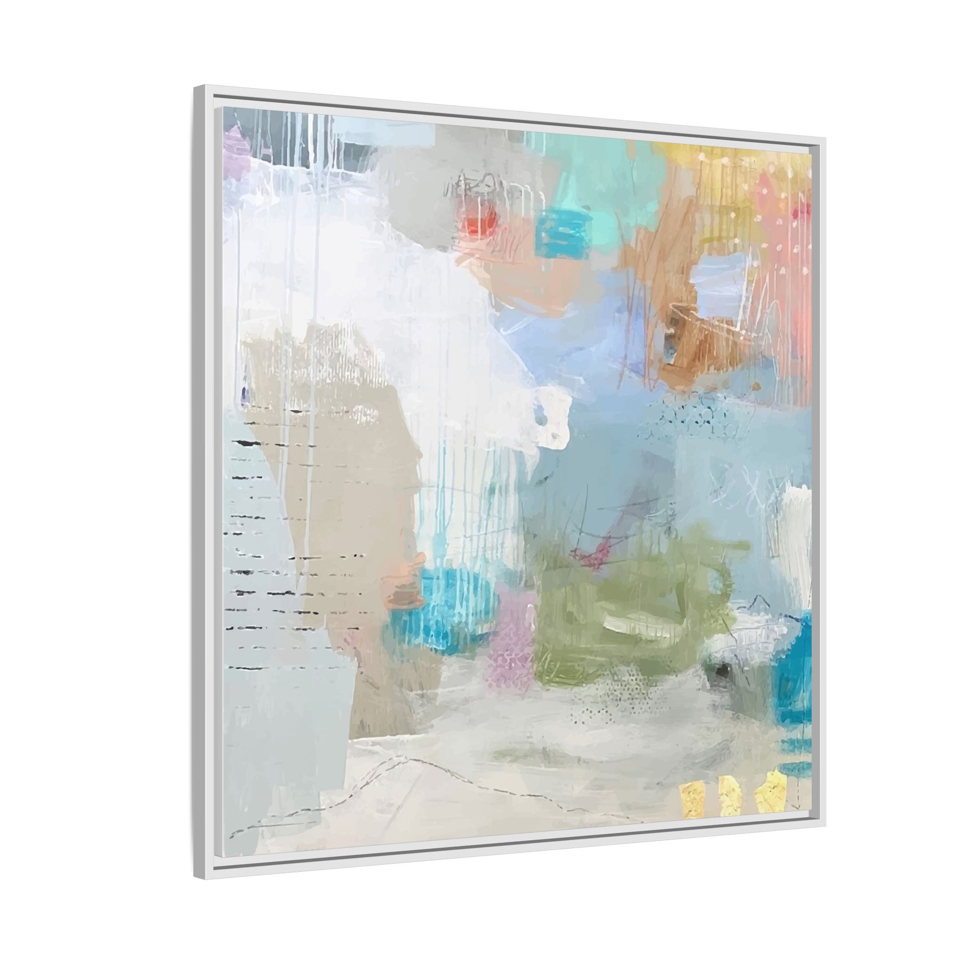This abstract painting is a delicate composition of soft, ethereal colors including pale blues, greens, yellows, and hints of pink and orange. The artwork features layered brushstrokes and translucent washes that create a dreamy, atmospheric quality with organic shapes and textural elements. Vertical drips and subtle line work add visual interest and movement throughout the piece, giving the impression of a misty, impressionistic landscape or seascape. The color palette is predominantly cool and muted, with gentle blending and overlapping of hues that create a sense of depth and ethereal space. The painting's style suggests a contemporary abstract approach, with a focus on texture, color interaction, and subtle visual nuances.