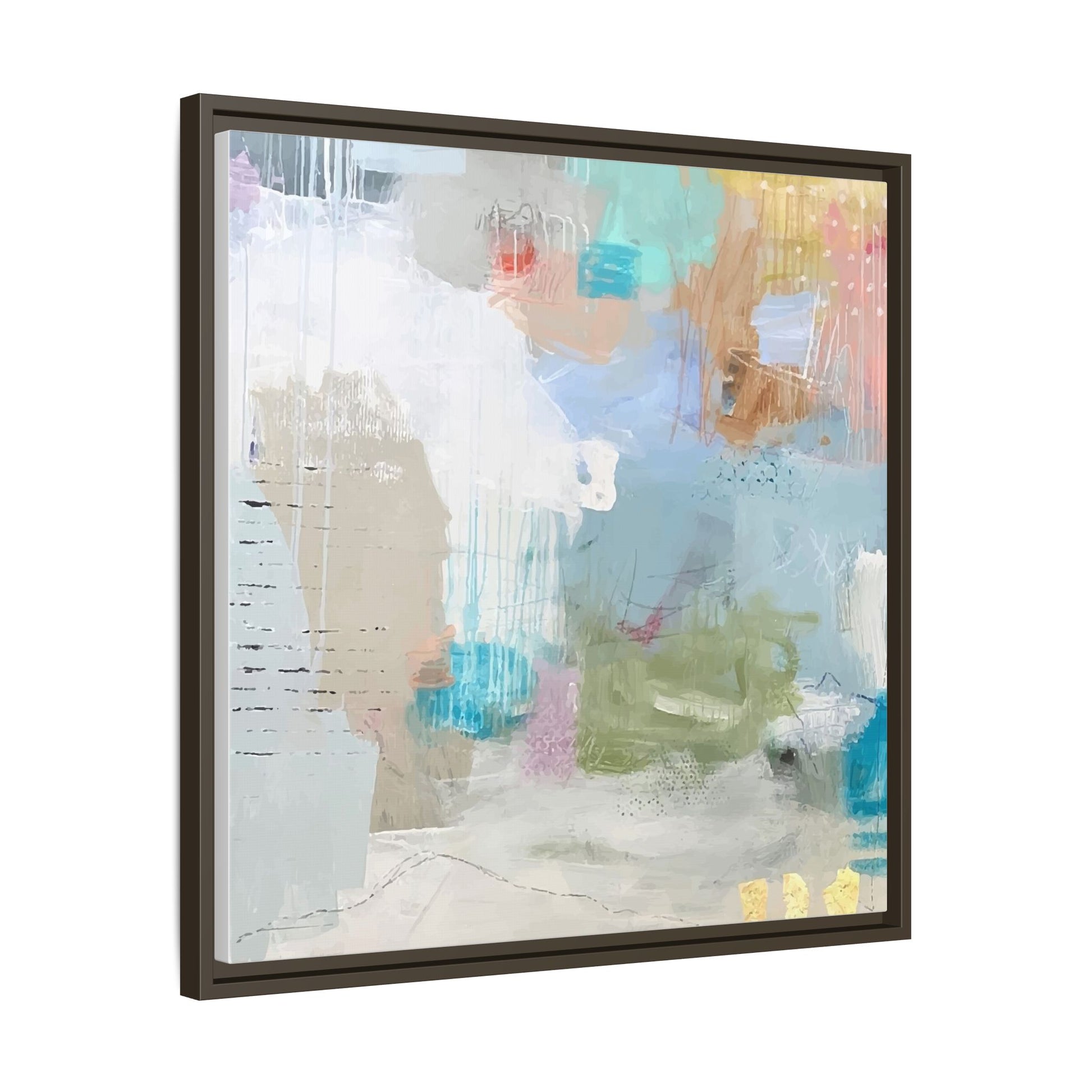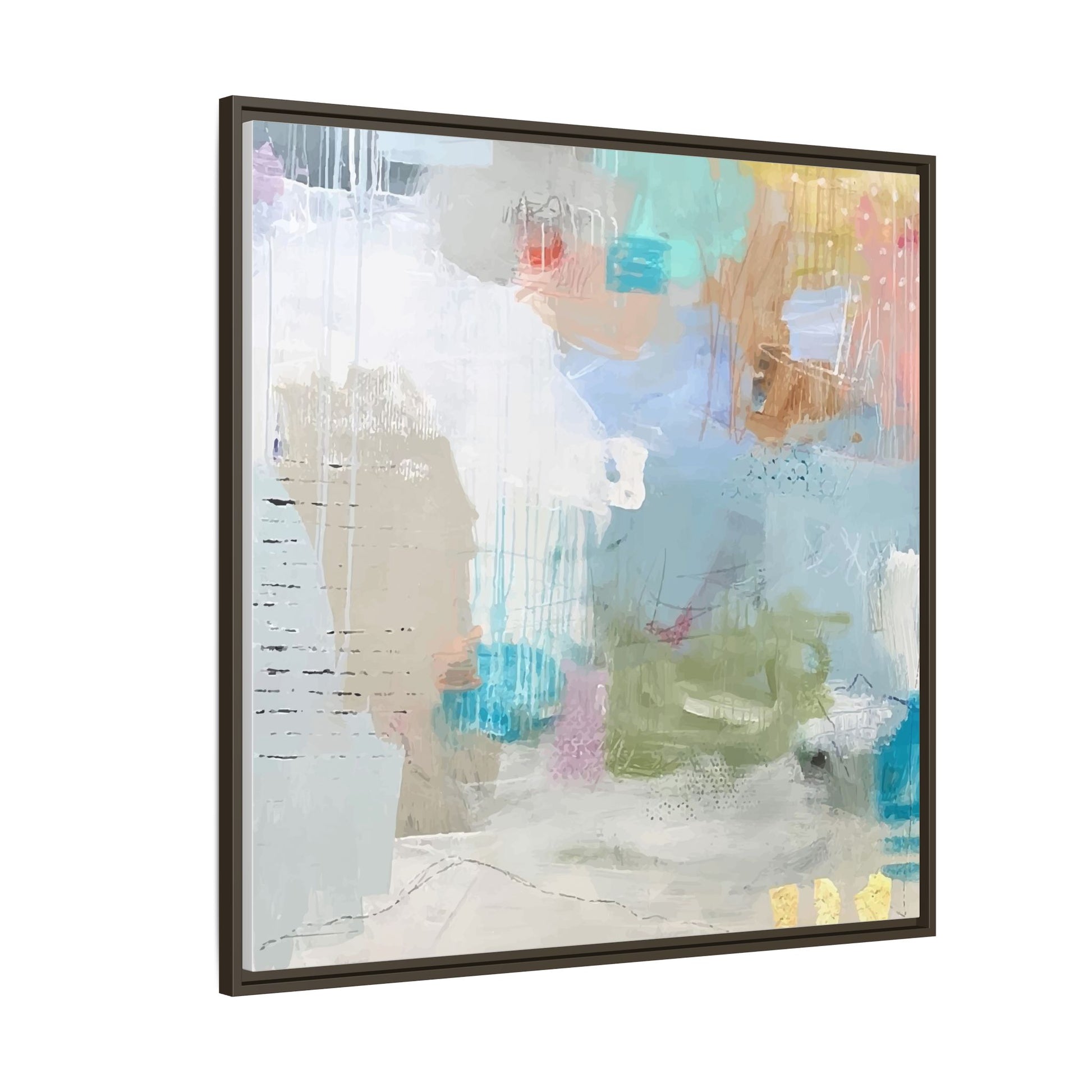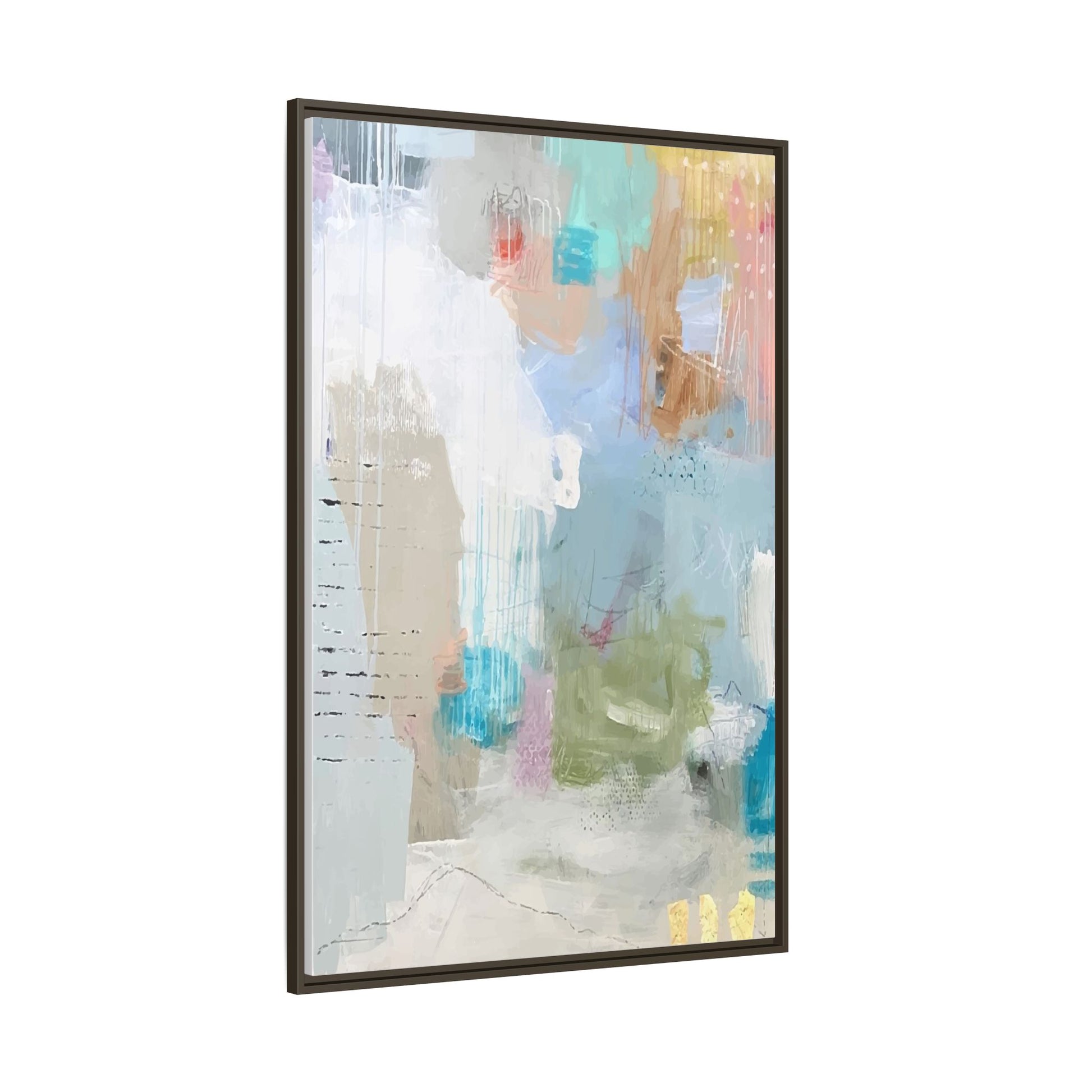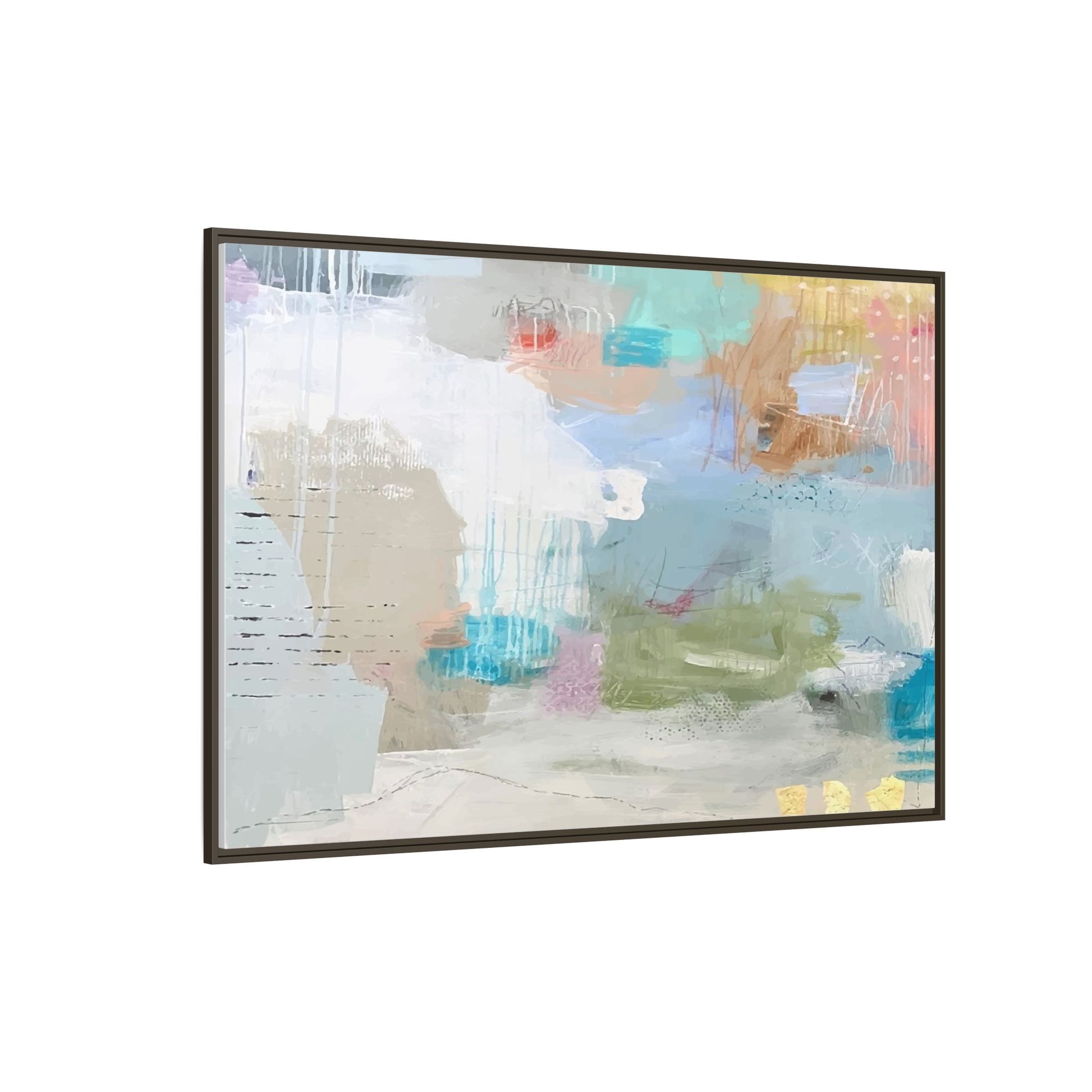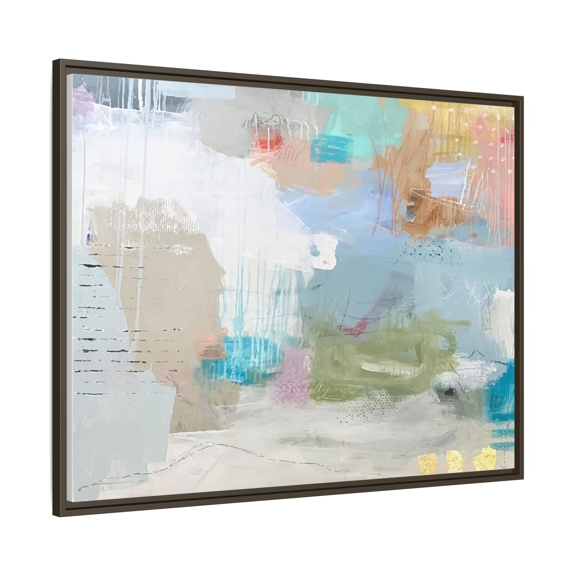 This abstract painting is a delicate composition of soft, ethereal colors including pale blues, greens, yellows, and hints of pink and orange. The artwork features layered brushstrokes and translucent washes that create a dreamy, atmospheric quality with organic shapes and textural elements. Vertical drips and subtle line work add visual interest and movement throughout the piece, giving the impression of a misty, impressionistic landscape or seascape. The color palette is predominantly cool and muted, with gentle blending and overlapping of hues that create a sense of depth and ethereal space. The painting's style suggests a contemporary abstract approach, with a focus on texture, color interaction, and subtle visual nuances.