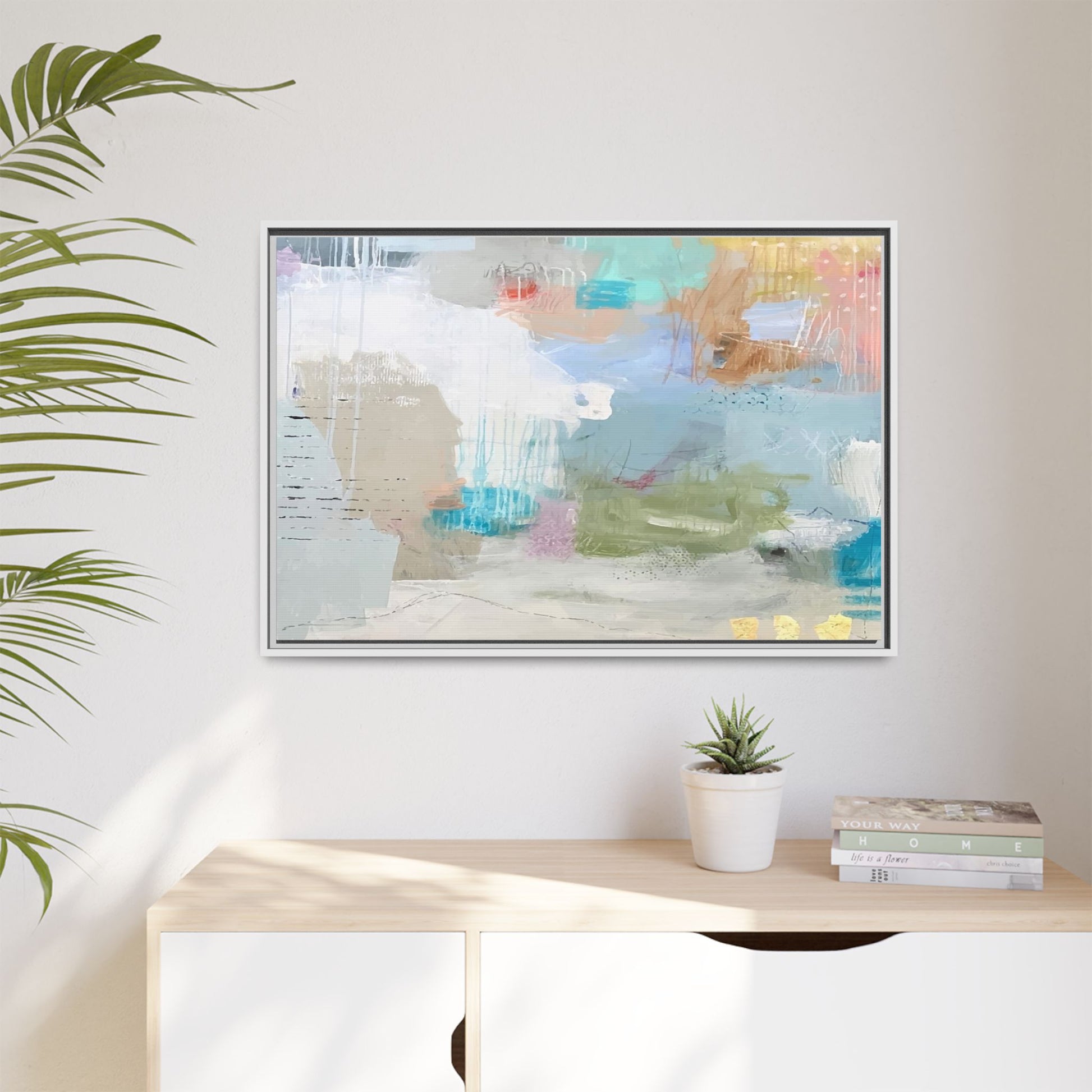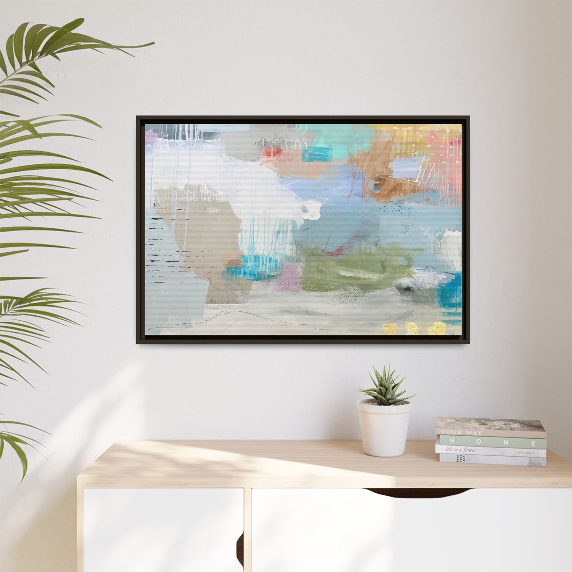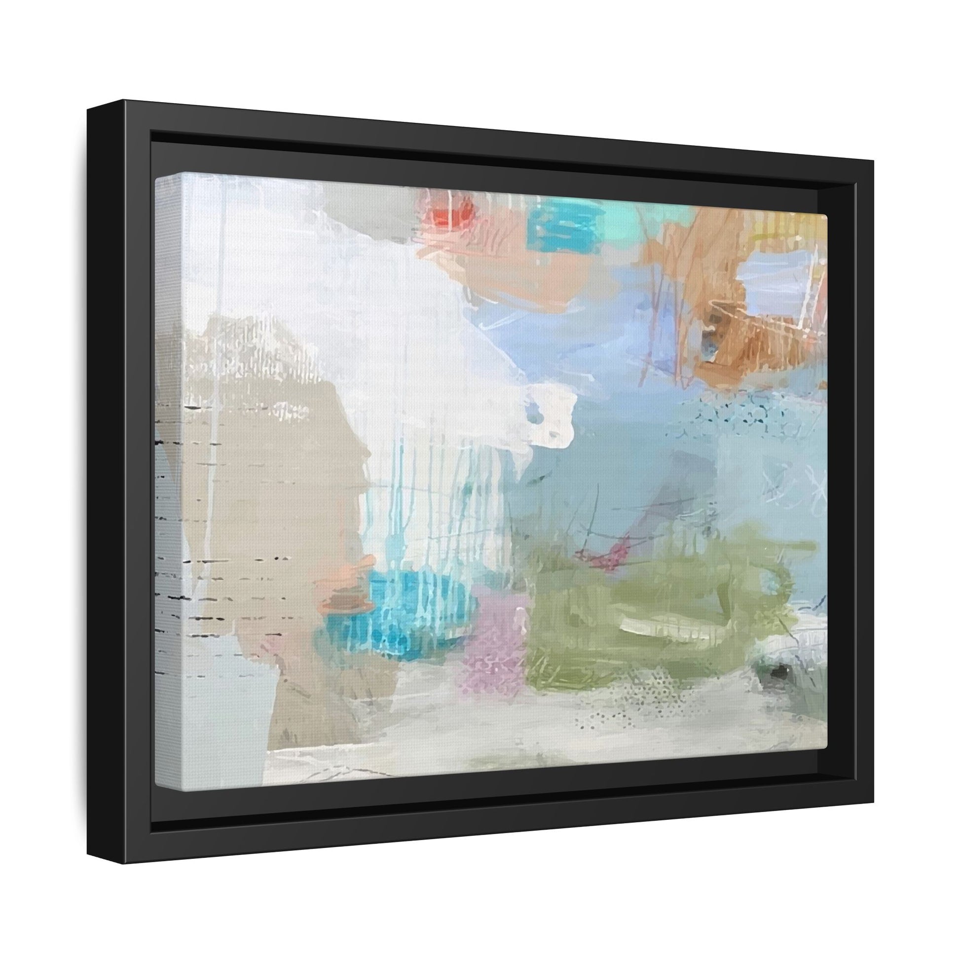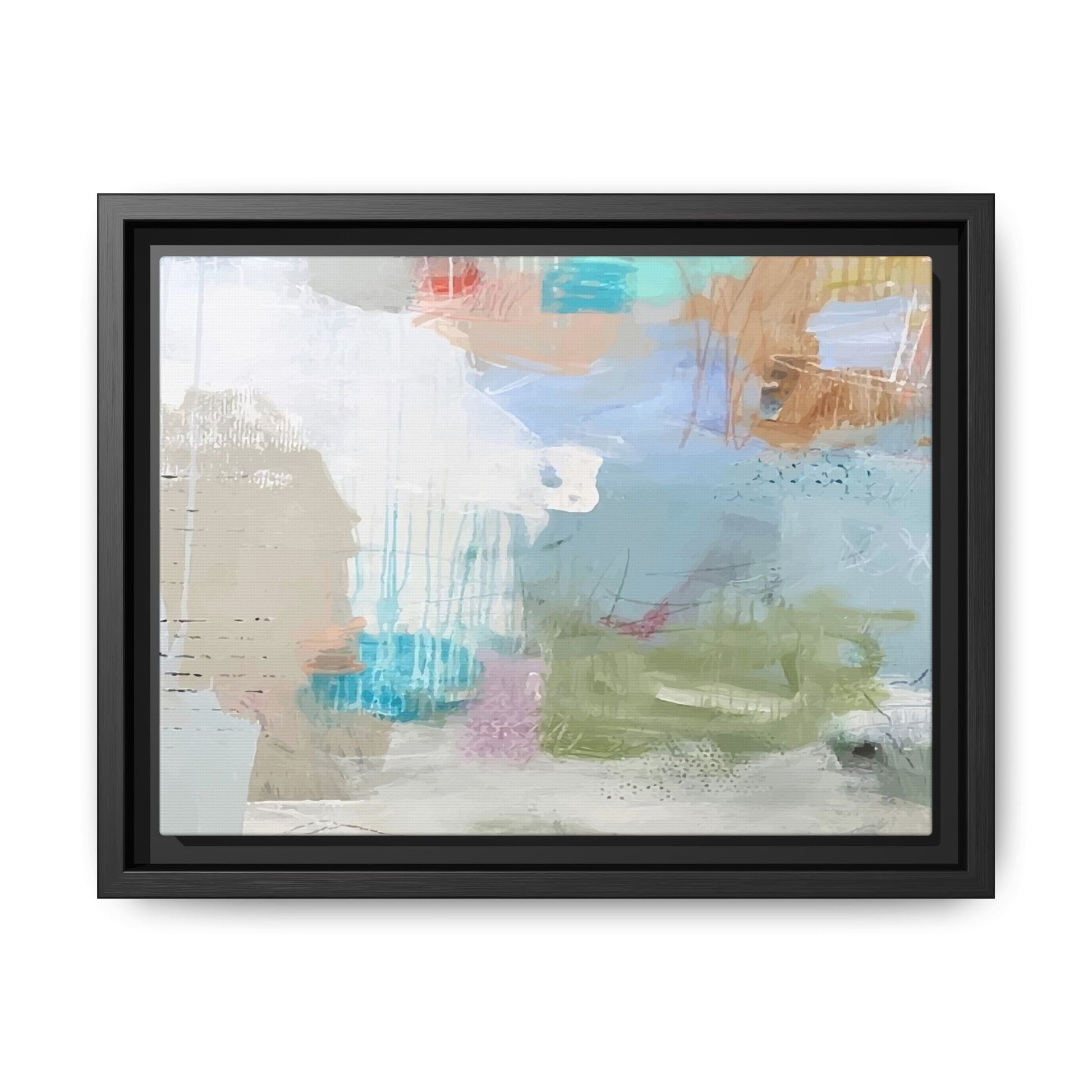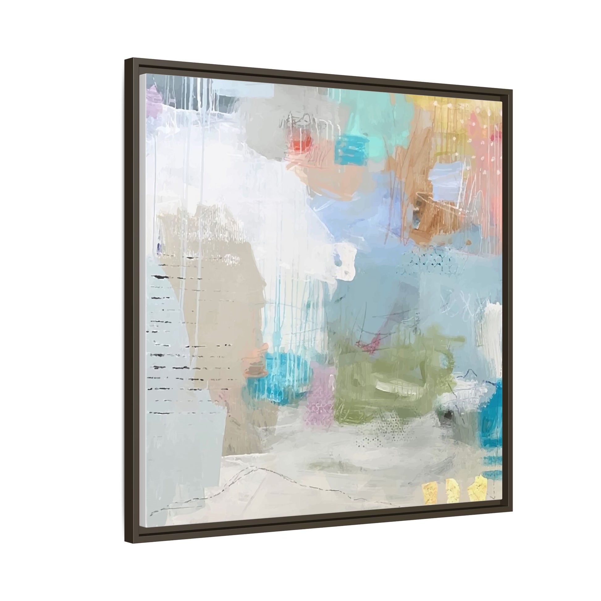 This abstract painting is a delicate composition of soft, ethereal colors including pale blues, greens, yellows, and hints of pink and orange. The artwork features layered brushstrokes and translucent washes that create a dreamy, atmospheric quality with organic shapes and textural elements. Vertical drips and subtle line work add visual interest and movement throughout the piece, giving the impression of a misty, impressionistic landscape or seascape. The color palette is predominantly cool and muted, with gentle blending and overlapping of hues that create a sense of depth and ethereal space. The painting's style suggests a contemporary abstract approach, with a focus on texture, color interaction, and subtle visual nuances.