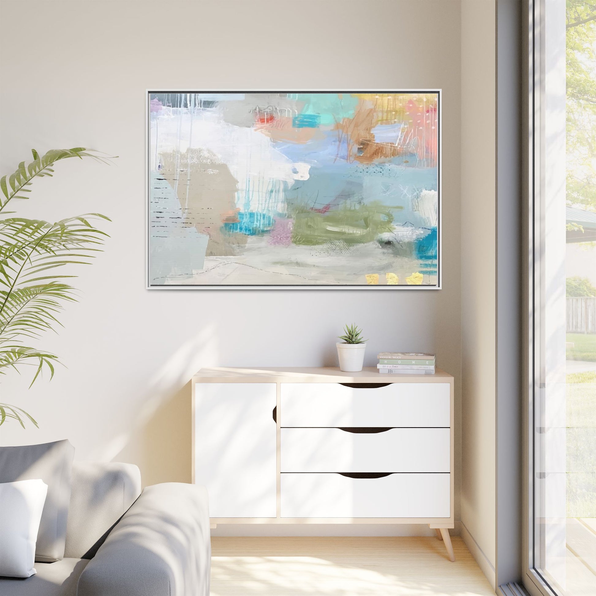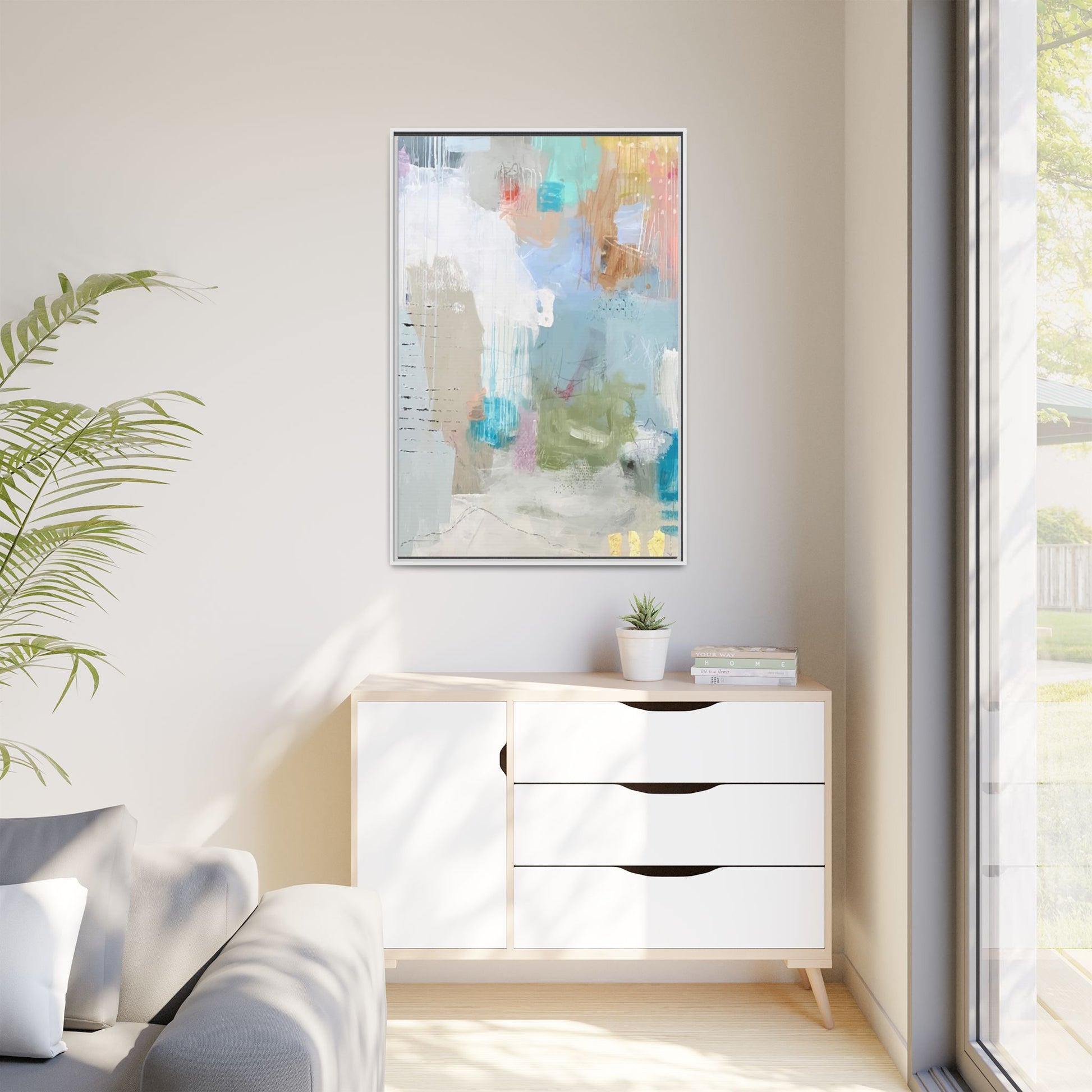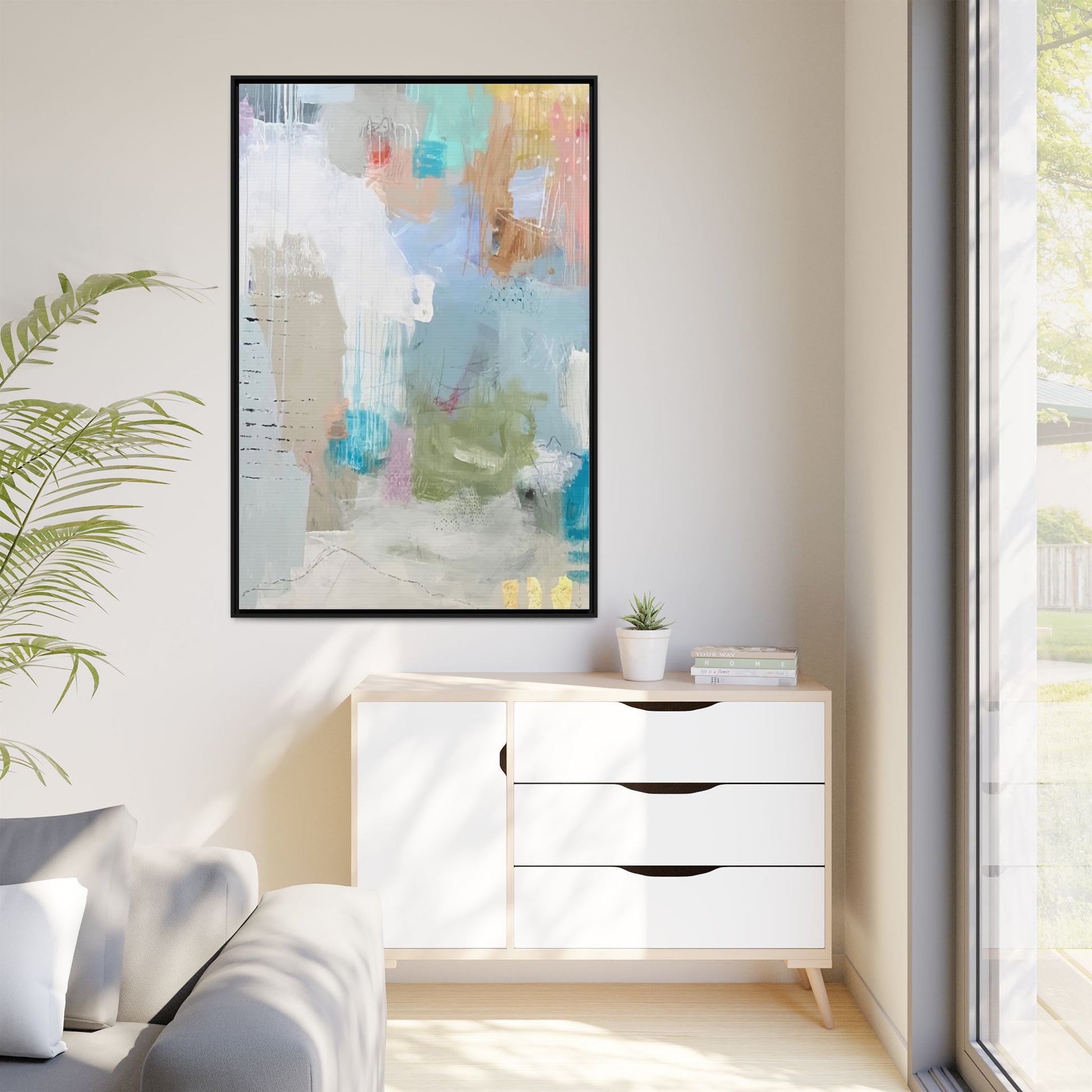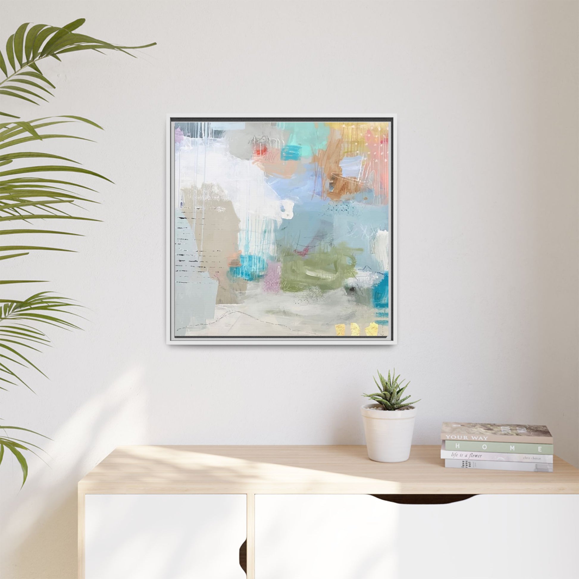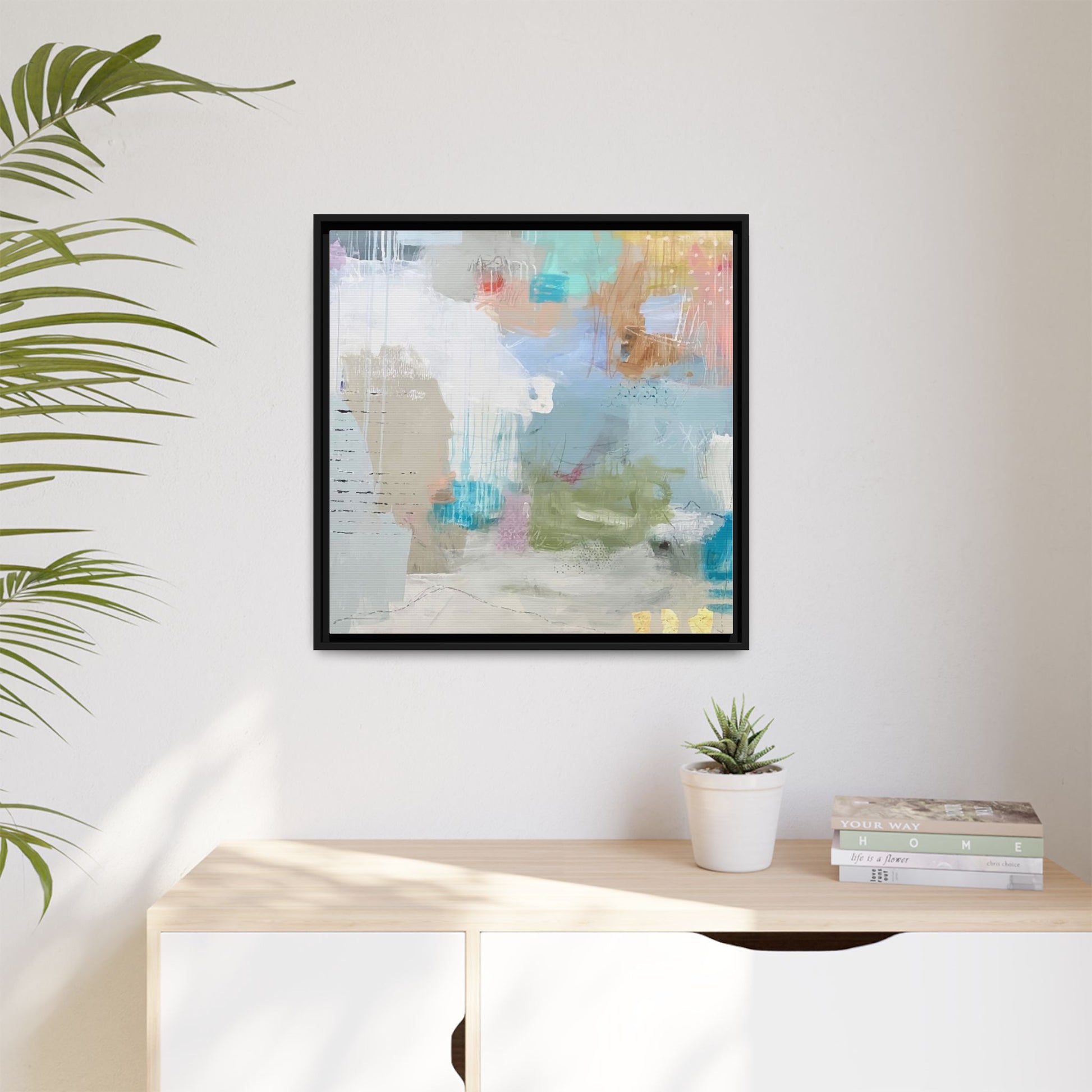 This abstract painting is a delicate composition of soft, ethereal colors including pale blues, greens, yellows, and hints of pink and orange. The artwork features layered brushstrokes and translucent washes that create a dreamy, atmospheric quality with organic shapes and textural elements. Vertical drips and subtle line work add visual interest and movement throughout the piece, giving the impression of a misty, impressionistic landscape or seascape. The color palette is predominantly cool and muted, with gentle blending and overlapping of hues that create a sense of depth and ethereal space. The painting's style suggests a contemporary abstract approach, with a focus on texture, color interaction, and subtle visual nuances.