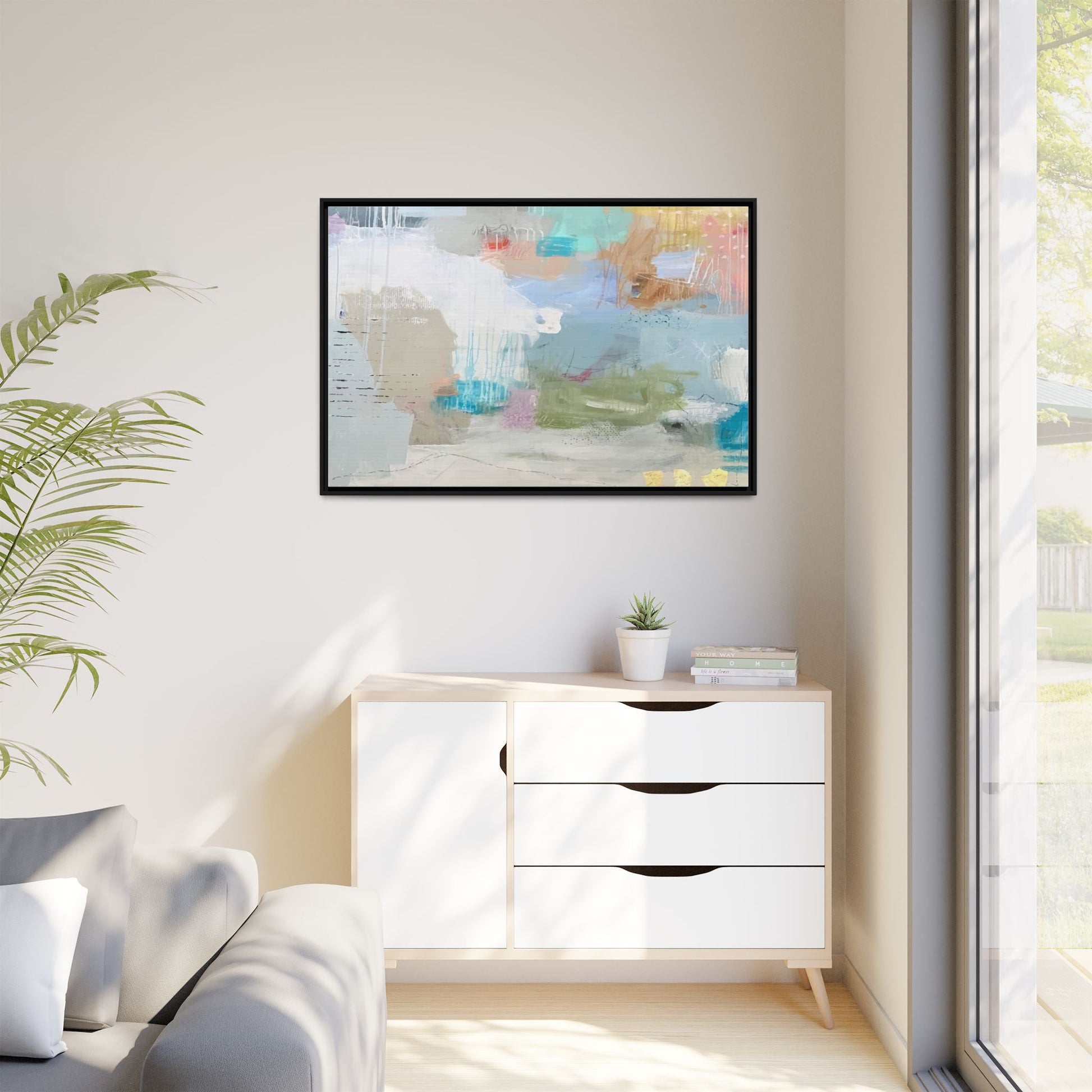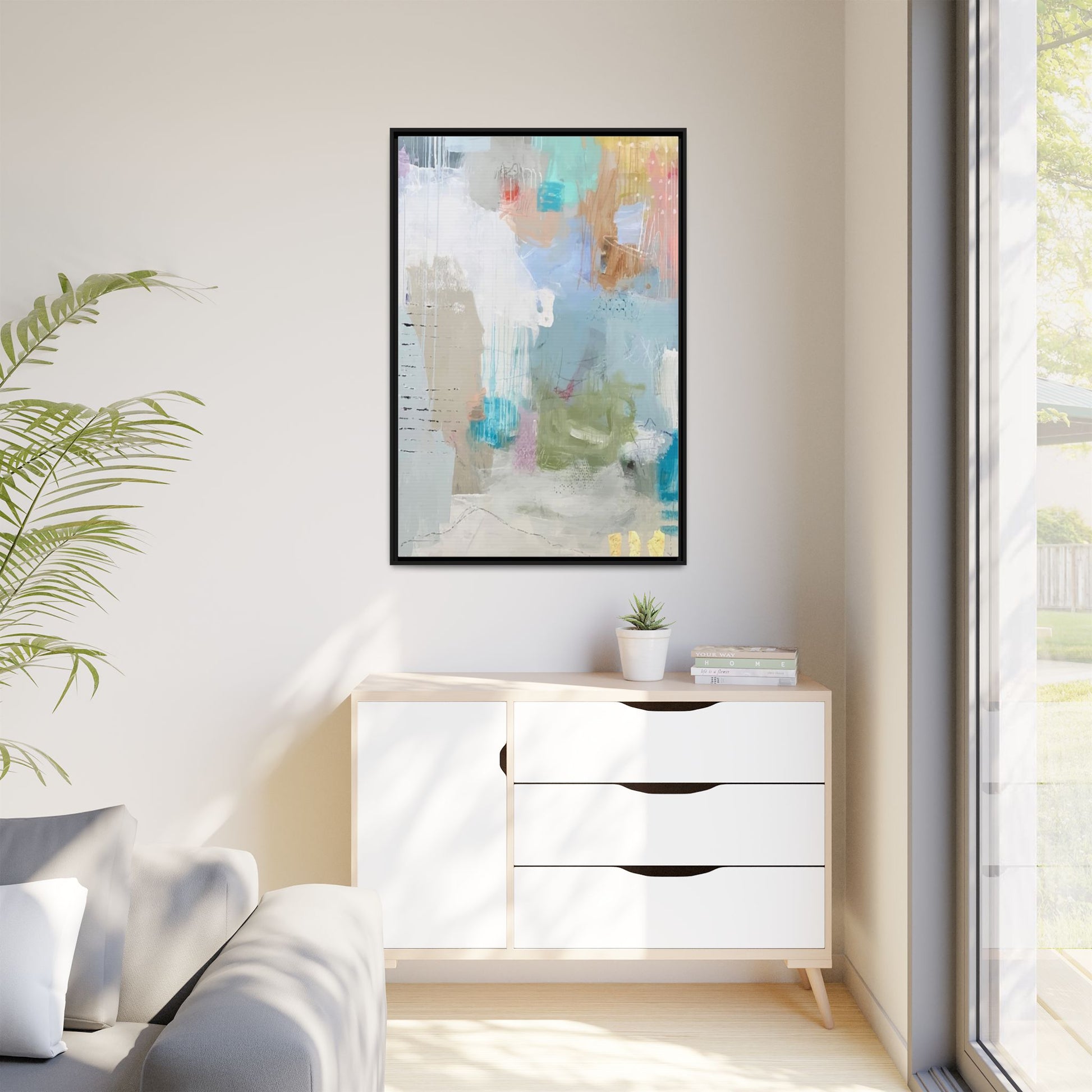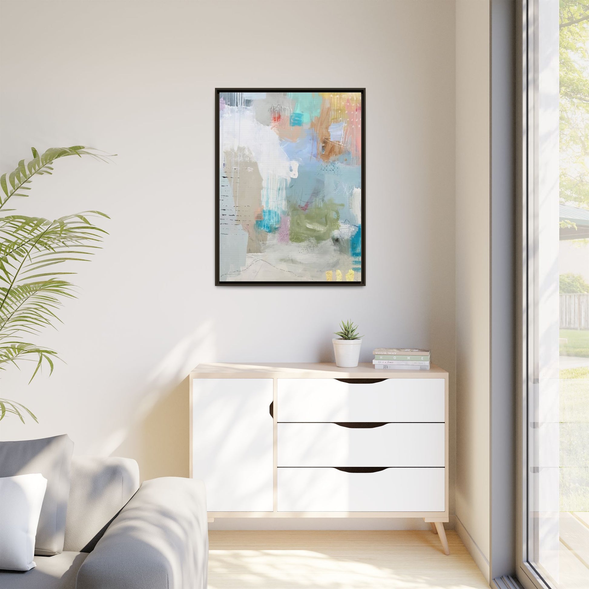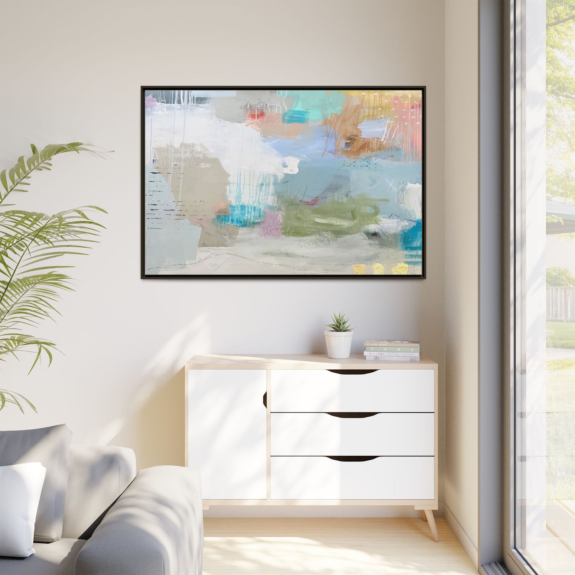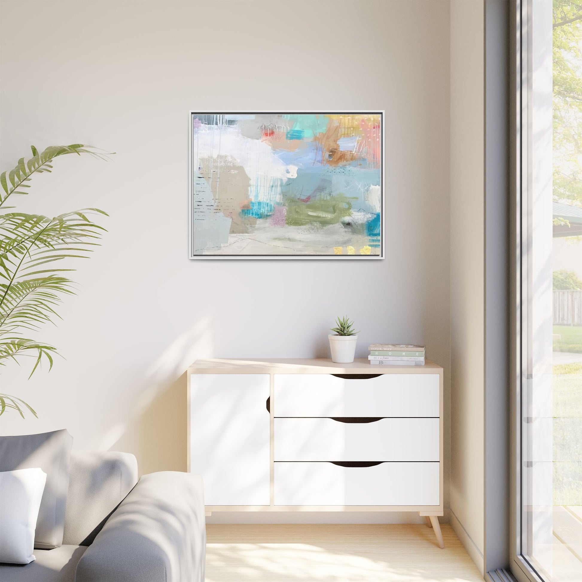 This abstract painting is a delicate composition of soft, ethereal colors including pale blues, greens, yellows, and hints of pink and orange. The artwork features layered brushstrokes and translucent washes that create a dreamy, atmospheric quality with organic shapes and textural elements. Vertical drips and subtle line work add visual interest and movement throughout the piece, giving the impression of a misty, impressionistic landscape or seascape. The color palette is predominantly cool and muted, with gentle blending and overlapping of hues that create a sense of depth and ethereal space. The painting's style suggests a contemporary abstract approach, with a focus on texture, color interaction, and subtle visual nuances.