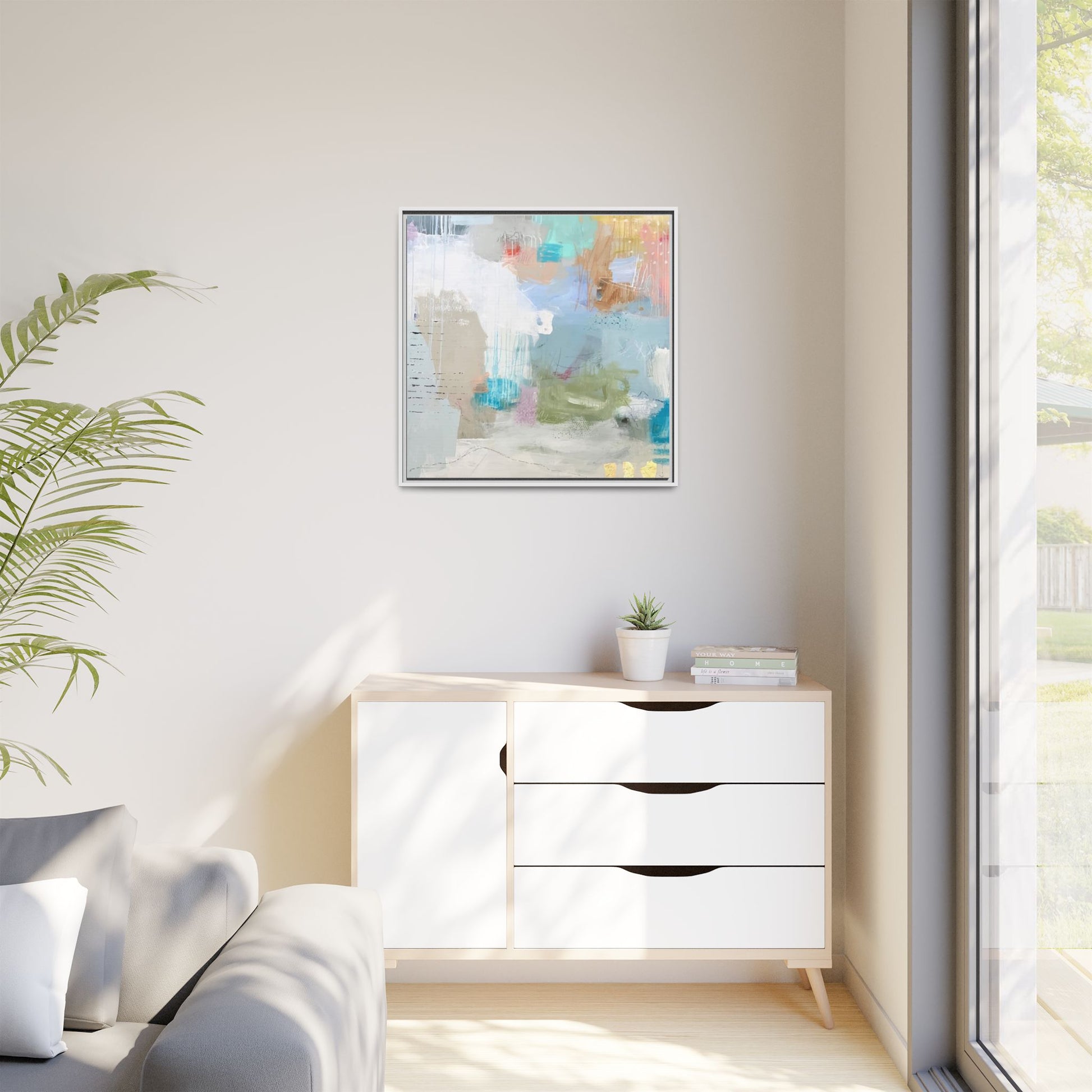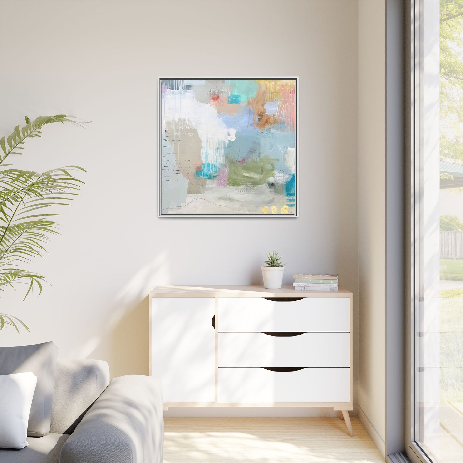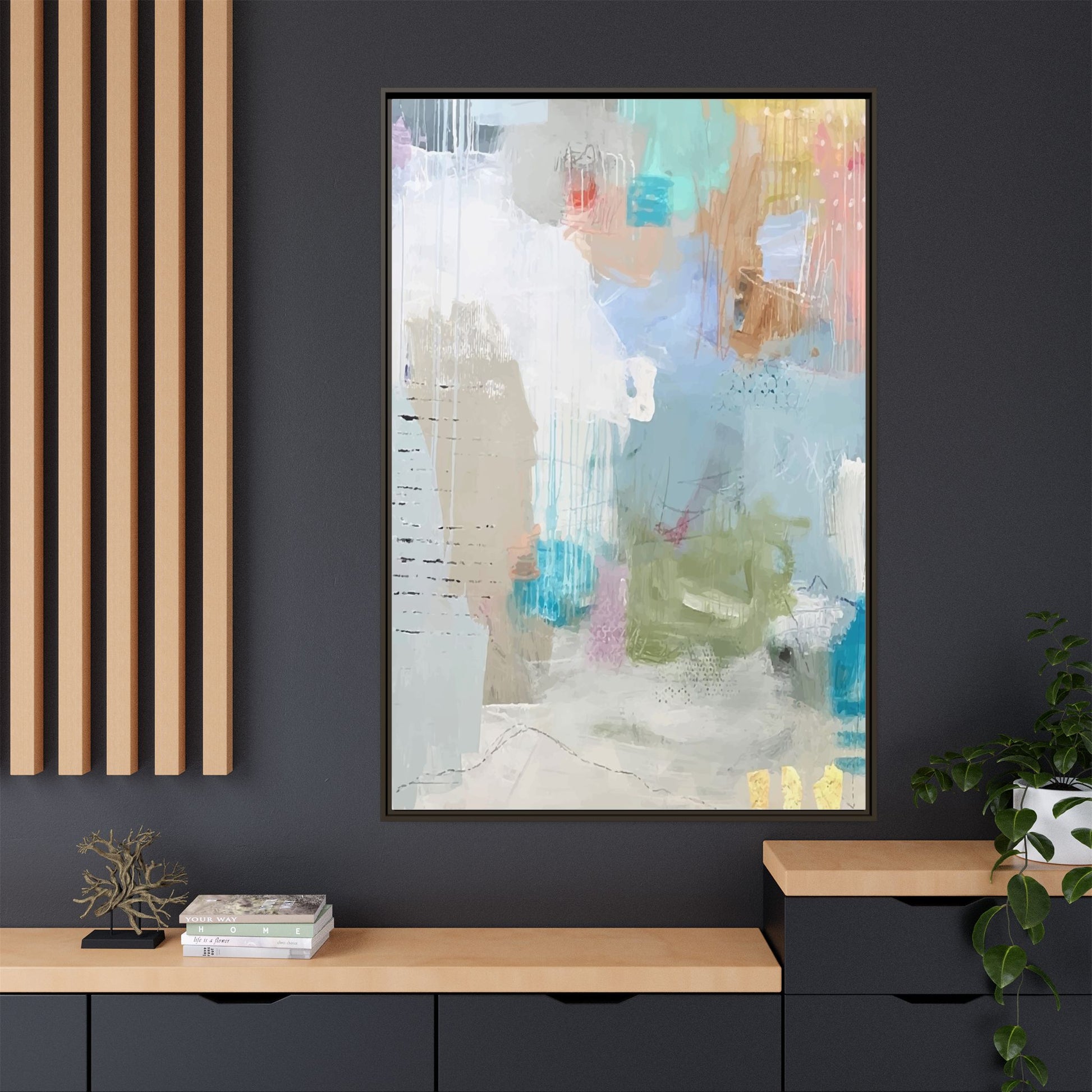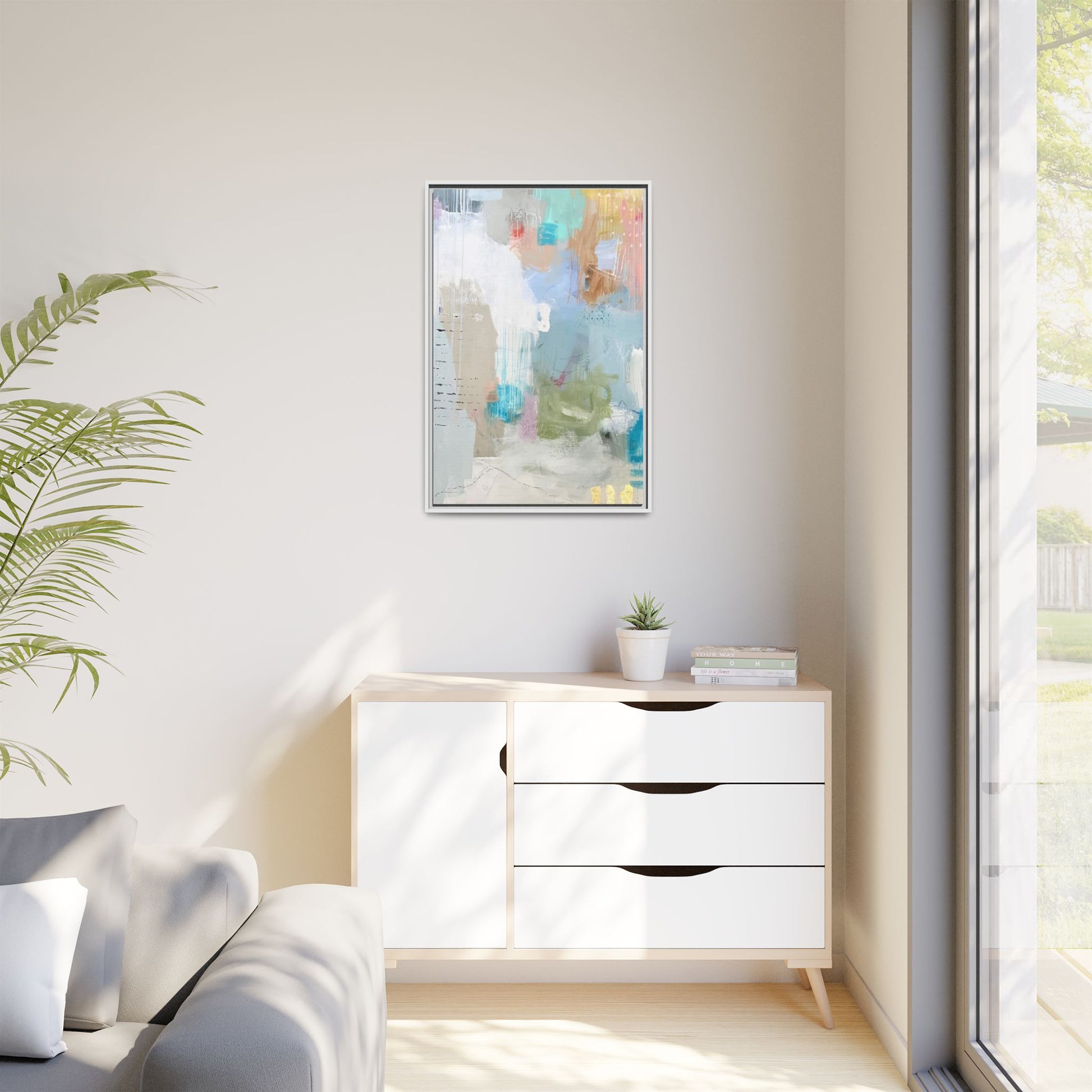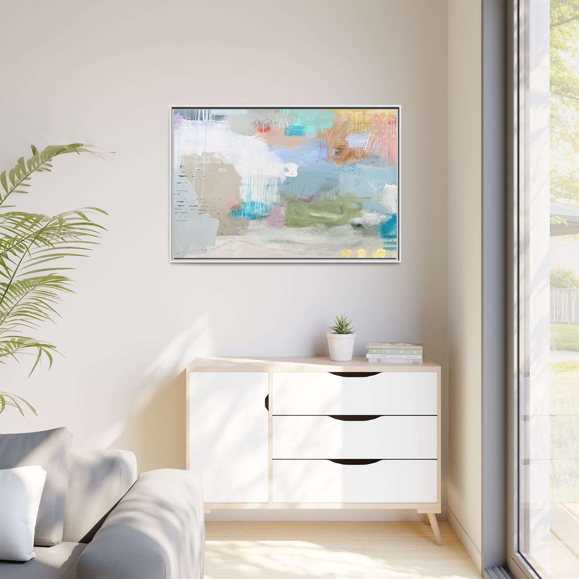 This abstract painting is a delicate composition of soft, ethereal colors including pale blues, greens, yellows, and hints of pink and orange. The artwork features layered brushstrokes and translucent washes that create a dreamy, atmospheric quality with organic shapes and textural elements. Vertical drips and subtle line work add visual interest and movement throughout the piece, giving the impression of a misty, impressionistic landscape or seascape. The color palette is predominantly cool and muted, with gentle blending and overlapping of hues that create a sense of depth and ethereal space. The painting's style suggests a contemporary abstract approach, with a focus on texture, color interaction, and subtle visual nuances.