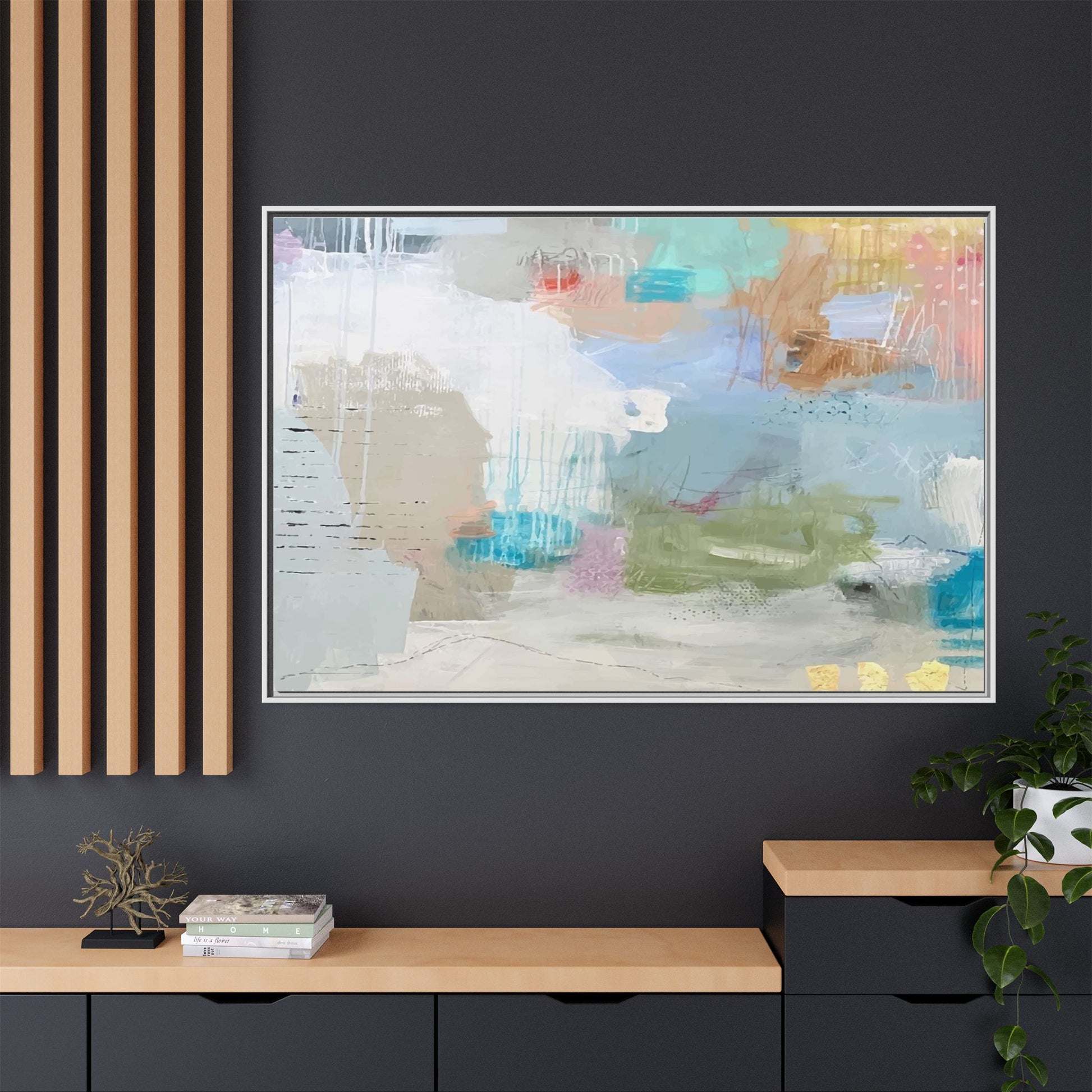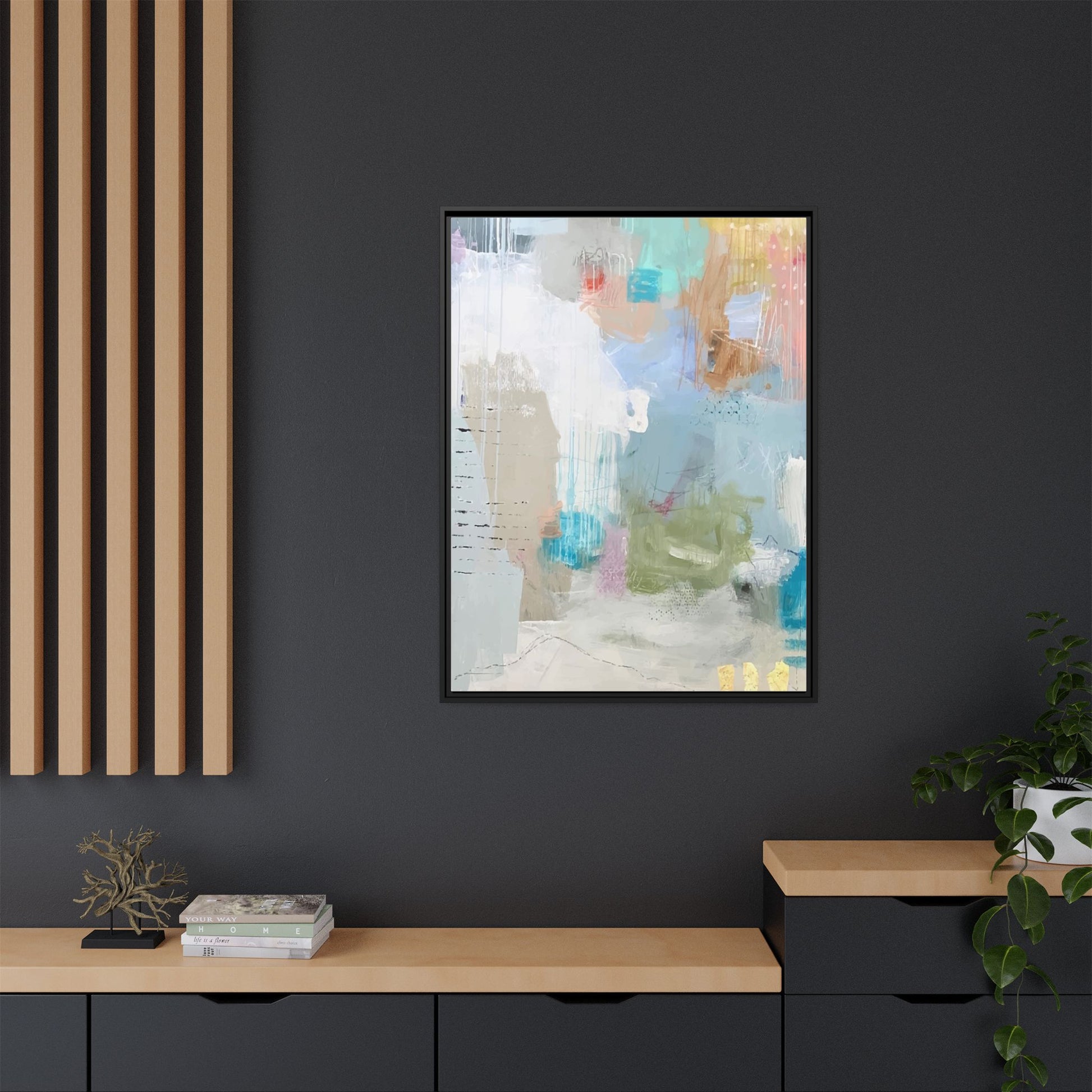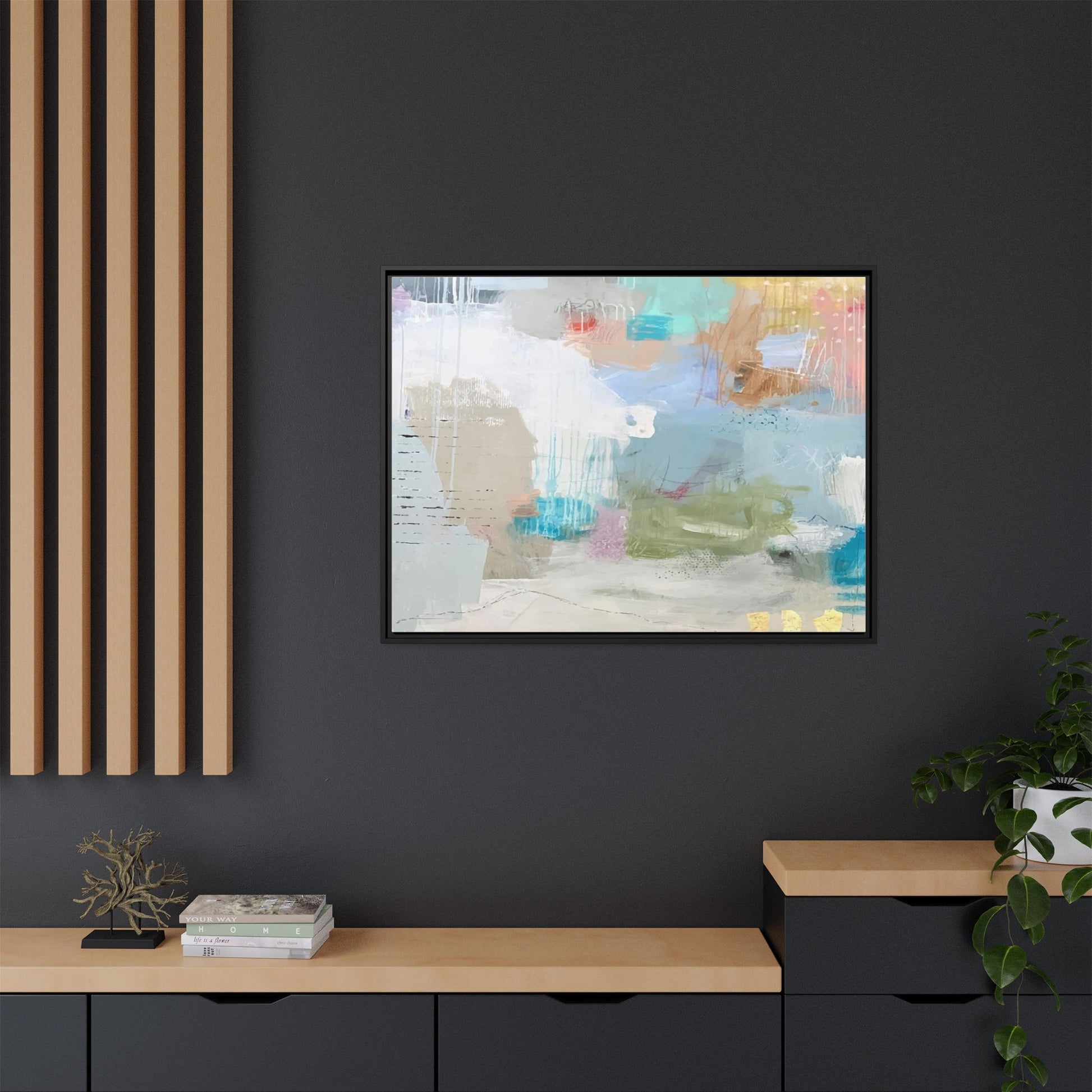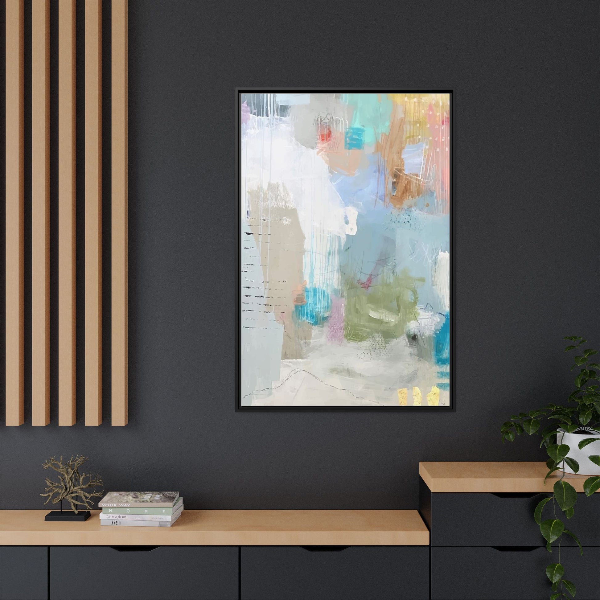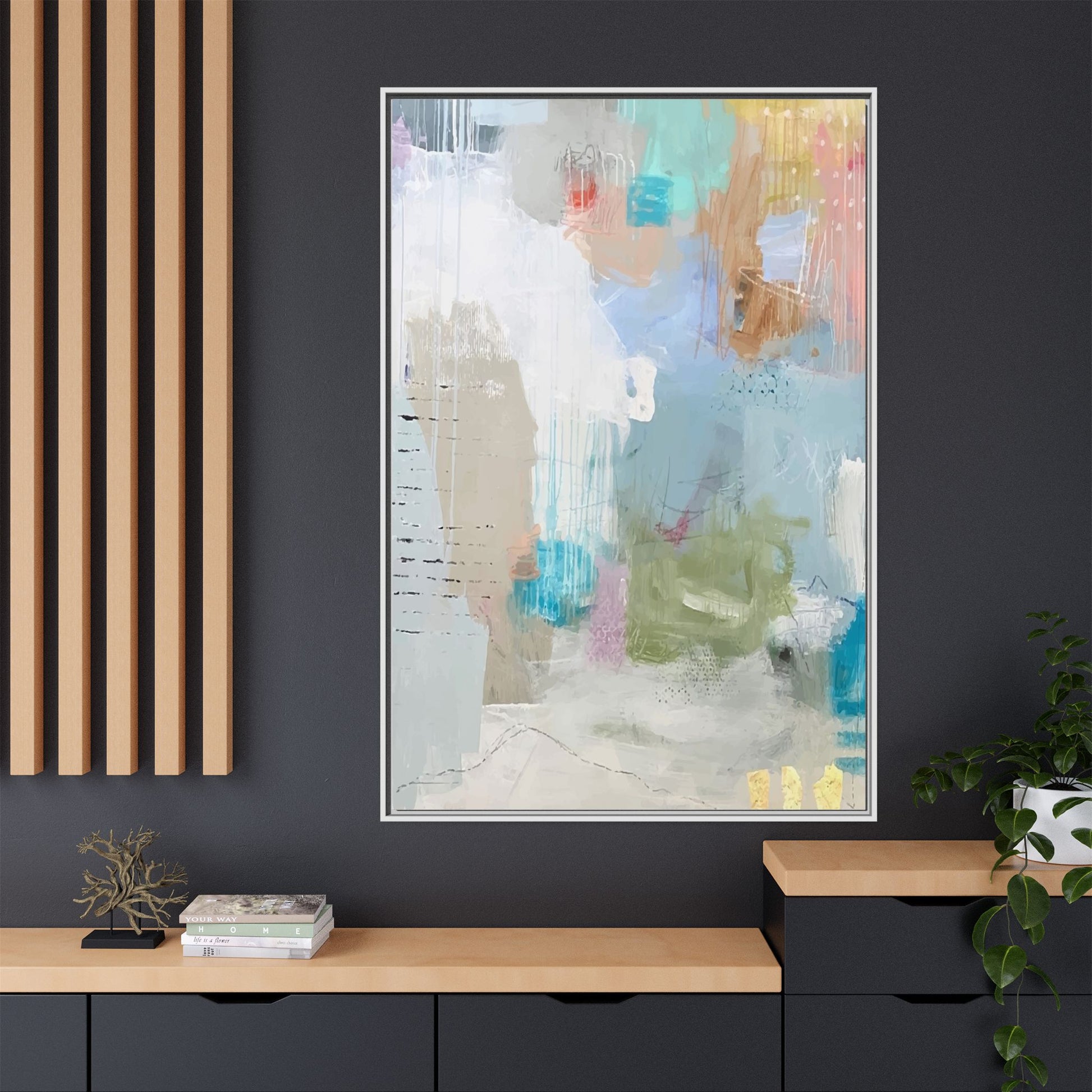 This abstract painting is a delicate composition of soft, ethereal colors including pale blues, greens, yellows, and hints of pink and orange. The artwork features layered brushstrokes and translucent washes that create a dreamy, atmospheric quality with organic shapes and textural elements. Vertical drips and subtle line work add visual interest and movement throughout the piece, giving the impression of a misty, impressionistic landscape or seascape. The color palette is predominantly cool and muted, with gentle blending and overlapping of hues that create a sense of depth and ethereal space. The painting's style suggests a contemporary abstract approach, with a focus on texture, color interaction, and subtle visual nuances.