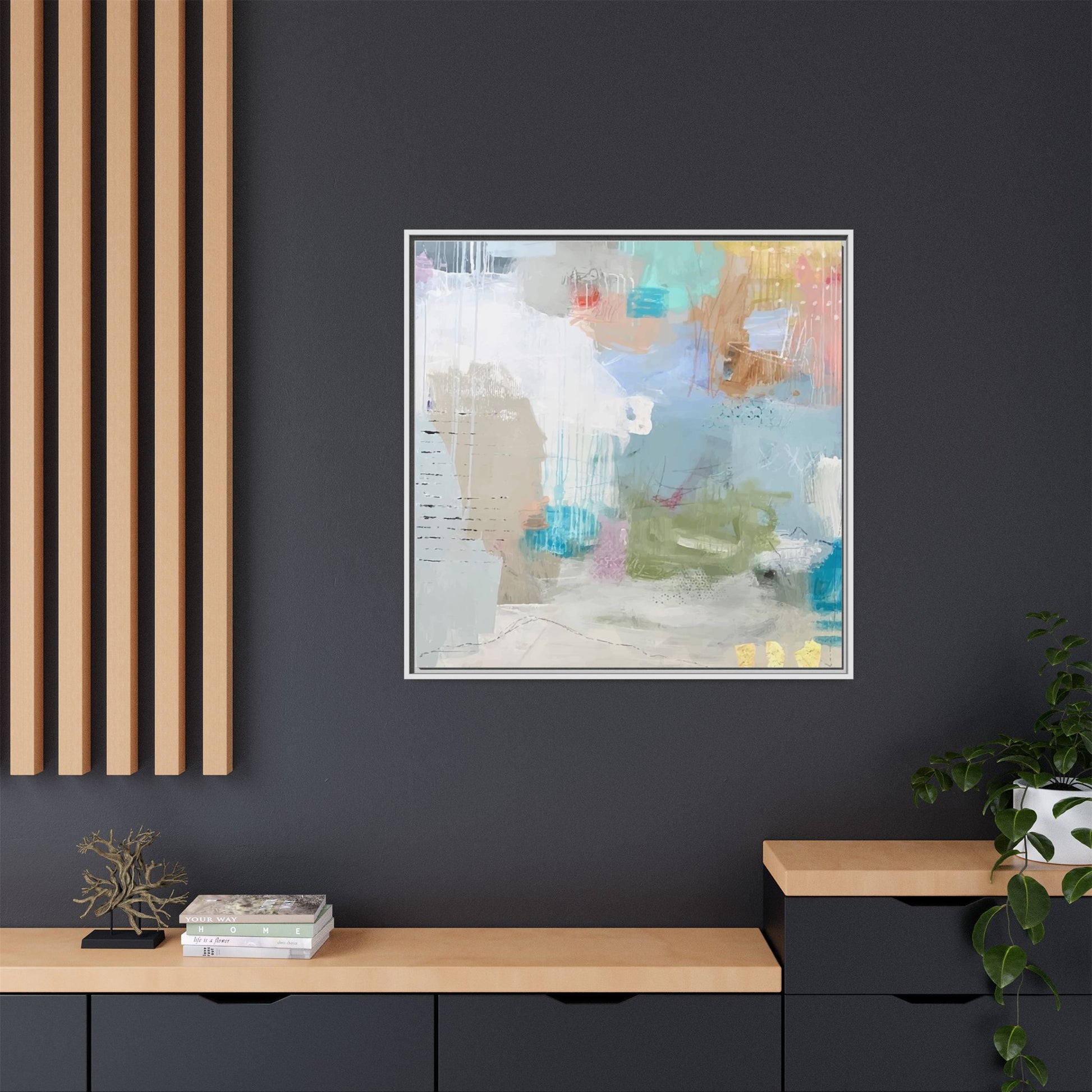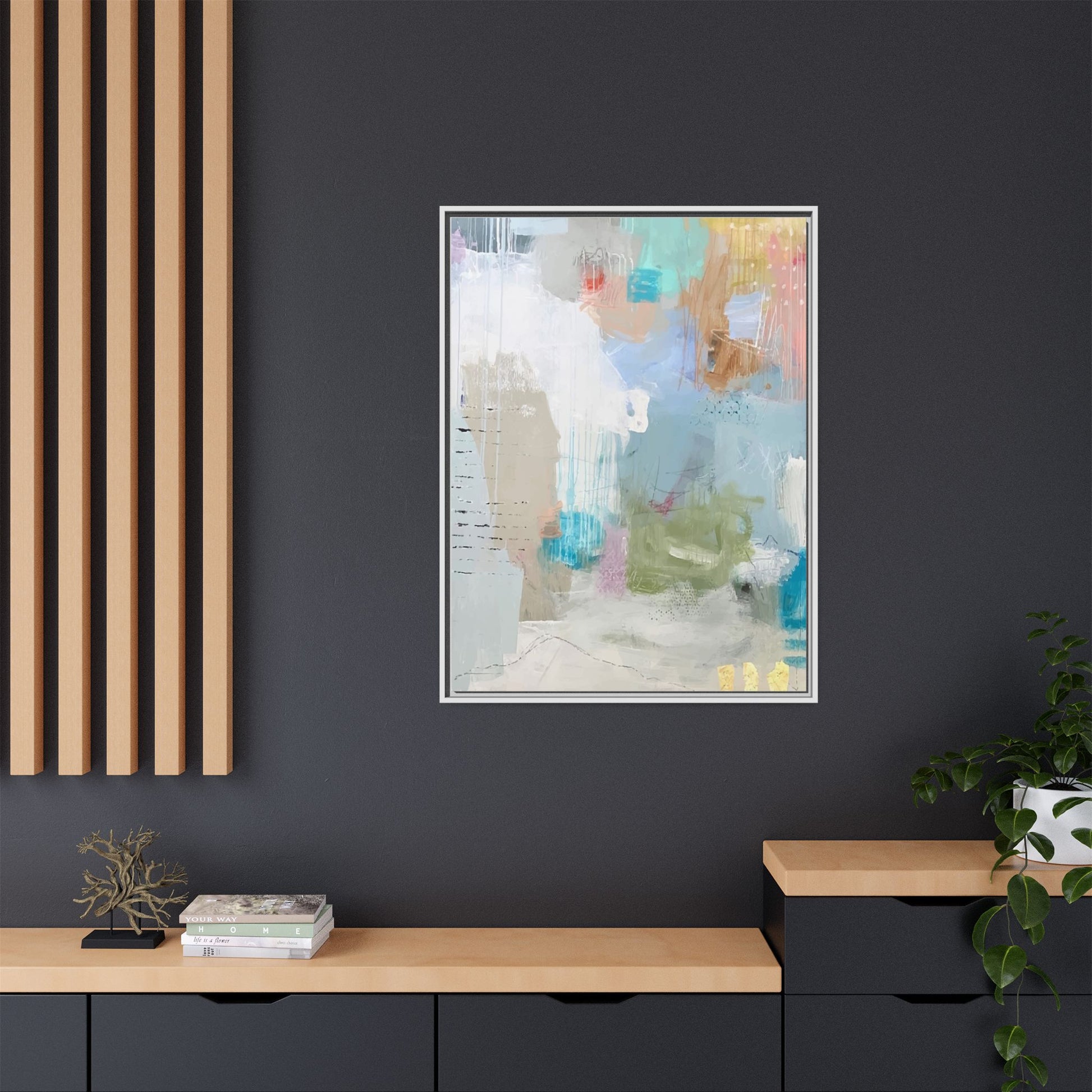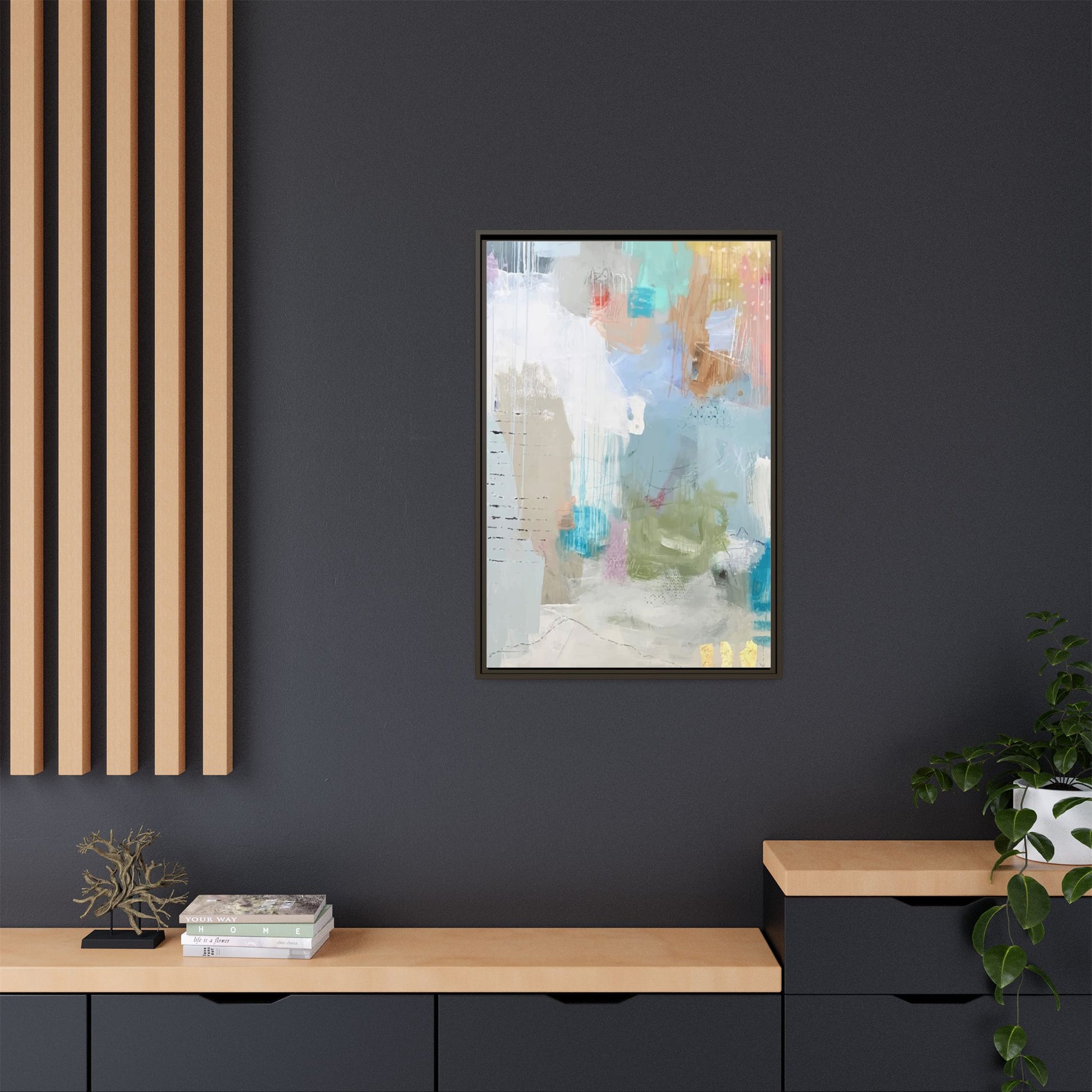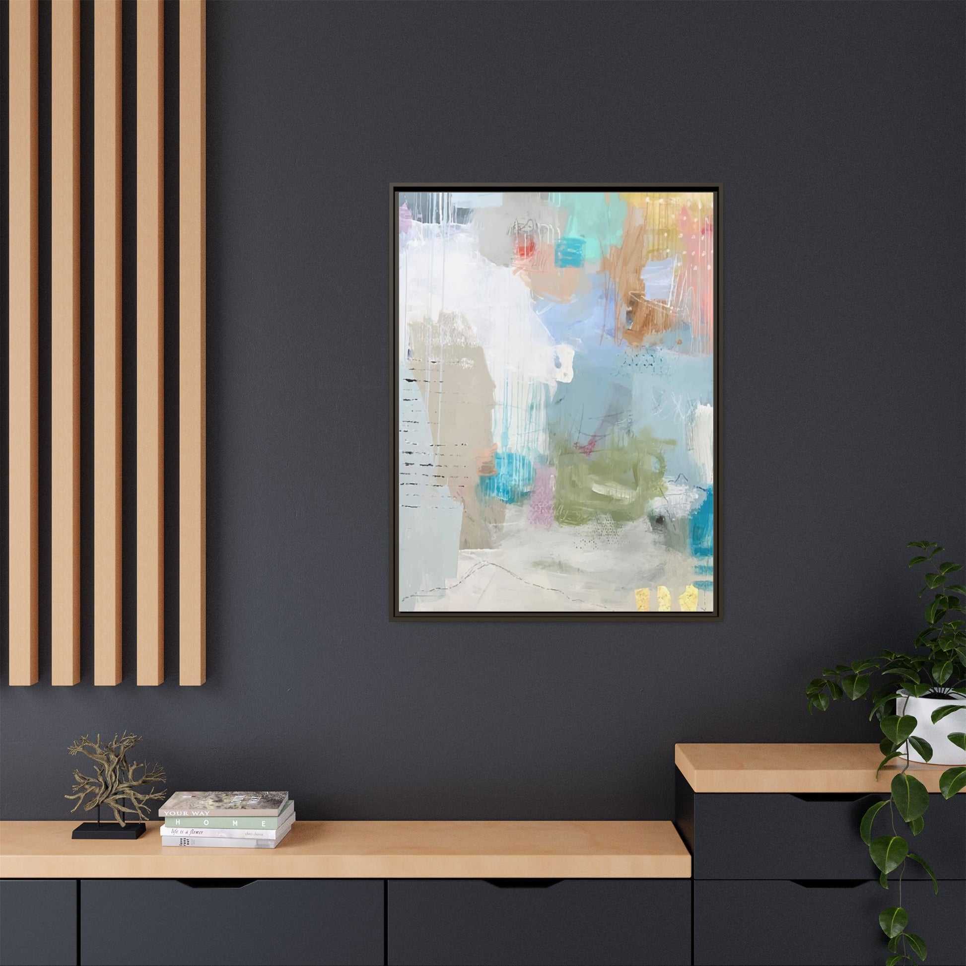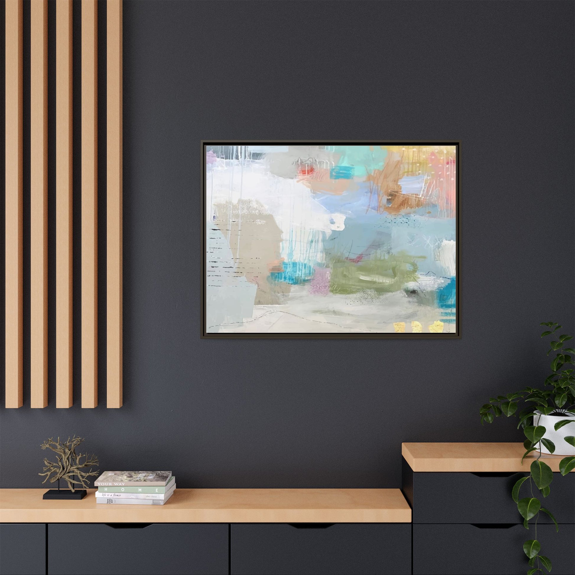 This abstract painting is a delicate composition of soft, ethereal colors including pale blues, greens, yellows, and hints of pink and orange. The artwork features layered brushstrokes and translucent washes that create a dreamy, atmospheric quality with organic shapes and textural elements. Vertical drips and subtle line work add visual interest and movement throughout the piece, giving the impression of a misty, impressionistic landscape or seascape. The color palette is predominantly cool and muted, with gentle blending and overlapping of hues that create a sense of depth and ethereal space. The painting's style suggests a contemporary abstract approach, with a focus on texture, color interaction, and subtle visual nuances.