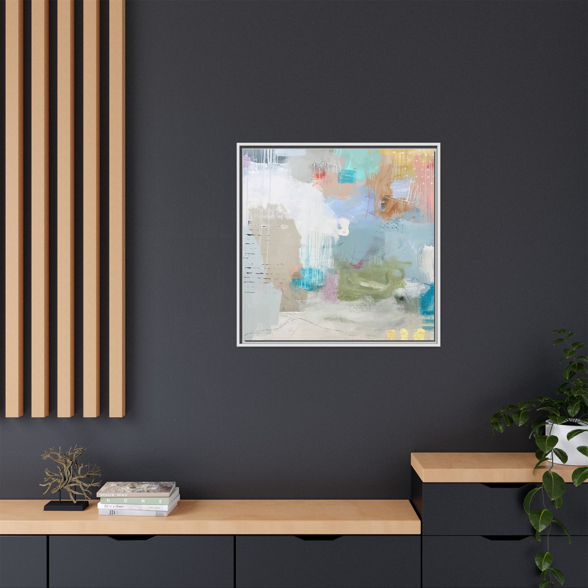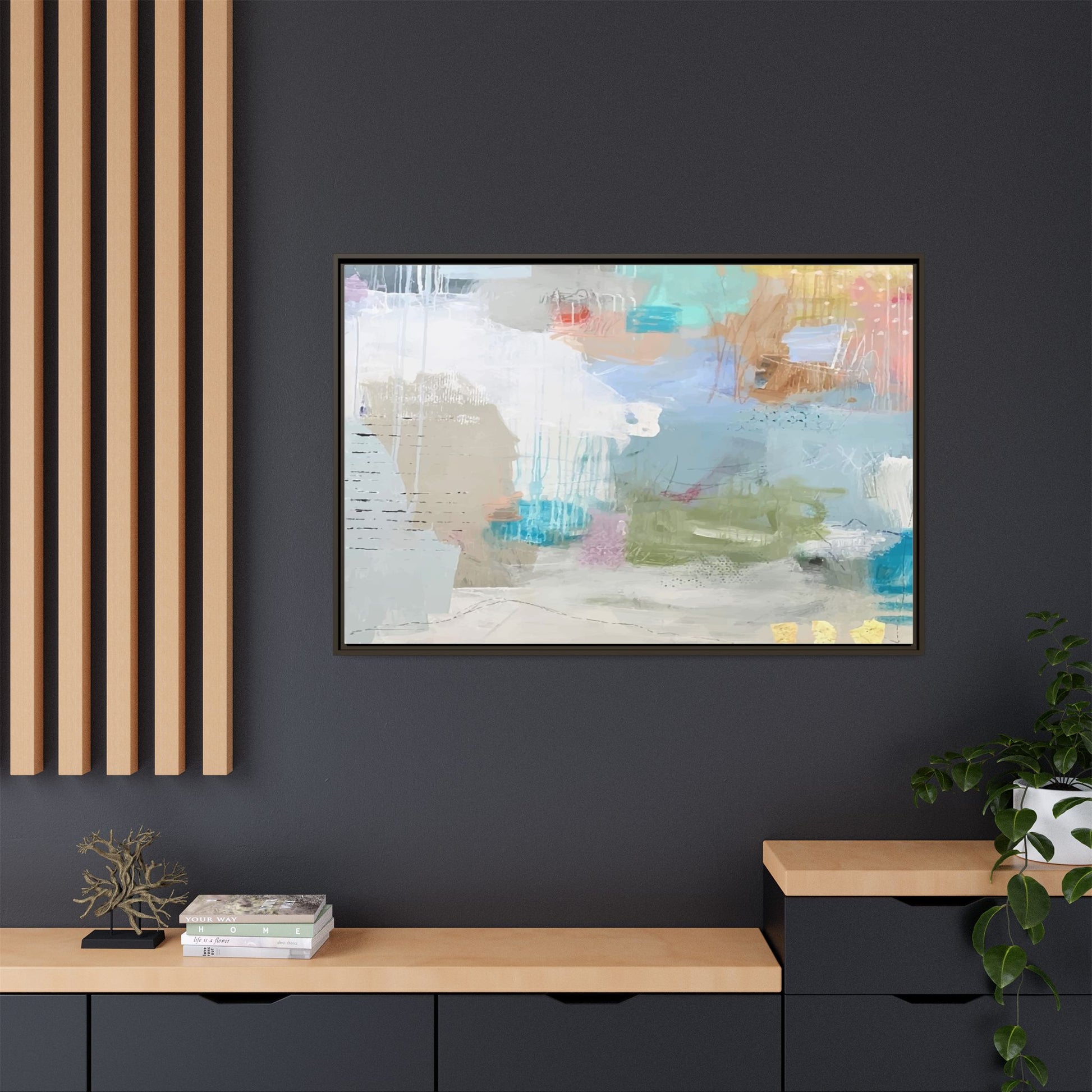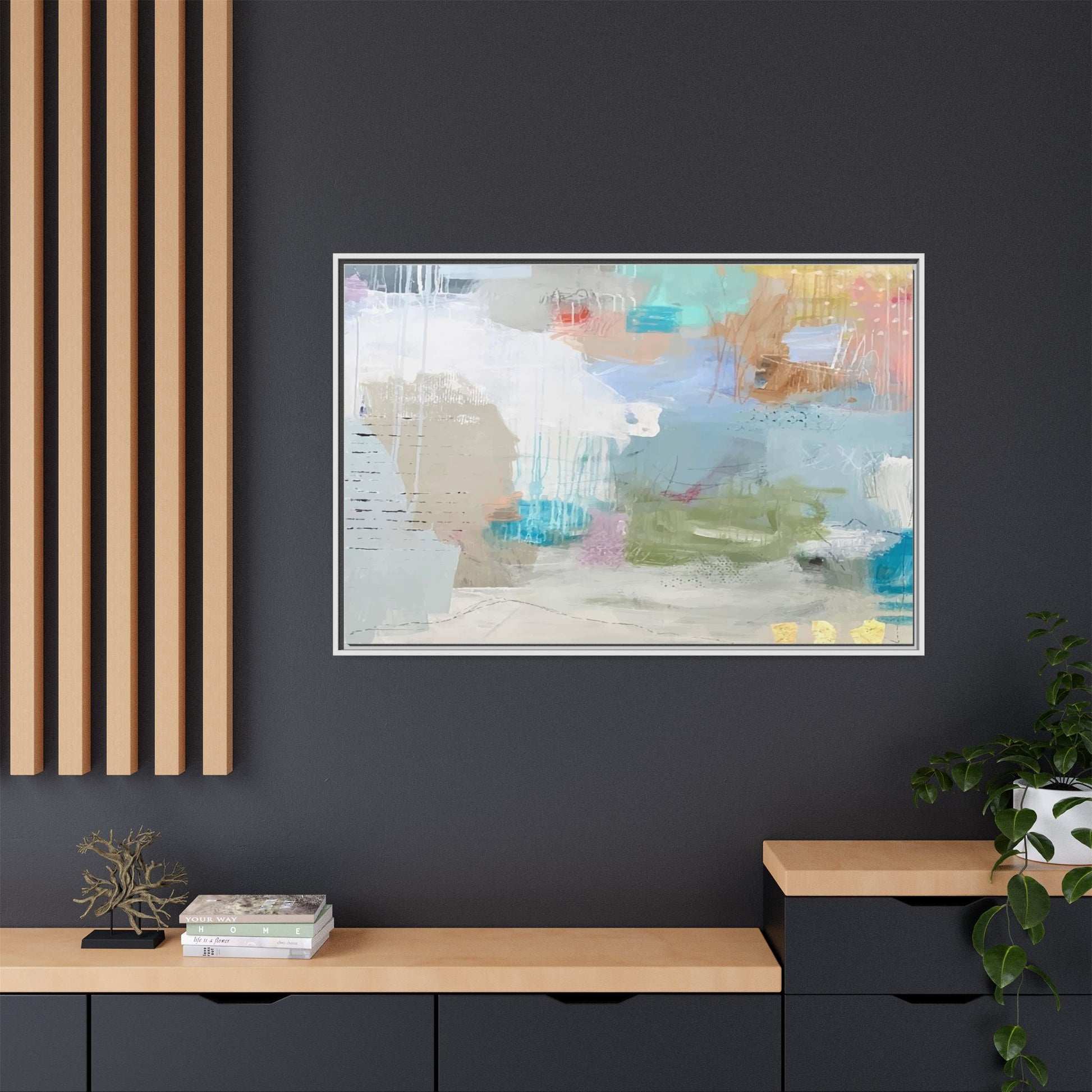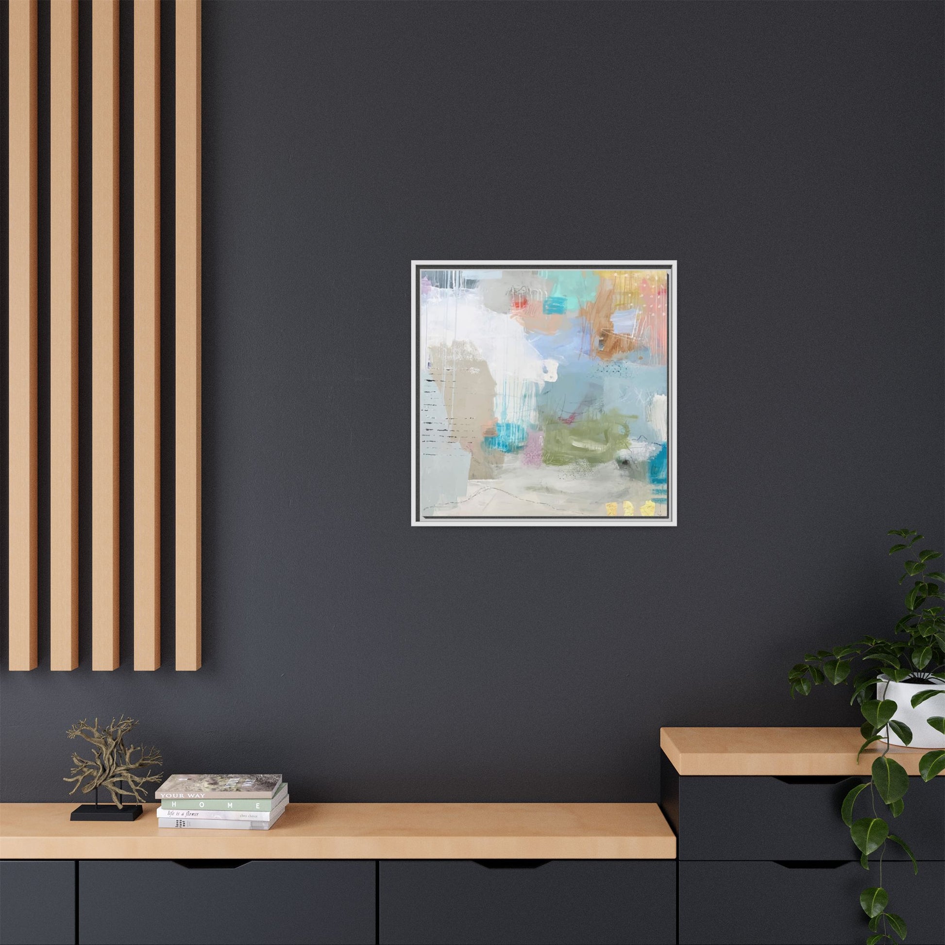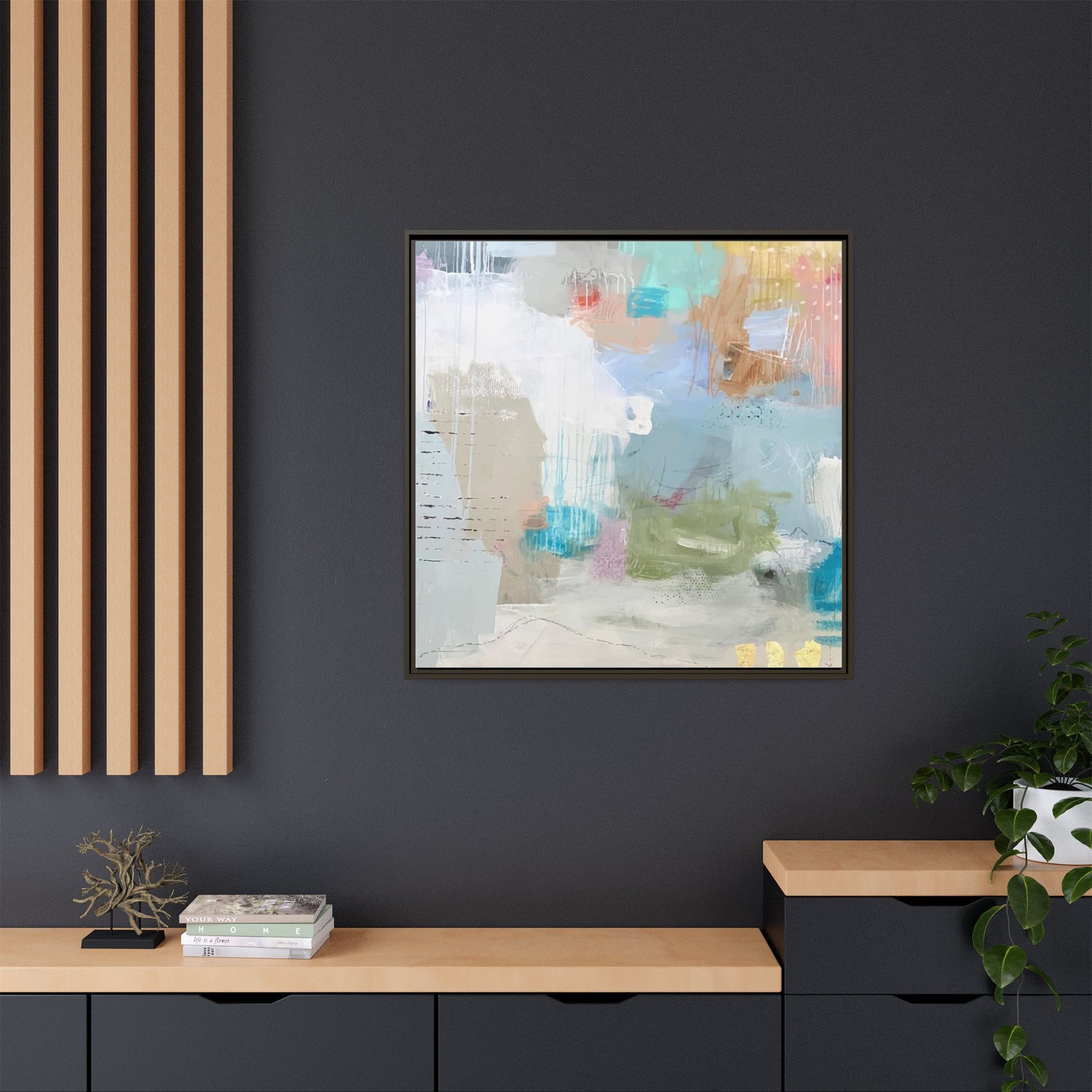 This abstract painting is a delicate composition of soft, ethereal colors including pale blues, greens, yellows, and hints of pink and orange. The artwork features layered brushstrokes and translucent washes that create a dreamy, atmospheric quality with organic shapes and textural elements. Vertical drips and subtle line work add visual interest and movement throughout the piece, giving the impression of a misty, impressionistic landscape or seascape. The color palette is predominantly cool and muted, with gentle blending and overlapping of hues that create a sense of depth and ethereal space. The painting's style suggests a contemporary abstract approach, with a focus on texture, color interaction, and subtle visual nuances.