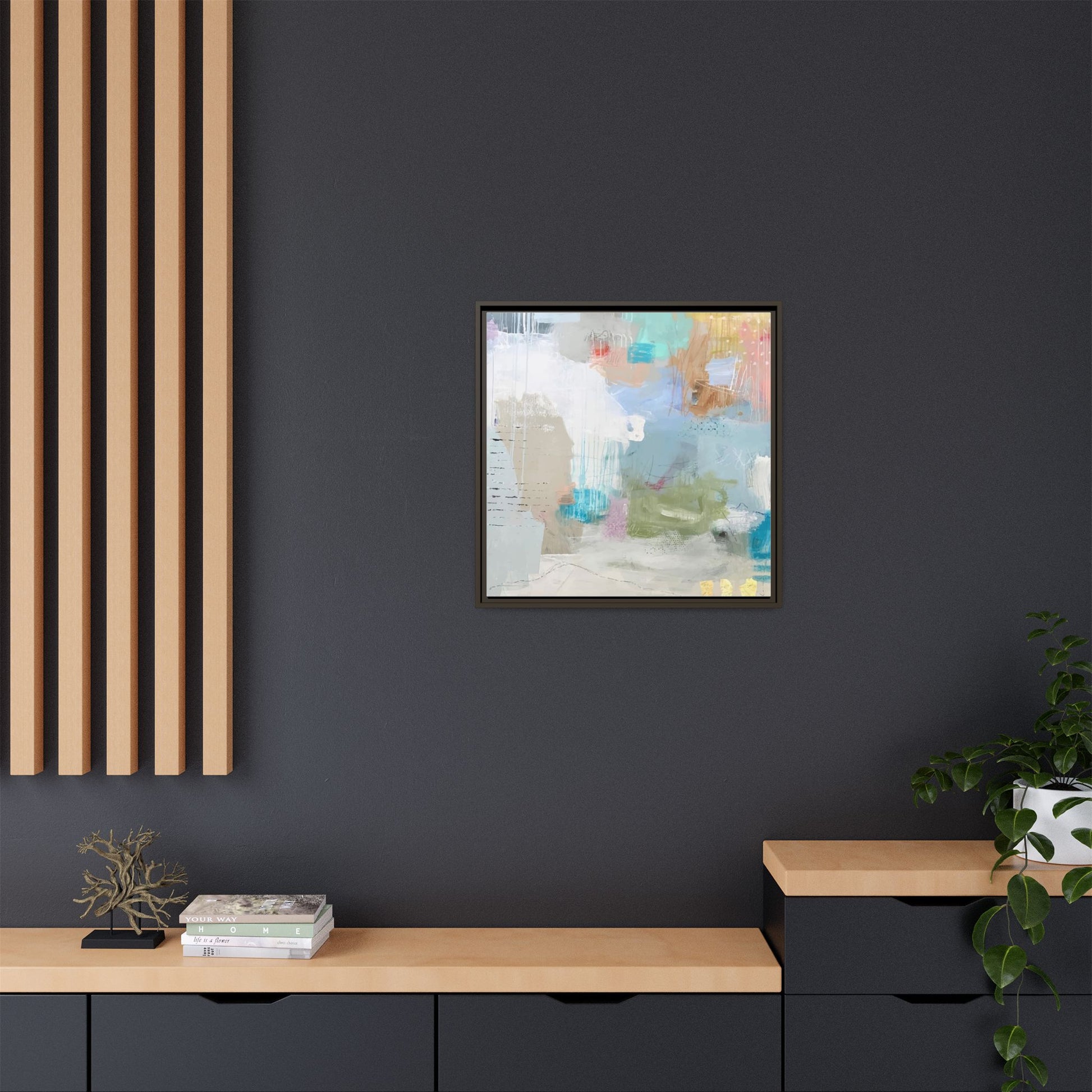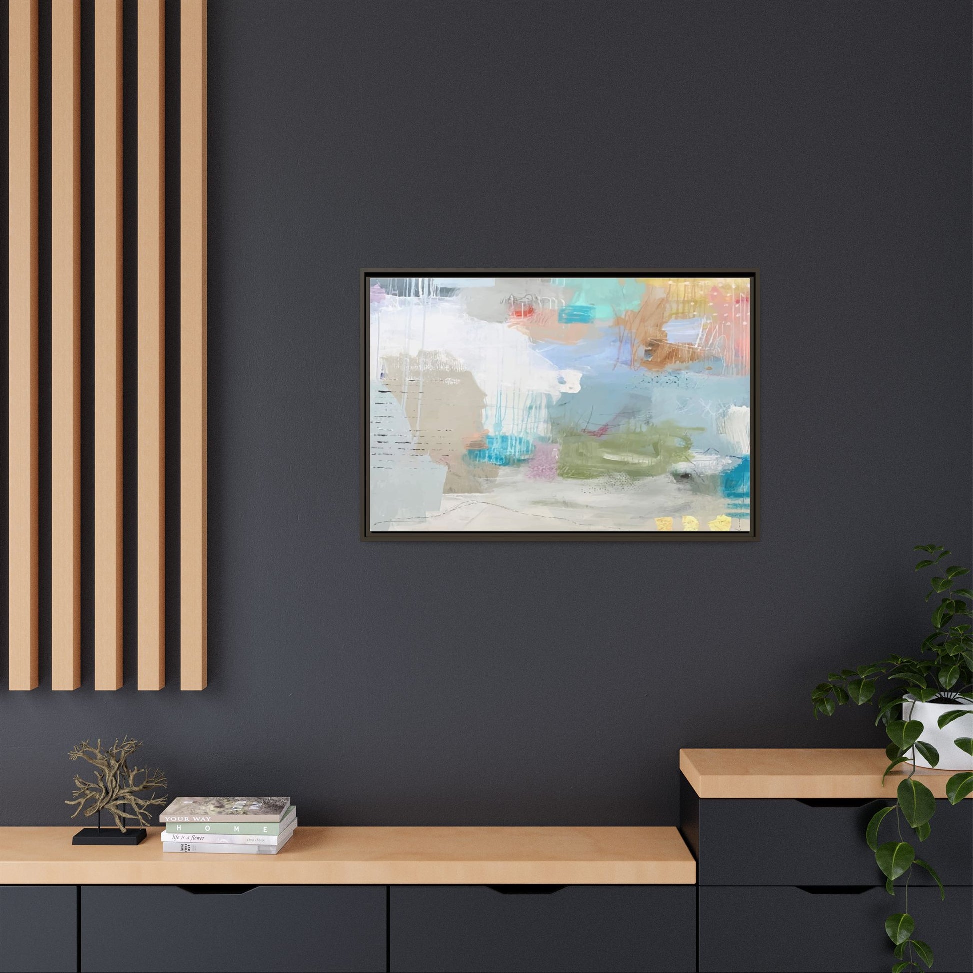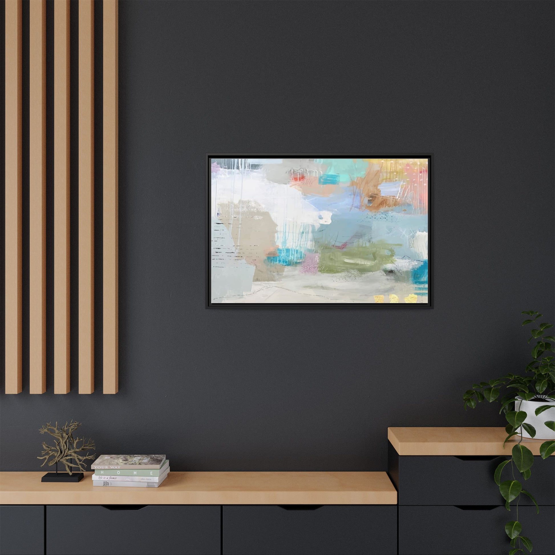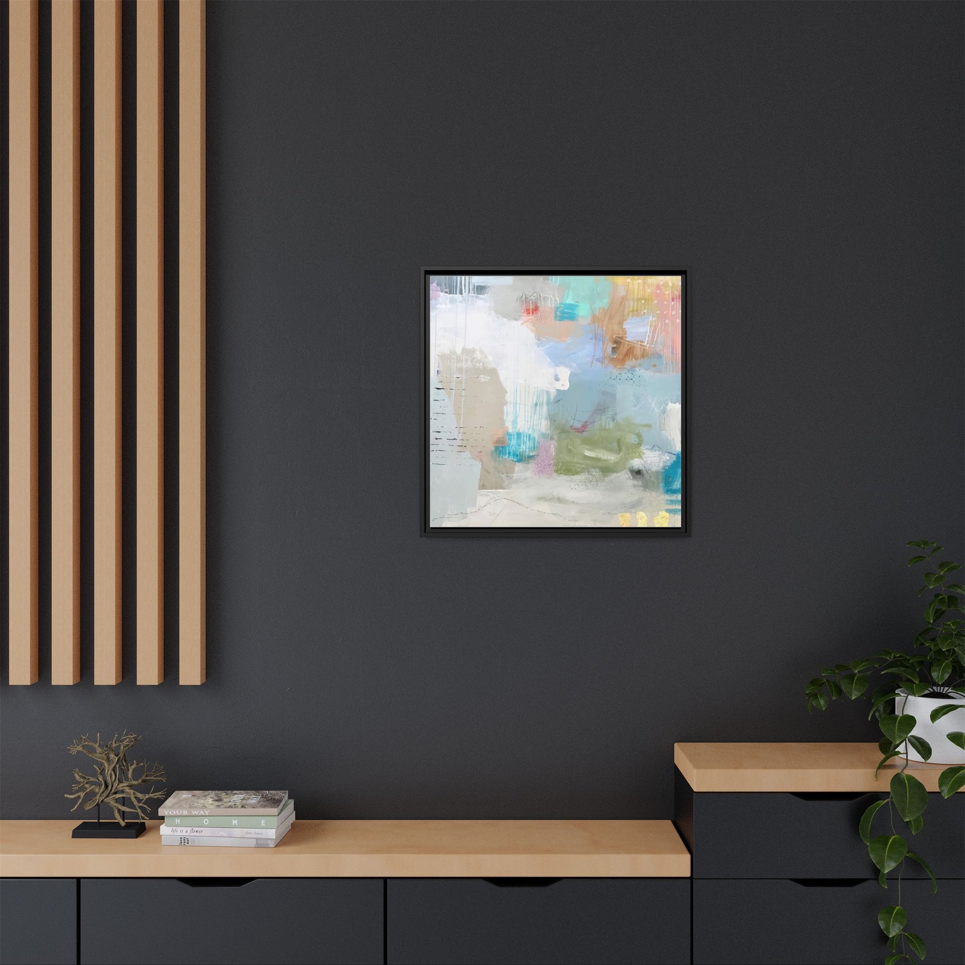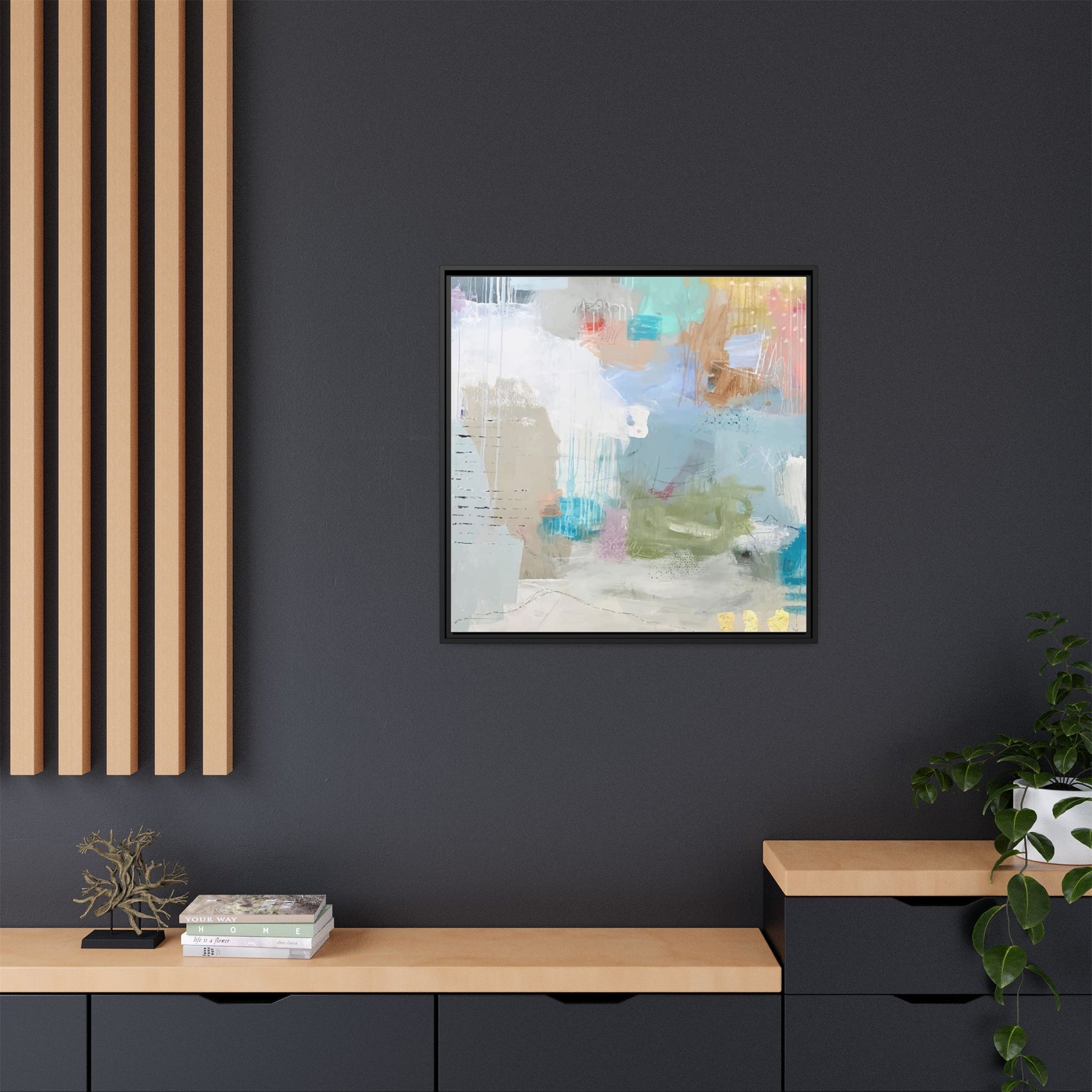 This abstract painting is a delicate composition of soft, ethereal colors including pale blues, greens, yellows, and hints of pink and orange. The artwork features layered brushstrokes and translucent washes that create a dreamy, atmospheric quality with organic shapes and textural elements. Vertical drips and subtle line work add visual interest and movement throughout the piece, giving the impression of a misty, impressionistic landscape or seascape. The color palette is predominantly cool and muted, with gentle blending and overlapping of hues that create a sense of depth and ethereal space. The painting's style suggests a contemporary abstract approach, with a focus on texture, color interaction, and subtle visual nuances.
