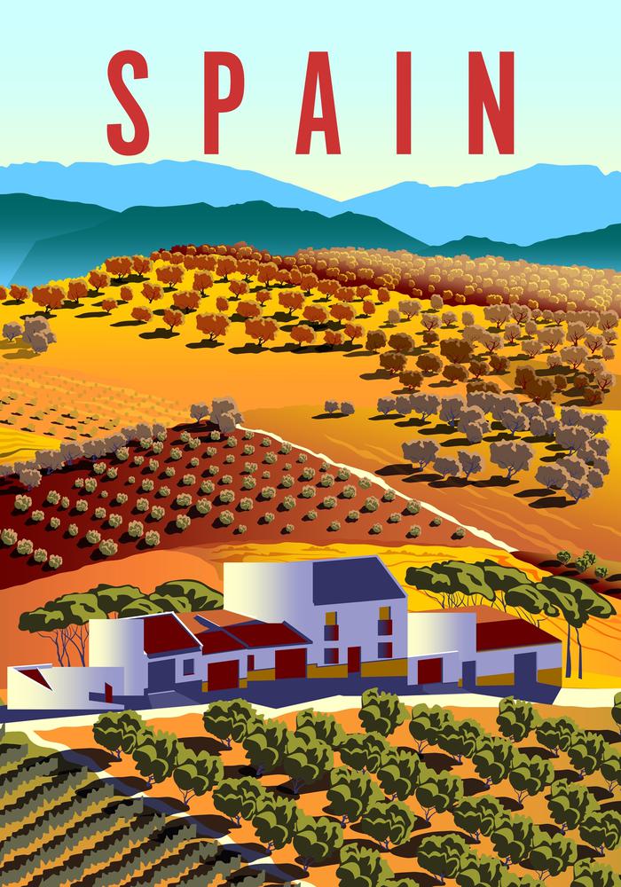 A vivid landscape stretches across undulating hills, capturing the warmth and vibrancy of Spain's countryside with bold colors and geometric shapes.