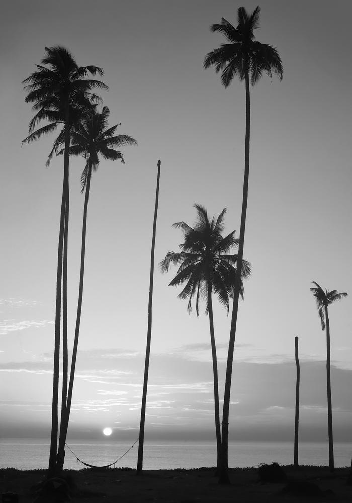 Silhouetted palms stand tall against the tranquil embrace of sunrise, where earth meets sky in quiet unity.
