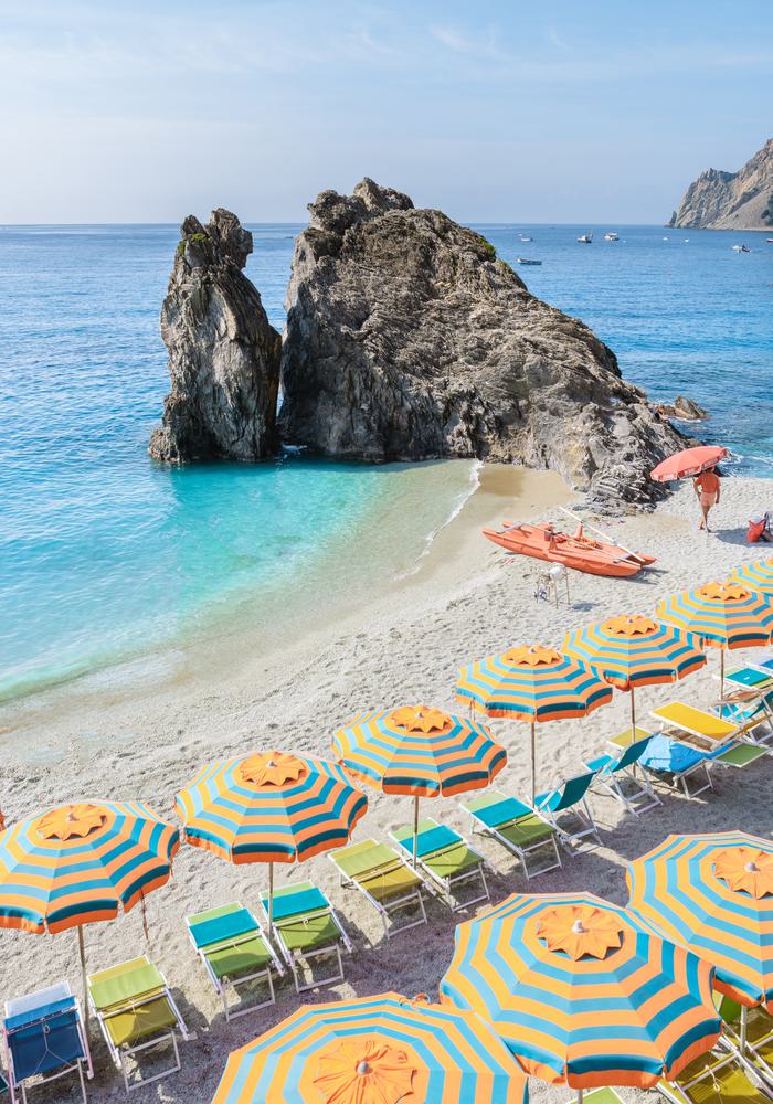 A vivid dance of color where sun-drenched umbrellas meet tranquil waves, inviting a symphony of seaside leisure and natural grandeur.