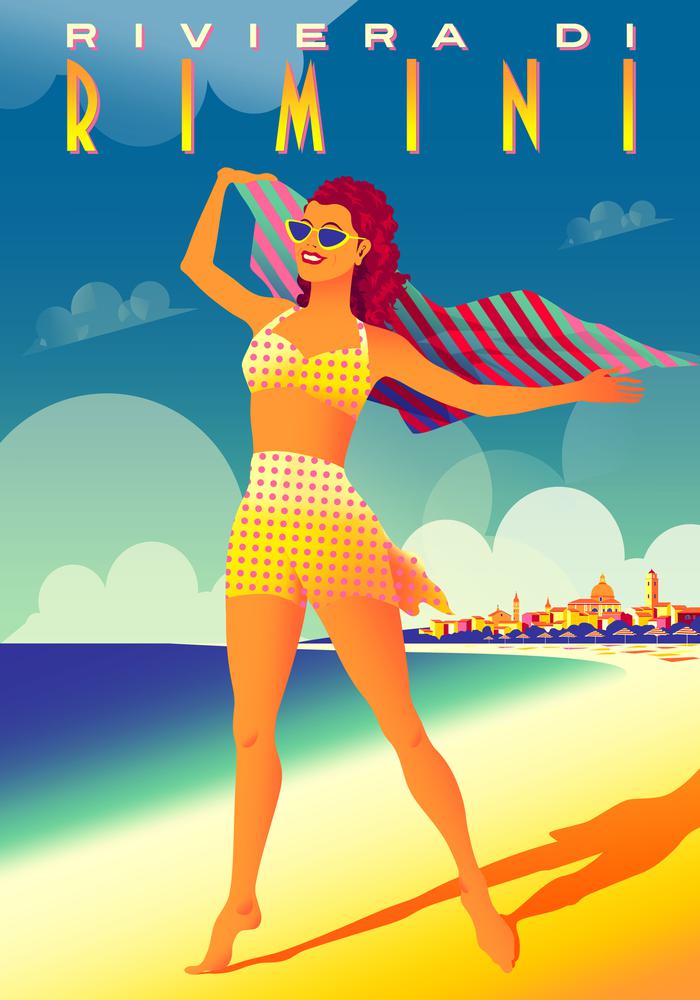 A vibrant celebration of summer, capturing the essence of carefree joy by the seaside. The figure radiates with dynamic energy and timeless style against a bold coastal backdrop.