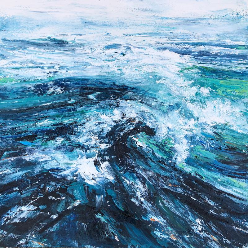 A tumultuous dance of waves, capturing the ocean’s fierce energy and fluid grace, as colors collide in a vivid spectacle.