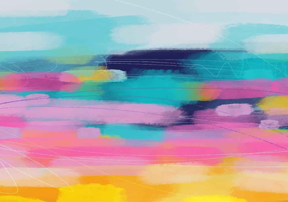 A vibrant dance of color sweeps across the canvas, with layers of turquoise, pink, and yellow merging into a dreamlike horizon. Subtle lines create a sense of motion and fluidity.