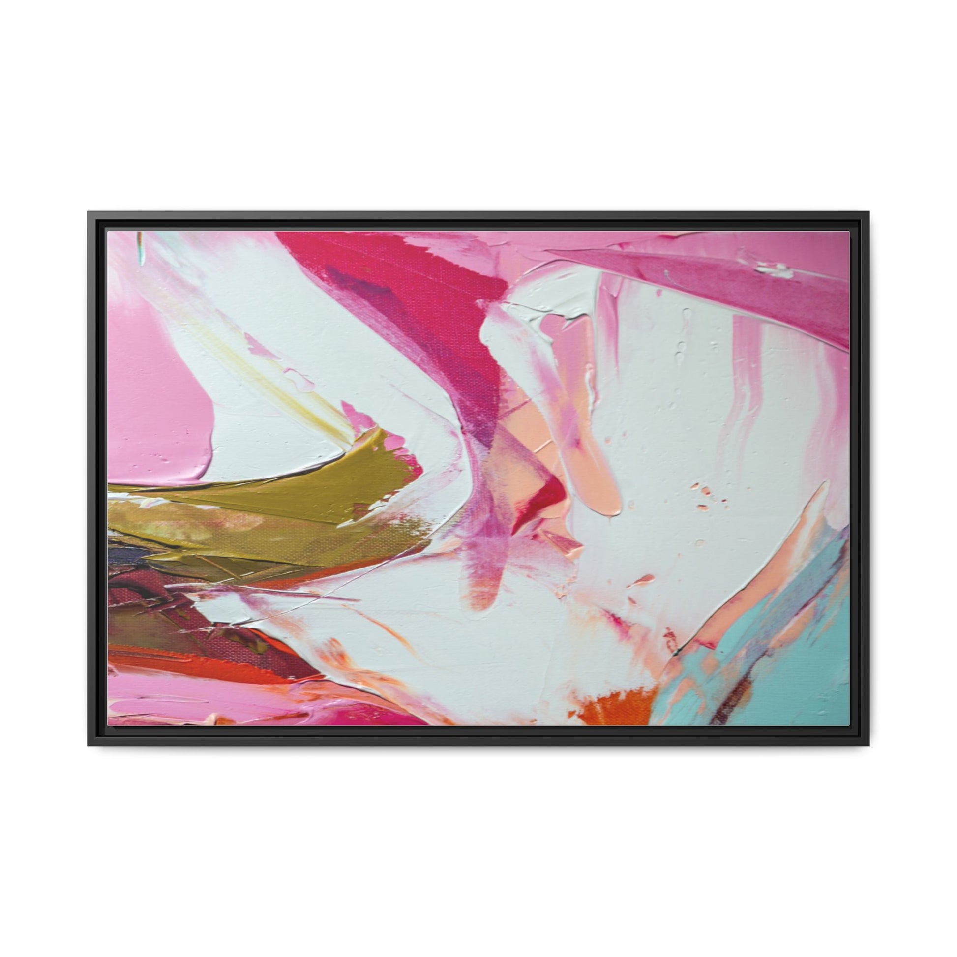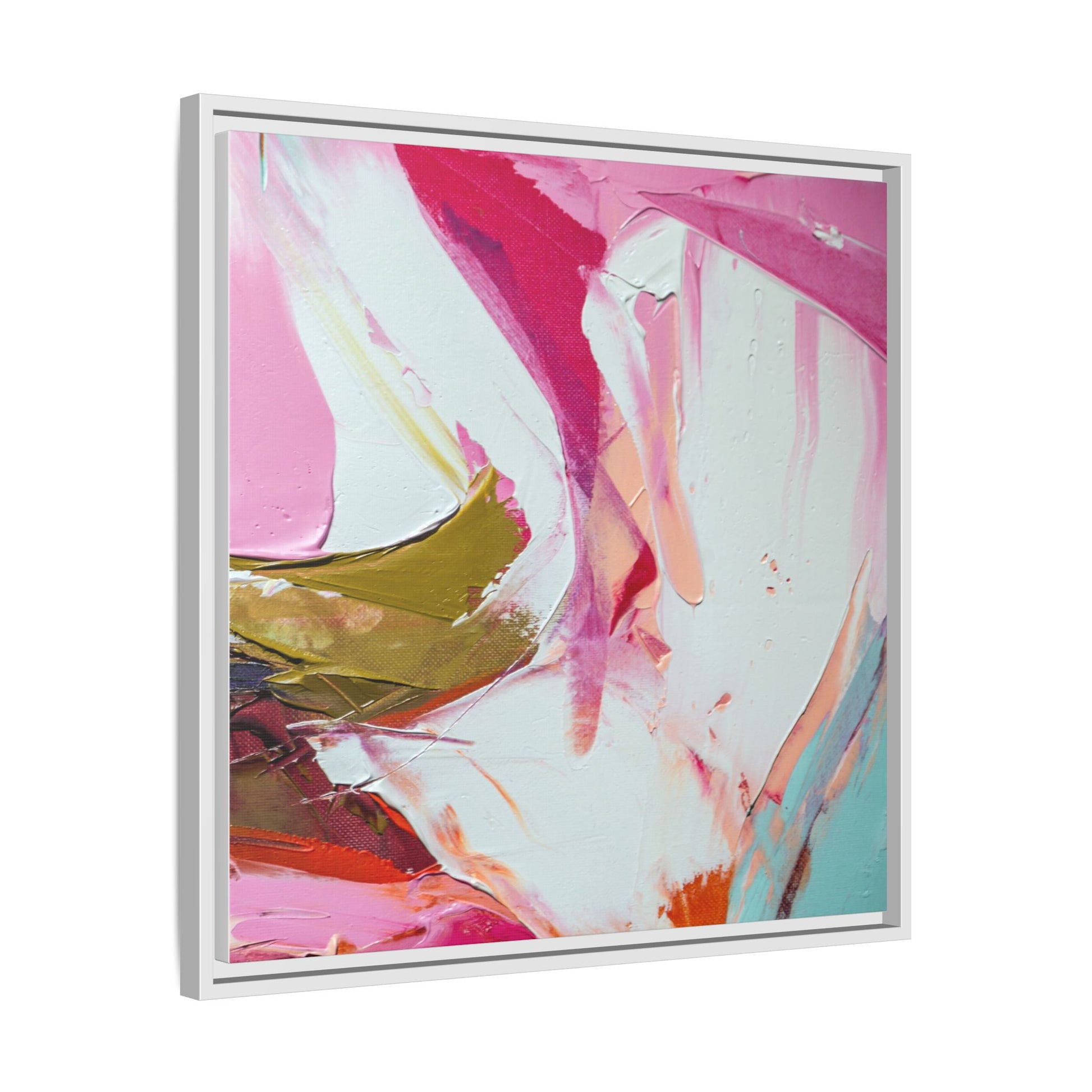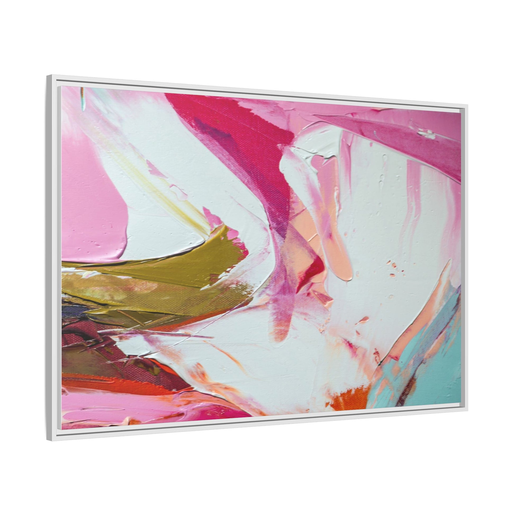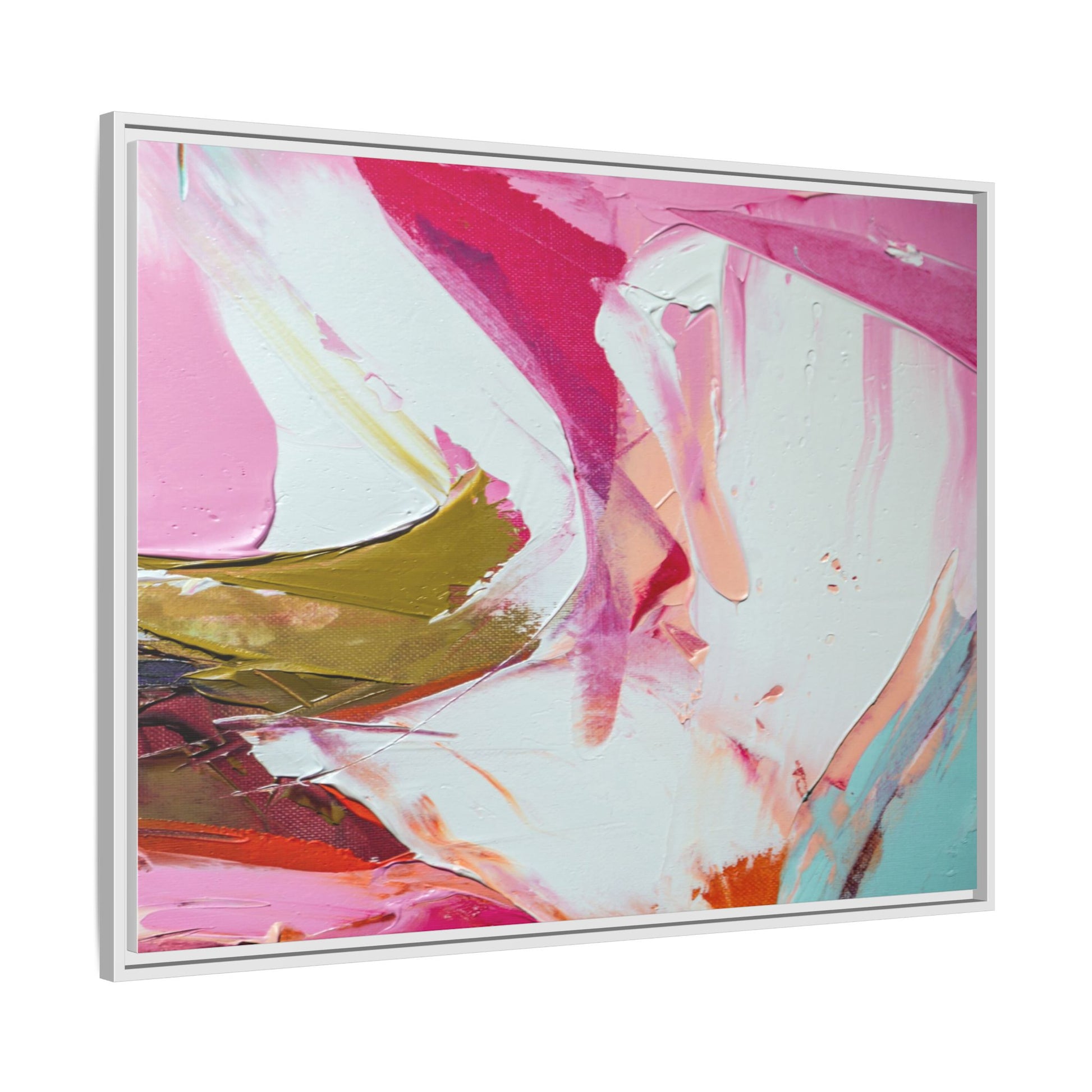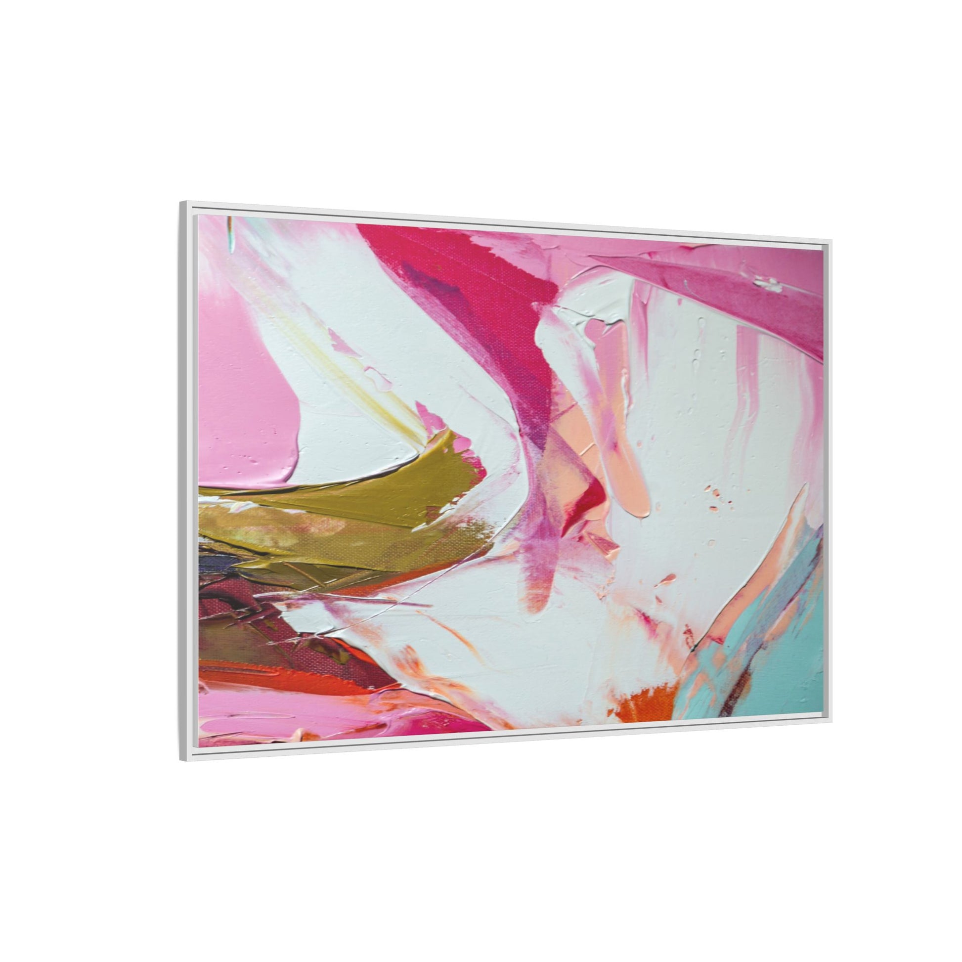 This vibrant abstract painting showcases a dynamic blend of soft and bold colors, primarily featuring shades of pink, white, magenta, olive green, and touches of turquoise and orange. The artwork appears to be created with acrylic or oil paints, displaying thick, expressive brushstrokes and a fluid, organic composition that suggests movement and energy. Textured layers of paint create depth and dimension, with some areas showing visible canvas texture and others displaying smooth, blended transitions between colors. The painting's style evokes a sense of spontaneity and emotional expression, with sweeping curves and intersecting color fields that draw the viewer's eye across the canvas. The overall effect is both harmonious and slightly chaotic, creating a visually captivating piece that invites personal interpretation and emotional response.
