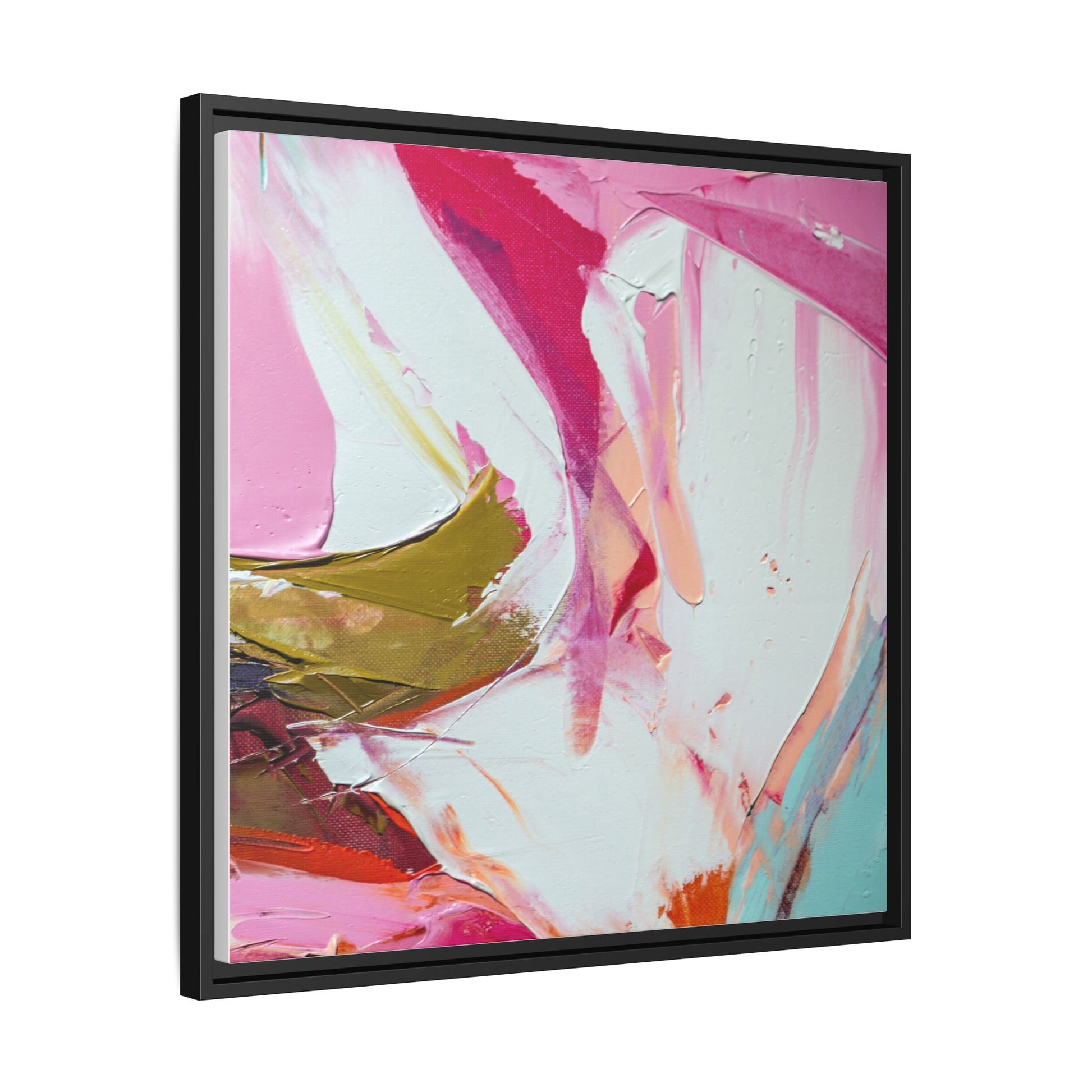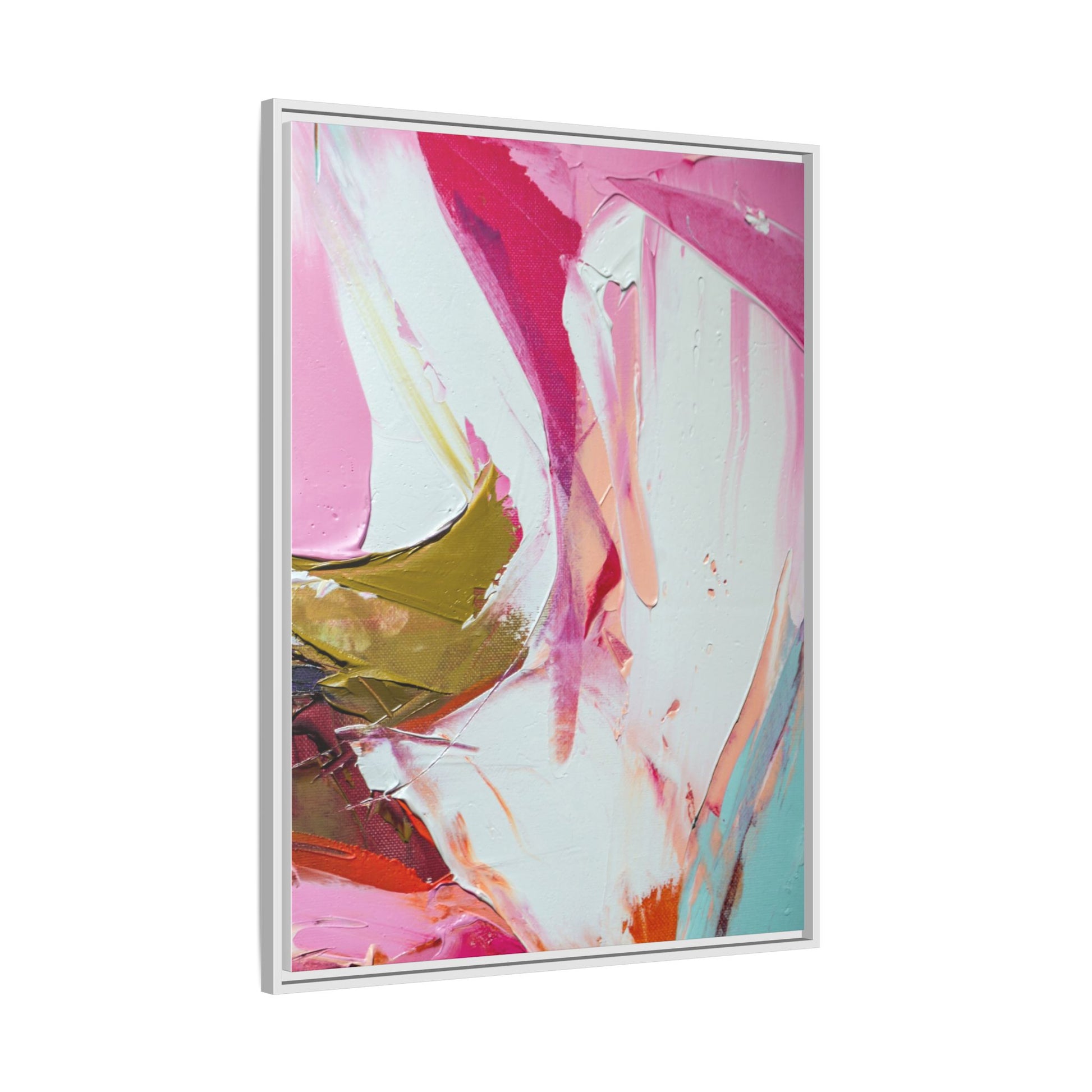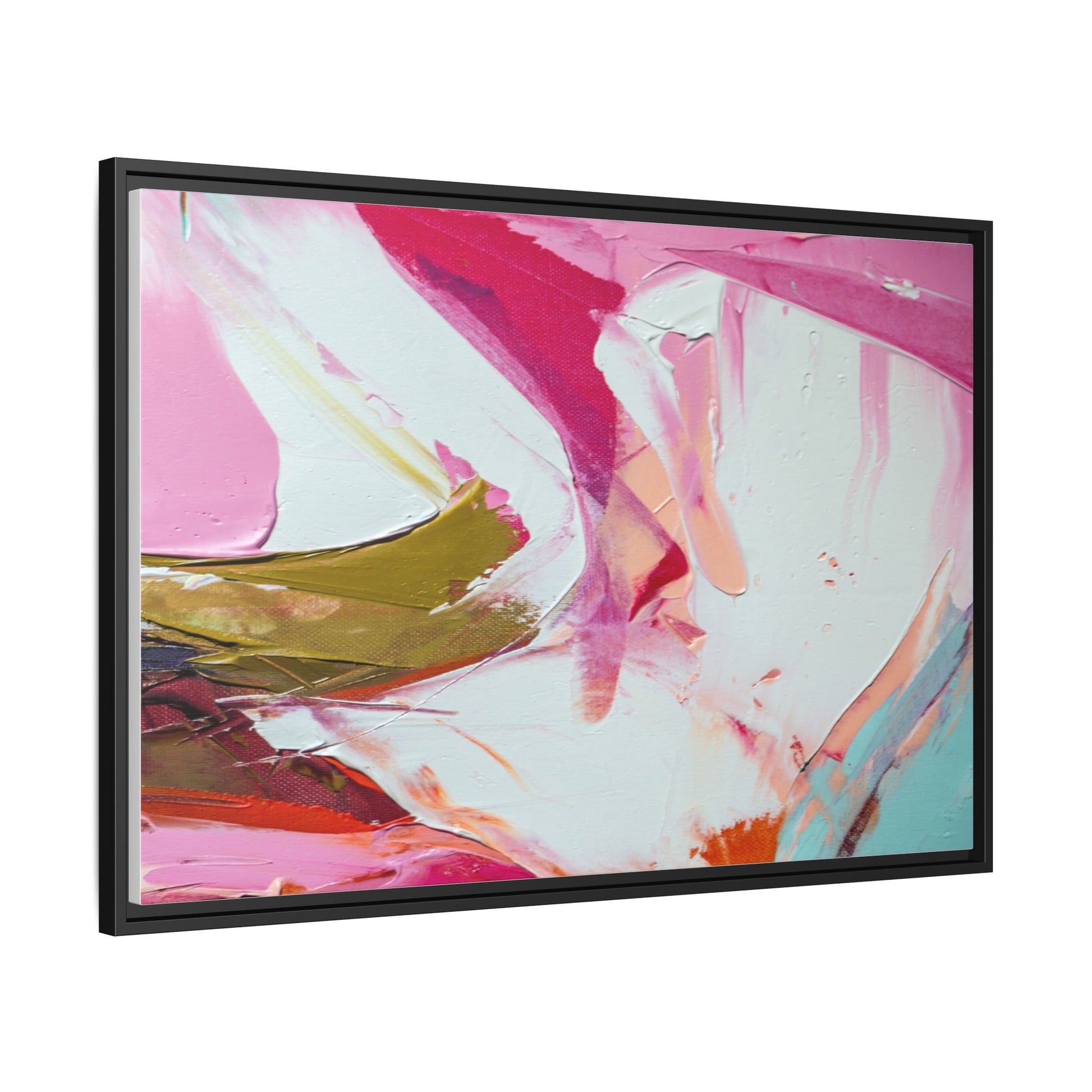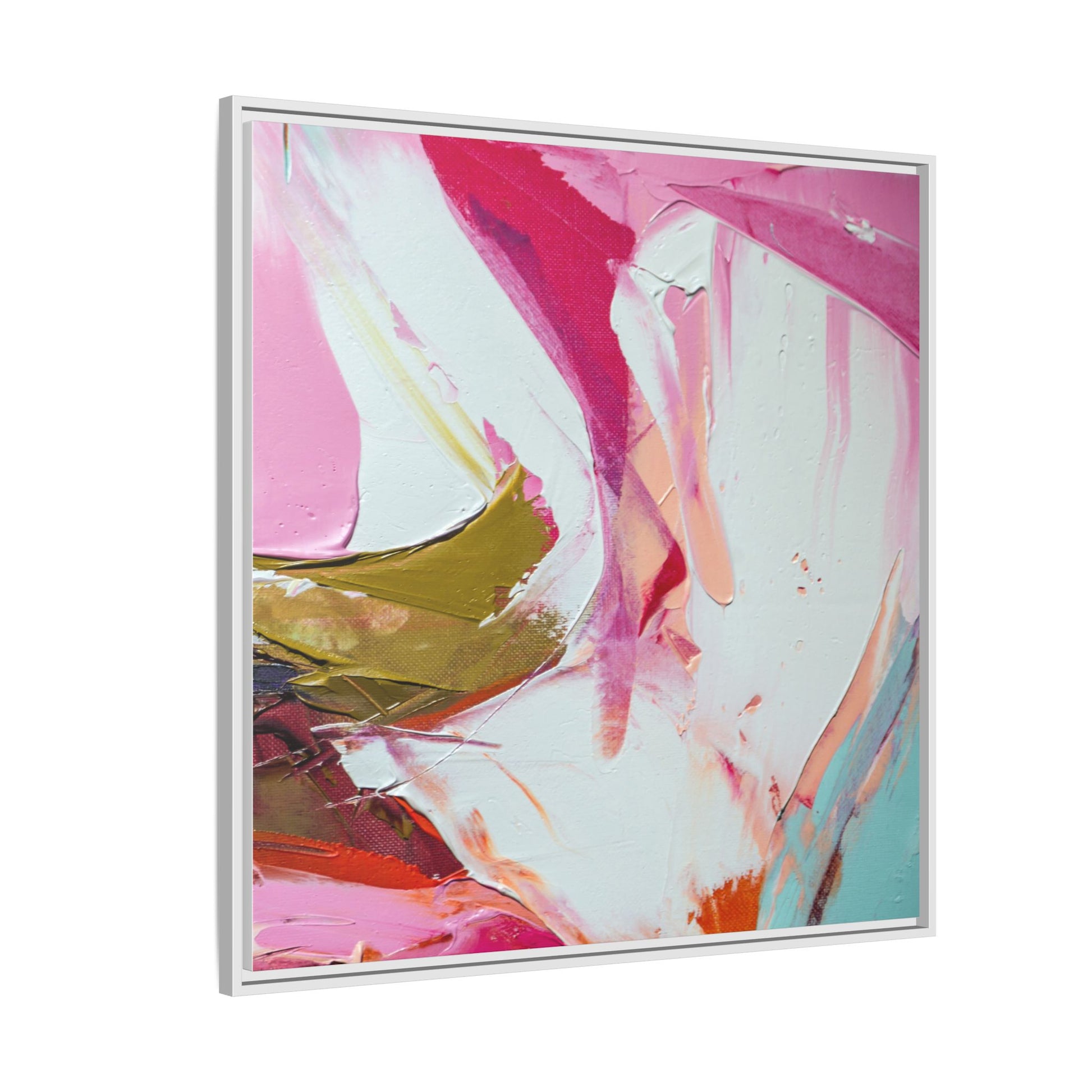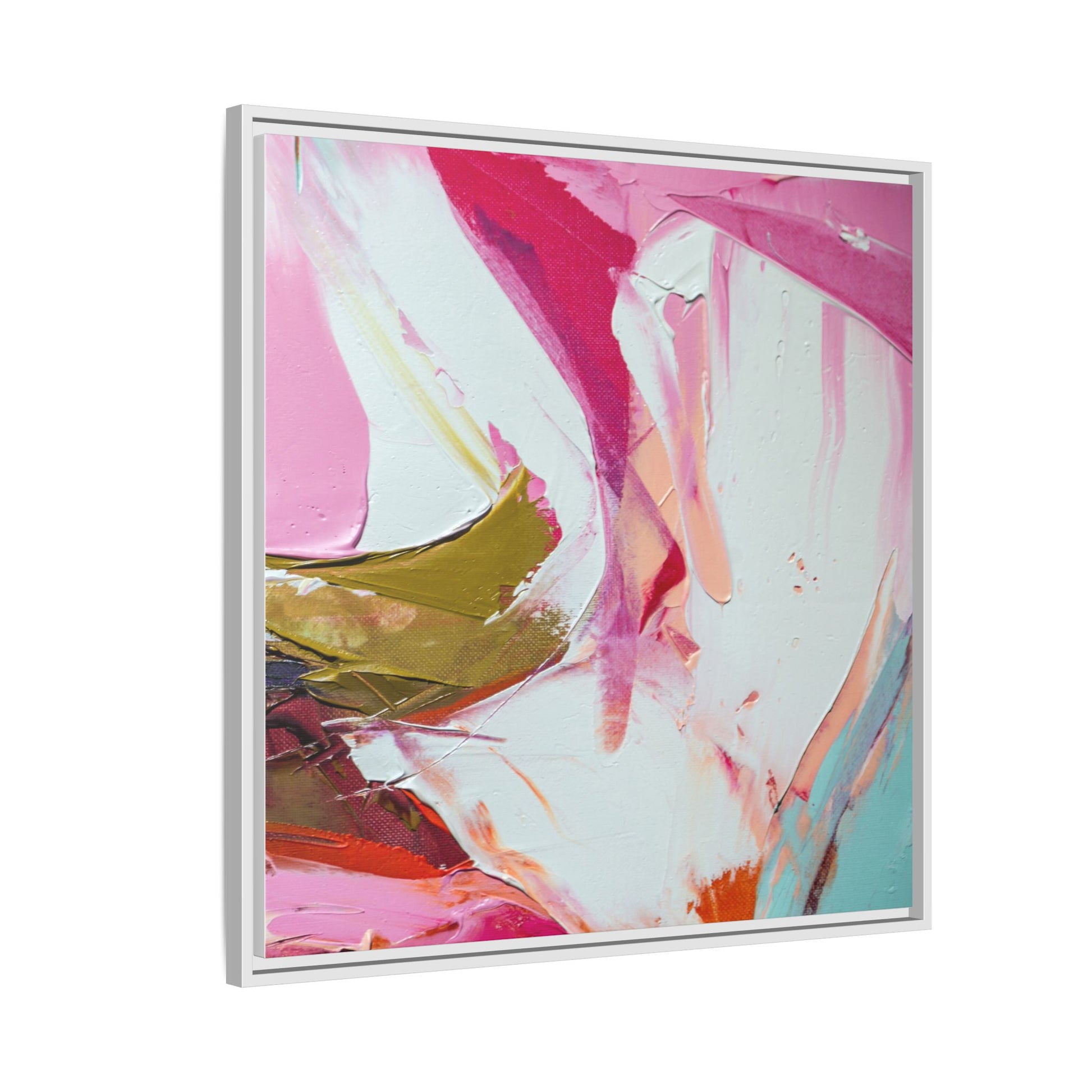 This vibrant abstract painting showcases a dynamic blend of soft and bold colors, primarily featuring shades of pink, white, magenta, olive green, and touches of turquoise and orange. The artwork appears to be created with acrylic or oil paints, displaying thick, expressive brushstrokes and a fluid, organic composition that suggests movement and energy. Textured layers of paint create depth and dimension, with some areas showing visible canvas texture and others displaying smooth, blended transitions between colors. The painting's style evokes a sense of spontaneity and emotional expression, with sweeping curves and intersecting color fields that draw the viewer's eye across the canvas. The overall effect is both harmonious and slightly chaotic, creating a visually captivating piece that invites personal interpretation and emotional response.