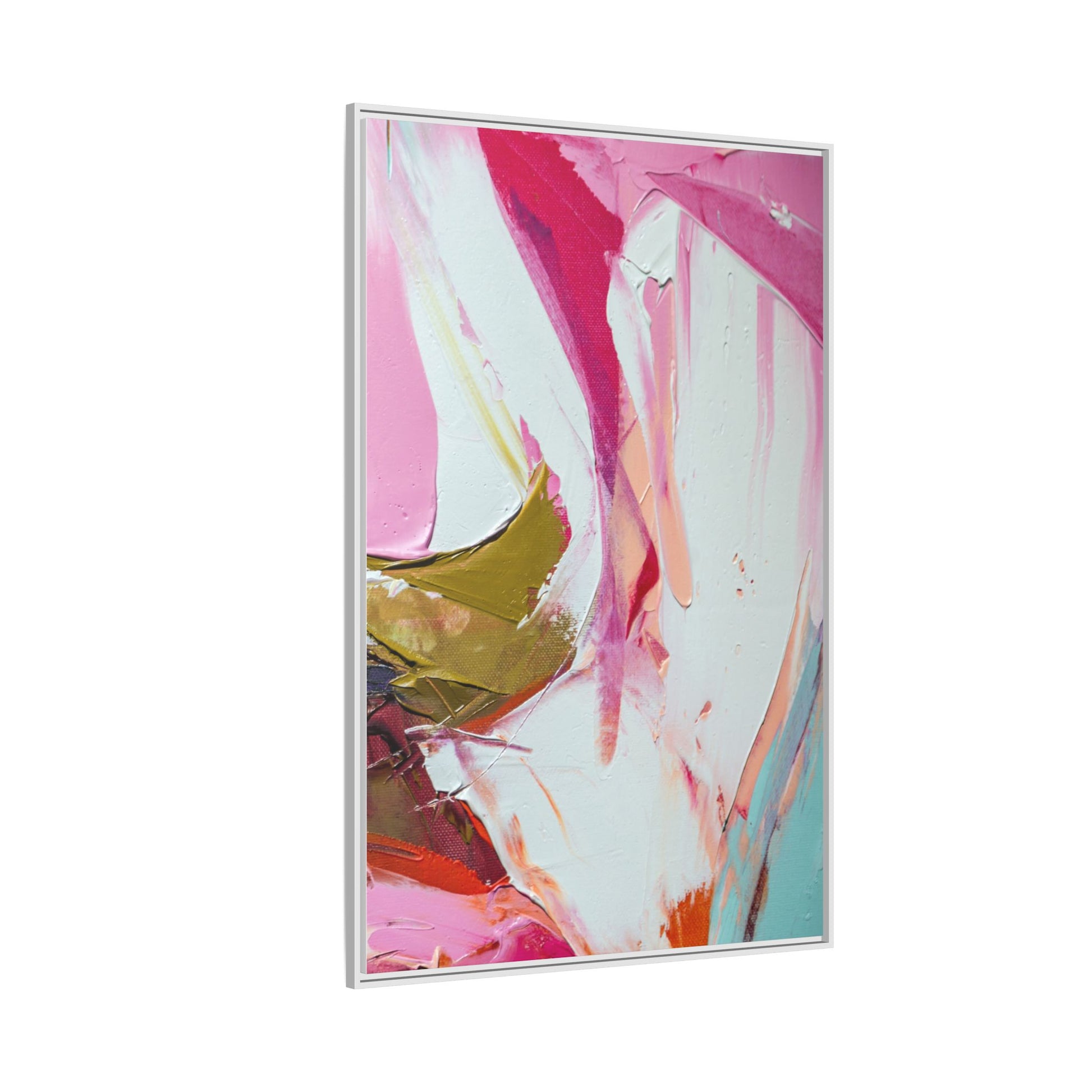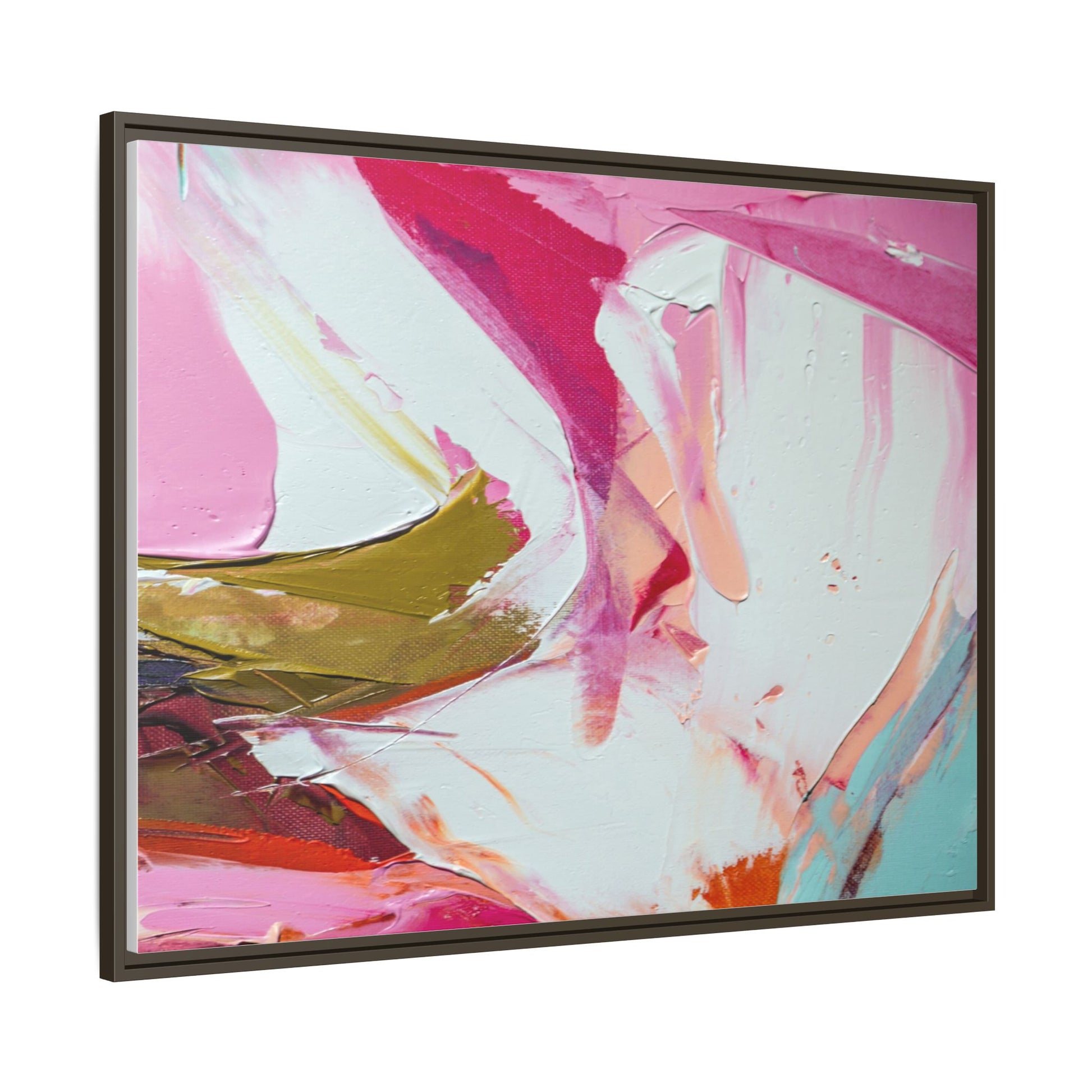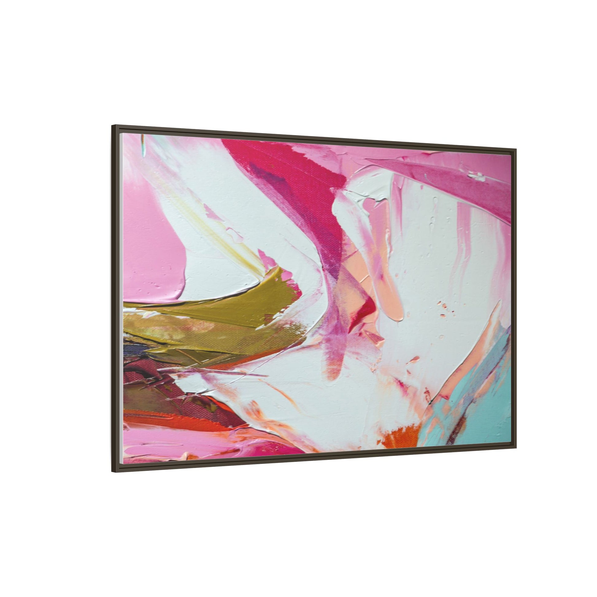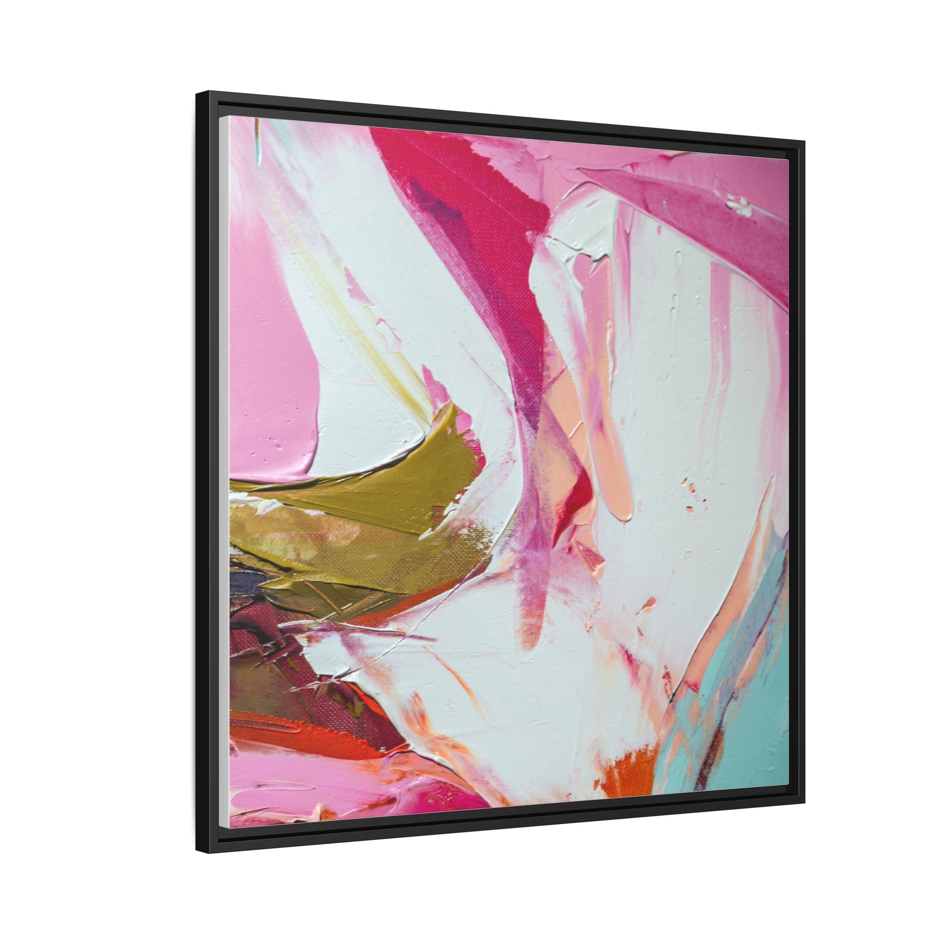 This vibrant abstract painting showcases a dynamic blend of soft and bold colors, primarily featuring shades of pink, white, magenta, olive green, and touches of turquoise and orange. The artwork appears to be created with acrylic or oil paints, displaying thick, expressive brushstrokes and a fluid, organic composition that suggests movement and energy. Textured layers of paint create depth and dimension, with some areas showing visible canvas texture and others displaying smooth, blended transitions between colors. The painting's style evokes a sense of spontaneity and emotional expression, with sweeping curves and intersecting color fields that draw the viewer's eye across the canvas. The overall effect is both harmonious and slightly chaotic, creating a visually captivating piece that invites personal interpretation and emotional response.