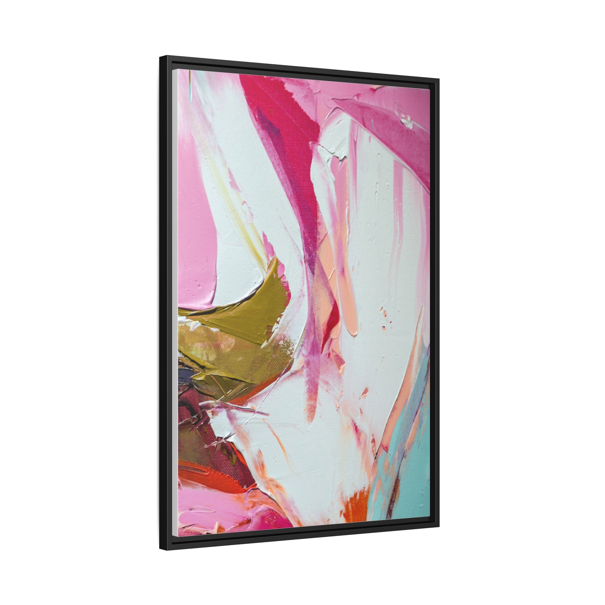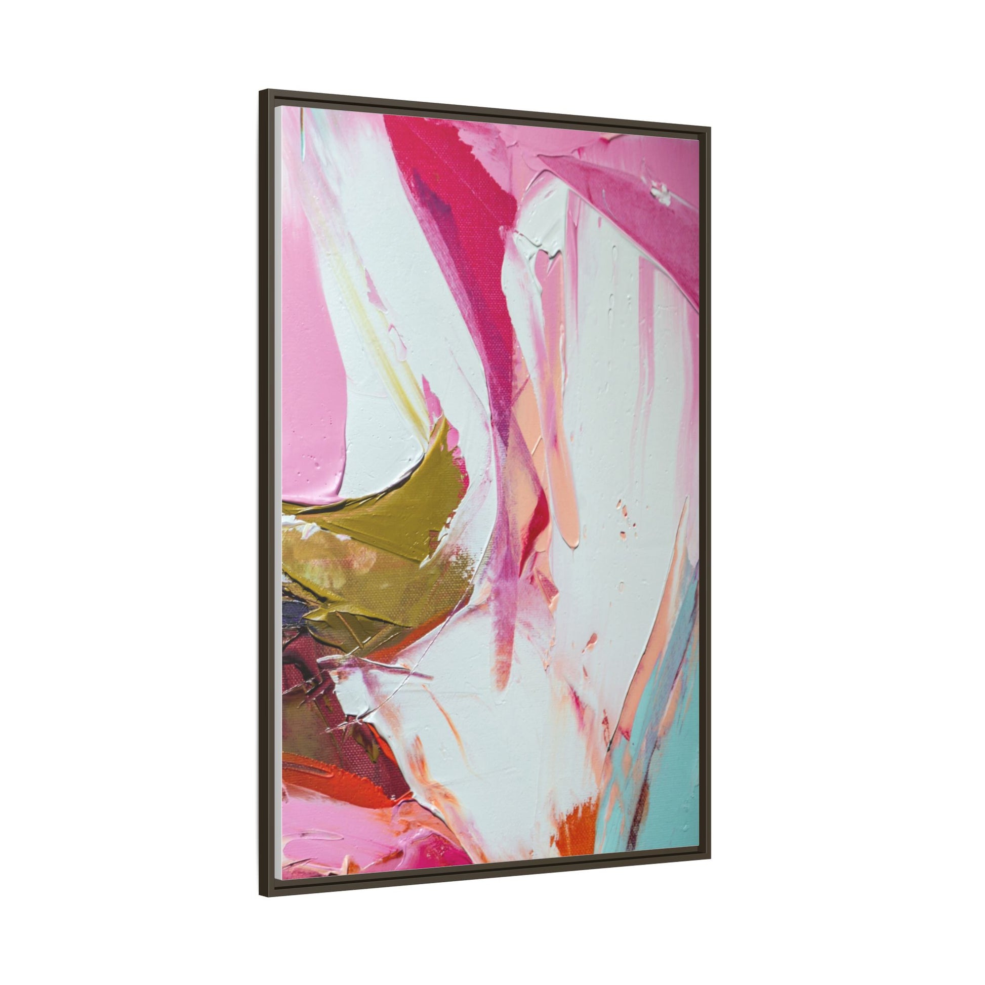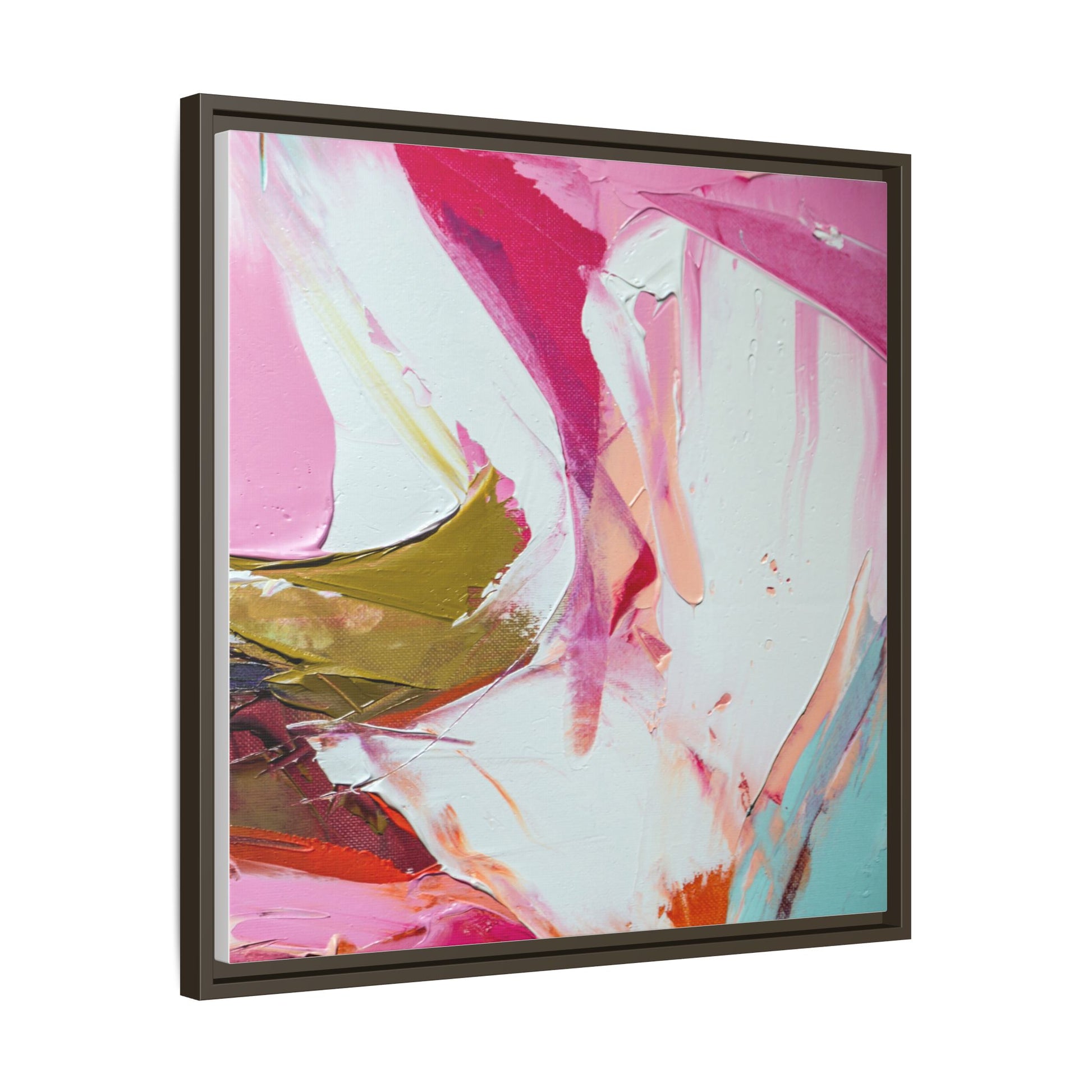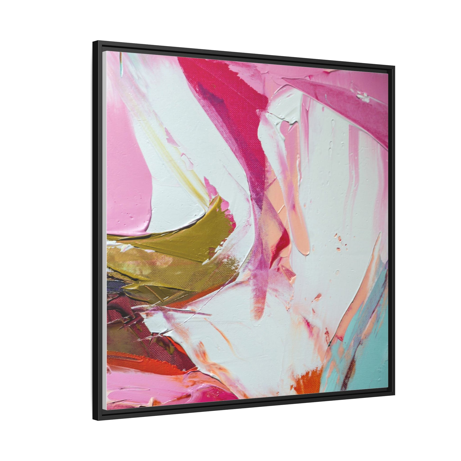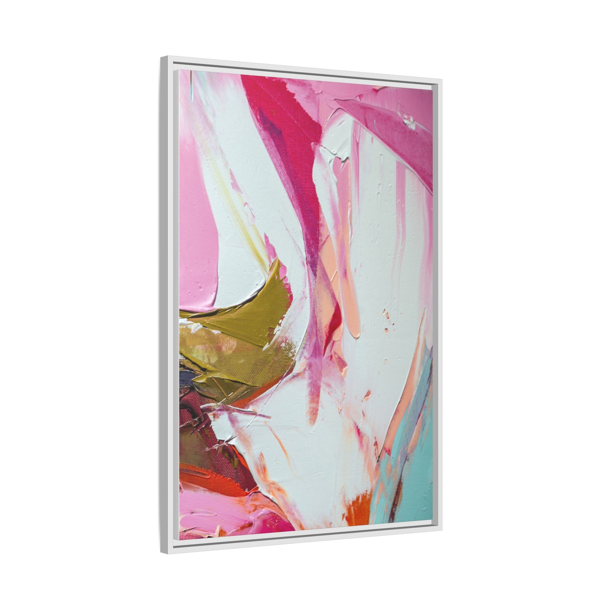 This vibrant abstract painting showcases a dynamic blend of soft and bold colors, primarily featuring shades of pink, white, magenta, olive green, and touches of turquoise and orange. The artwork appears to be created with acrylic or oil paints, displaying thick, expressive brushstrokes and a fluid, organic composition that suggests movement and energy. Textured layers of paint create depth and dimension, with some areas showing visible canvas texture and others displaying smooth, blended transitions between colors. The painting's style evokes a sense of spontaneity and emotional expression, with sweeping curves and intersecting color fields that draw the viewer's eye across the canvas. The overall effect is both harmonious and slightly chaotic, creating a visually captivating piece that invites personal interpretation and emotional response.