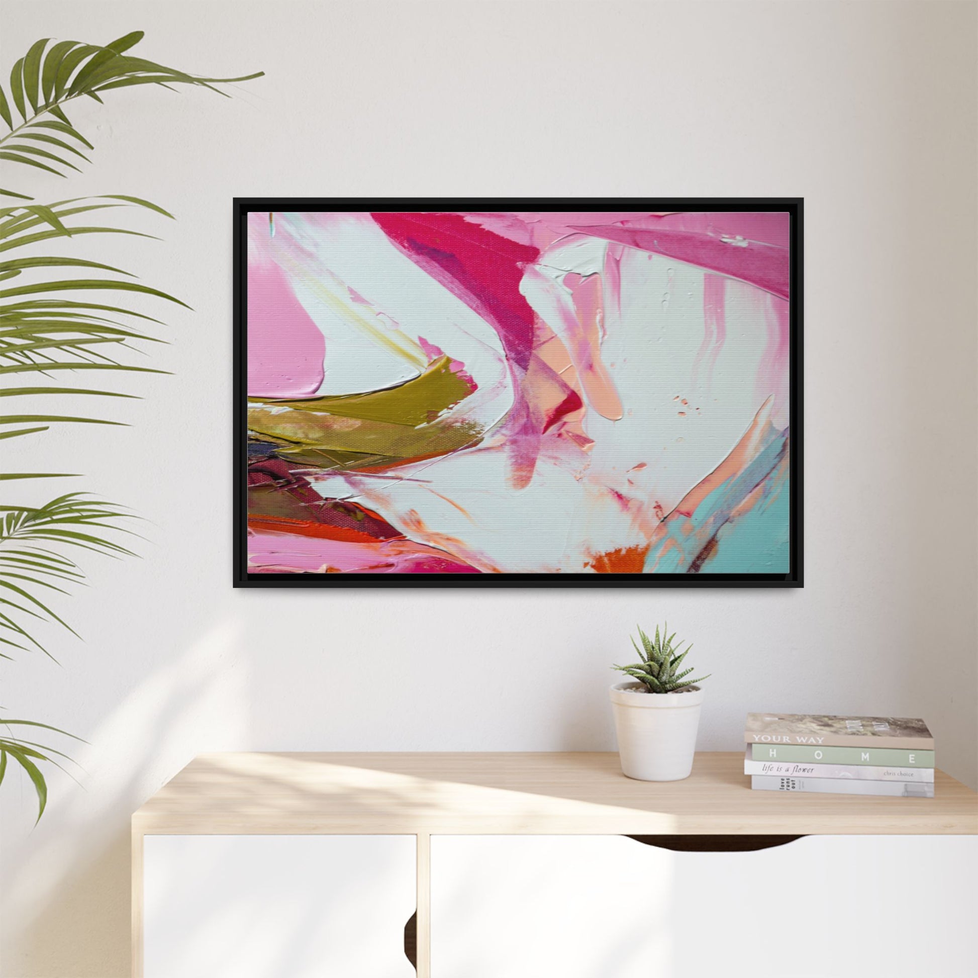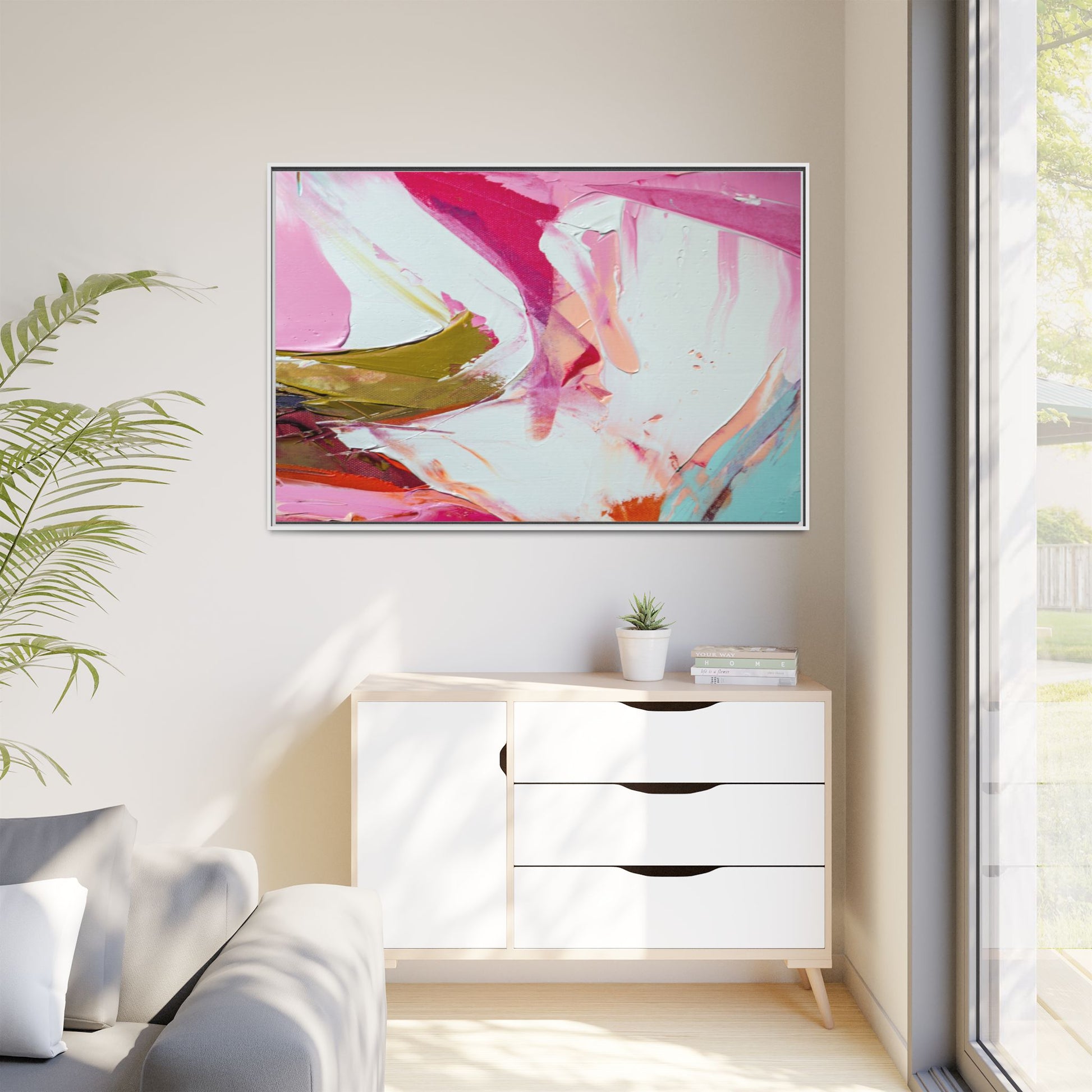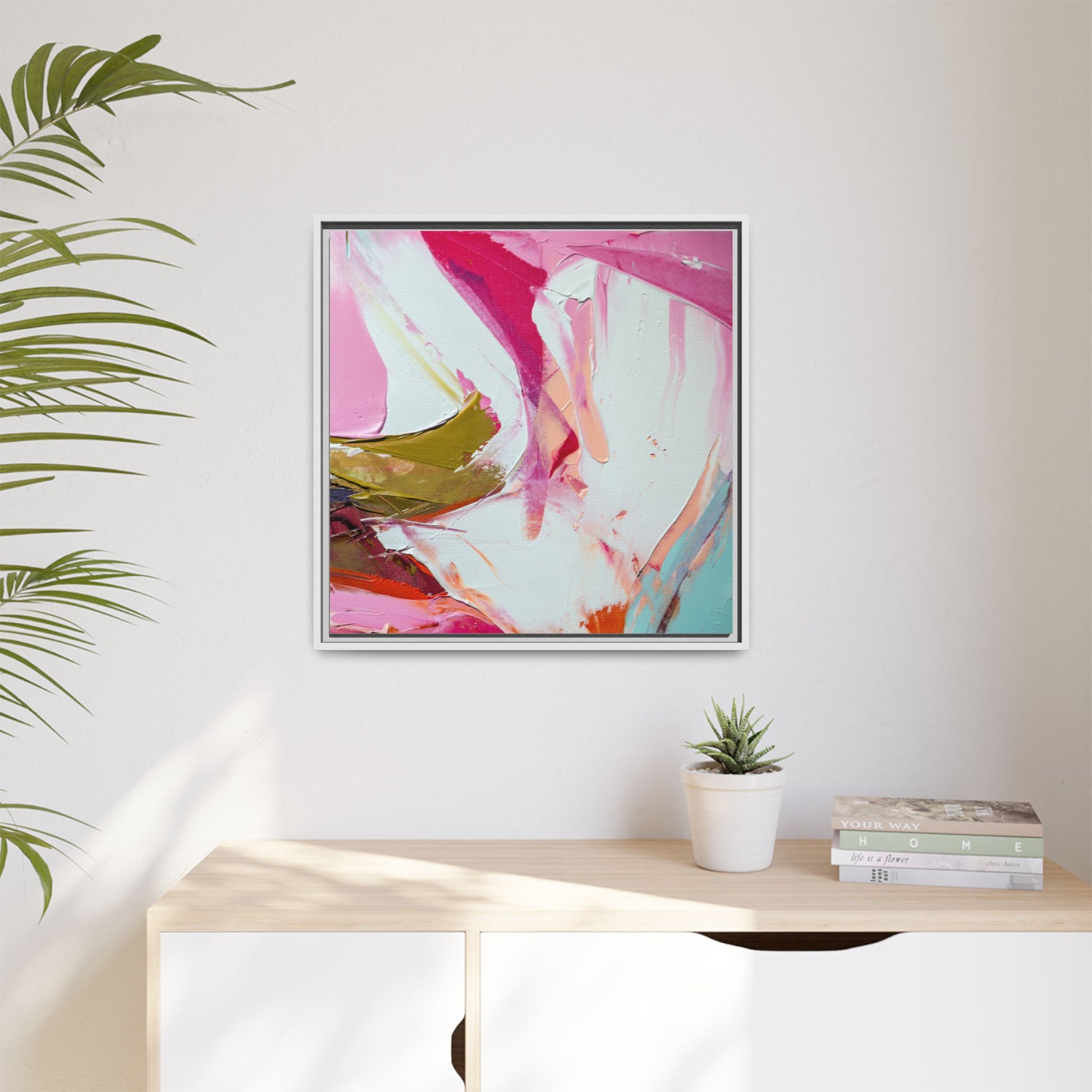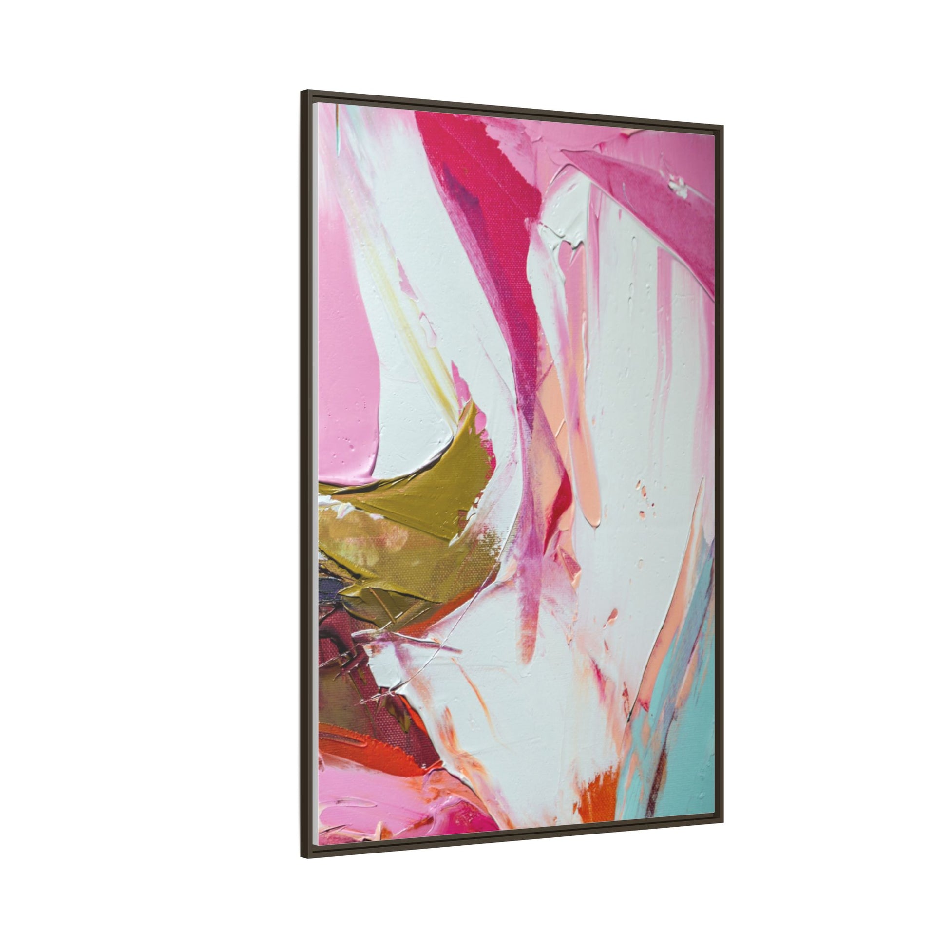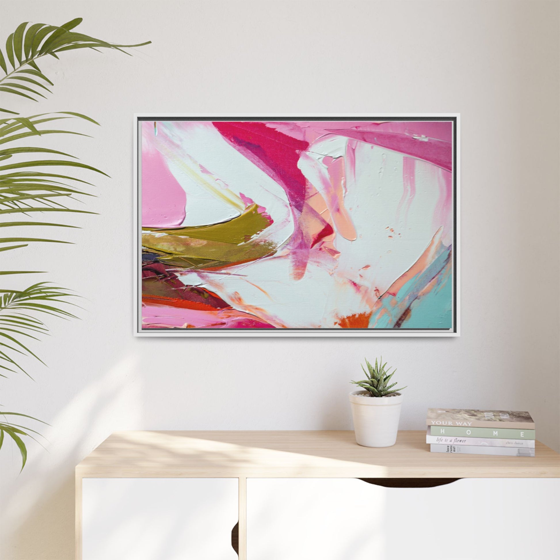 This vibrant abstract painting showcases a dynamic blend of soft and bold colors, primarily featuring shades of pink, white, magenta, olive green, and touches of turquoise and orange. The artwork appears to be created with acrylic or oil paints, displaying thick, expressive brushstrokes and a fluid, organic composition that suggests movement and energy. Textured layers of paint create depth and dimension, with some areas showing visible canvas texture and others displaying smooth, blended transitions between colors. The painting's style evokes a sense of spontaneity and emotional expression, with sweeping curves and intersecting color fields that draw the viewer's eye across the canvas. The overall effect is both harmonious and slightly chaotic, creating a visually captivating piece that invites personal interpretation and emotional response.