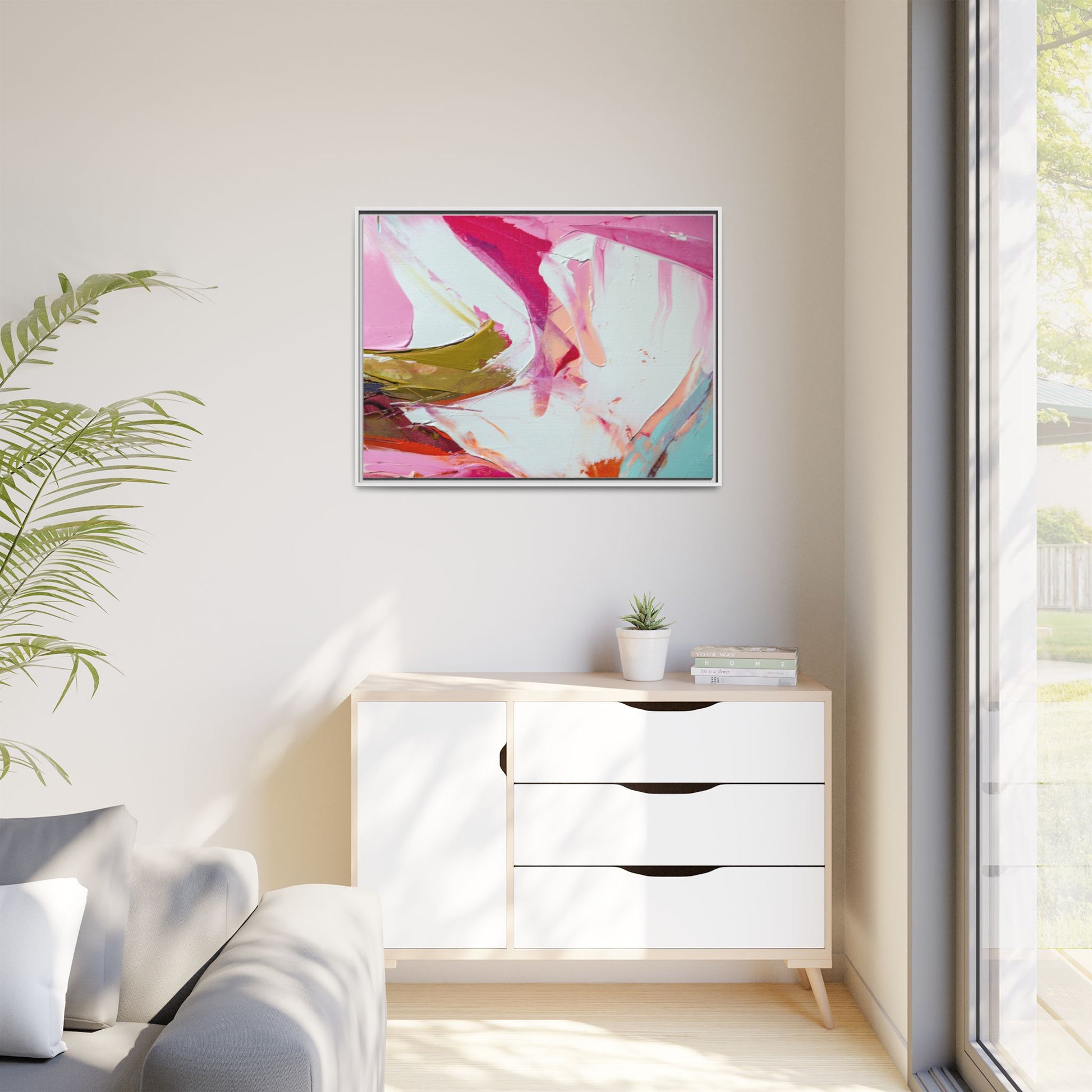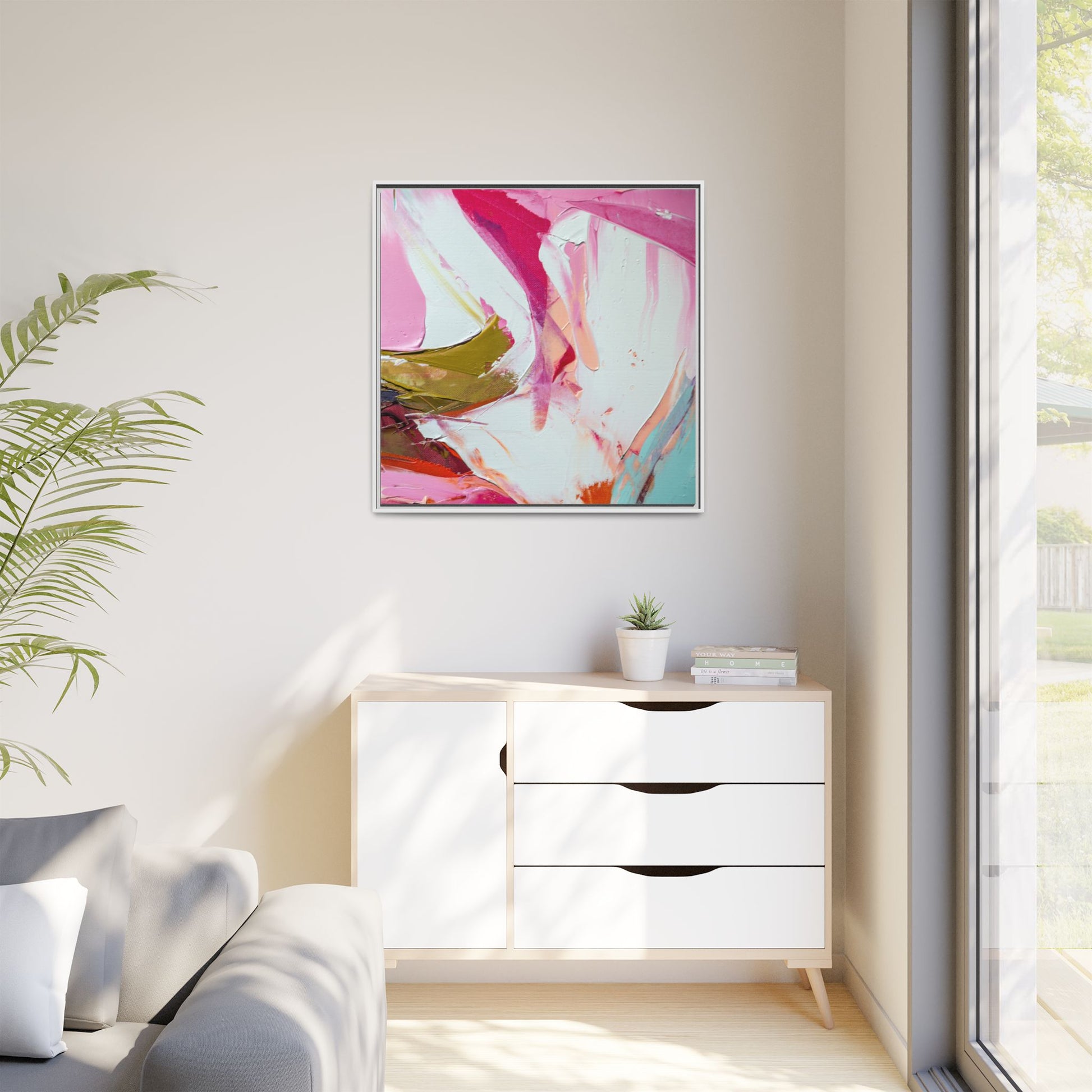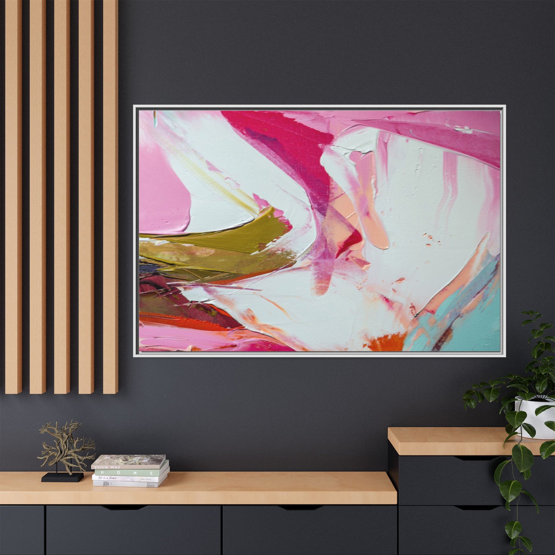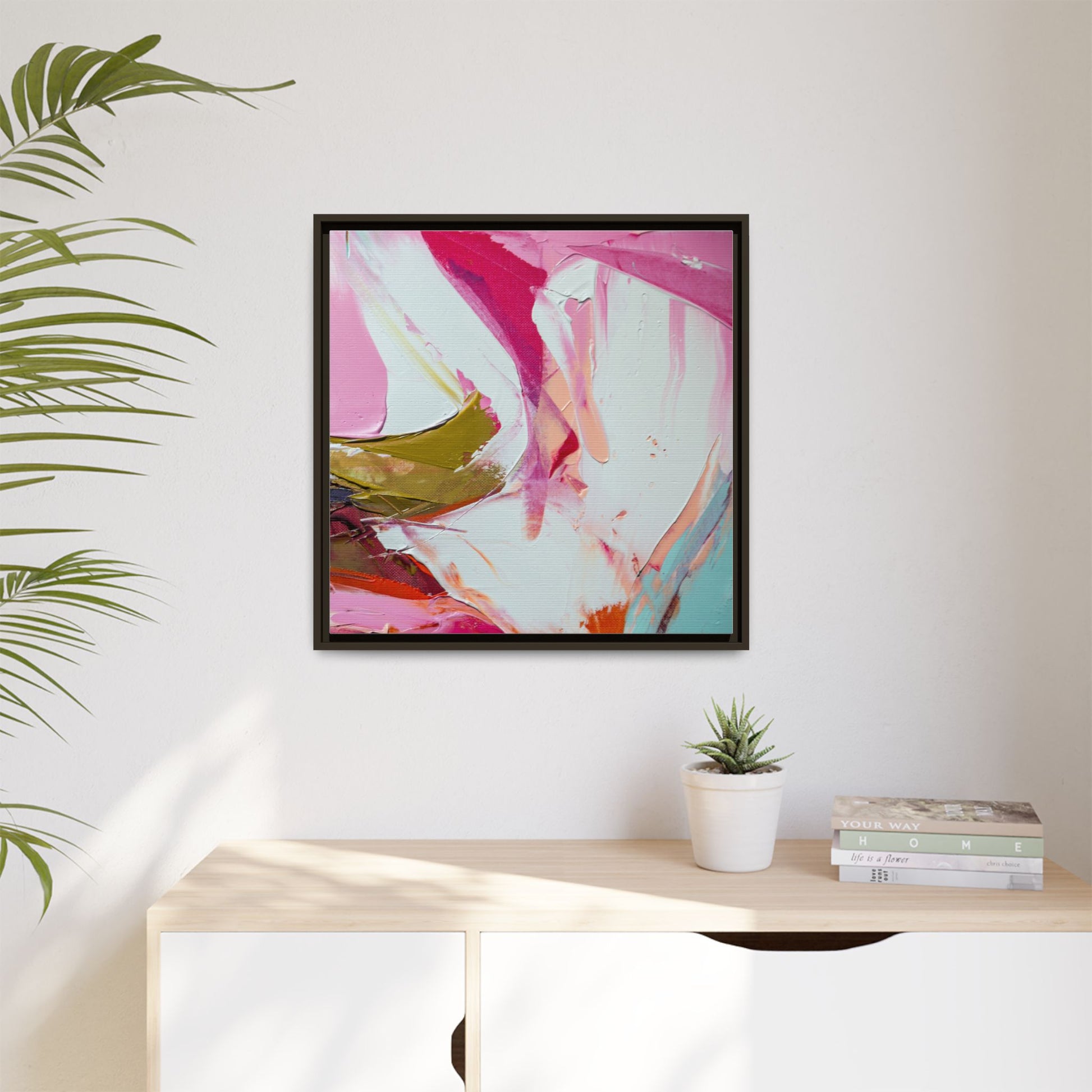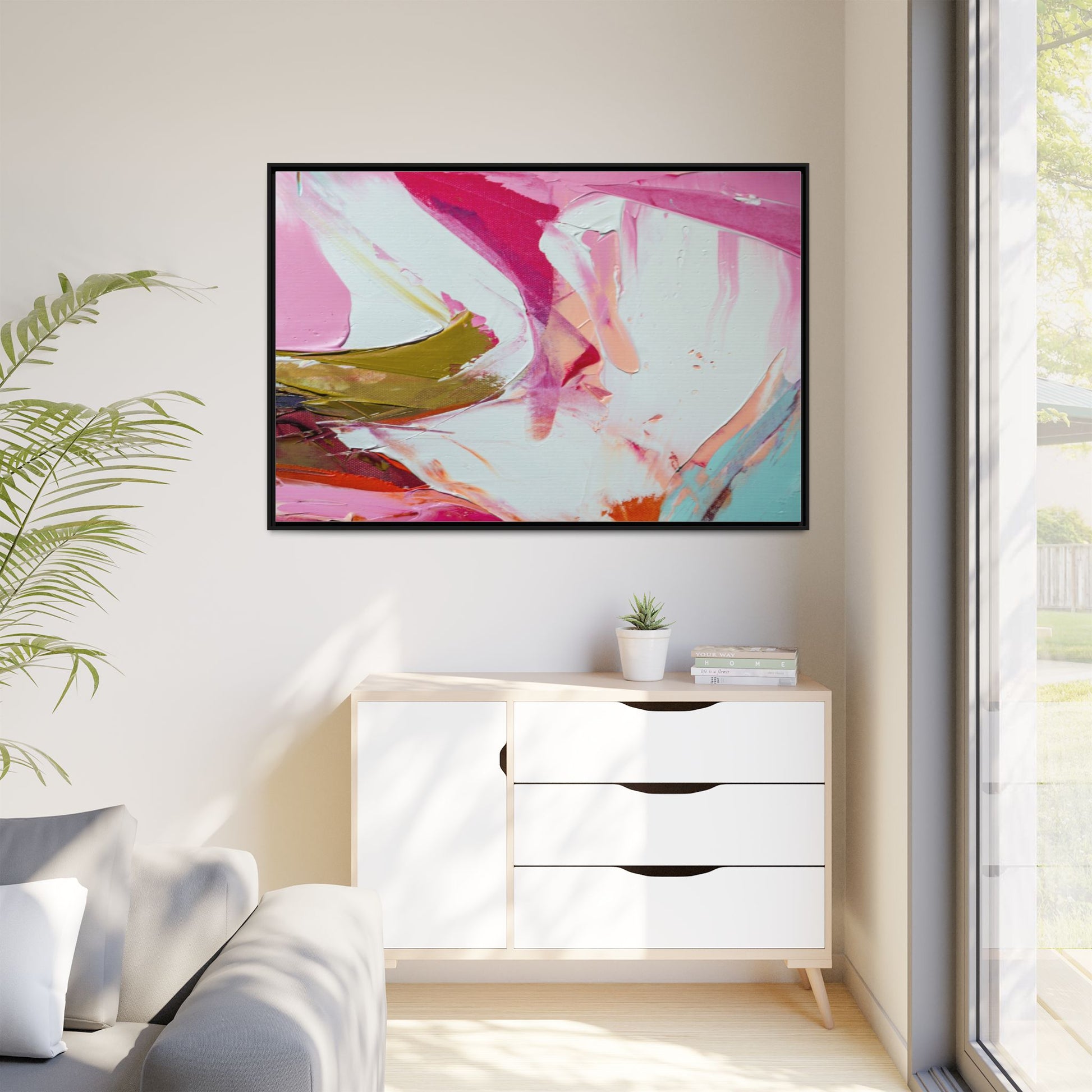 This vibrant abstract painting showcases a dynamic blend of soft and bold colors, primarily featuring shades of pink, white, magenta, olive green, and touches of turquoise and orange. The artwork appears to be created with acrylic or oil paints, displaying thick, expressive brushstrokes and a fluid, organic composition that suggests movement and energy. Textured layers of paint create depth and dimension, with some areas showing visible canvas texture and others displaying smooth, blended transitions between colors. The painting's style evokes a sense of spontaneity and emotional expression, with sweeping curves and intersecting color fields that draw the viewer's eye across the canvas. The overall effect is both harmonious and slightly chaotic, creating a visually captivating piece that invites personal interpretation and emotional response.