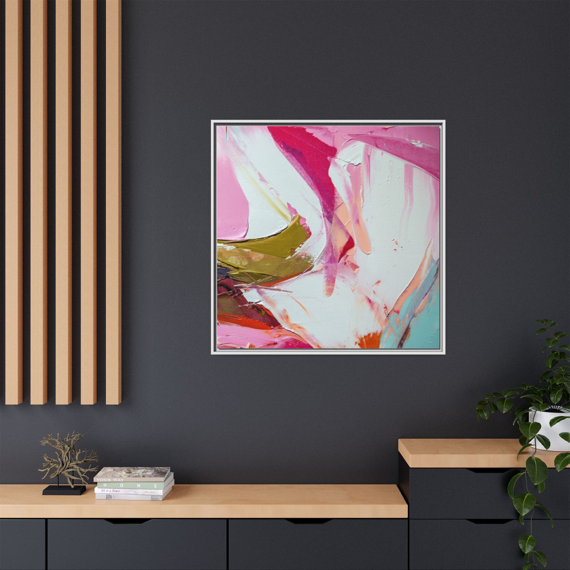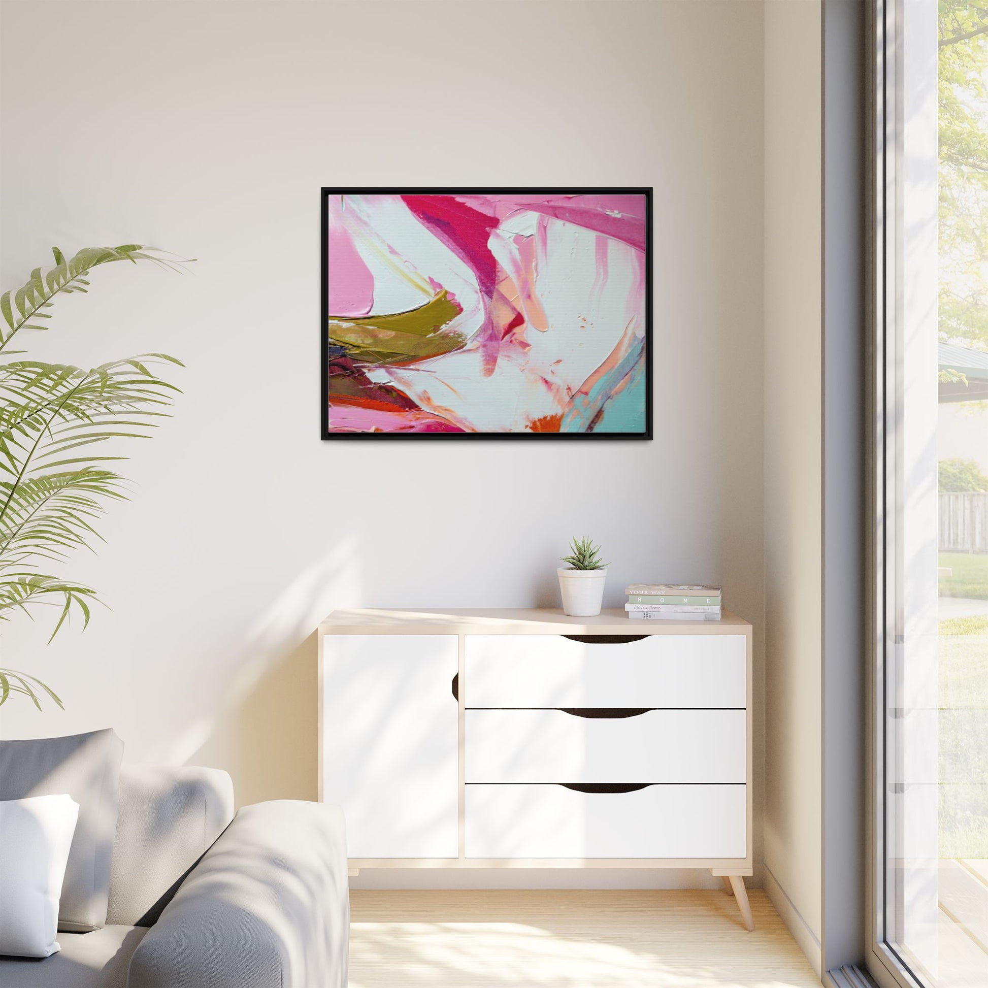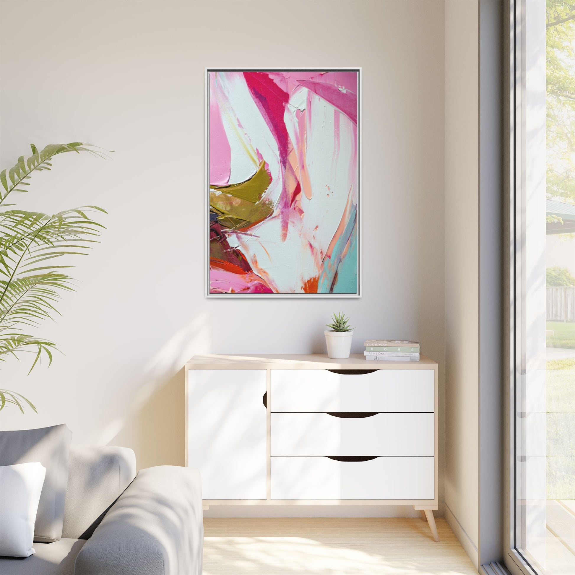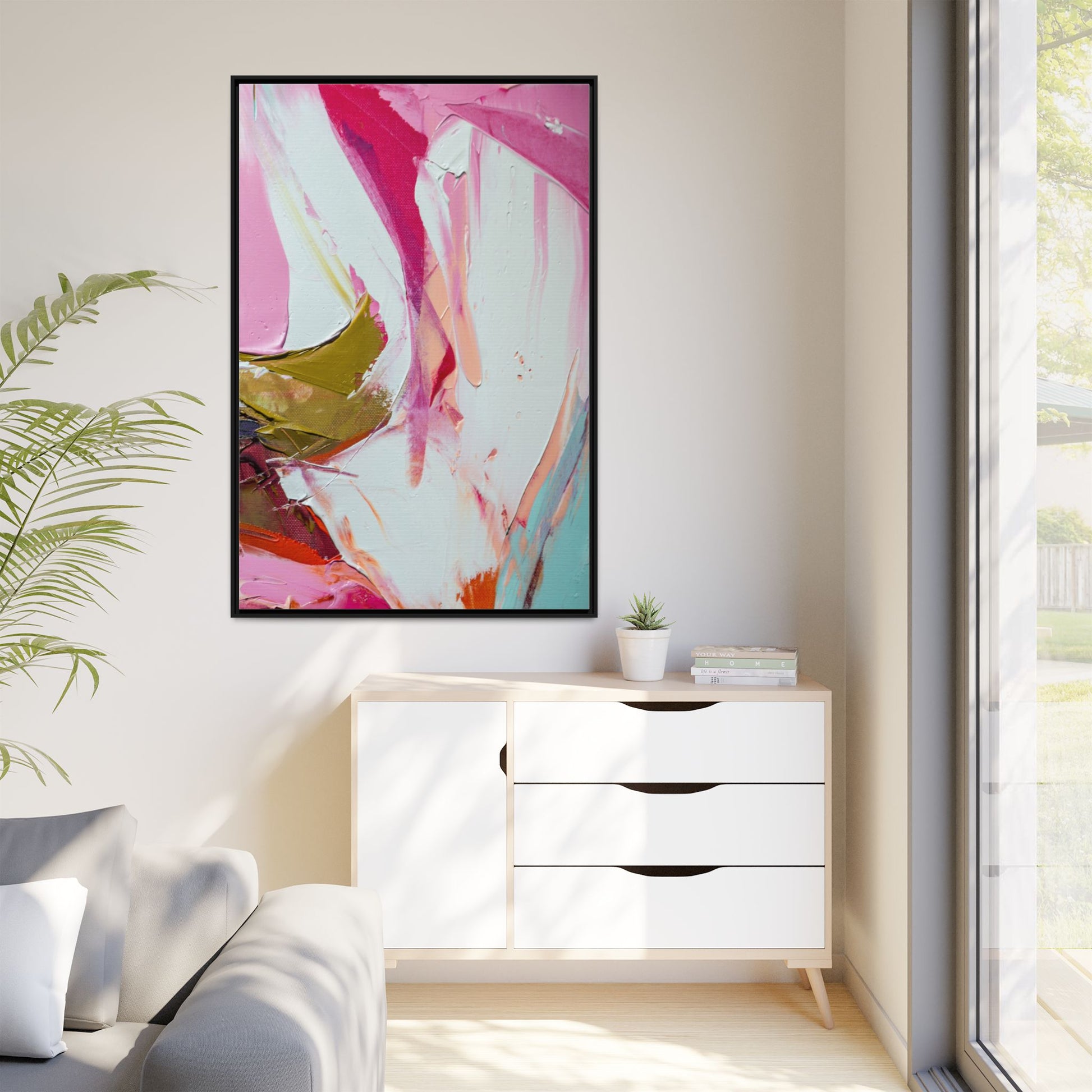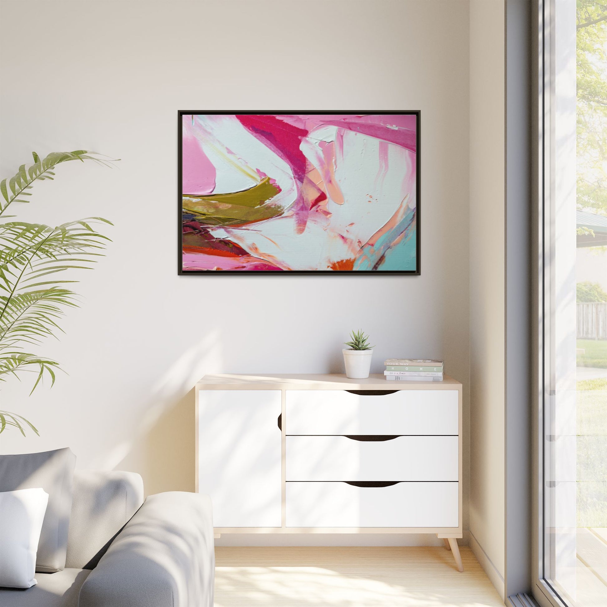 This vibrant abstract painting showcases a dynamic blend of soft and bold colors, primarily featuring shades of pink, white, magenta, olive green, and touches of turquoise and orange. The artwork appears to be created with acrylic or oil paints, displaying thick, expressive brushstrokes and a fluid, organic composition that suggests movement and energy. Textured layers of paint create depth and dimension, with some areas showing visible canvas texture and others displaying smooth, blended transitions between colors. The painting's style evokes a sense of spontaneity and emotional expression, with sweeping curves and intersecting color fields that draw the viewer's eye across the canvas. The overall effect is both harmonious and slightly chaotic, creating a visually captivating piece that invites personal interpretation and emotional response.
