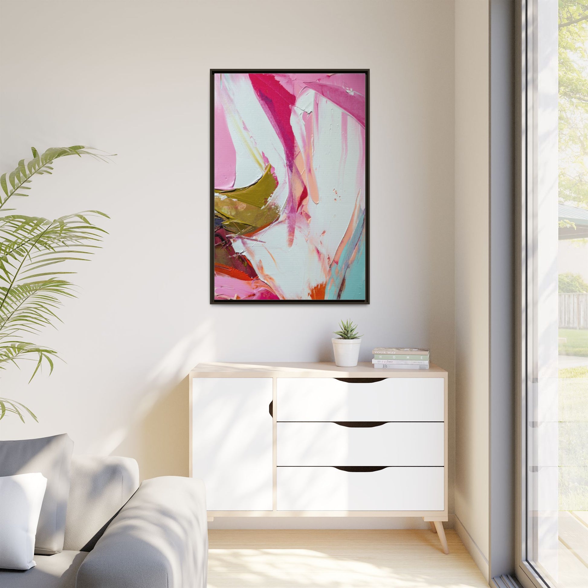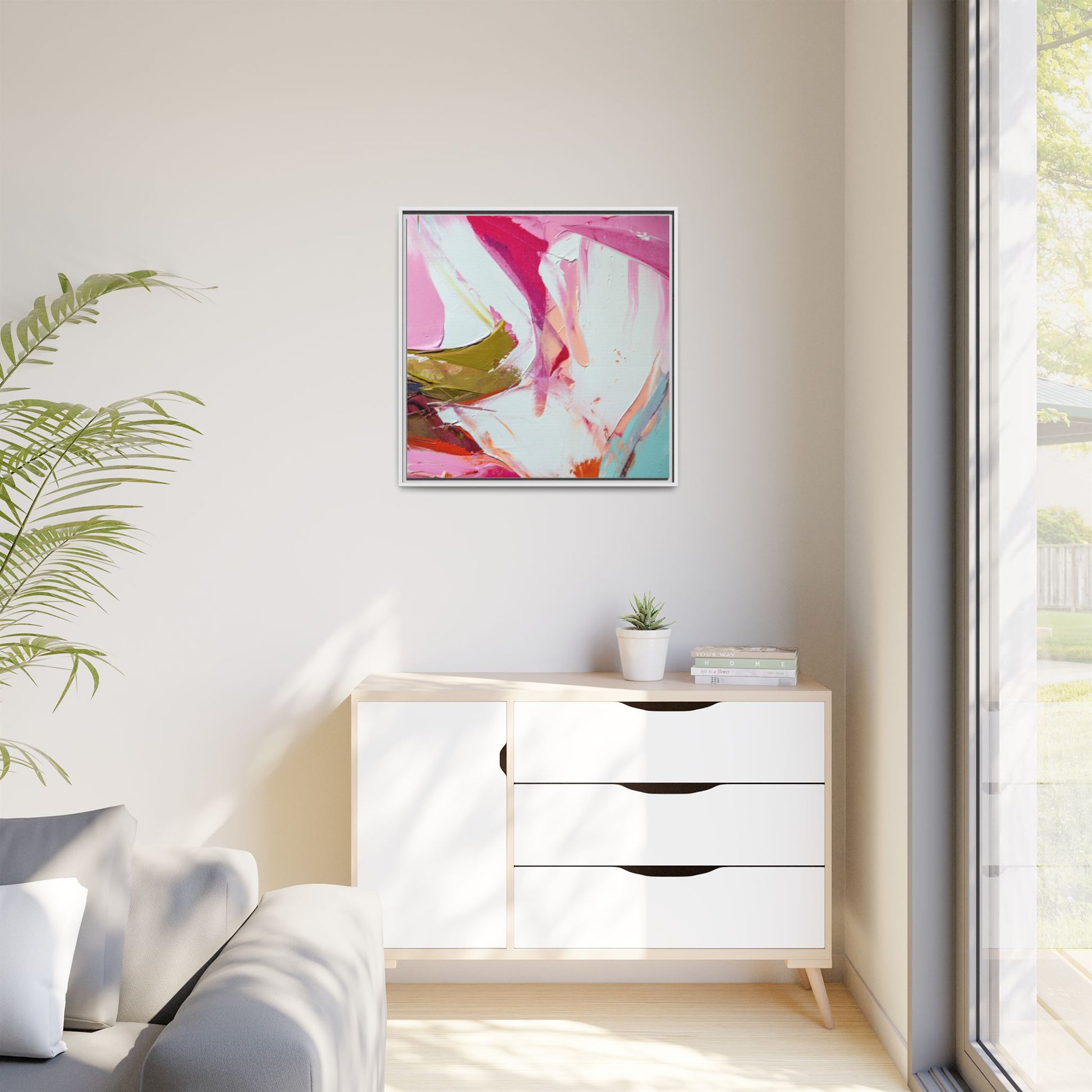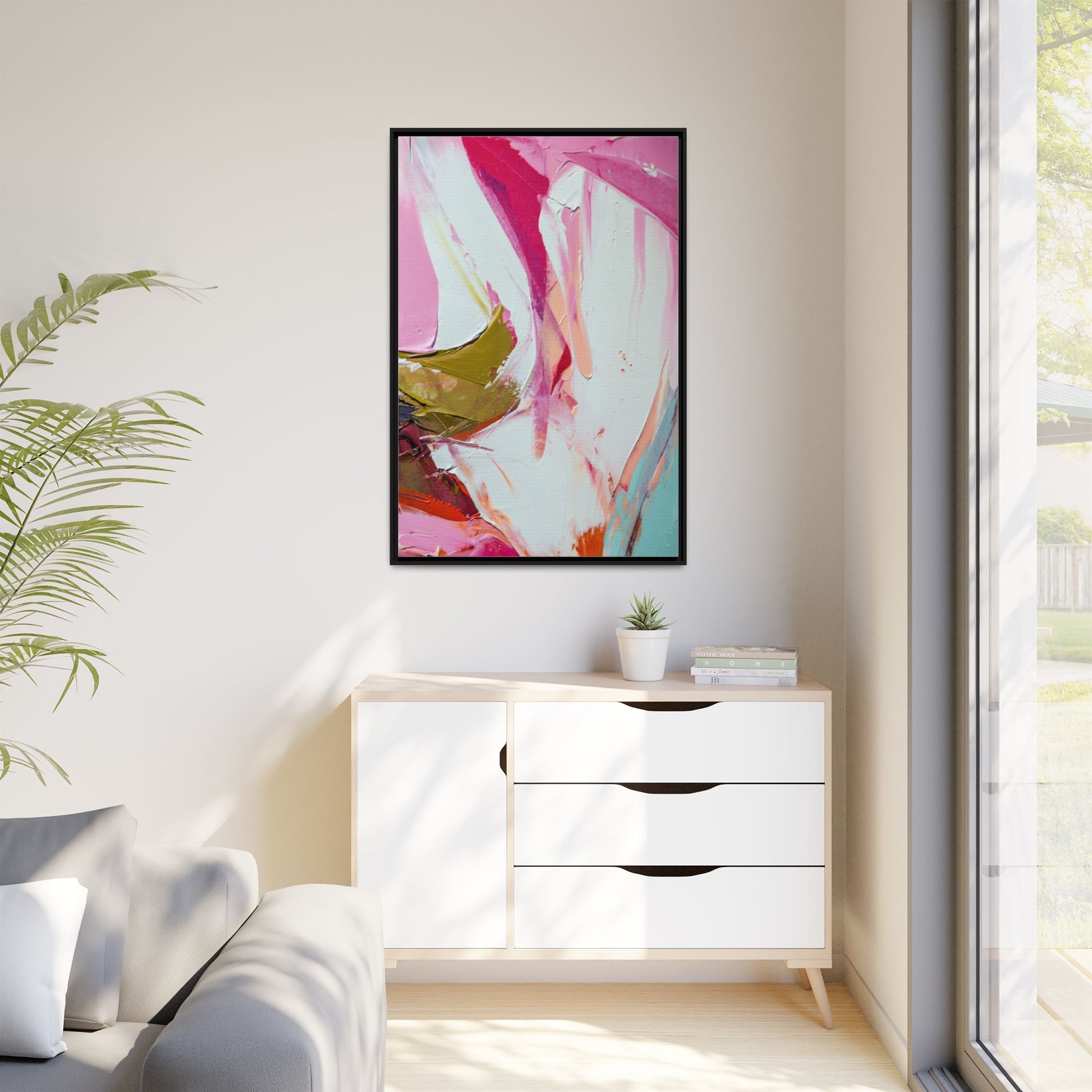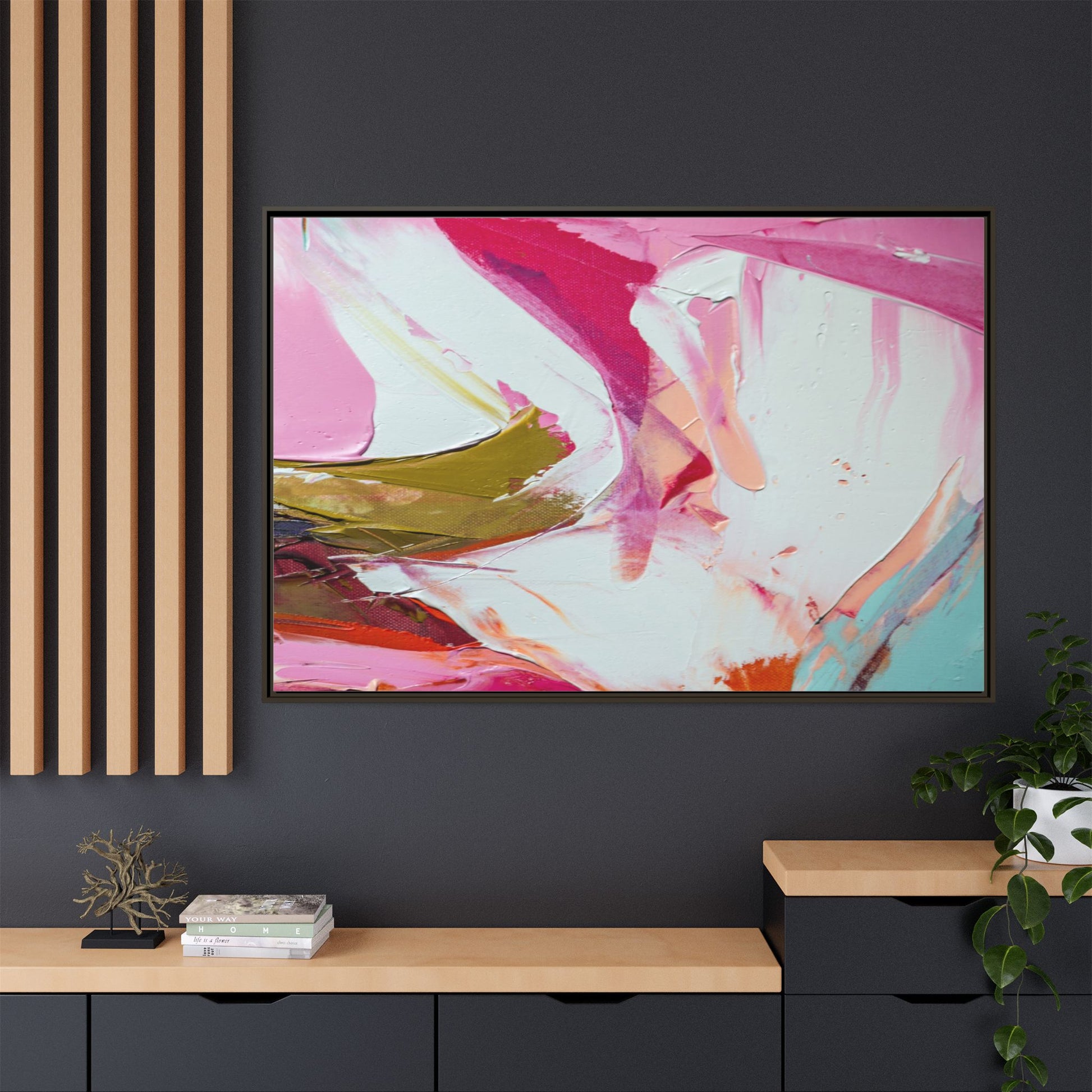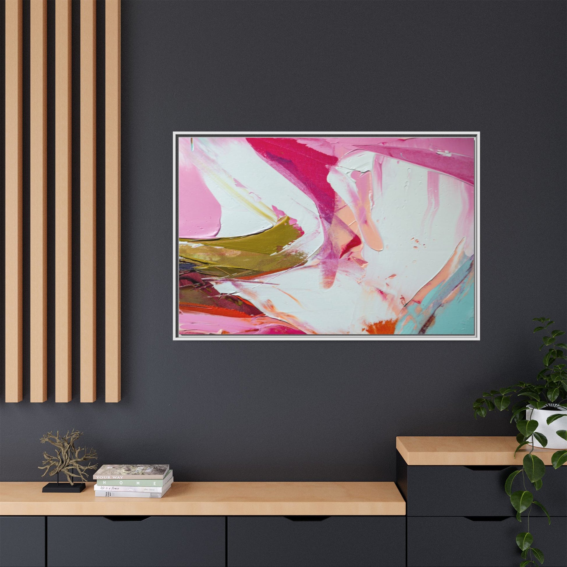 This vibrant abstract painting showcases a dynamic blend of soft and bold colors, primarily featuring shades of pink, white, magenta, olive green, and touches of turquoise and orange. The artwork appears to be created with acrylic or oil paints, displaying thick, expressive brushstrokes and a fluid, organic composition that suggests movement and energy. Textured layers of paint create depth and dimension, with some areas showing visible canvas texture and others displaying smooth, blended transitions between colors. The painting's style evokes a sense of spontaneity and emotional expression, with sweeping curves and intersecting color fields that draw the viewer's eye across the canvas. The overall effect is both harmonious and slightly chaotic, creating a visually captivating piece that invites personal interpretation and emotional response.