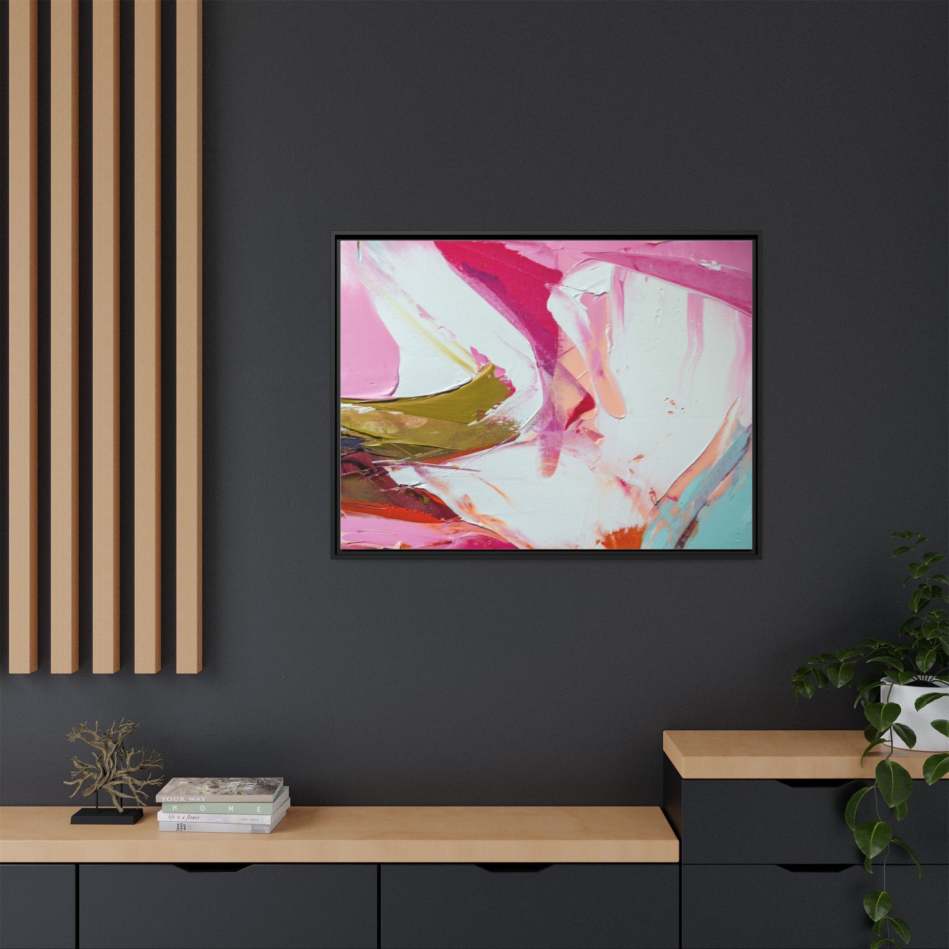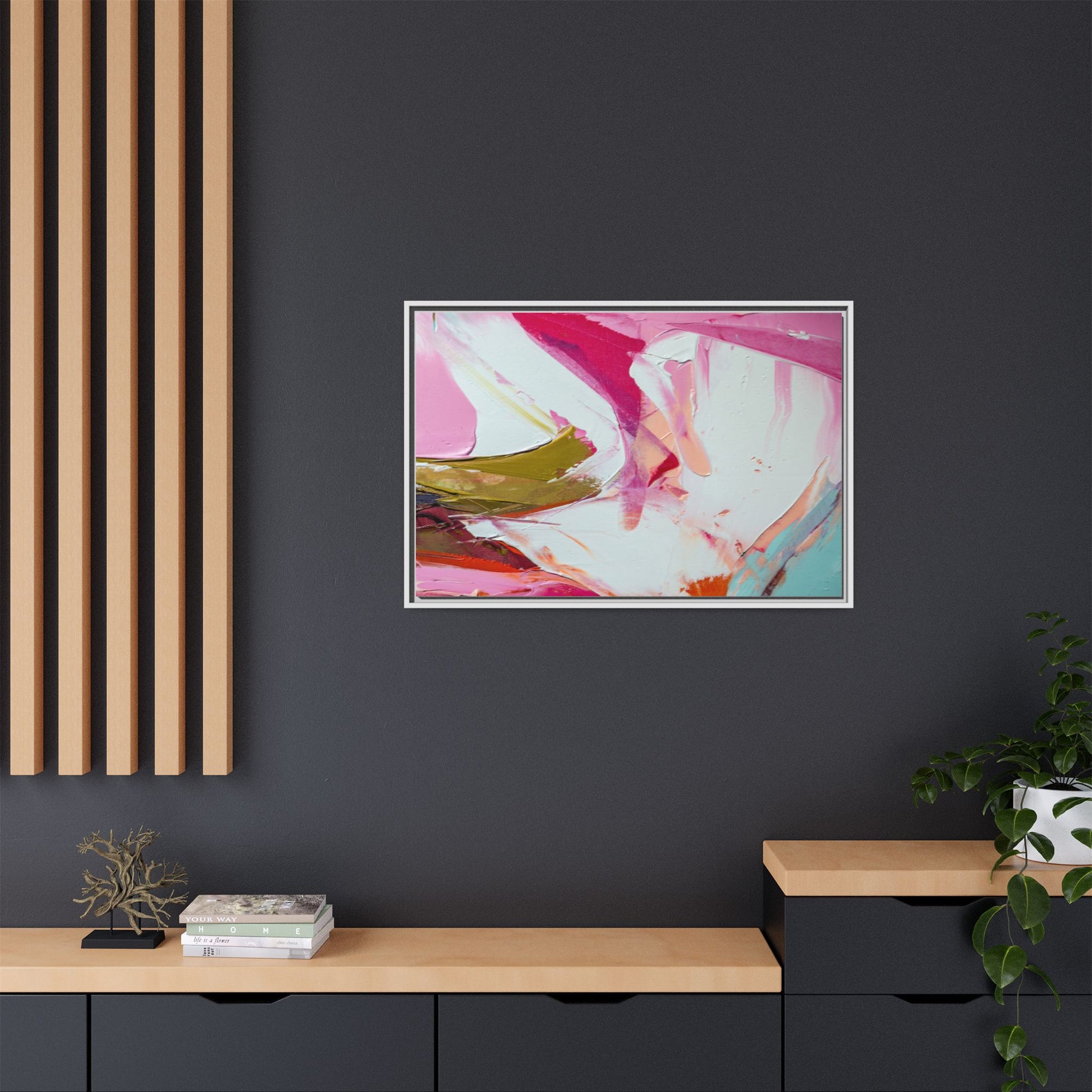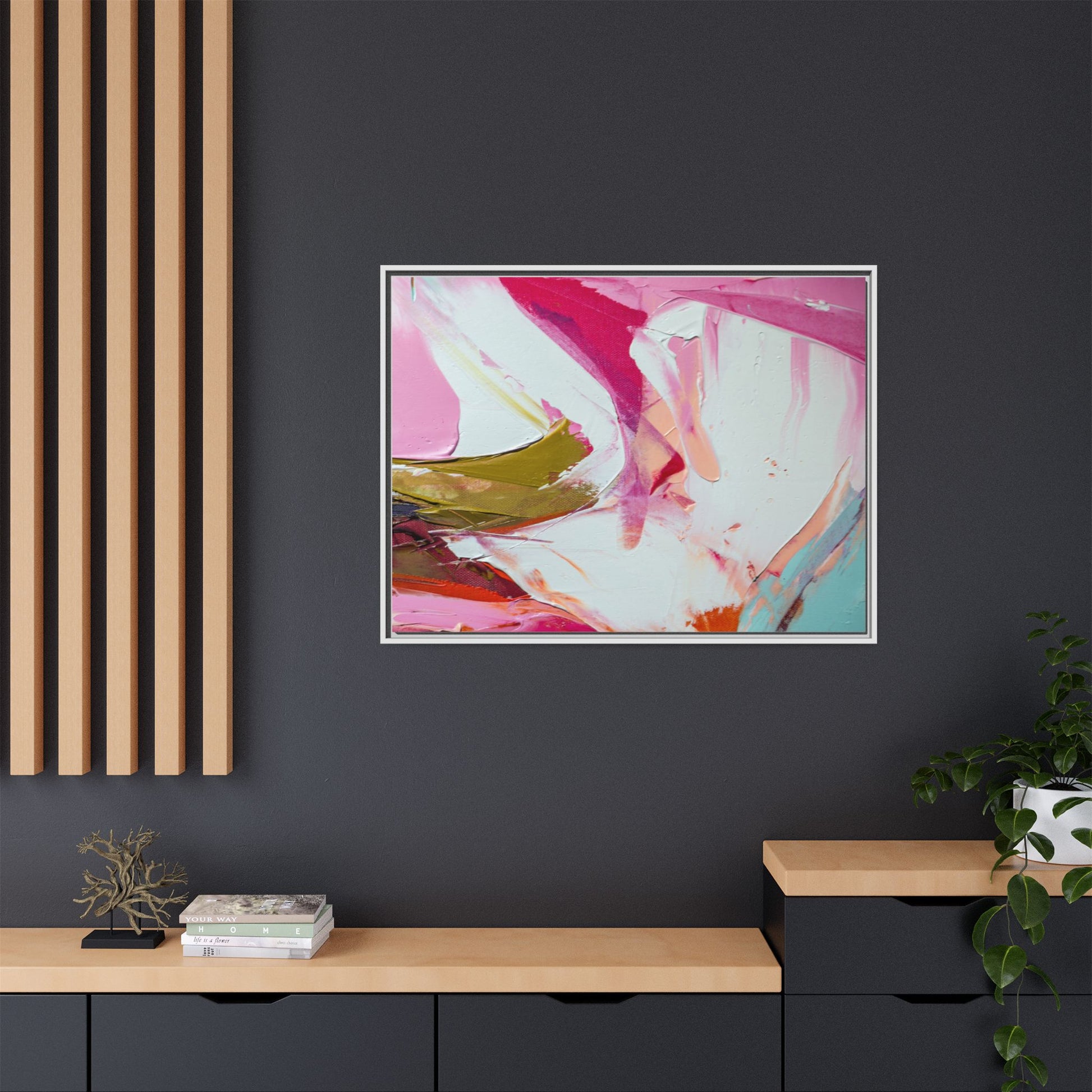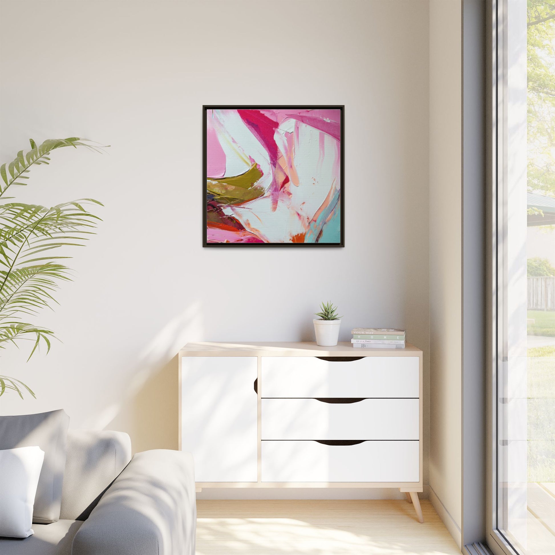 This vibrant abstract painting showcases a dynamic blend of soft and bold colors, primarily featuring shades of pink, white, magenta, olive green, and touches of turquoise and orange. The artwork appears to be created with acrylic or oil paints, displaying thick, expressive brushstrokes and a fluid, organic composition that suggests movement and energy. Textured layers of paint create depth and dimension, with some areas showing visible canvas texture and others displaying smooth, blended transitions between colors. The painting's style evokes a sense of spontaneity and emotional expression, with sweeping curves and intersecting color fields that draw the viewer's eye across the canvas. The overall effect is both harmonious and slightly chaotic, creating a visually captivating piece that invites personal interpretation and emotional response.