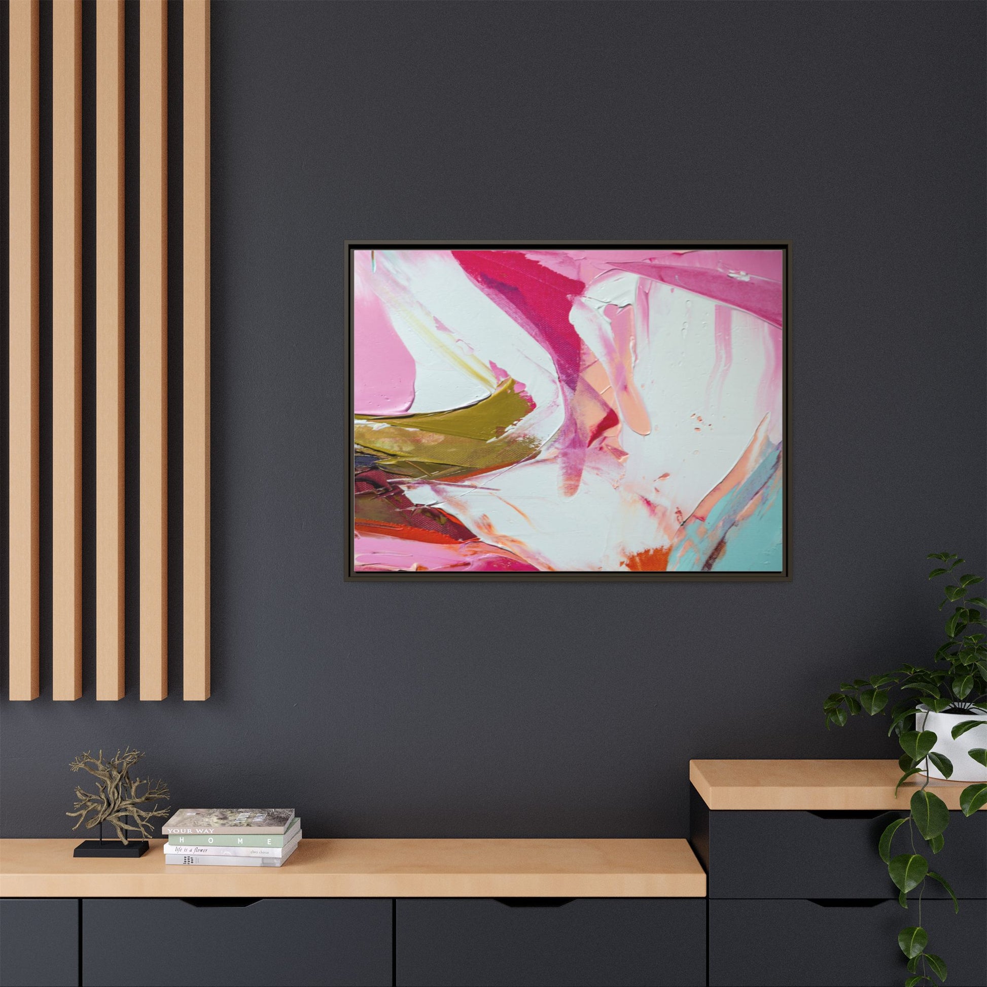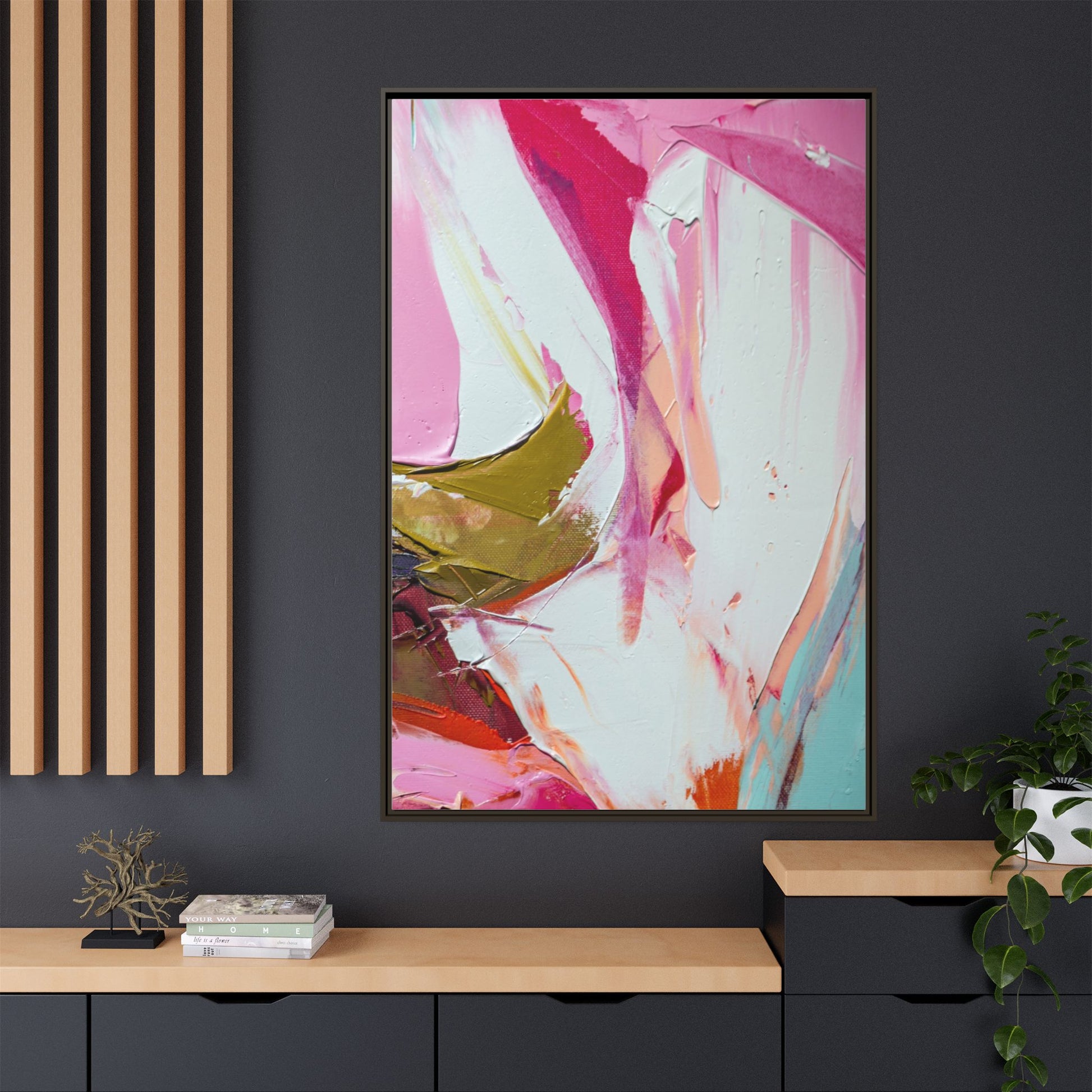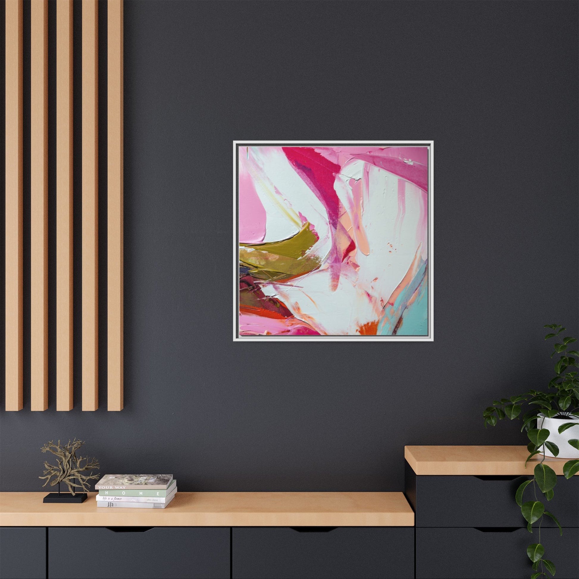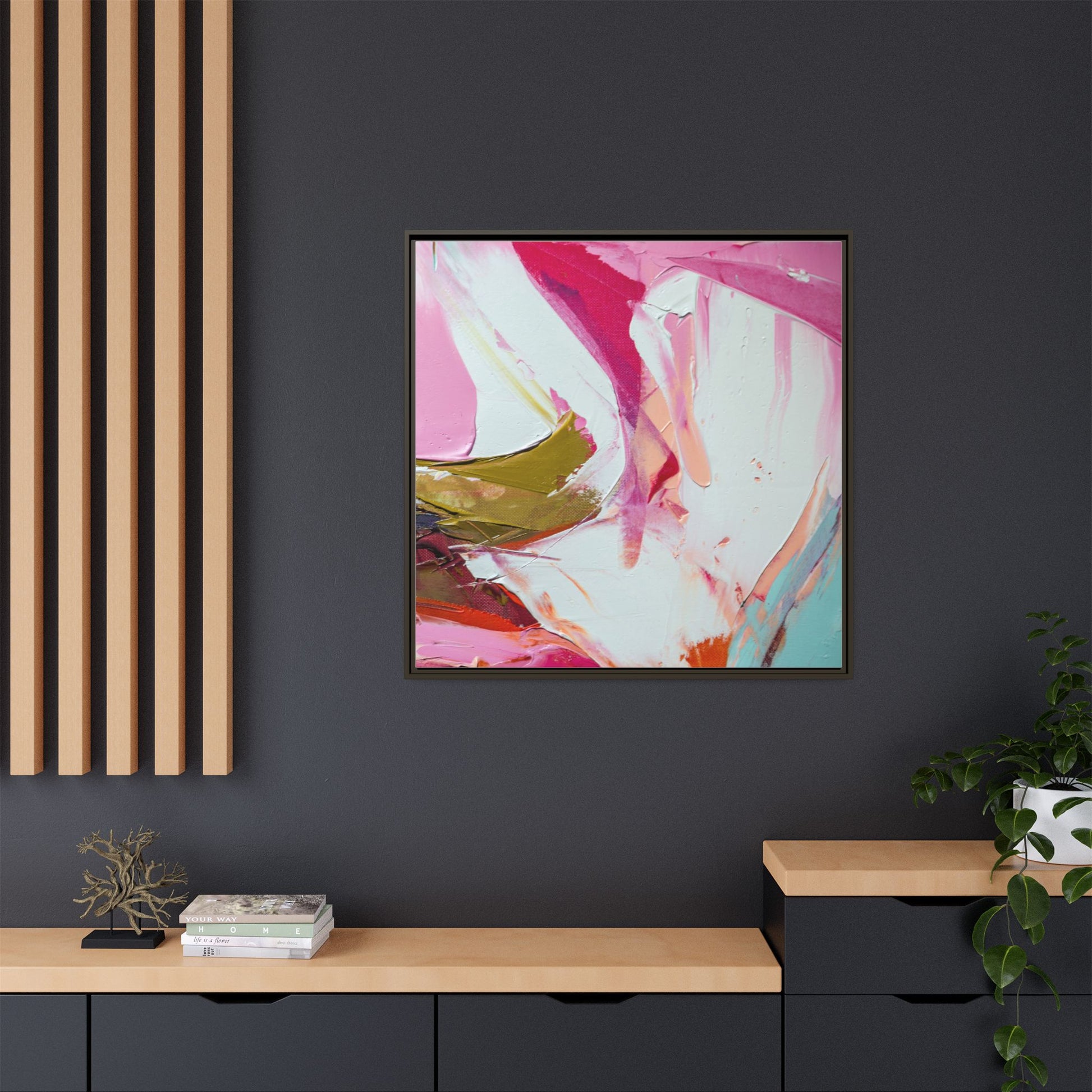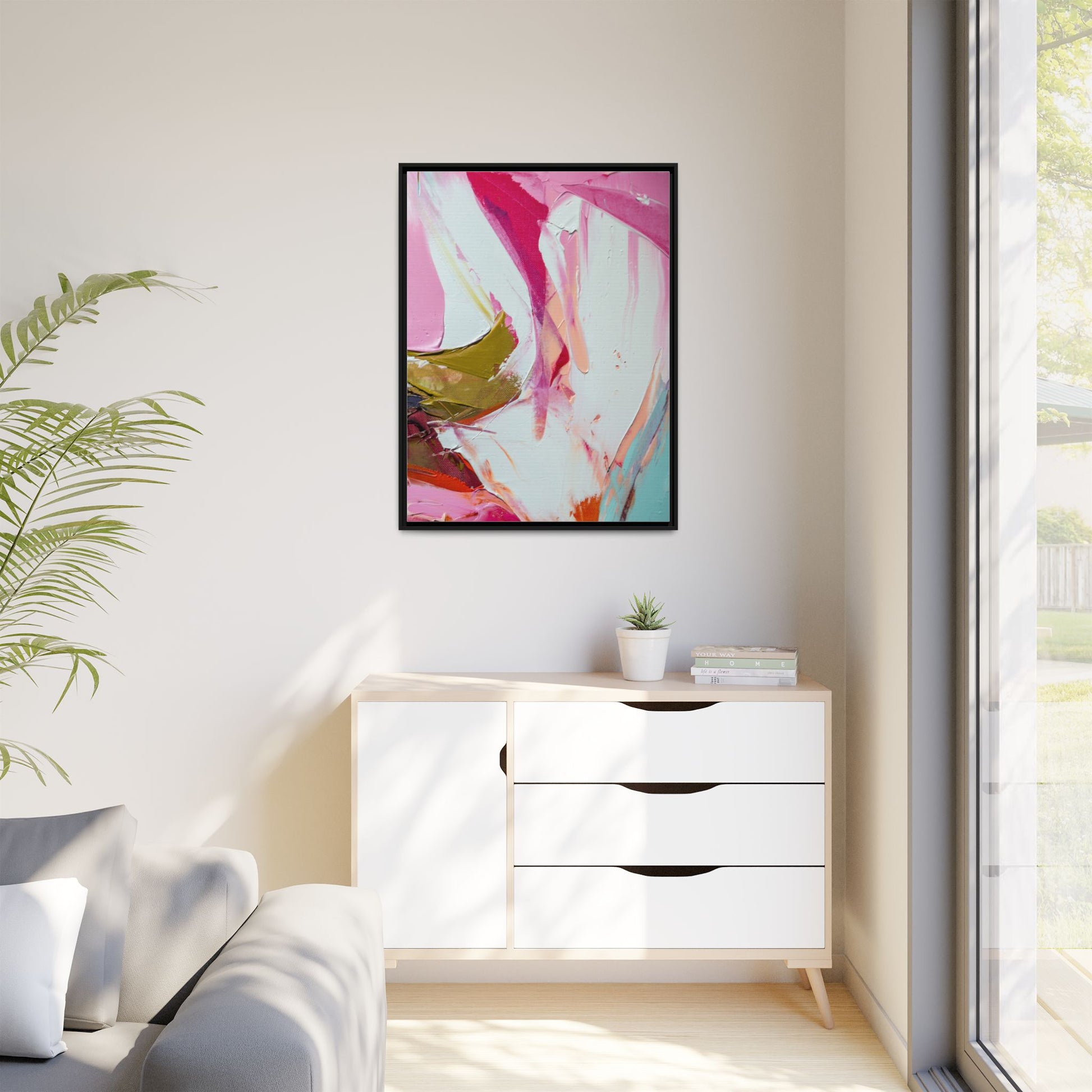 This vibrant abstract painting showcases a dynamic blend of soft and bold colors, primarily featuring shades of pink, white, magenta, olive green, and touches of turquoise and orange. The artwork appears to be created with acrylic or oil paints, displaying thick, expressive brushstrokes and a fluid, organic composition that suggests movement and energy. Textured layers of paint create depth and dimension, with some areas showing visible canvas texture and others displaying smooth, blended transitions between colors. The painting's style evokes a sense of spontaneity and emotional expression, with sweeping curves and intersecting color fields that draw the viewer's eye across the canvas. The overall effect is both harmonious and slightly chaotic, creating a visually captivating piece that invites personal interpretation and emotional response.