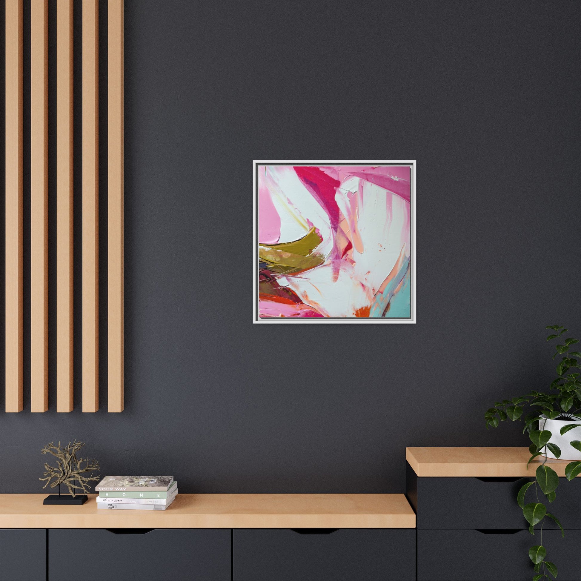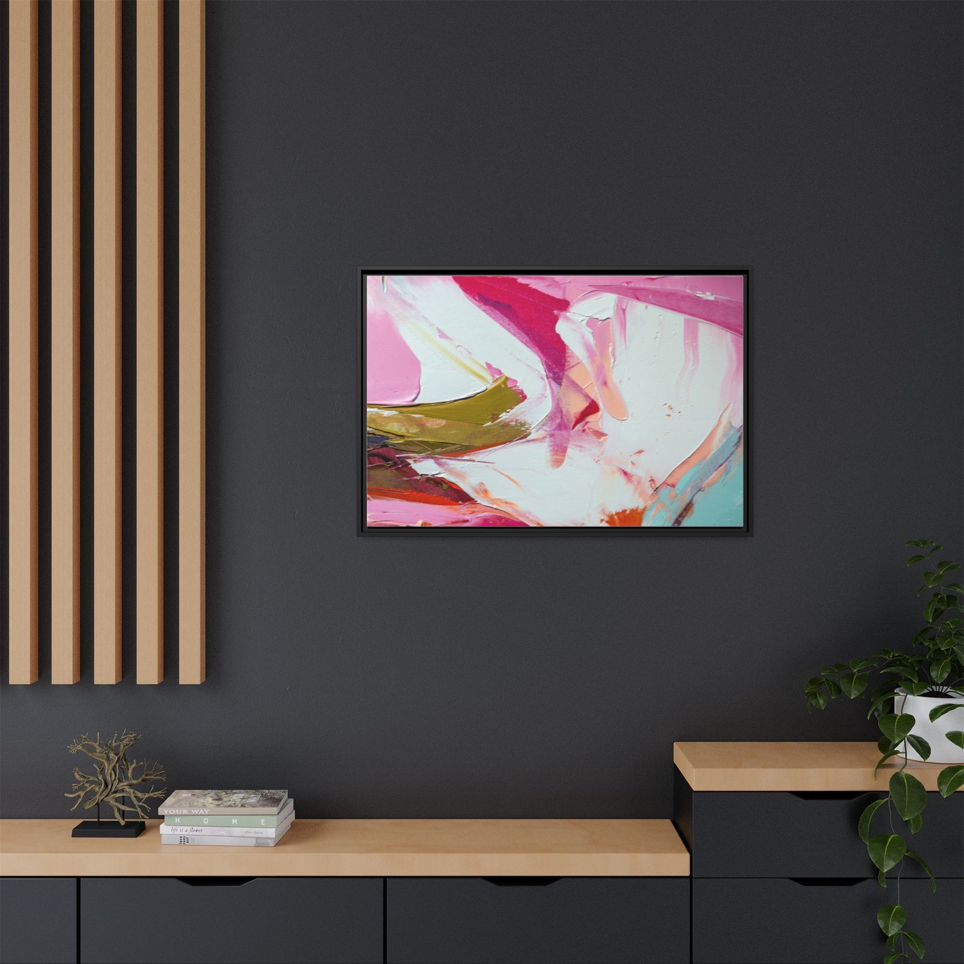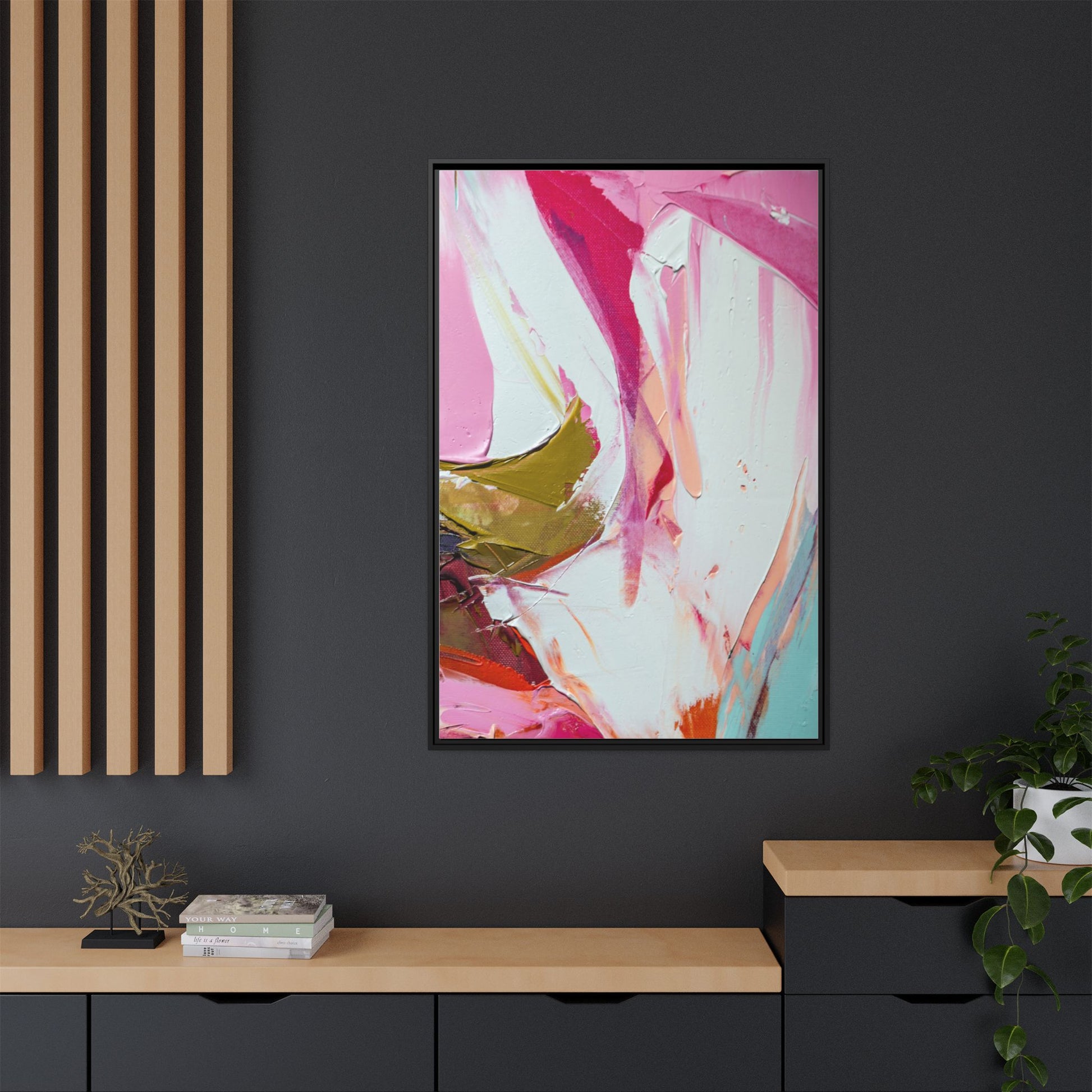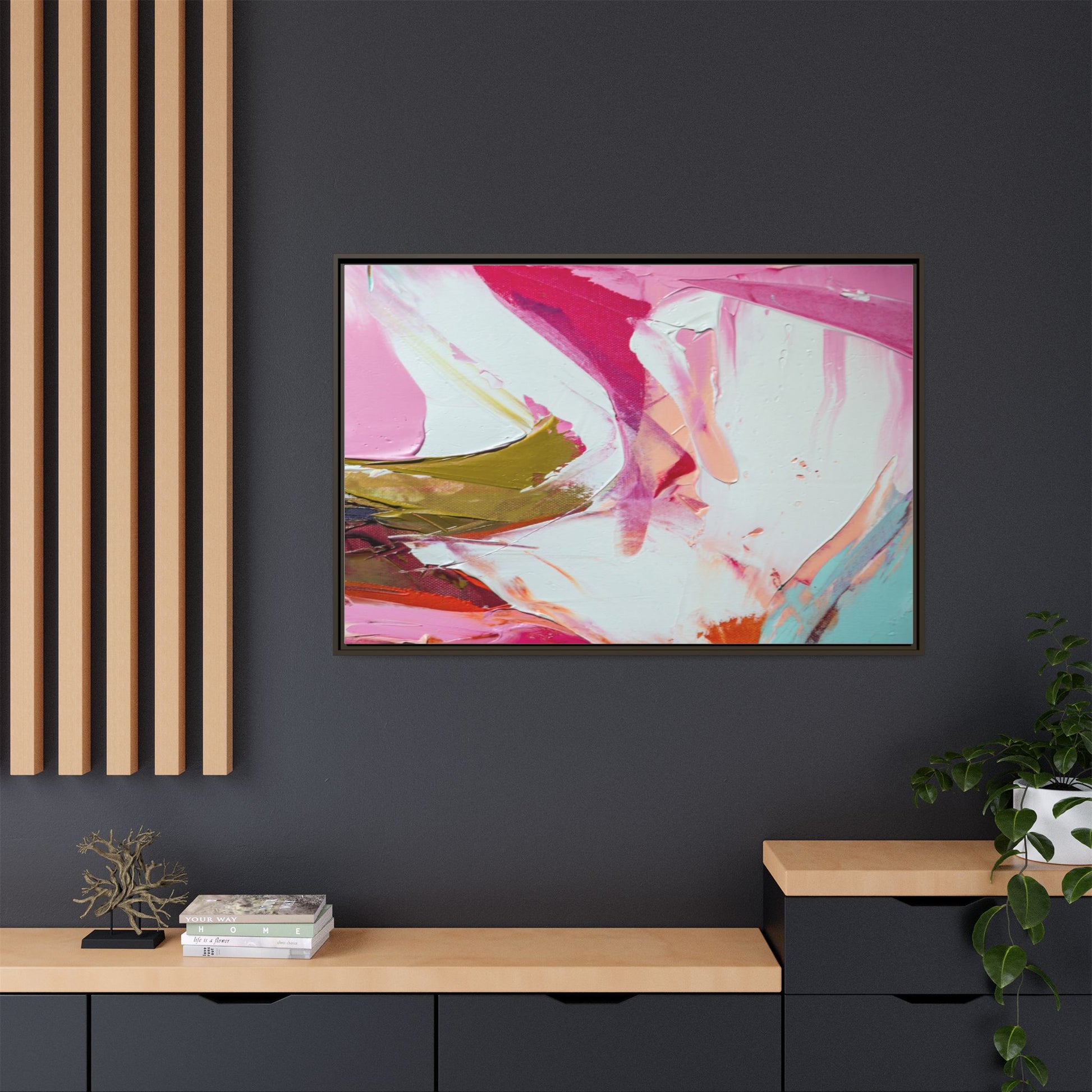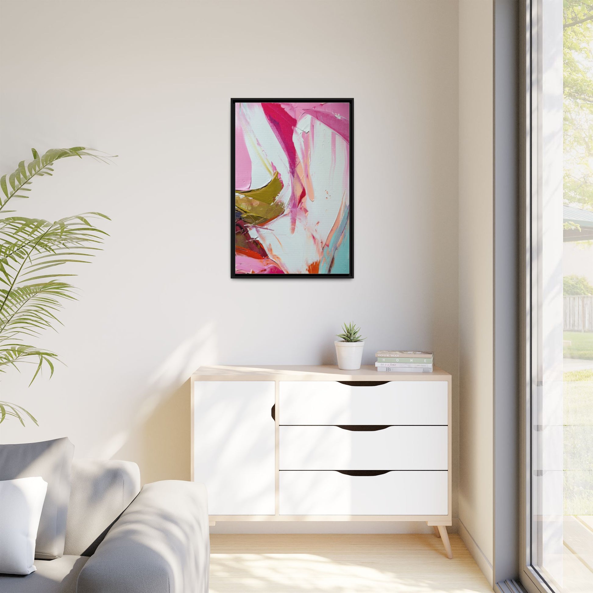 This vibrant abstract painting showcases a dynamic blend of soft and bold colors, primarily featuring shades of pink, white, magenta, olive green, and touches of turquoise and orange. The artwork appears to be created with acrylic or oil paints, displaying thick, expressive brushstrokes and a fluid, organic composition that suggests movement and energy. Textured layers of paint create depth and dimension, with some areas showing visible canvas texture and others displaying smooth, blended transitions between colors. The painting's style evokes a sense of spontaneity and emotional expression, with sweeping curves and intersecting color fields that draw the viewer's eye across the canvas. The overall effect is both harmonious and slightly chaotic, creating a visually captivating piece that invites personal interpretation and emotional response.