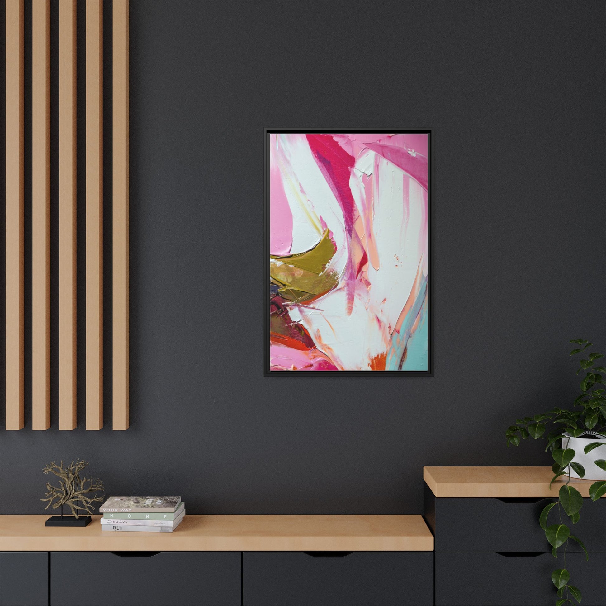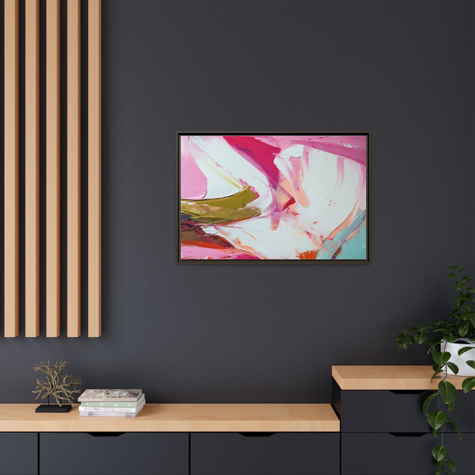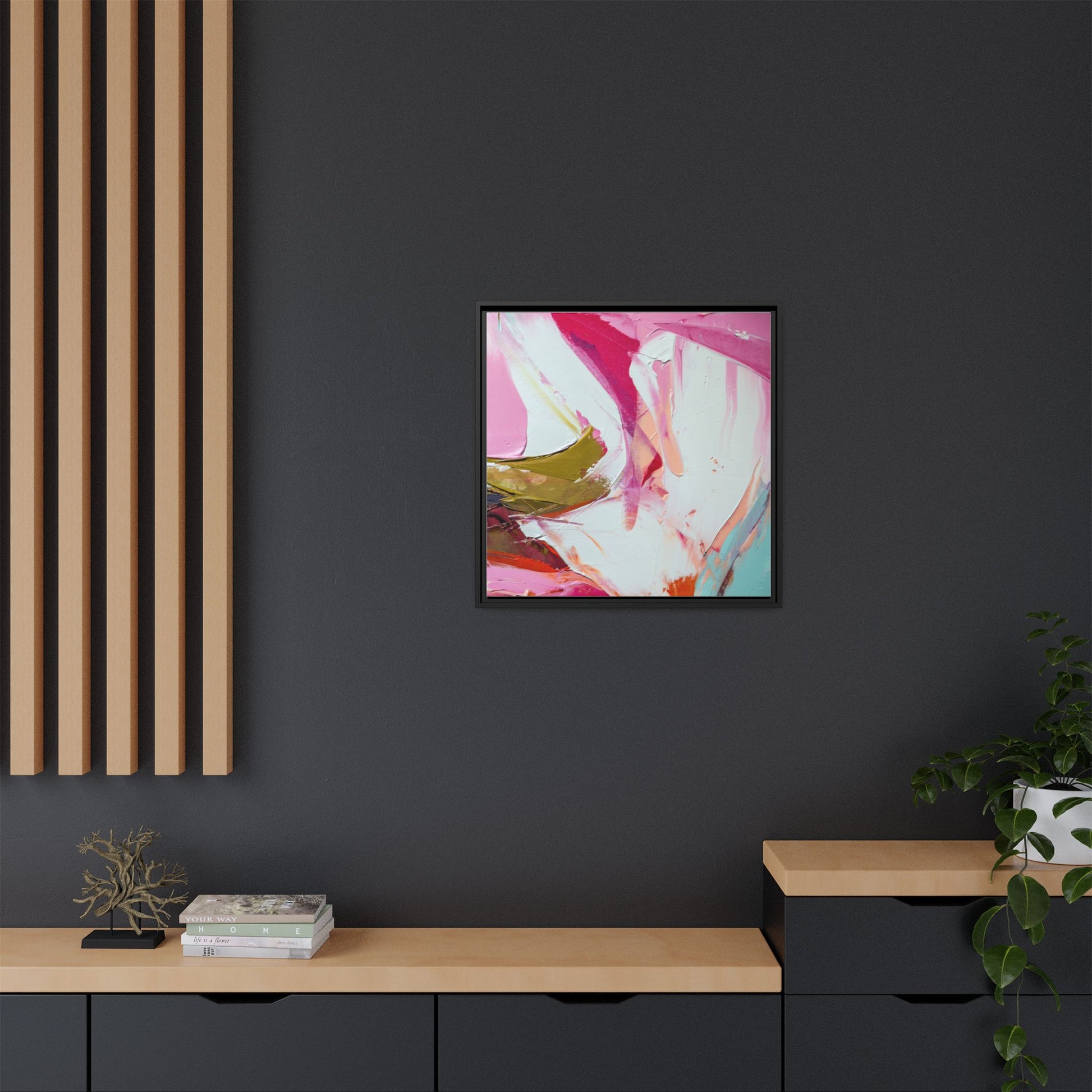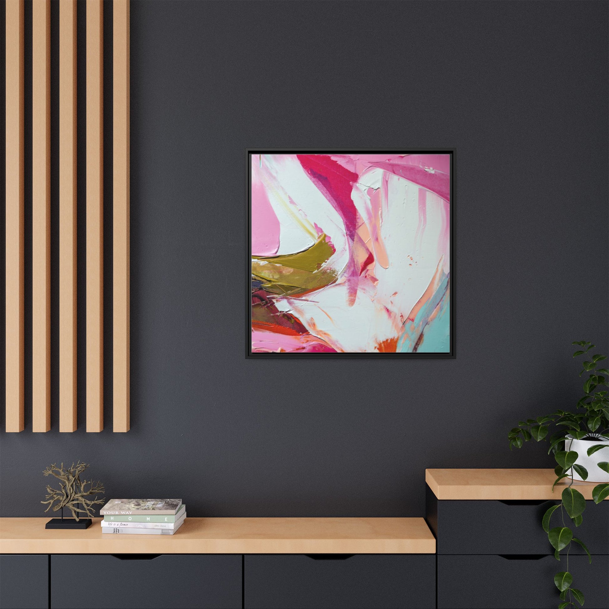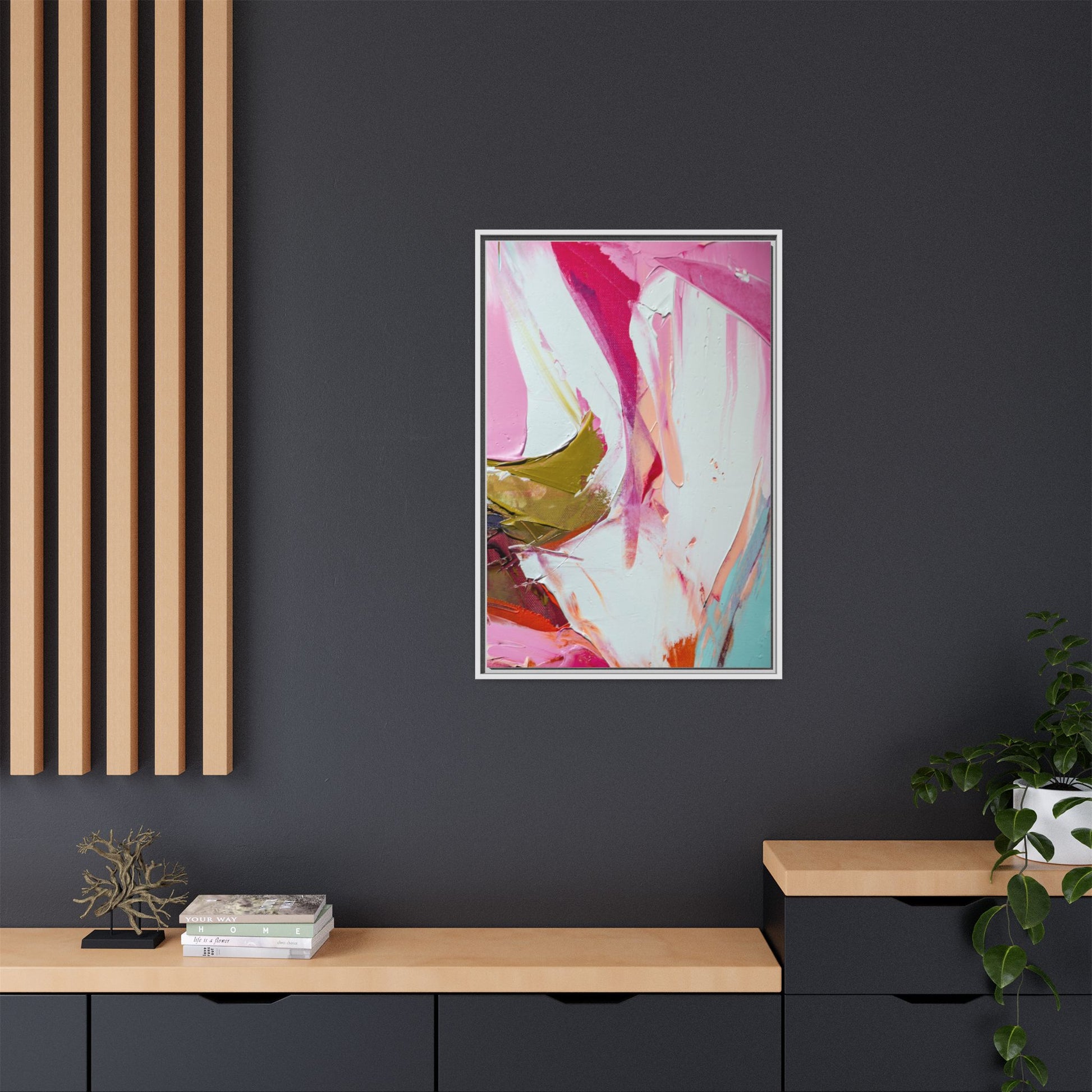 This vibrant abstract painting showcases a dynamic blend of soft and bold colors, primarily featuring shades of pink, white, magenta, olive green, and touches of turquoise and orange. The artwork appears to be created with acrylic or oil paints, displaying thick, expressive brushstrokes and a fluid, organic composition that suggests movement and energy. Textured layers of paint create depth and dimension, with some areas showing visible canvas texture and others displaying smooth, blended transitions between colors. The painting's style evokes a sense of spontaneity and emotional expression, with sweeping curves and intersecting color fields that draw the viewer's eye across the canvas. The overall effect is both harmonious and slightly chaotic, creating a visually captivating piece that invites personal interpretation and emotional response.