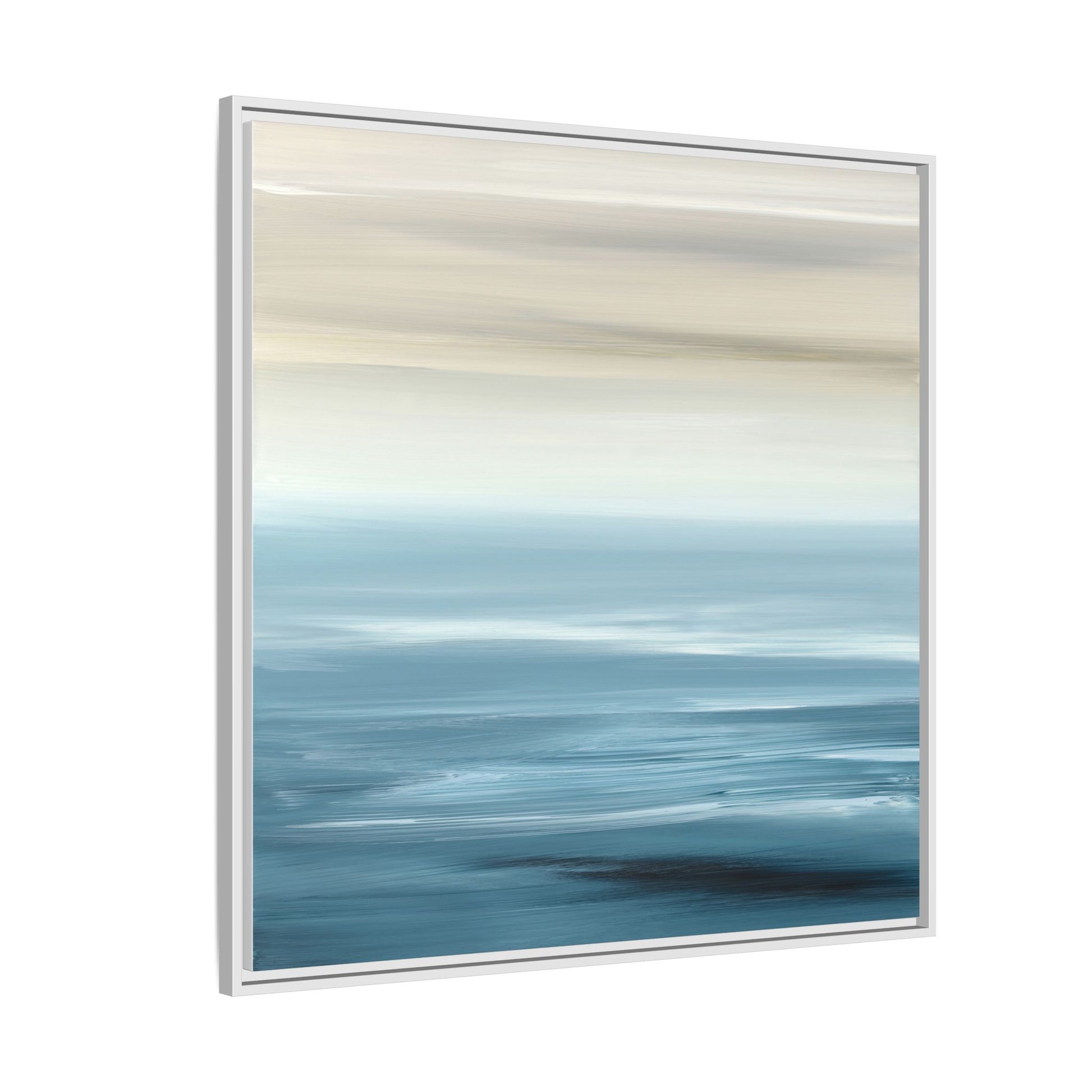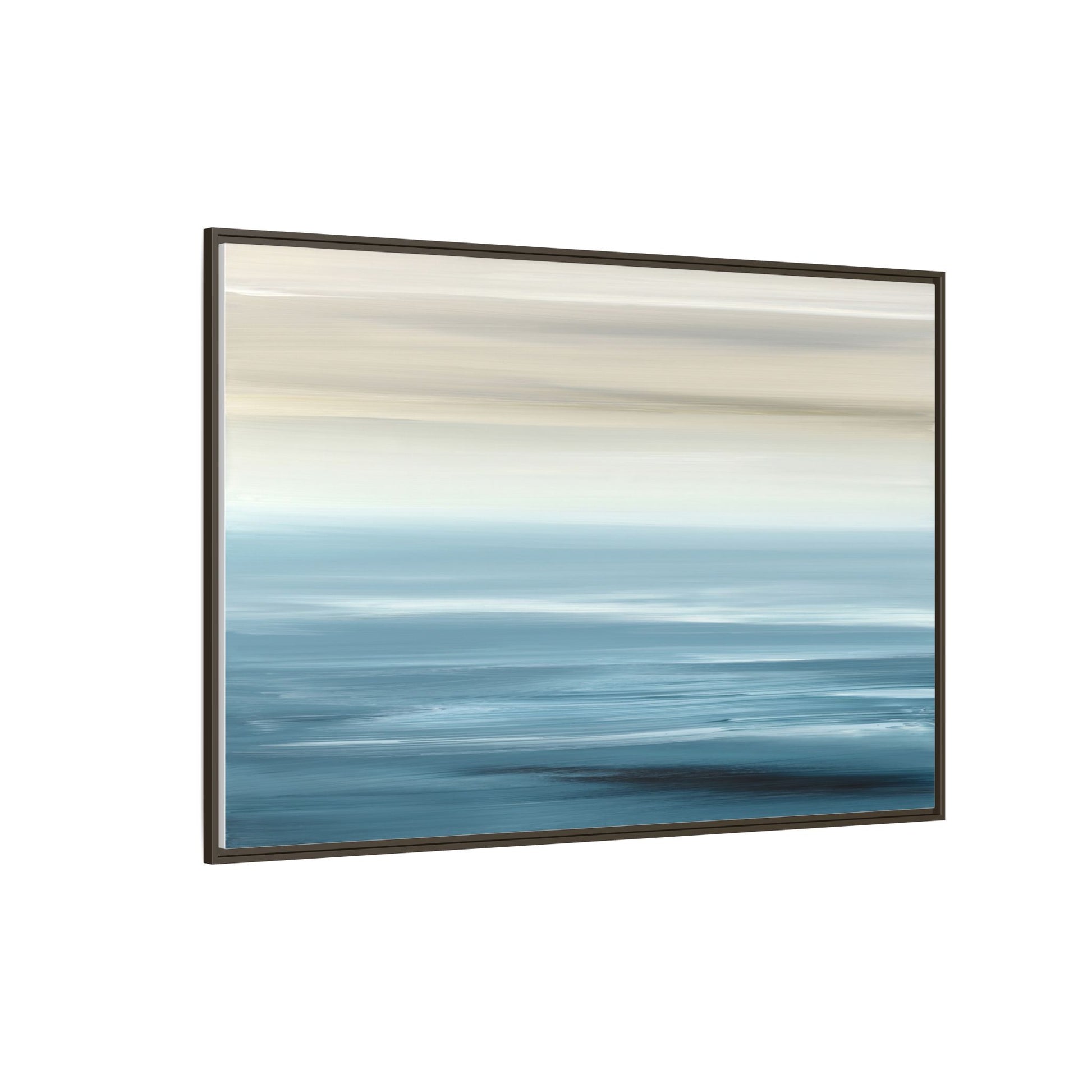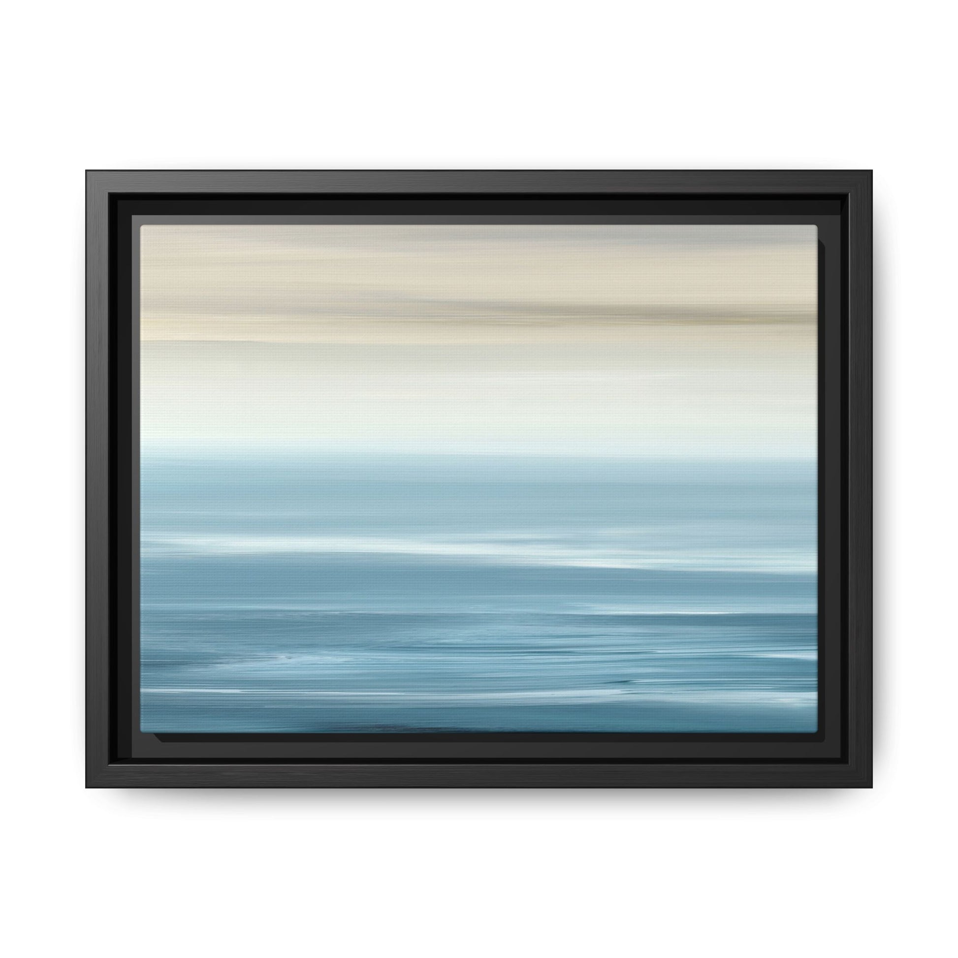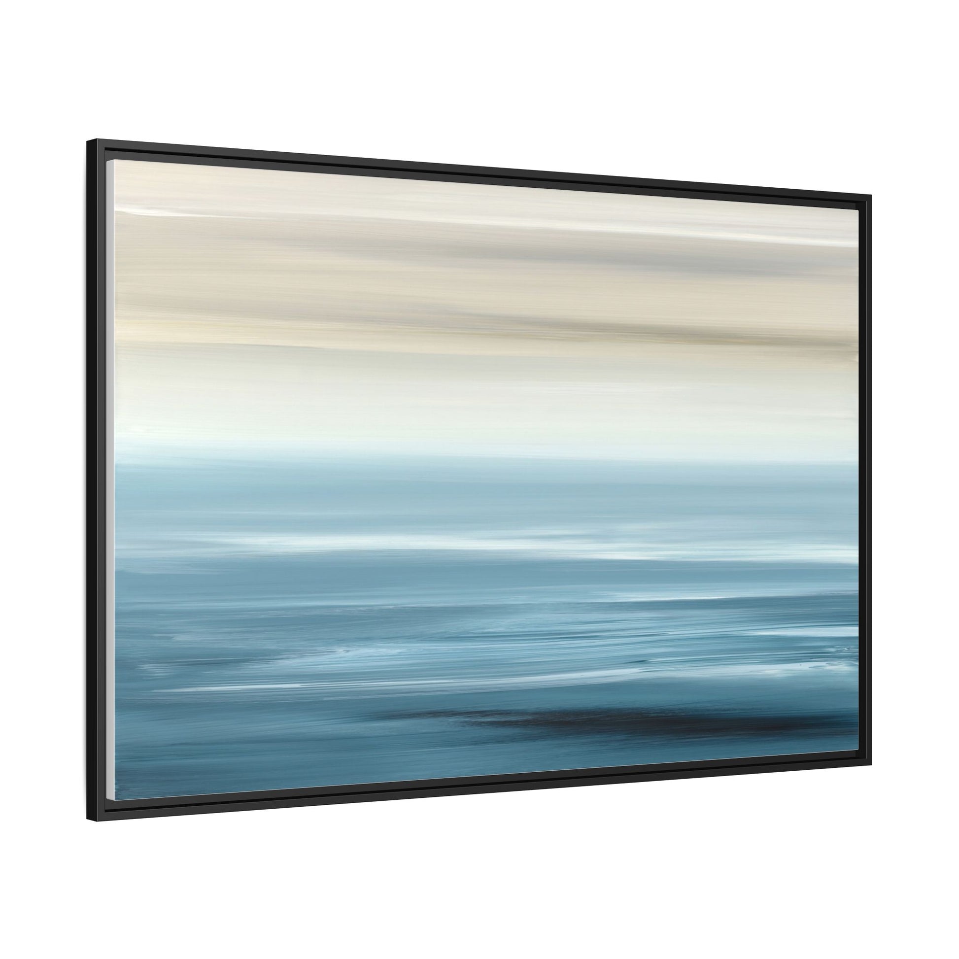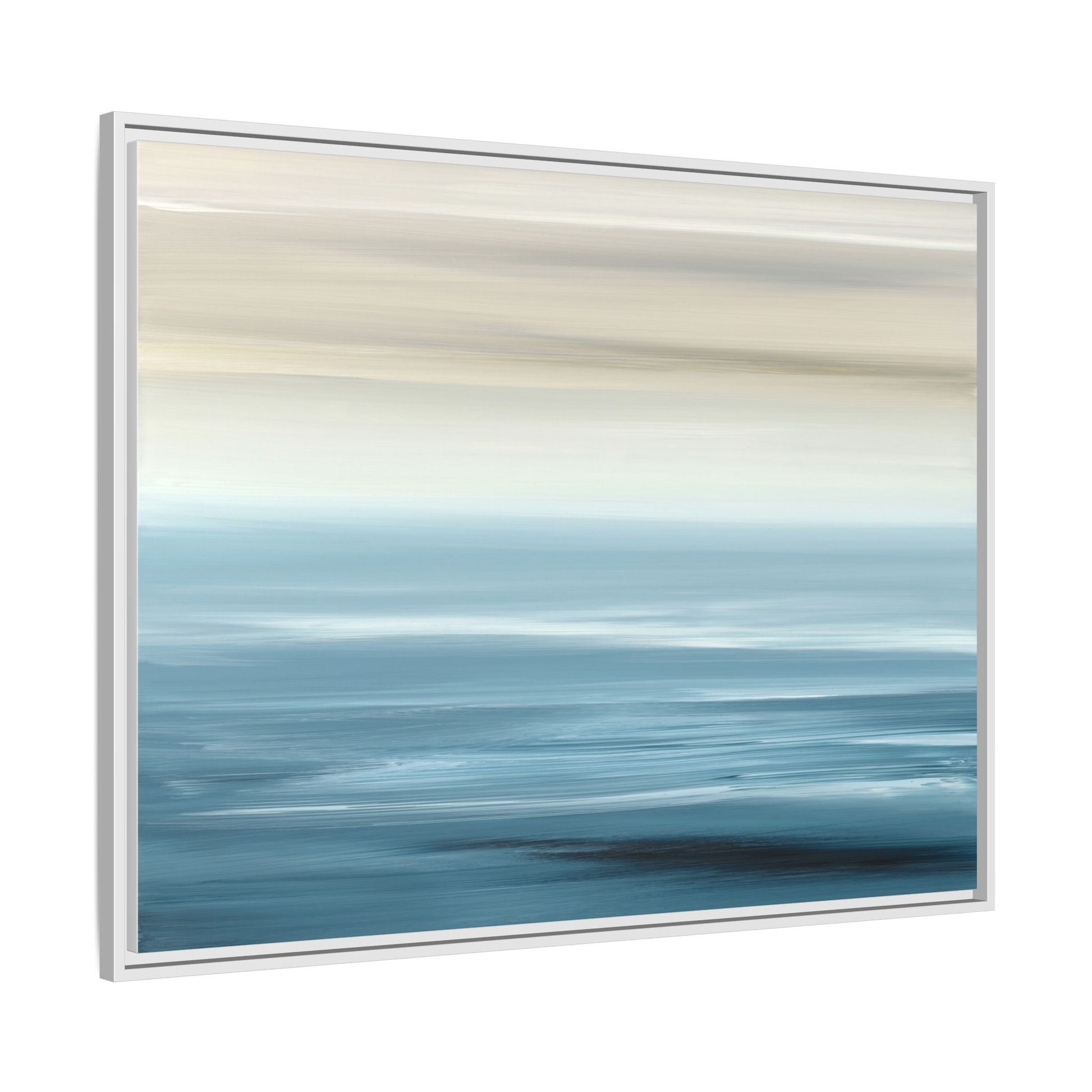 This stunning abstract seascape captures the serene essence of a coastal horizon through a mesmerizing blur of blue and neutral tones. The image employs a motion blur technique that creates soft, horizontal lines reminiscent of water and sky blending seamlessly together. Gradients of pale cream, light blue, and deep teal flow across the composition, suggesting the tranquil transition from shoreline to open water. The horizontal strokes evoke a sense of calm and movement, mimicking the gentle waves and atmospheric haze of a peaceful seascape. The artistic rendering transforms a traditional landscape into a minimalist, almost meditative visual experience that invites contemplation and relaxation.