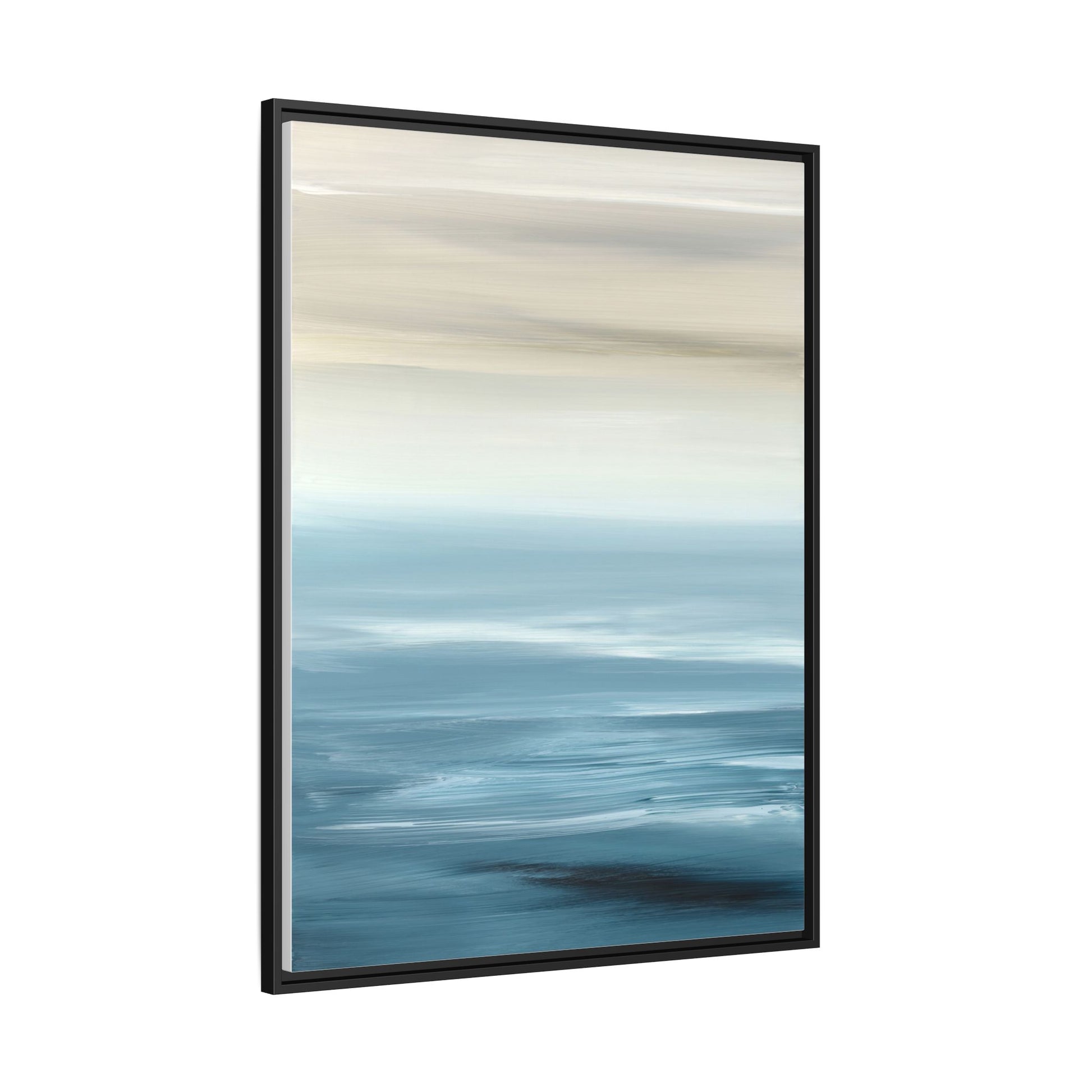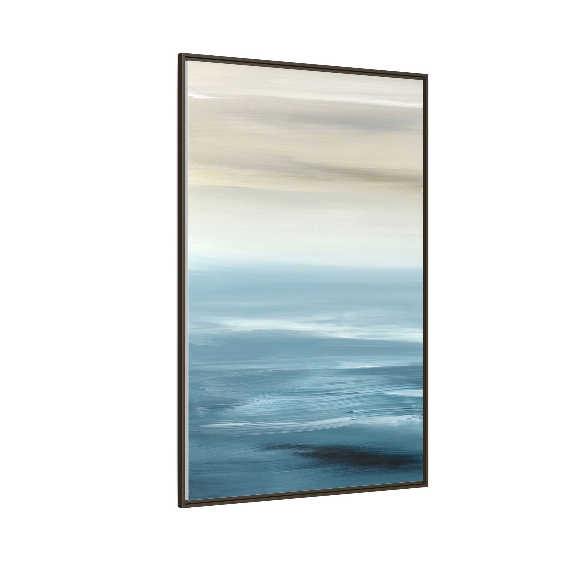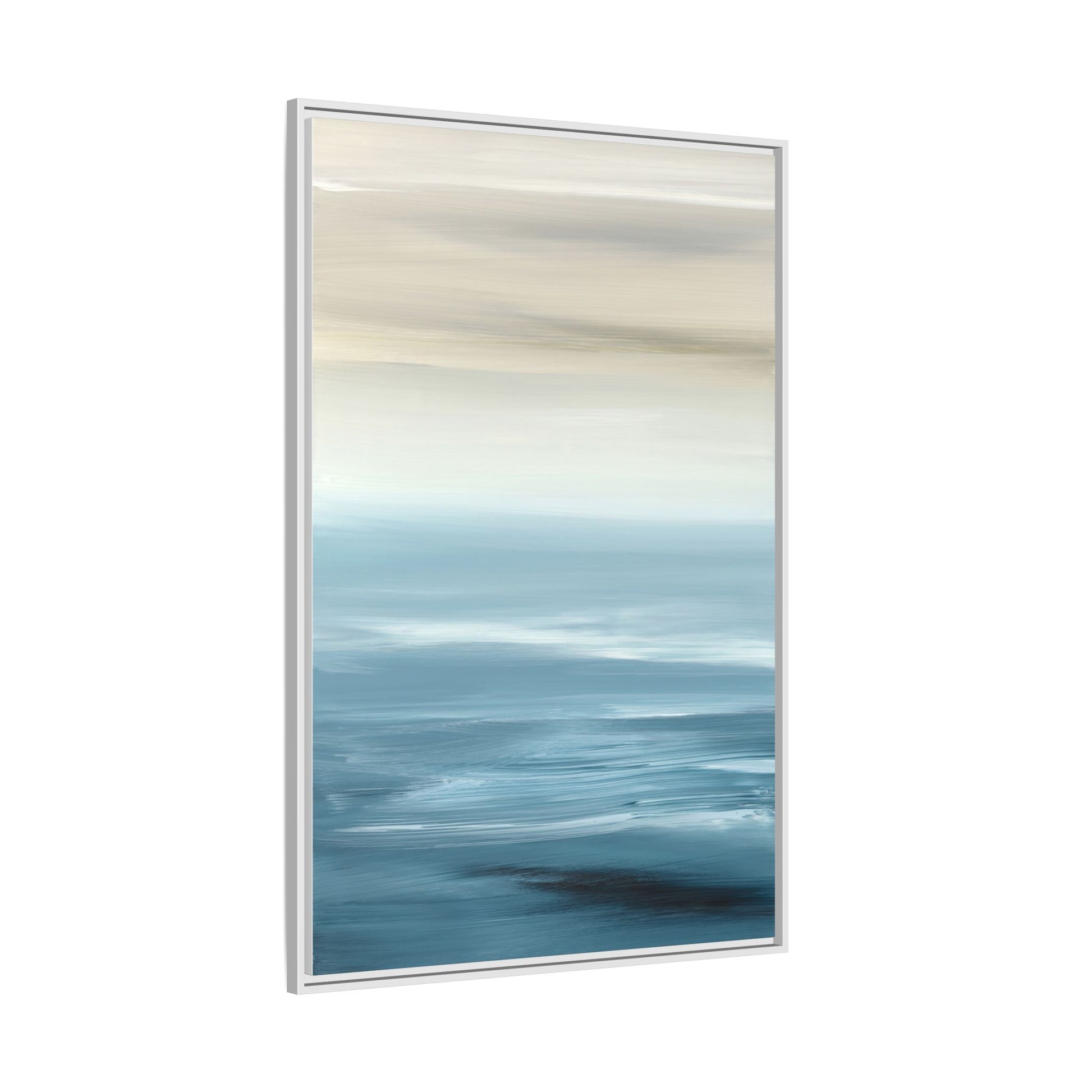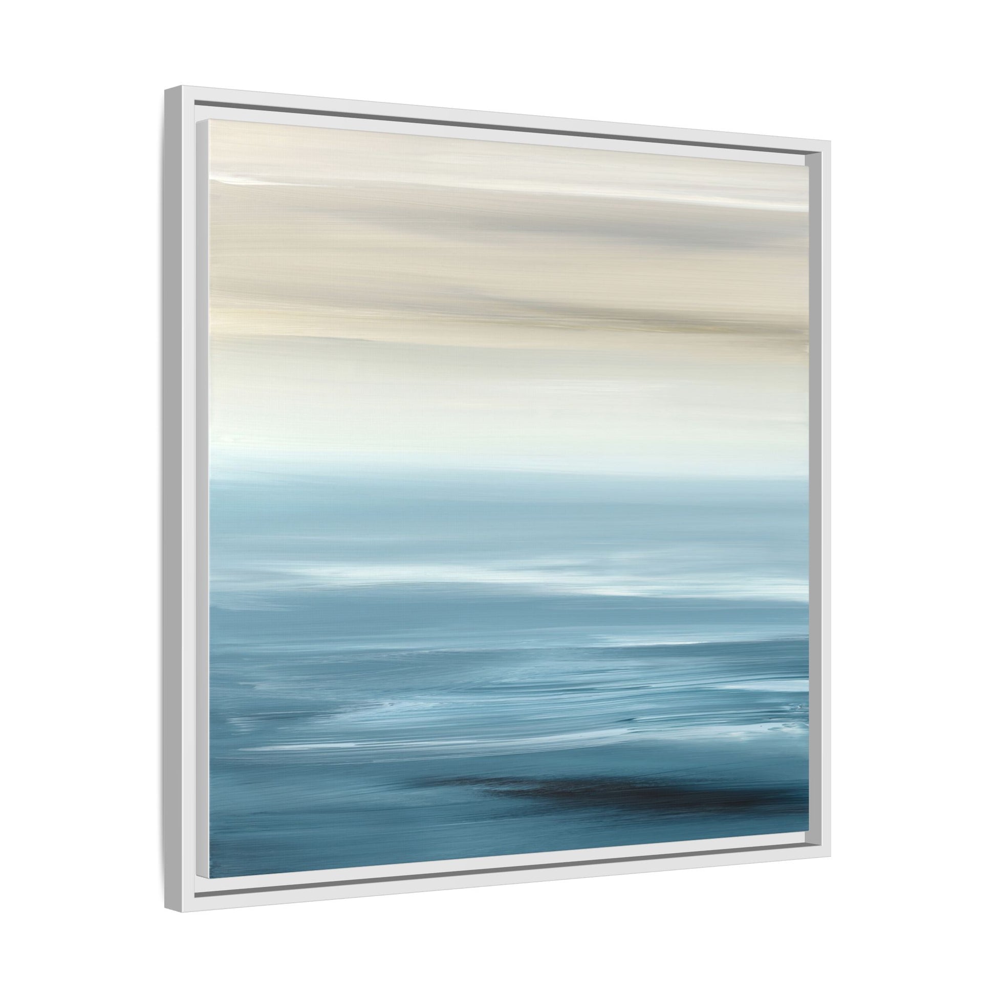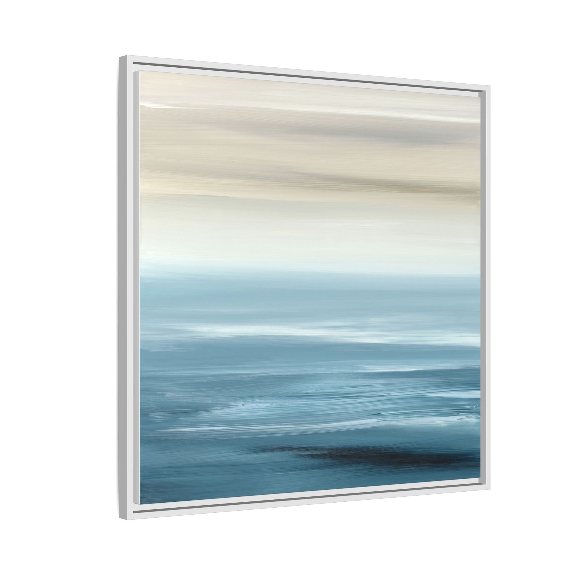 This stunning abstract seascape captures the serene essence of a coastal horizon through a mesmerizing blur of blue and neutral tones. The image employs a motion blur technique that creates soft, horizontal lines reminiscent of water and sky blending seamlessly together. Gradients of pale cream, light blue, and deep teal flow across the composition, suggesting the tranquil transition from shoreline to open water. The horizontal strokes evoke a sense of calm and movement, mimicking the gentle waves and atmospheric haze of a peaceful seascape. The artistic rendering transforms a traditional landscape into a minimalist, almost meditative visual experience that invites contemplation and relaxation.